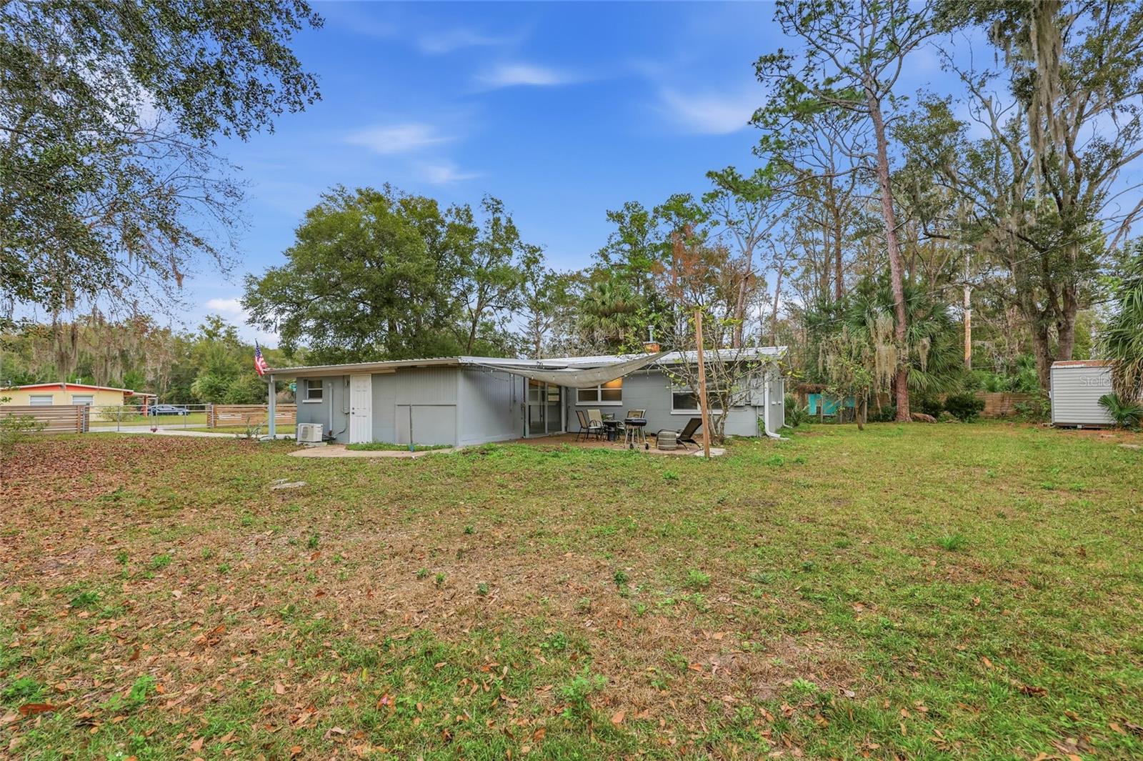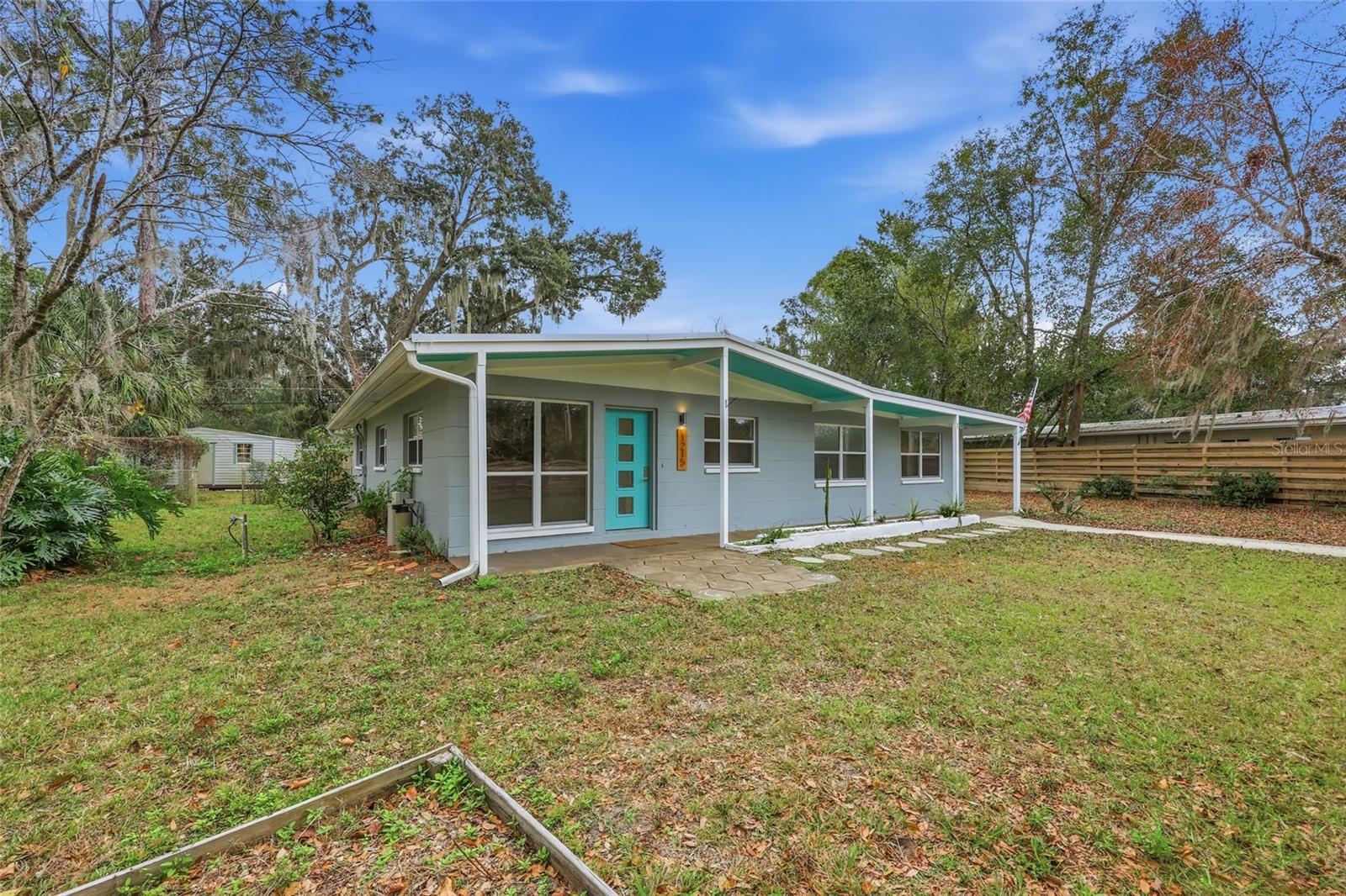 Welcome to your mid-century modern retreat in Gainesville, FL! This beautifully updated home seamlessly blends contemporary convenience with country charm on a fully fenced 1/3-acre lot. Inside, discover three cozy bedrooms, plus one in a private wing. The open-concept living and kitchen area features a stunning wall of windows that floods the space with natural light, quartz countertops, and a new dishwasher for effortless modern living, while the primary suite sanctuary boasts a spa-style bath with vibrant tile accents. Fresh interior and exterior paint enhances the entire home, complemented by a brand new front door, a tankless water heater installed 3 years ago ensuring endless hot water, all new plumbing, a mini split installed 3 years ago, and a whole house water filtration system. Outside, enjoy a durable 2018 metal roof for long-term durability and peace of mind, along with an expansive fenced yard ideal for gardening, entertaining, or enjoying the Florida sunshine. A chicken coop and dedicated garden space support sustainable living, and a paved patio provides the perfect spot for shaded outdoor lounging. The property also includes a 24-ft standalone A/C workshop/storage with electricity, great for projects, hobbies, or additional storage. This mid-century modern property offers the ideal balance of comfort, versatility, and thoughtful upgrades, move-in ready and awaiting its next owner!