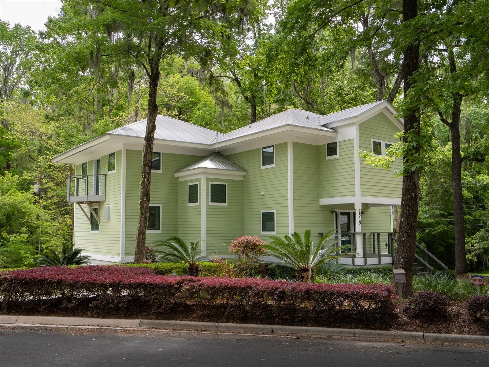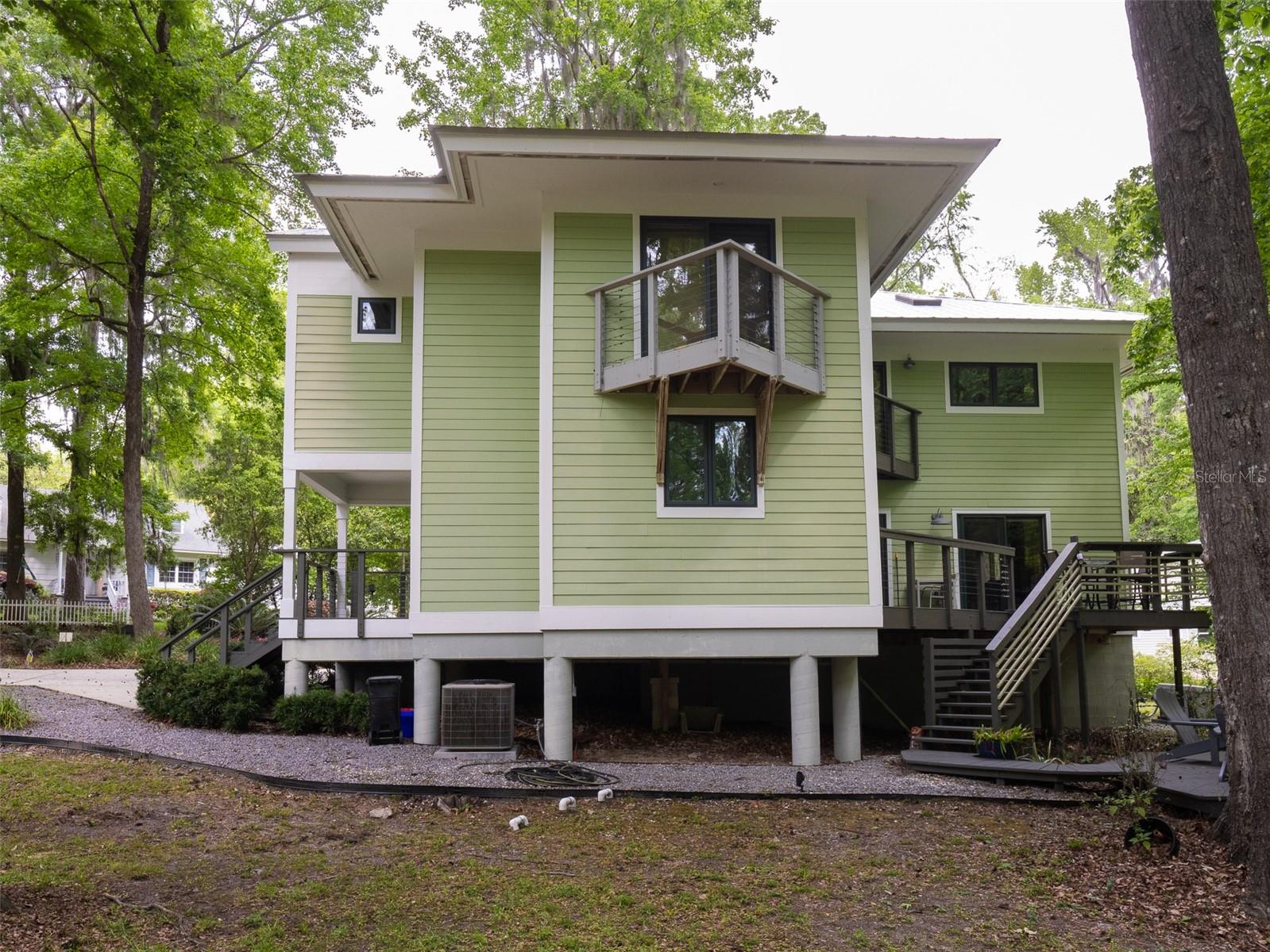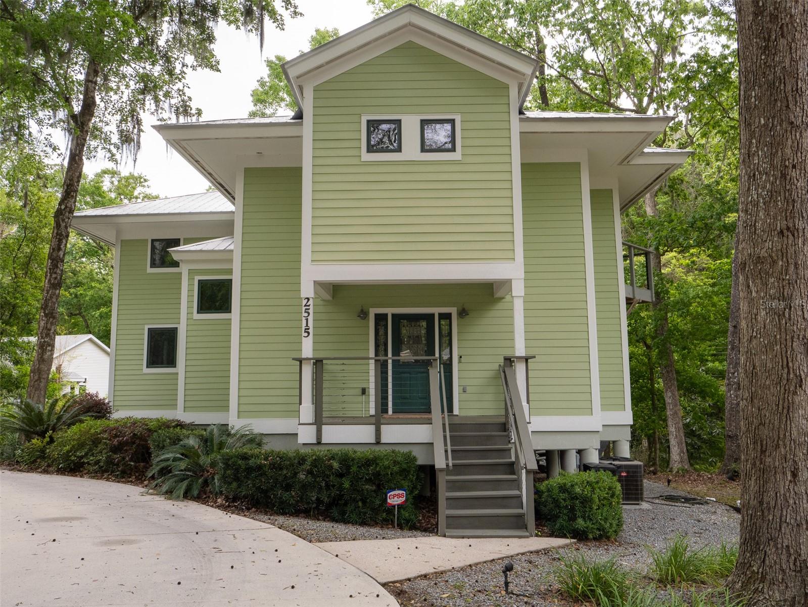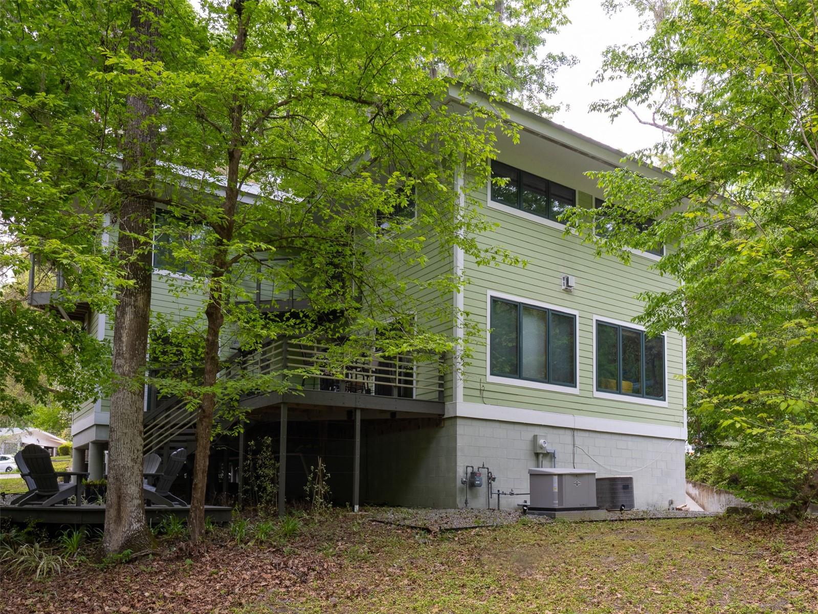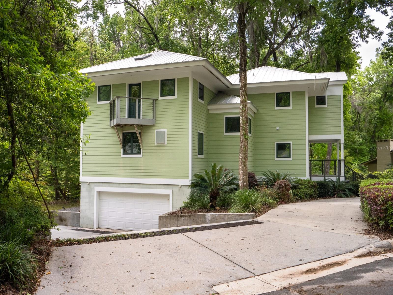 Back on the market with a reduced price. This stunning, architect-designed, custom-built, tri-level home sits on a hill with beautiful views of the woods and the creek that runs through the popular neighborhood of Brywood. The ground floor houses a two-car garage and loads of storage, with a space perfect for a wine vault! The second floor has a bedroom and bathroom off the entrance hall and then you enter the centerpiece of the home, the open Living Room and Dining room with a Vermont Castings wood-burning stove. You will be awed by the cathedral ceilings and walls of glass that shower the interior of this room with light. A gourmet Galley Kitchen opens to the Living Room with its custom-designed, stainless-steel countertops, sleek cabinets and two large sinks. The Gas Range with a vented hood makes it a joy to prepare wonderful meals that can be eaten on the multiple decks and balconies on those lovely Florida evenings. Gorgeous Brazilian hardwood floors are throughout this very special home. No carpet! The third floor has the Primary Bedroom and Bathroom and a 3rd loft bedroom located off a high balcony overlooking the living space below. This area also has room for an office. Both bedrooms have private balconies. The inside laundry is also on the top floor. This home was built for efficiency and longevity. The upper part of the home was built with 8-inch-thick walls for rigidity and insulation. Double-paned casement windows and 4-foot overhangs around the house help with energy efficiency, and a 40-year metal roof, whole house vacuum and a 4-year-old 22KW Generator offer worry free living. Close to UF and downtown, come see this exceptional home today!