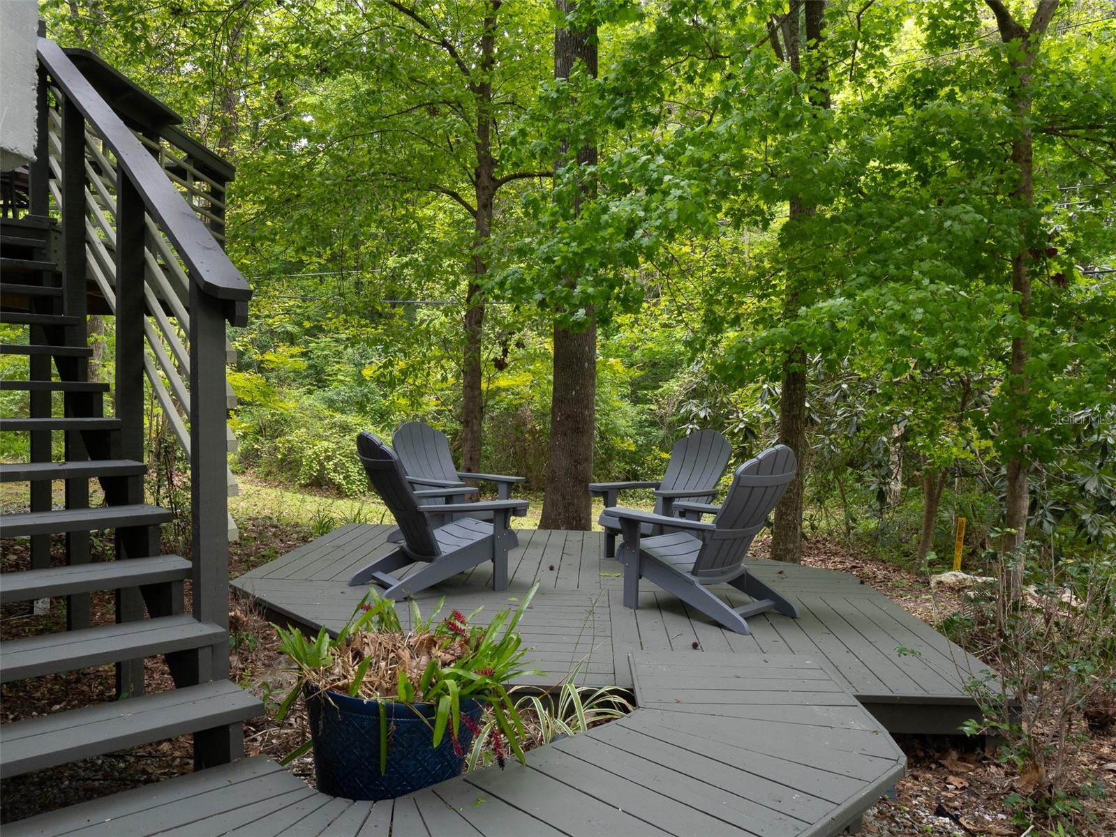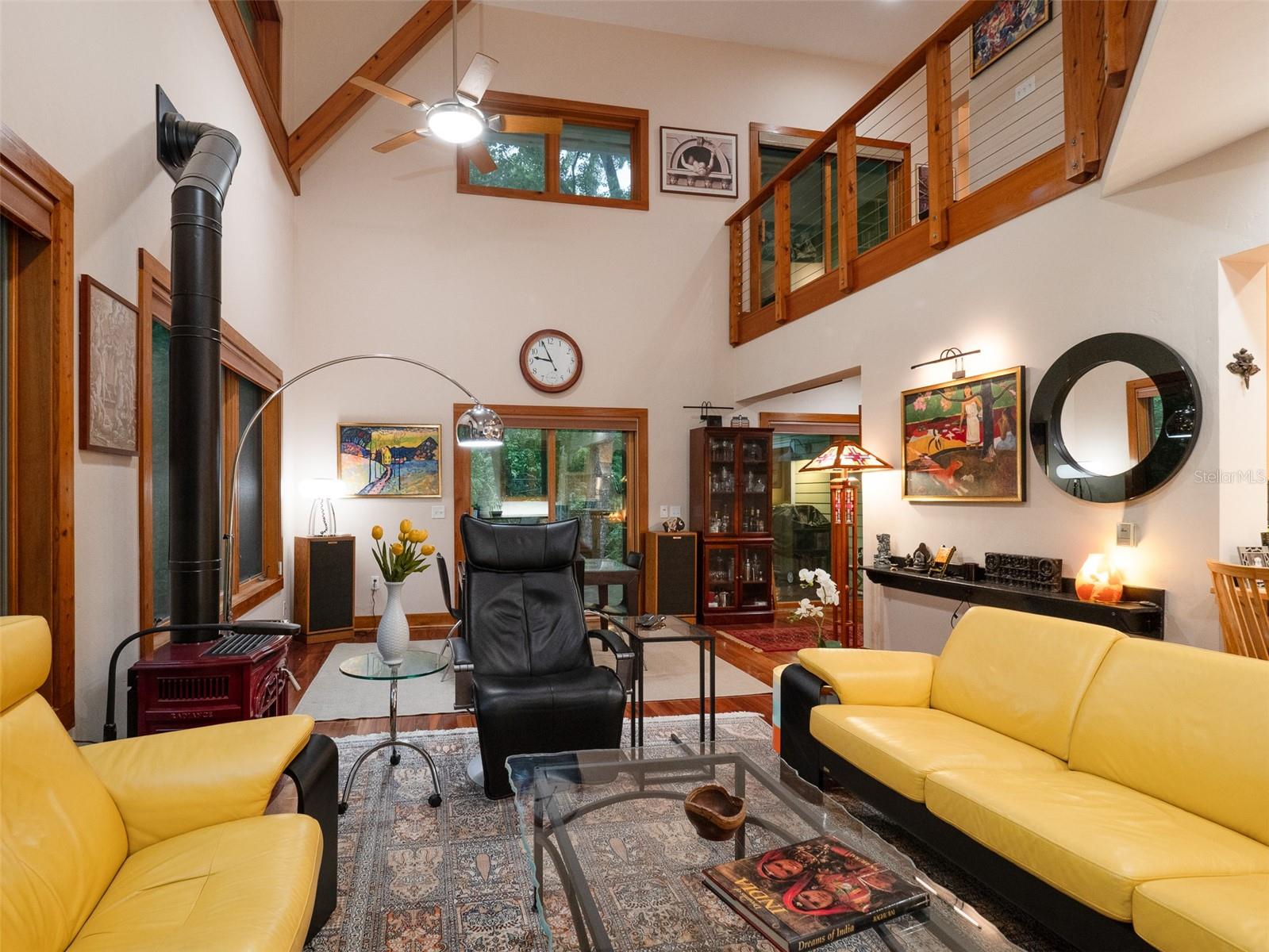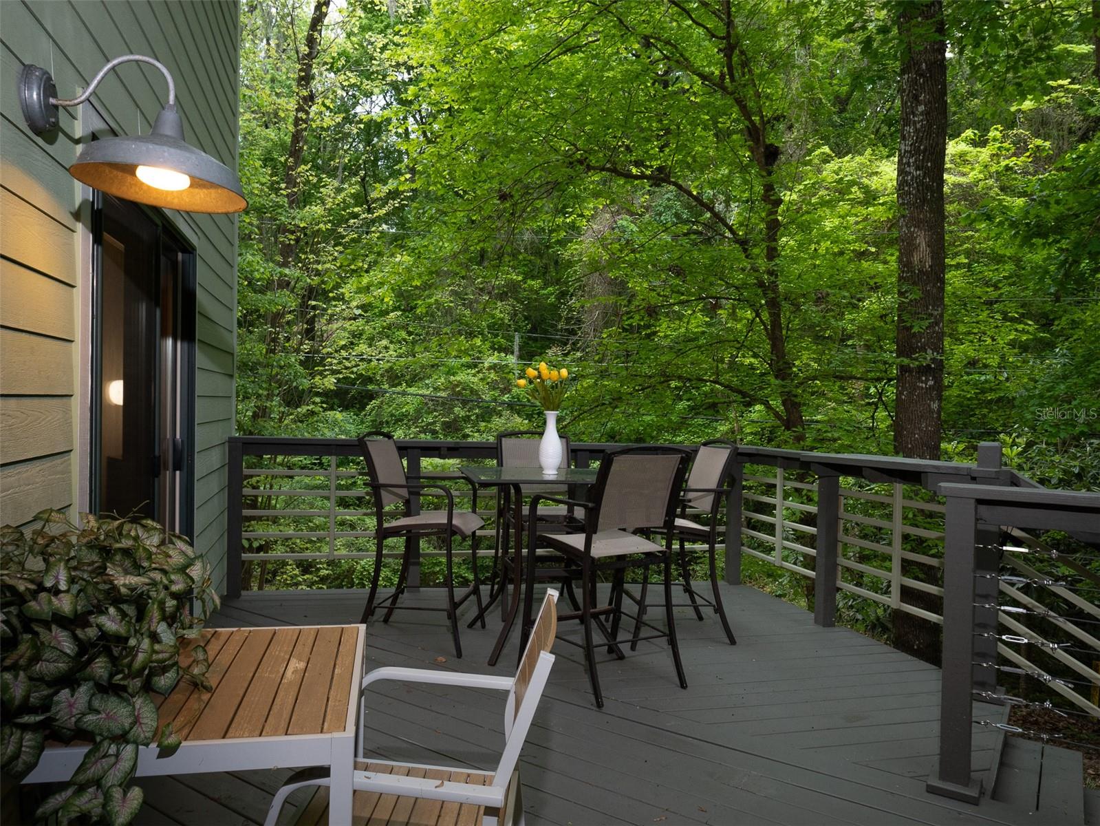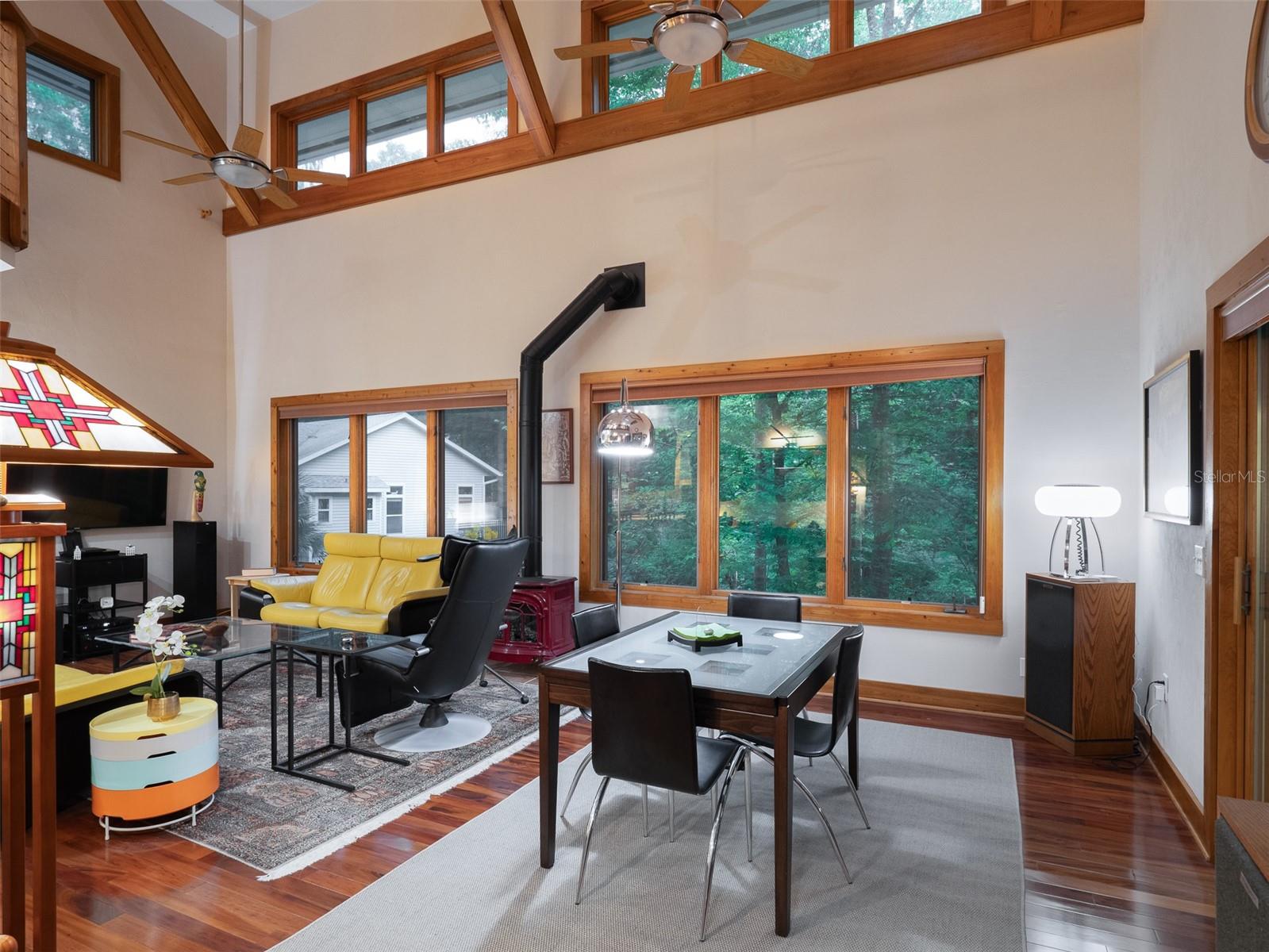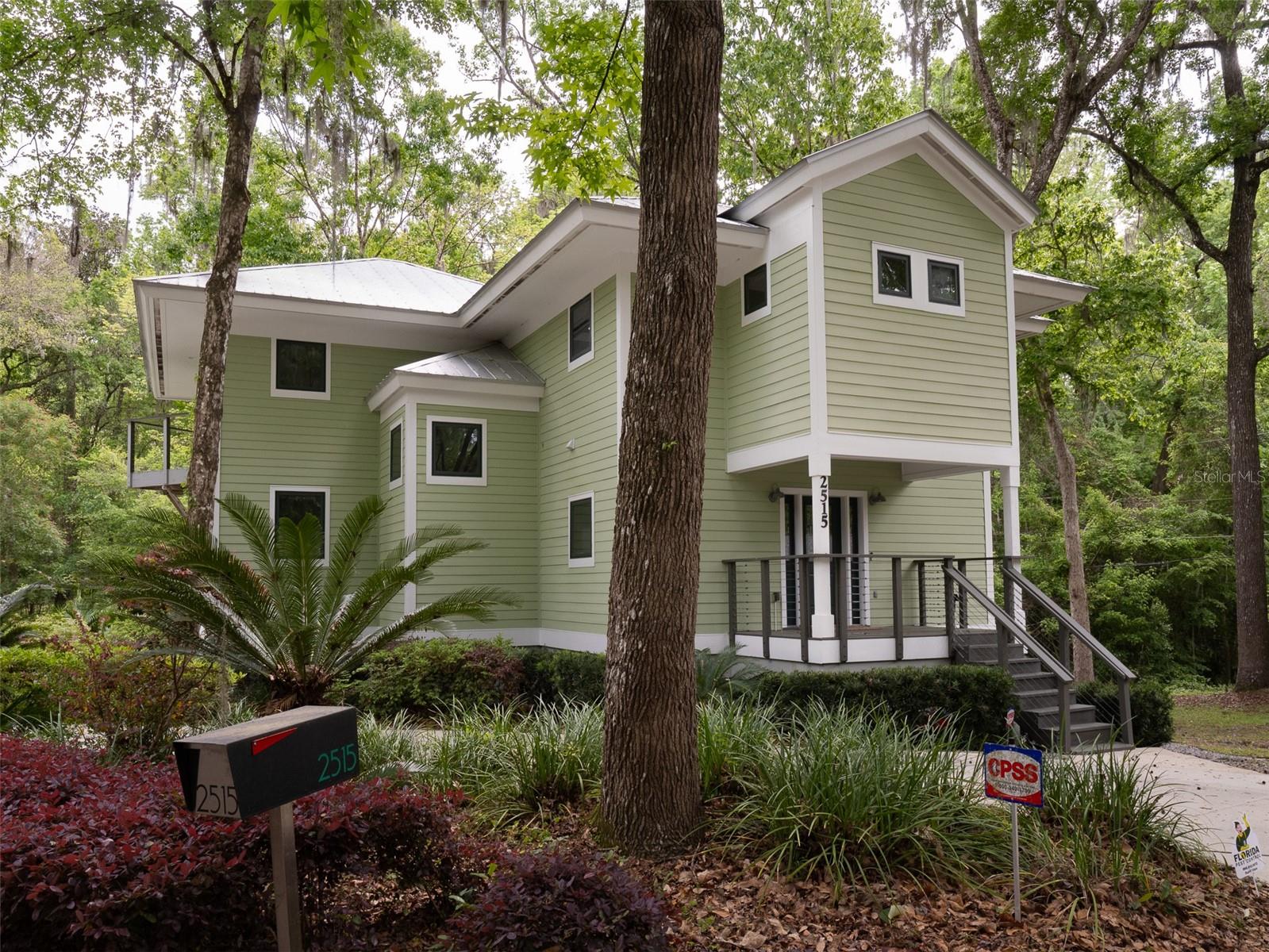 Back on the market with a reduced price. This stunning, architect-designed, custom-built, tri-level home sits on a hill with beautiful views of the woods and the creek that runs through the popular neighborhood of Brywood. The ground floor houses a two-car garage and loads of storage, with a space perfect for a wine vault! The second floor has a bedroom and bathroom off the entrance hall and then you enter the centerpiece of the home, the open Living Room and Dining room with a Vermont Castings wood-burning stove. You will be awed by the cathedral ceilings and walls of glass that shower the interior of this room with light. A gourmet Galley Kitchen opens to the Living Room with its custom-designed, stainless-steel countertops, sleek cabinets and two large sinks. The Gas Range with a vented hood makes it a joy to prepare wonderful meals that can be eaten on the multiple decks and balconies on those lovely Florida evenings. Gorgeous Brazilian hardwood floors are throughout this very special home. No carpet! The third floor has the Primary Bedroom and Bathroom and a 3rd loft bedroom located off a high balcony overlooking the living space below. This area also has room for an office. Both bedrooms have private balconies. The inside laundry is also on the top floor. This home was built for efficiency and longevity. The upper part of the home was built with 8-inch-thick walls for rigidity and insulation. Double-paned casement windows and 4-foot overhangs around the house help with energy efficiency, and a 40-year metal roof, whole house vacuum and a 4-year-old 22KW Generator offer worry free living. Close to UF and downtown, come see this exceptional home today!
