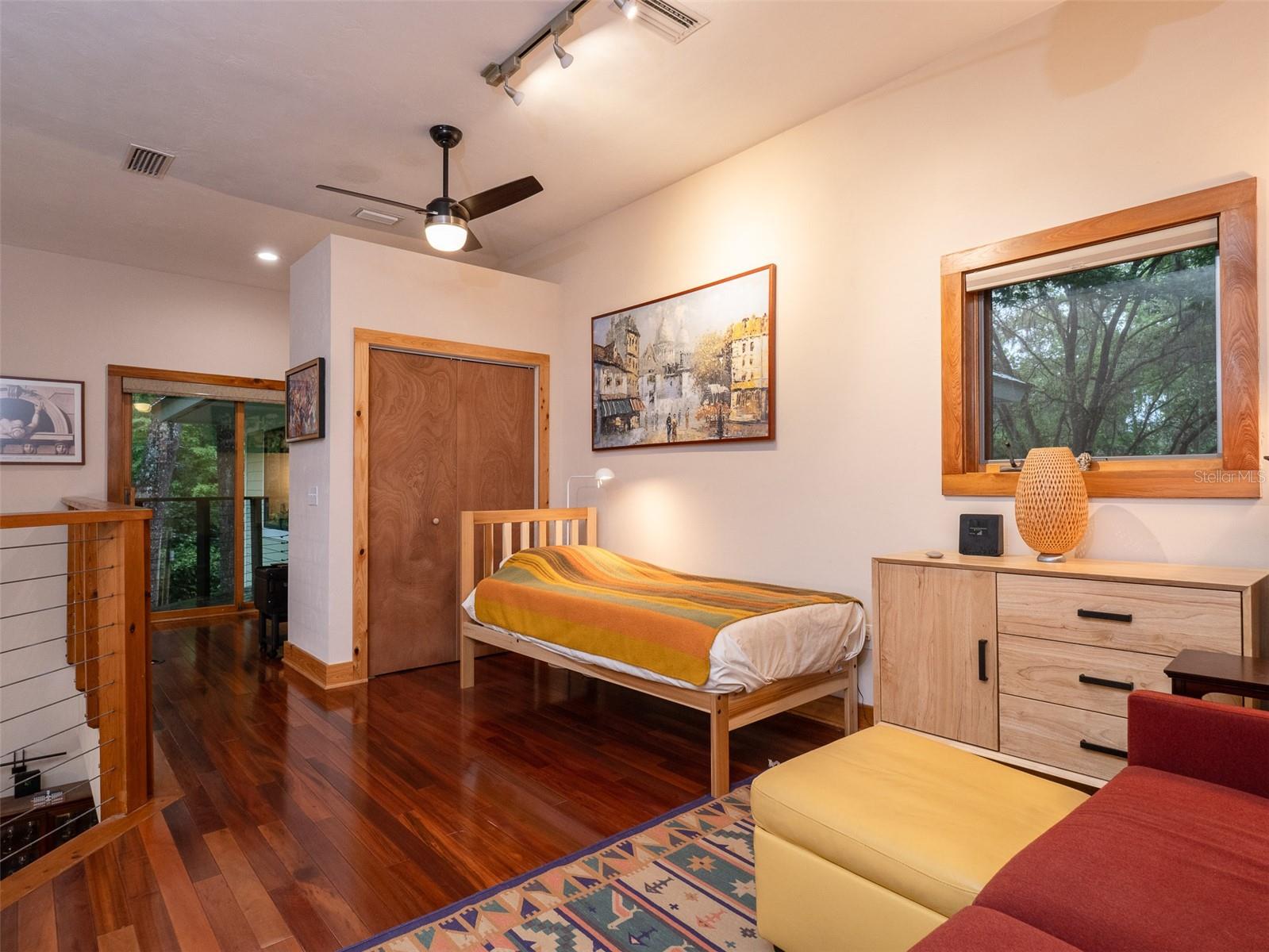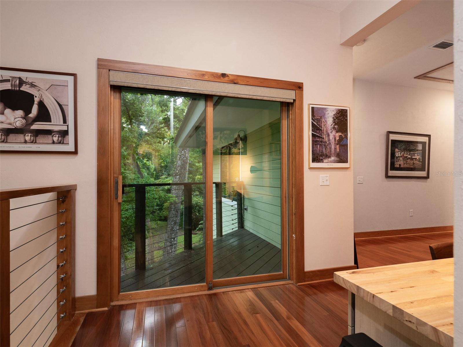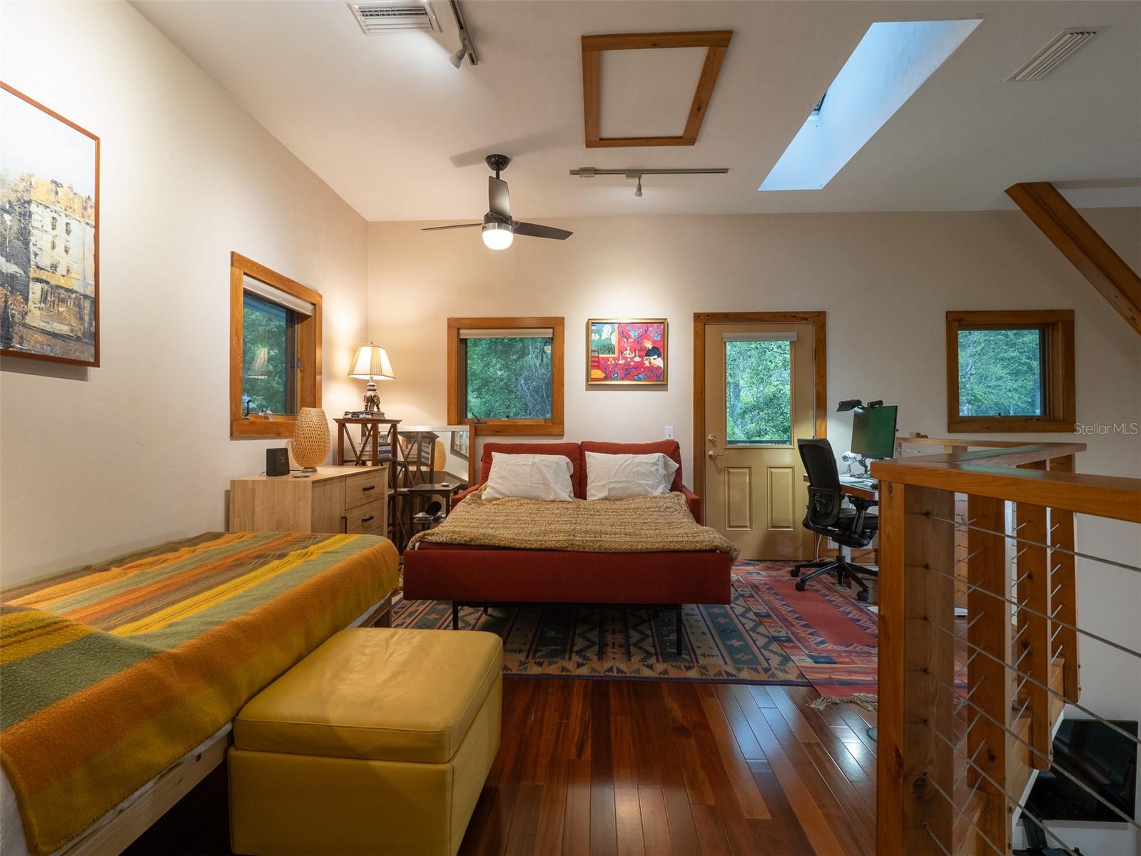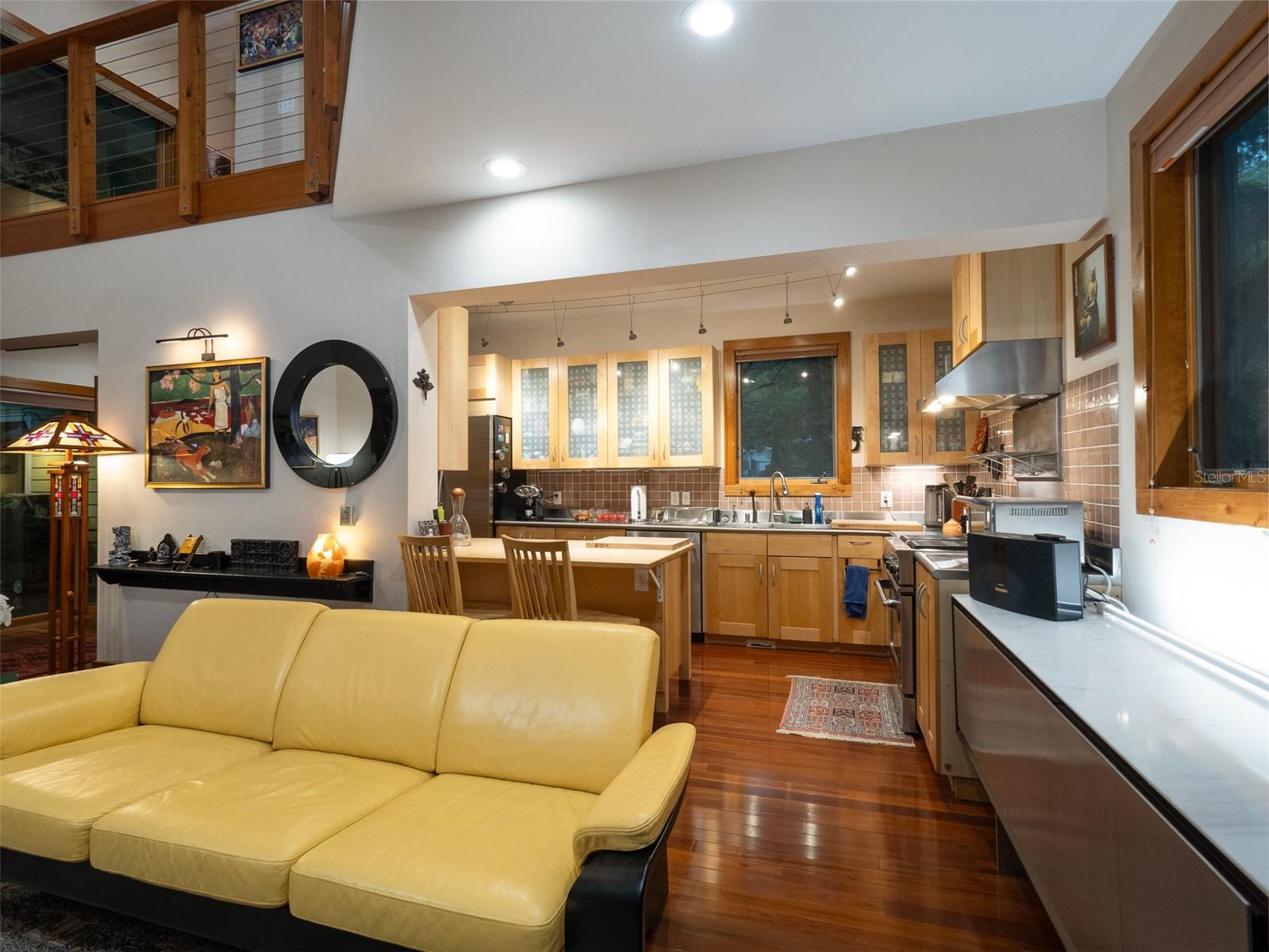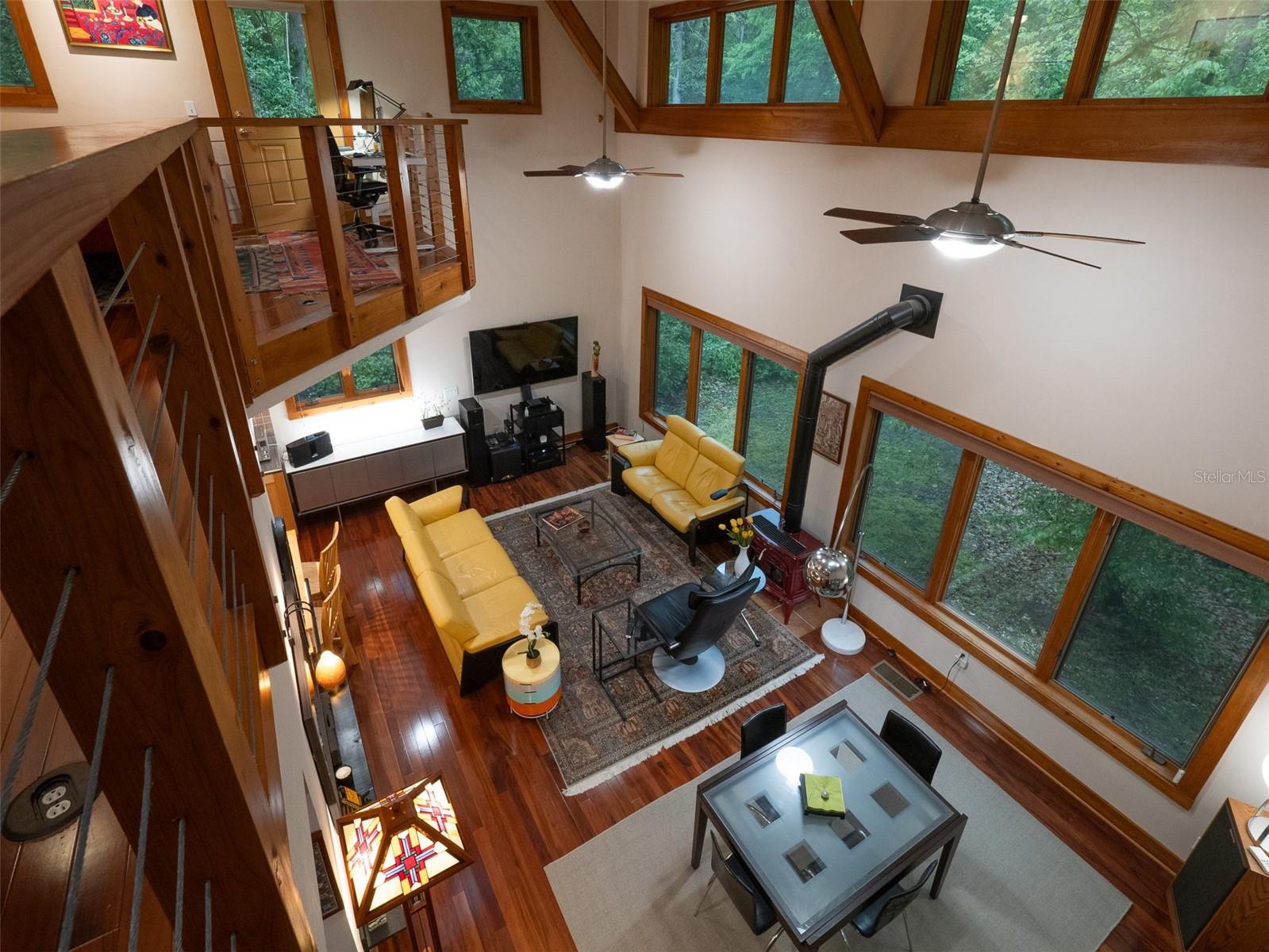 Back on the market with a reduced price. This stunning, architect-designed, custom-built, tri-level home sits on a hill with beautiful views of the woods and the creek that runs through the popular neighborhood of Brywood. The ground floor houses a two-car garage and loads of storage, with a space perfect for a wine vault! The second floor has a bedroom and bathroom off the entrance hall and then you enter the centerpiece of the home, the open Living Room and Dining room with a Vermont Castings wood-burning stove. You will be awed by the cathedral ceilings and walls of glass that shower the interior of this room with light. A gourmet Galley Kitchen opens to the Living Room with its custom-designed, stainless-steel countertops, sleek cabinets and two large sinks. The Gas Range with a vented hood makes it a joy to prepare wonderful meals that can be eaten on the multiple decks and balconies on those lovely Florida evenings. Gorgeous Brazilian hardwood floors are throughout this very special home. No carpet! The third floor has the Primary Bedroom and Bathroom and a 3rd loft bedroom located off a high balcony overlooking the living space below. This area also has room for an office. Both bedrooms have private balconies. The inside laundry is also on the top floor. This home was built for efficiency and longevity. The upper part of the home was built with 8-inch-thick walls for rigidity and insulation. Double-paned casement windows and 4-foot overhangs around the house help with energy efficiency, and a 40-year metal roof, whole house vacuum and a 4-year-old 22KW Generator offer worry free living. Close to UF and downtown, come see this exceptional home today!
