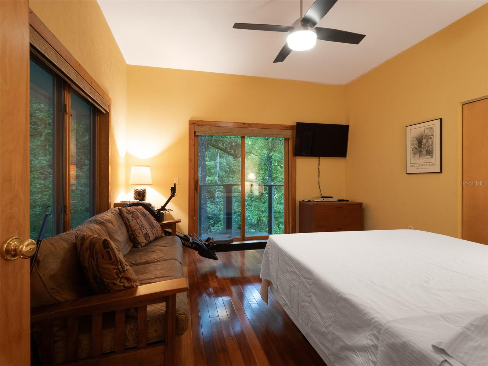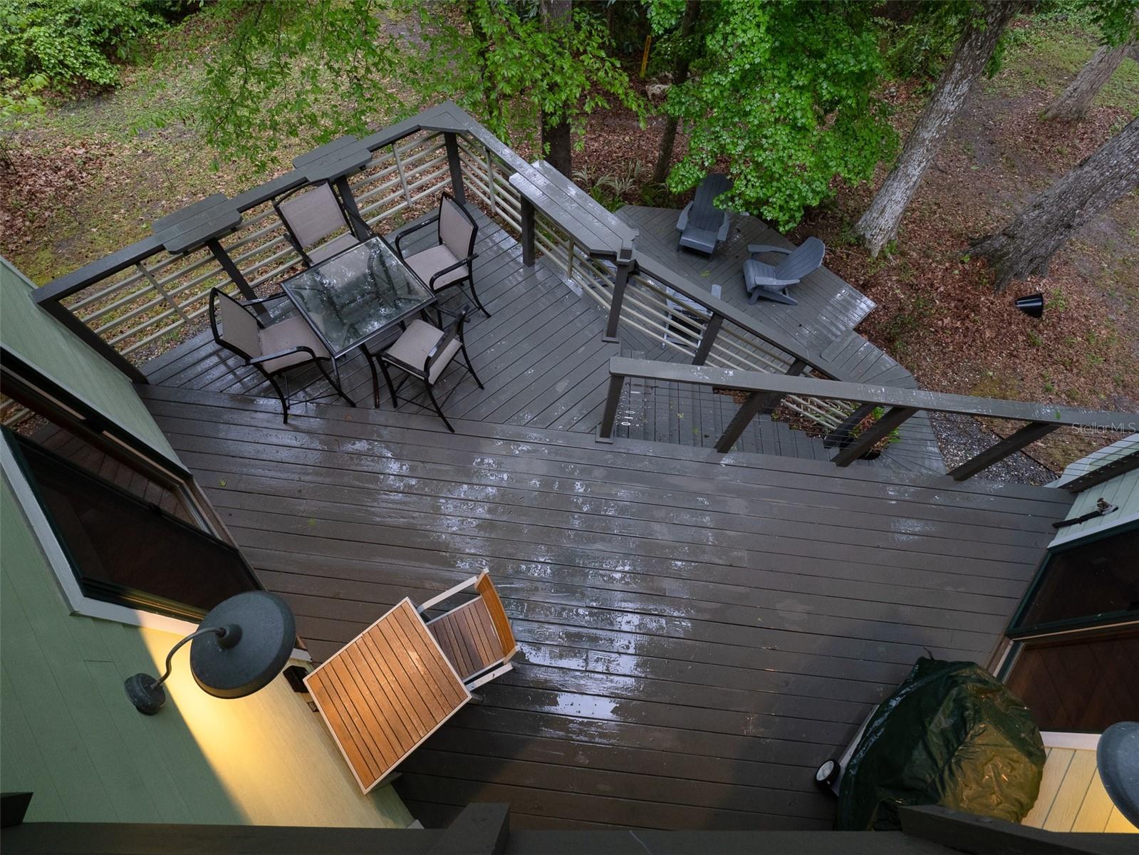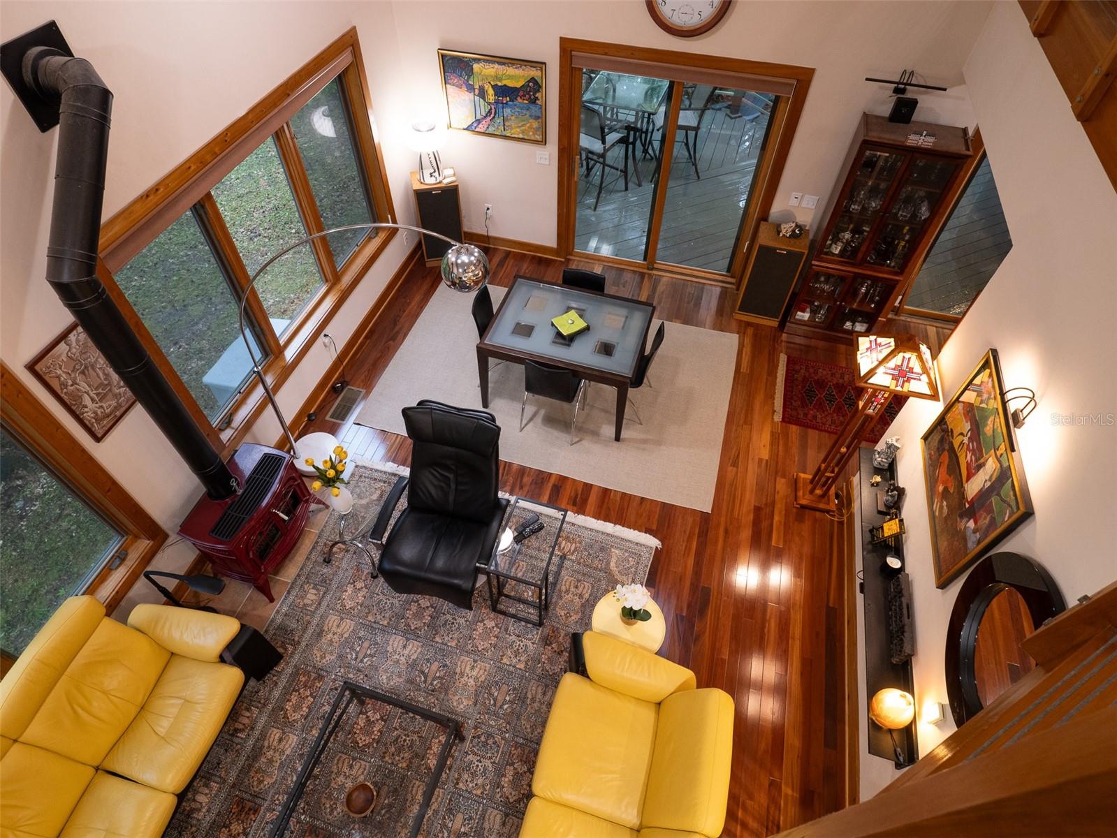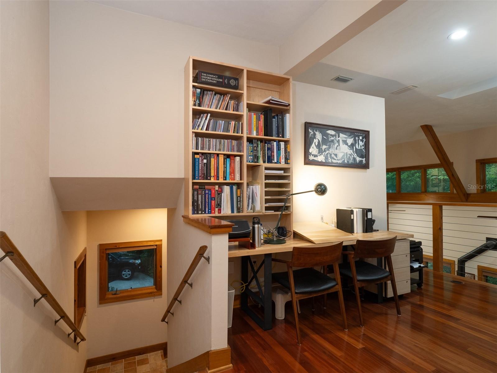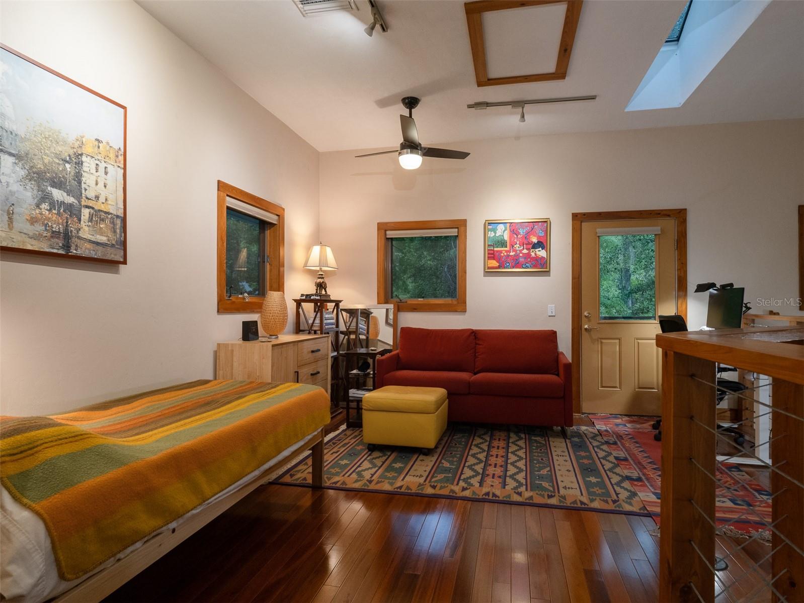 Back on the market with a reduced price. This stunning, architect-designed, custom-built, tri-level home sits on a hill with beautiful views of the woods and the creek that runs through the popular neighborhood of Brywood. The ground floor houses a two-car garage and loads of storage, with a space perfect for a wine vault! The second floor has a bedroom and bathroom off the entrance hall and then you enter the centerpiece of the home, the open Living Room and Dining room with a Vermont Castings wood-burning stove. You will be awed by the cathedral ceilings and walls of glass that shower the interior of this room with light. A gourmet Galley Kitchen opens to the Living Room with its custom-designed, stainless-steel countertops, sleek cabinets and two large sinks. The Gas Range with a vented hood makes it a joy to prepare wonderful meals that can be eaten on the multiple decks and balconies on those lovely Florida evenings. Gorgeous Brazilian hardwood floors are throughout this very special home. No carpet! The third floor has the Primary Bedroom and Bathroom and a 3rd loft bedroom located off a high balcony overlooking the living space below. This area also has room for an office. Both bedrooms have private balconies. The inside laundry is also on the top floor. This home was built for efficiency and longevity. The upper part of the home was built with 8-inch-thick walls for rigidity and insulation. Double-paned casement windows and 4-foot overhangs around the house help with energy efficiency, and a 40-year metal roof, whole house vacuum and a 4-year-old 22KW Generator offer worry free living. Close to UF and downtown, come see this exceptional home today!