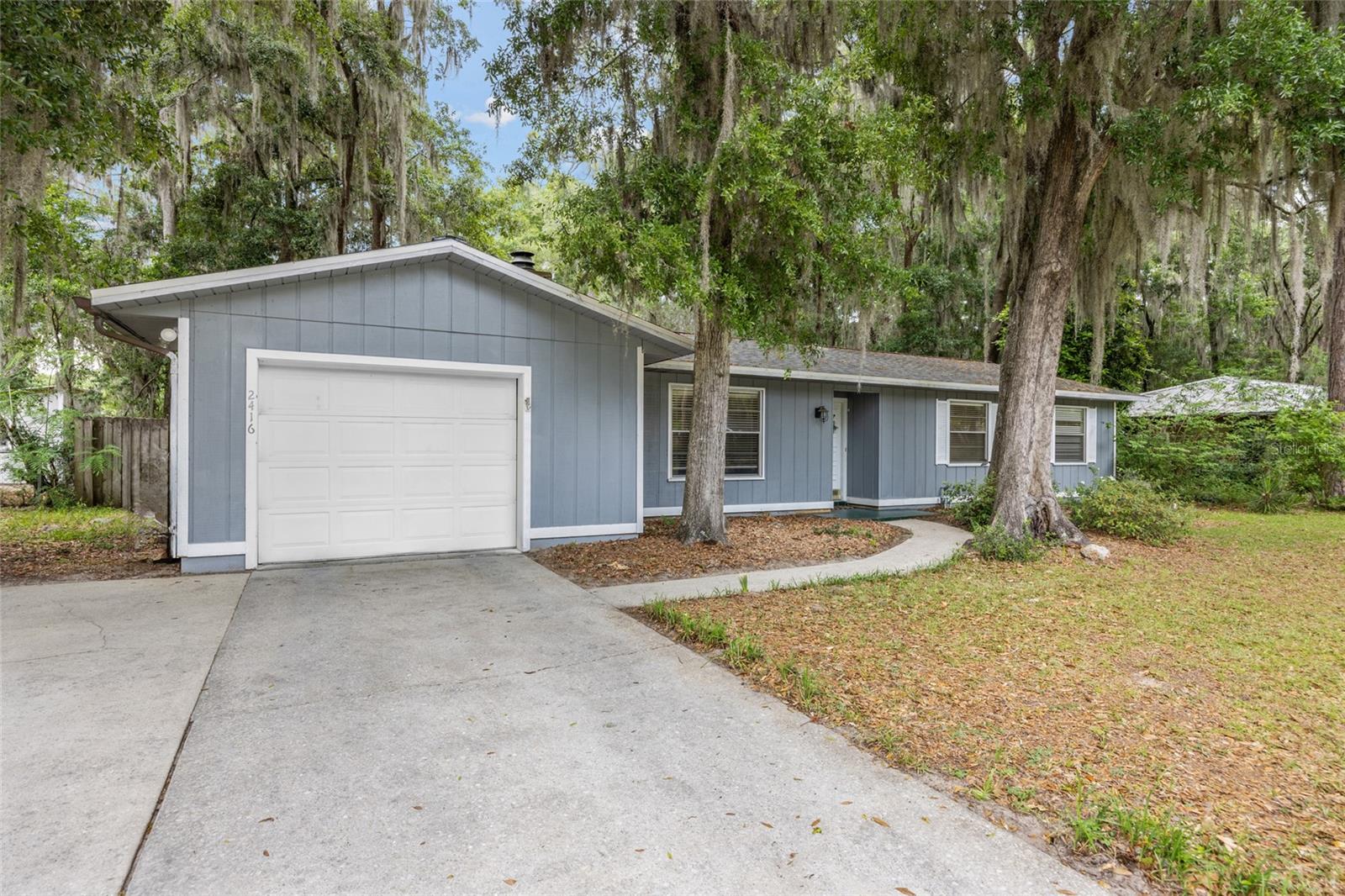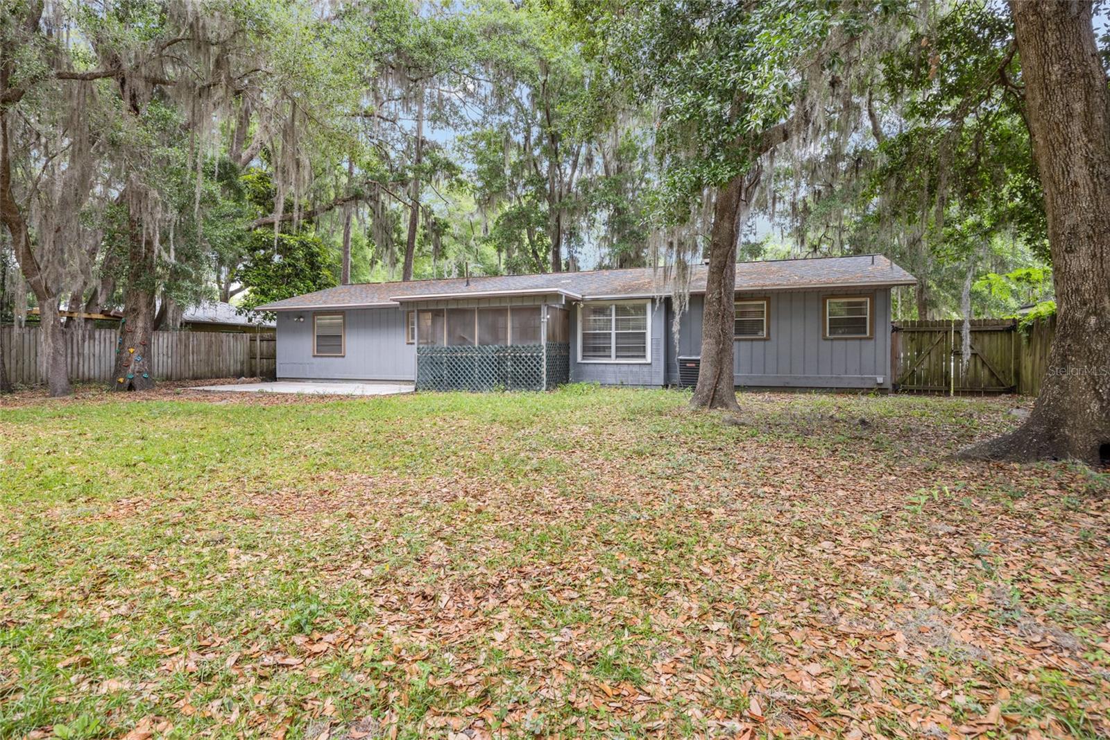 Welcome to this charming 3 bedroom, 2 bathroom home with 1,260 sqft of living space on 0.24 acres in a prime location! As you approach the home, you will appreciate the low maintenance yard with beautiful mature trees and a roof recently replaced in 2019. Opening the front door, you will find yourself in a spacious living area with a wood burning fireplace that you can enjoy on those colder winter days. The living room extends to a dining area that you can also use as a flex space. Through the french doors, step into your screened porch and large backyard with oversized concrete patio and enjoy plenty of space to play, relax or entertain. The backyard is fully fenced with a tall, wood privacy fence all around. The double gate in the back fence allows you to pull your camper or trailer into the backyard. The spacious kitchen features beautiful and durable quartz countertops, a large pantry closet, and an eat-in breakfast area. Through the kitchen you have access to the indoor laundry room and the garage. The bedrooms are situated on the right side of the house. The primary bedroom has an en-suite bathroom with a walk-in shower. The secondary bathroom has a tub-shower combo and is located in the hallway, providing easy access from the secondary bedrooms. The oversized 1-car garage provides ample storage space for your tools, yard equipment and additional belongings. You'll have lightning fast internet for work or entertainment with fiber optics throughout the neighborhood. This neighborhood has no HOA and is conveniently located just a few minutes walk from Buchholz High School, a short 5 minute drive from Santa Fe College, and less than 15 minutes from the University of Florida. Besides the easily accessible school life, you will enjoy the close proximity to Publix Supermarket, along with some of the best stores, dining and entertainment that Gainesville has to offer. Don't miss out on this amazing opportunity, and call me to schedule a tour today!