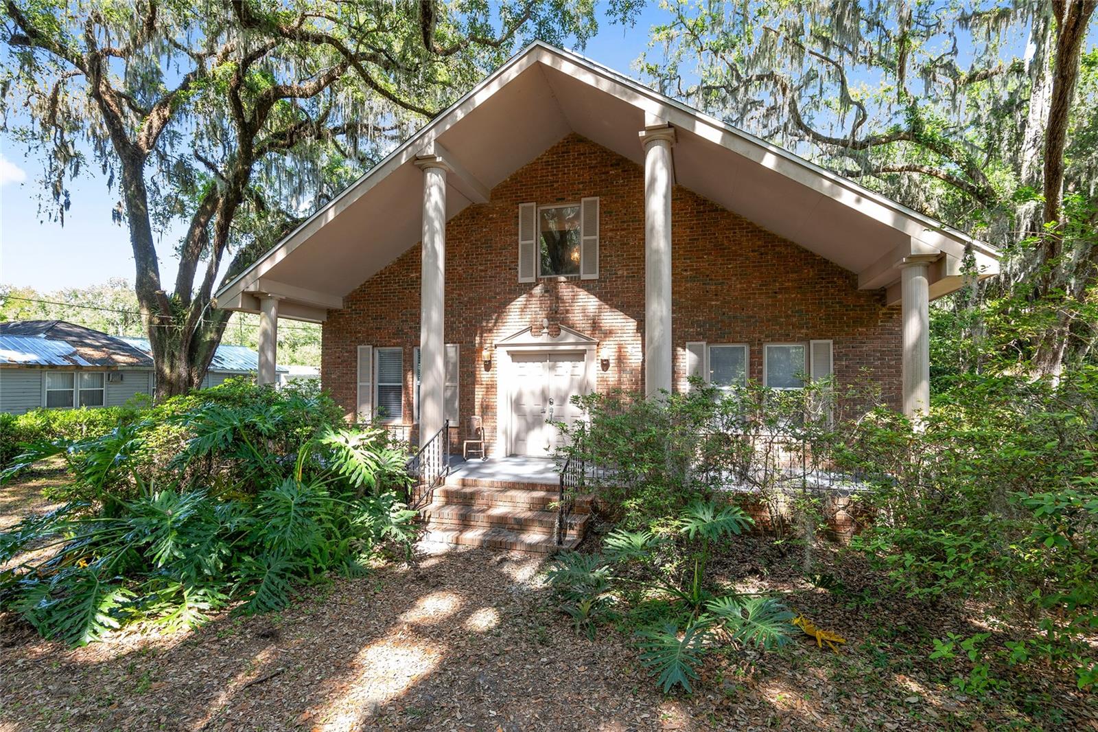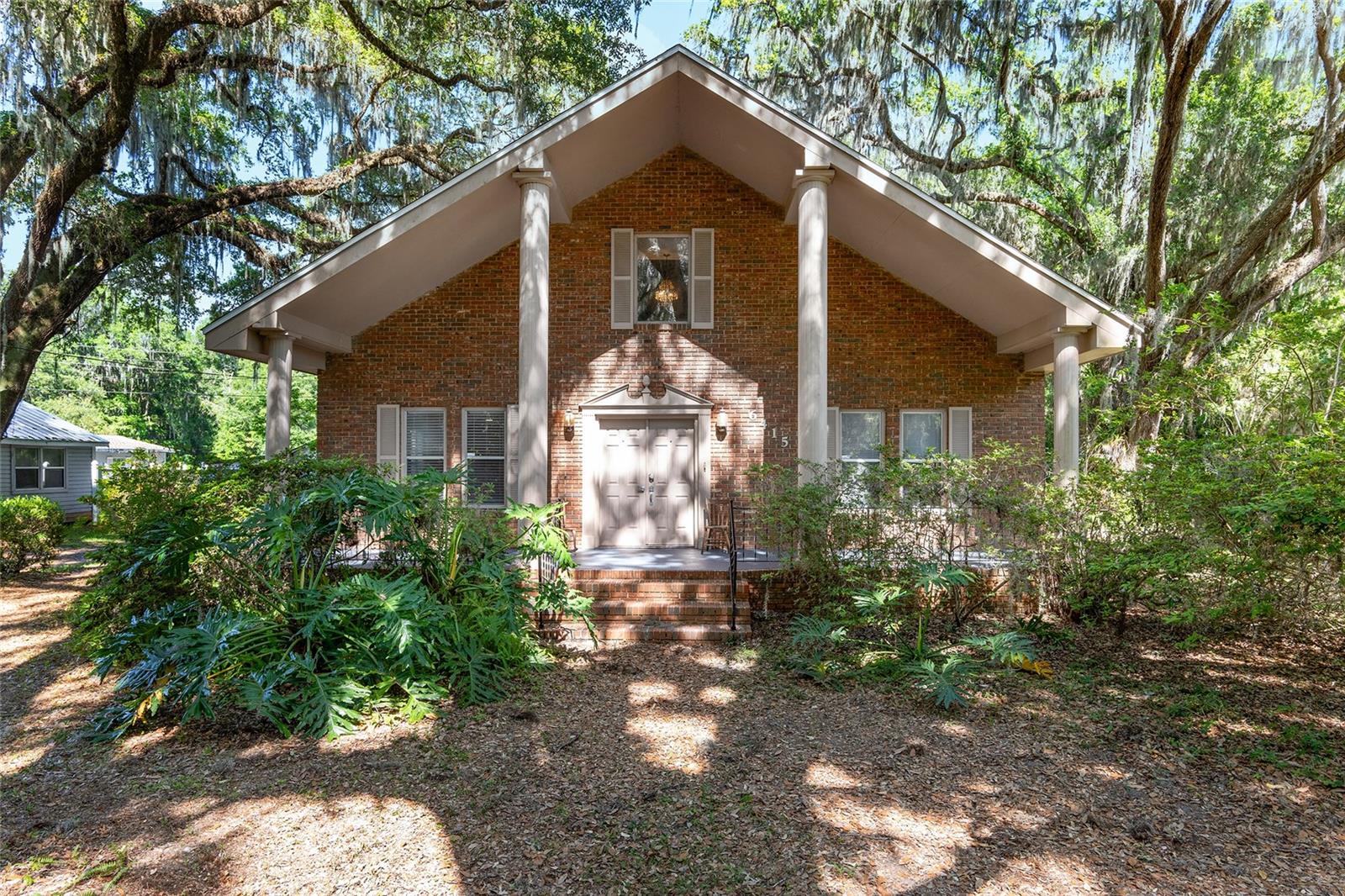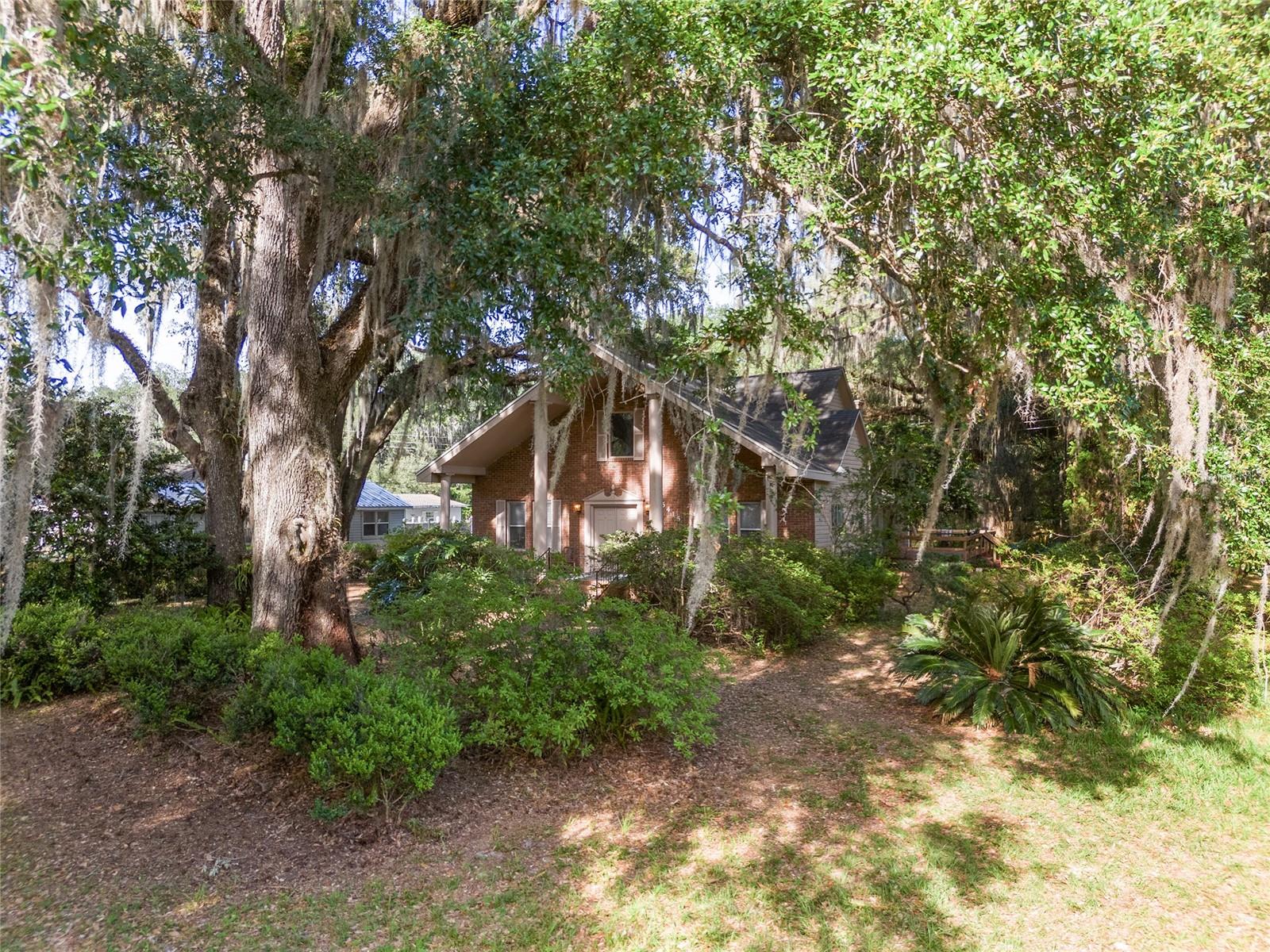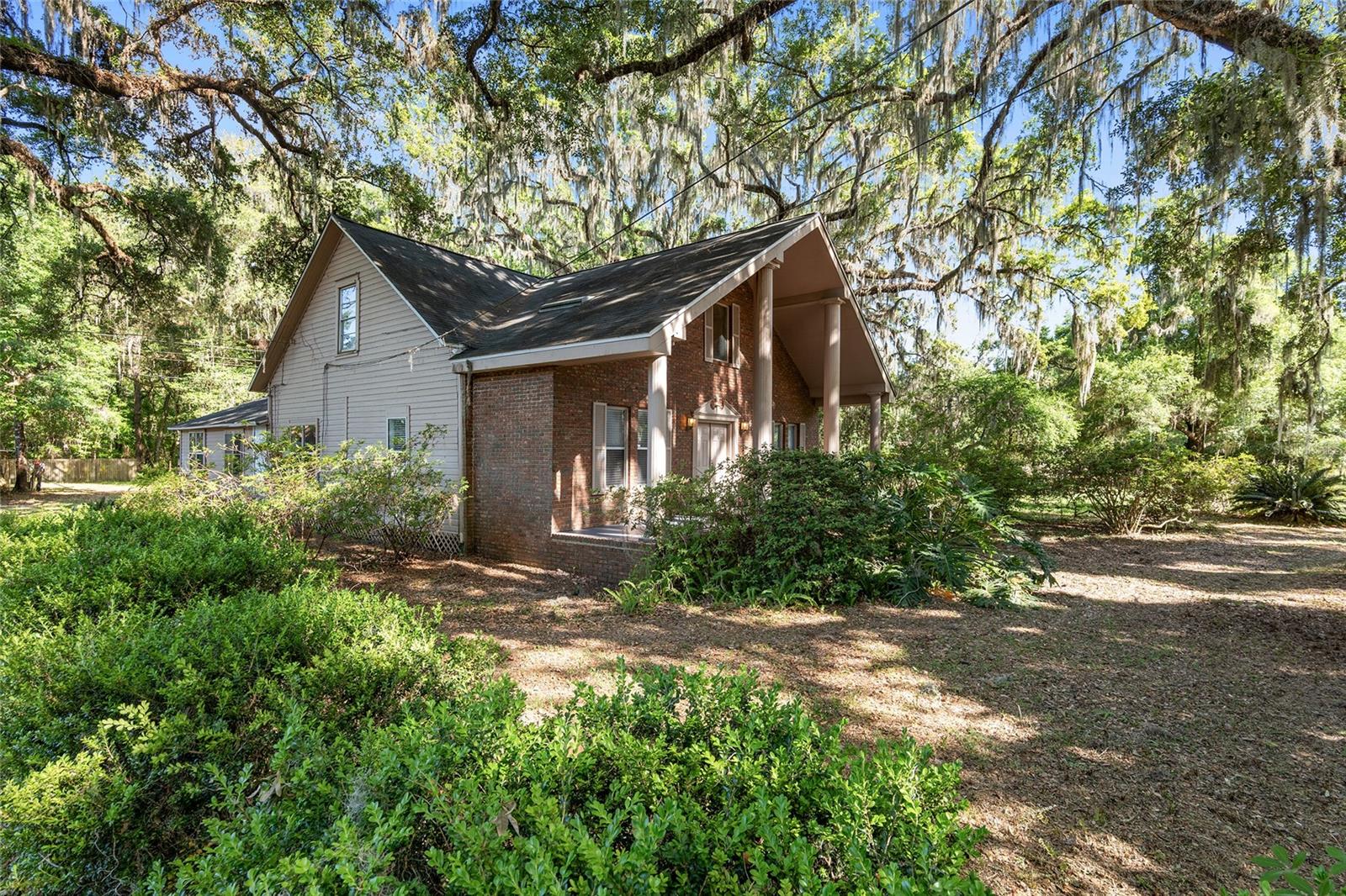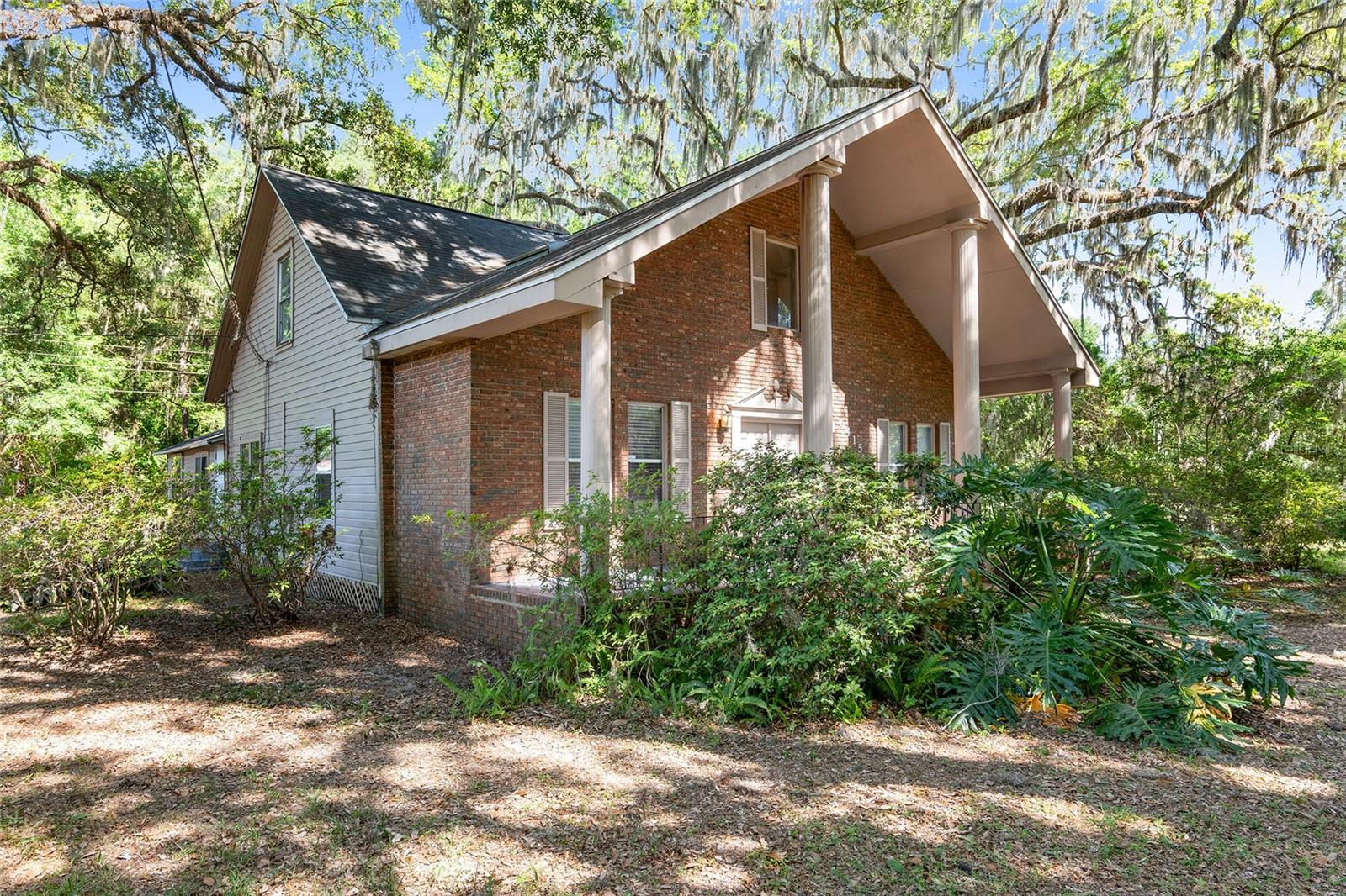 Nestled amid majestic oaks on a generous 2.75 acre parcel of land in Gainesville, this Florida home welcomes you to unwind and savor moments of reflection. Nature enthusiasts will delight in the property's proximity to the Hawthorne Alachua trail and nature parks. Offering accessible opportunities for outdoor recreation, wildlife observation and leisurely strolls. Two-story columns on the front porch evoke a sense of grandeur, complemented by a brick façade and the warmth of wood siding. Stepping through the threshold you are greeted by a spiral staircase that ascends to a second-story loft, creating an enchanting focal point that invites exploration and leading to a versatile space ideal for relaxation or creative endeavors. On each side of the loft is attic storage. Five bedrooms and two bathrooms on the first floor, ample space for comfortable living. The roof and plumbing of the home were updated in 2015. Property has a working well with water softener, filtration system, and UV light purification. Includes refrigerator, range, dishwasher, and washer/dryer. French doors from the dinning room open to a side deck for morning coffee, alfresco dining or gatherings under the stars. There is a spacious shed, ideal for housing outdoor equipment, building materials or pursuing hobbies. Situated just 9 miles from the vibrant heart of downtown Gainesville and a mere 8 miles from the town of Micanopy, this residence offers a perfect blend of tranquility, accessibility, and vintage charm.