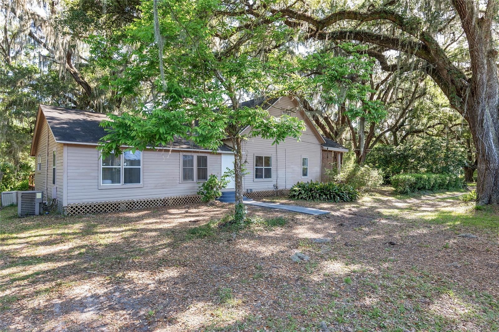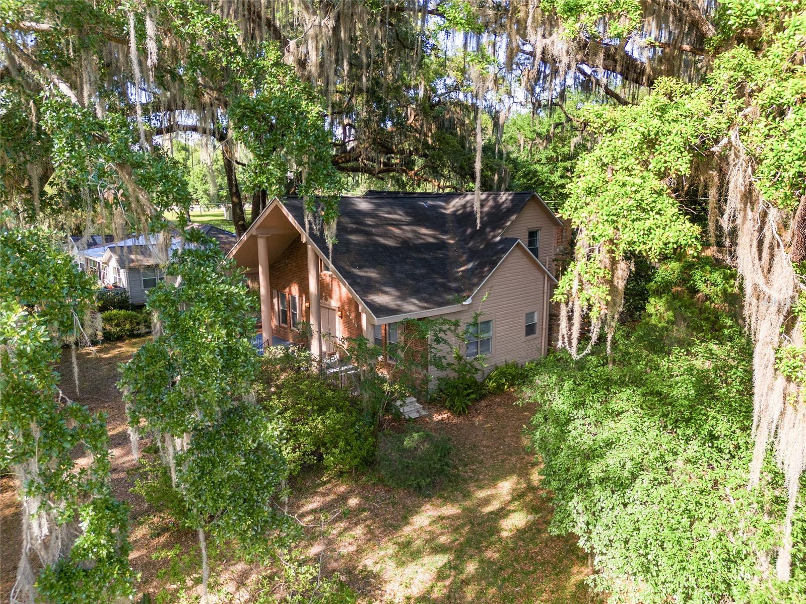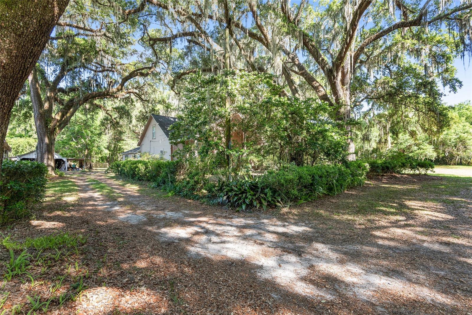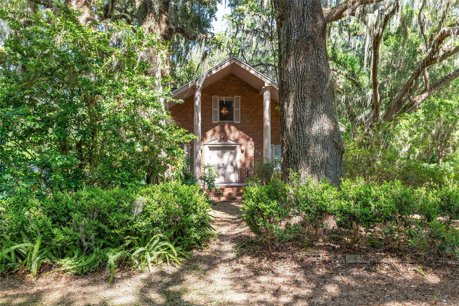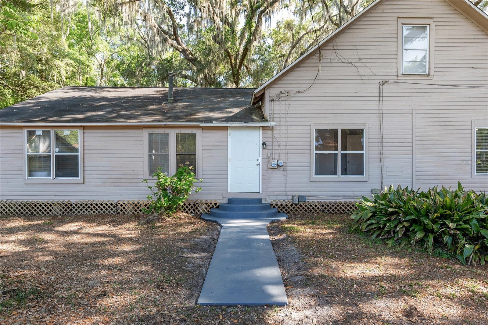 Nestled amid majestic oaks on a generous 2.75 acre parcel of land in Gainesville, this Florida home welcomes you to unwind and savor moments of reflection. Nature enthusiasts will delight in the property's proximity to the Hawthorne Alachua trail and nature parks. Offering accessible opportunities for outdoor recreation, wildlife observation and leisurely strolls. Two-story columns on the front porch evoke a sense of grandeur, complemented by a brick façade and the warmth of wood siding. Stepping through the threshold you are greeted by a spiral staircase that ascends to a second-story loft, creating an enchanting focal point that invites exploration and leading to a versatile space ideal for relaxation or creative endeavors. On each side of the loft is attic storage. Five bedrooms and two bathrooms on the first floor, ample space for comfortable living. The roof and plumbing of the home were updated in 2015. Property has a working well with water softener, filtration system, and UV light purification. Includes refrigerator, range, dishwasher, and washer/dryer. French doors from the dinning room open to a side deck for morning coffee, alfresco dining or gatherings under the stars. There is a spacious shed, ideal for housing outdoor equipment, building materials or pursuing hobbies. Situated just 9 miles from the vibrant heart of downtown Gainesville and a mere 8 miles from the town of Micanopy, this residence offers a perfect blend of tranquility, accessibility, and vintage charm.