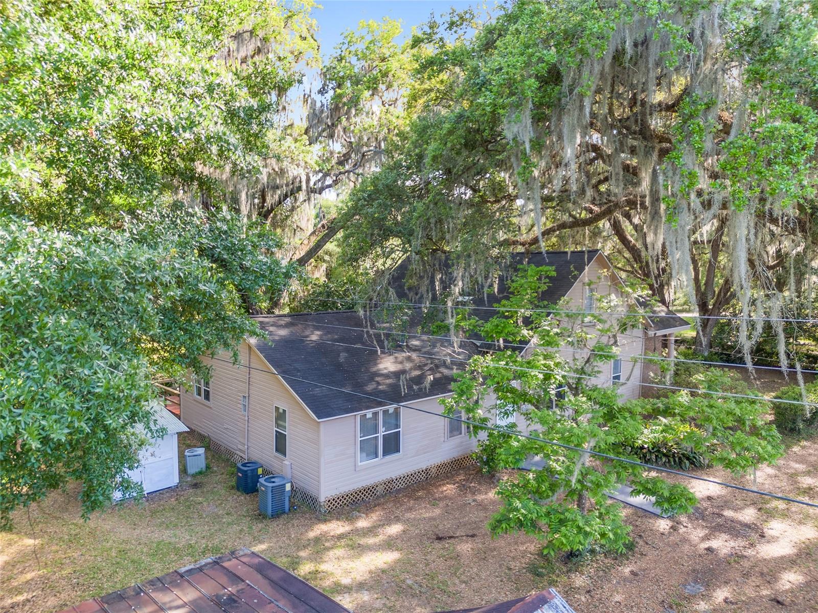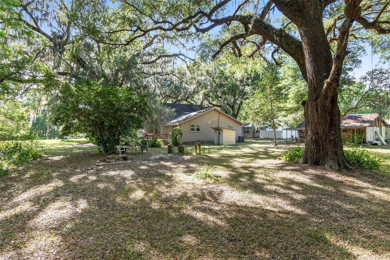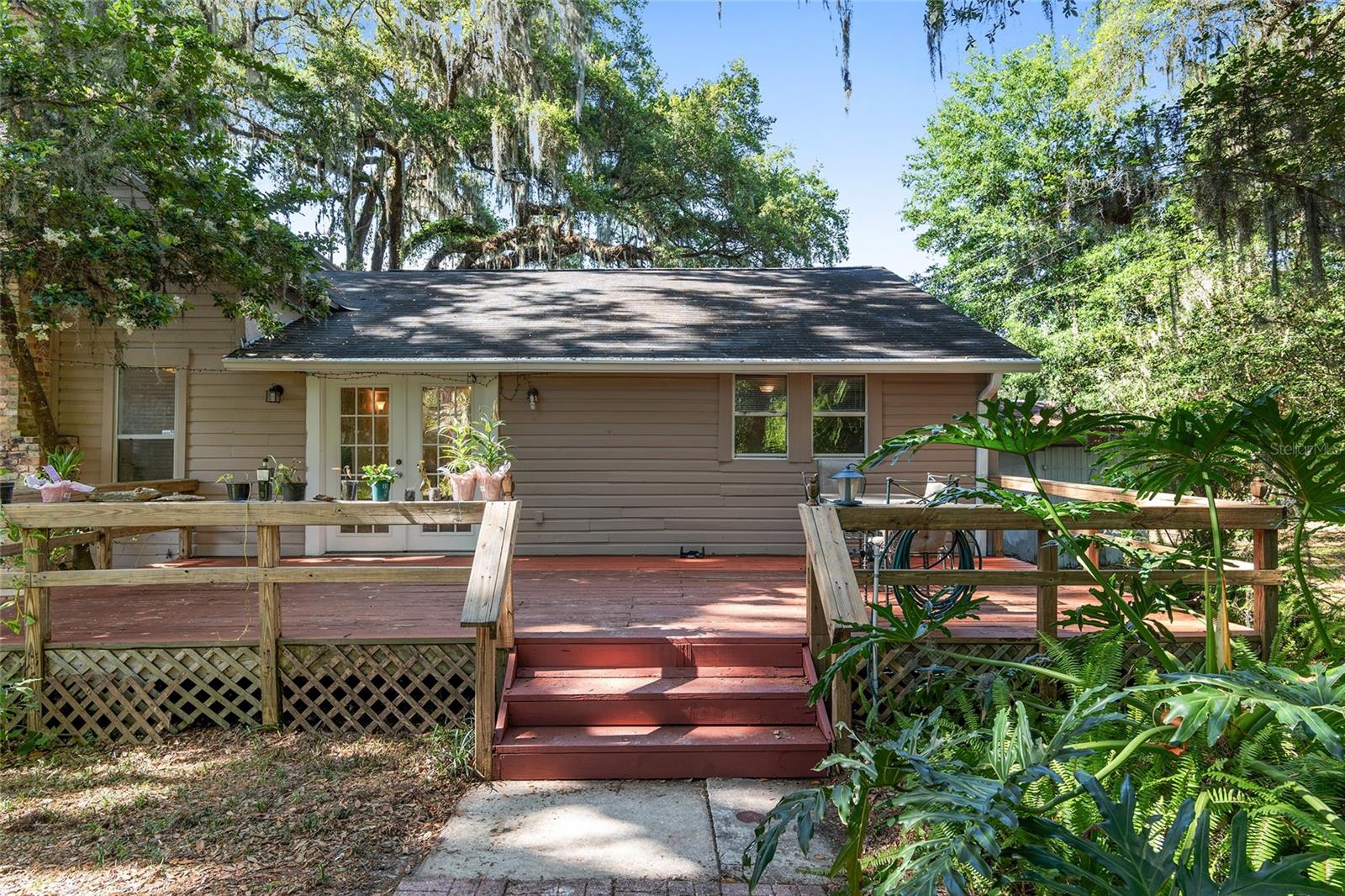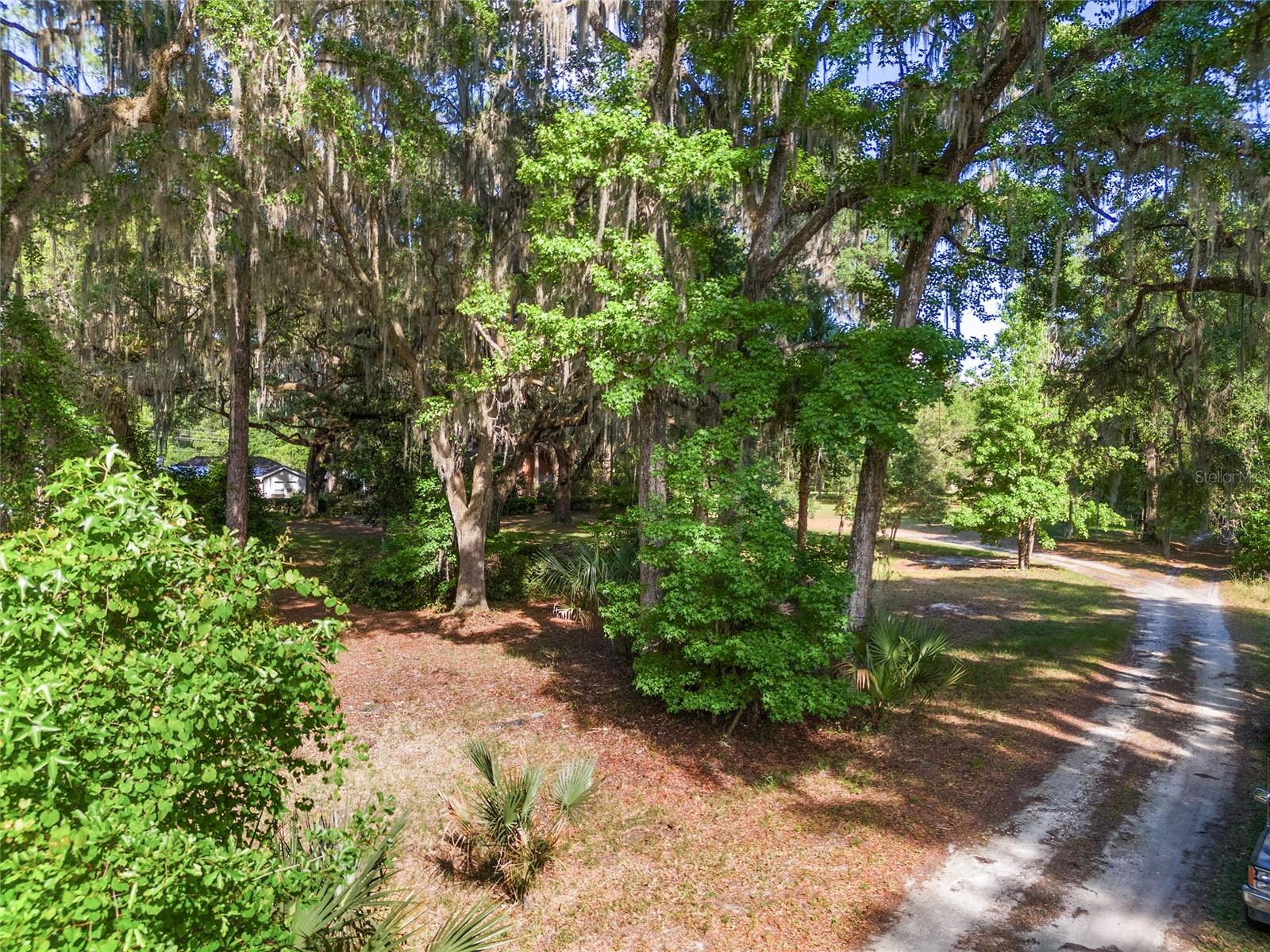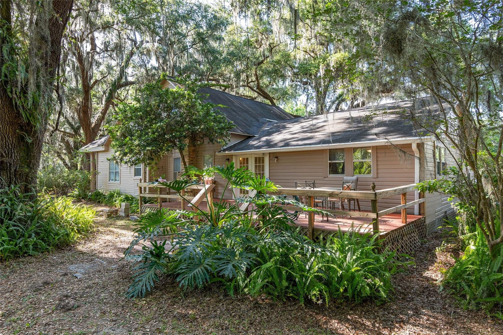 Nestled amid majestic oaks on a generous 2.75 acre parcel of land in Gainesville, this Florida home welcomes you to unwind and savor moments of reflection. Nature enthusiasts will delight in the property's proximity to the Hawthorne Alachua trail and nature parks. Offering accessible opportunities for outdoor recreation, wildlife observation and leisurely strolls. Two-story columns on the front porch evoke a sense of grandeur, complemented by a brick façade and the warmth of wood siding. Stepping through the threshold you are greeted by a spiral staircase that ascends to a second-story loft, creating an enchanting focal point that invites exploration and leading to a versatile space ideal for relaxation or creative endeavors. On each side of the loft is attic storage. Five bedrooms and two bathrooms on the first floor, ample space for comfortable living. The roof and plumbing of the home were updated in 2015. Property has a working well with water softener, filtration system, and UV light purification. Includes refrigerator, range, dishwasher, and washer/dryer. French doors from the dinning room open to a side deck for morning coffee, alfresco dining or gatherings under the stars. There is a spacious shed, ideal for housing outdoor equipment, building materials or pursuing hobbies. Situated just 9 miles from the vibrant heart of downtown Gainesville and a mere 8 miles from the town of Micanopy, this residence offers a perfect blend of tranquility, accessibility, and vintage charm.