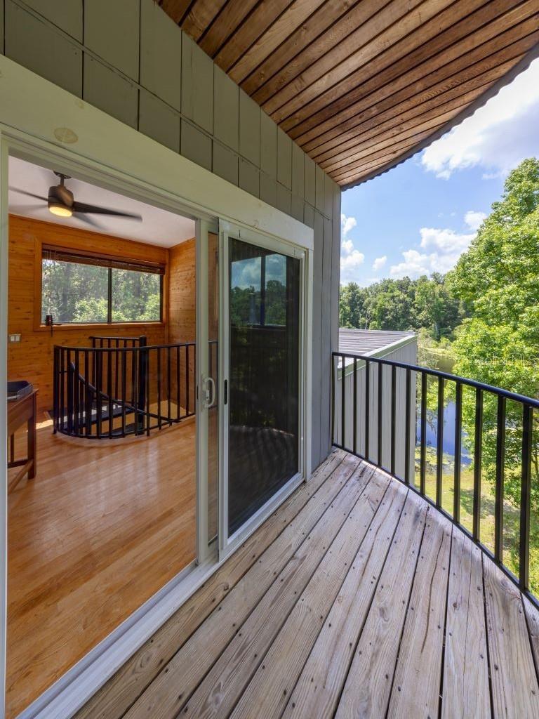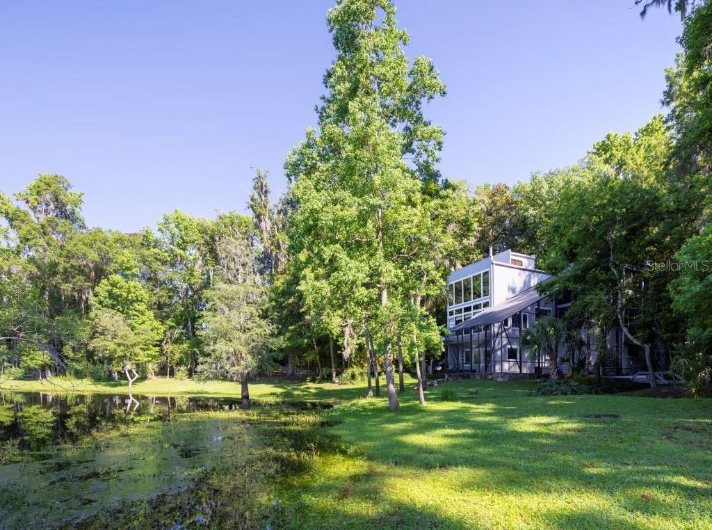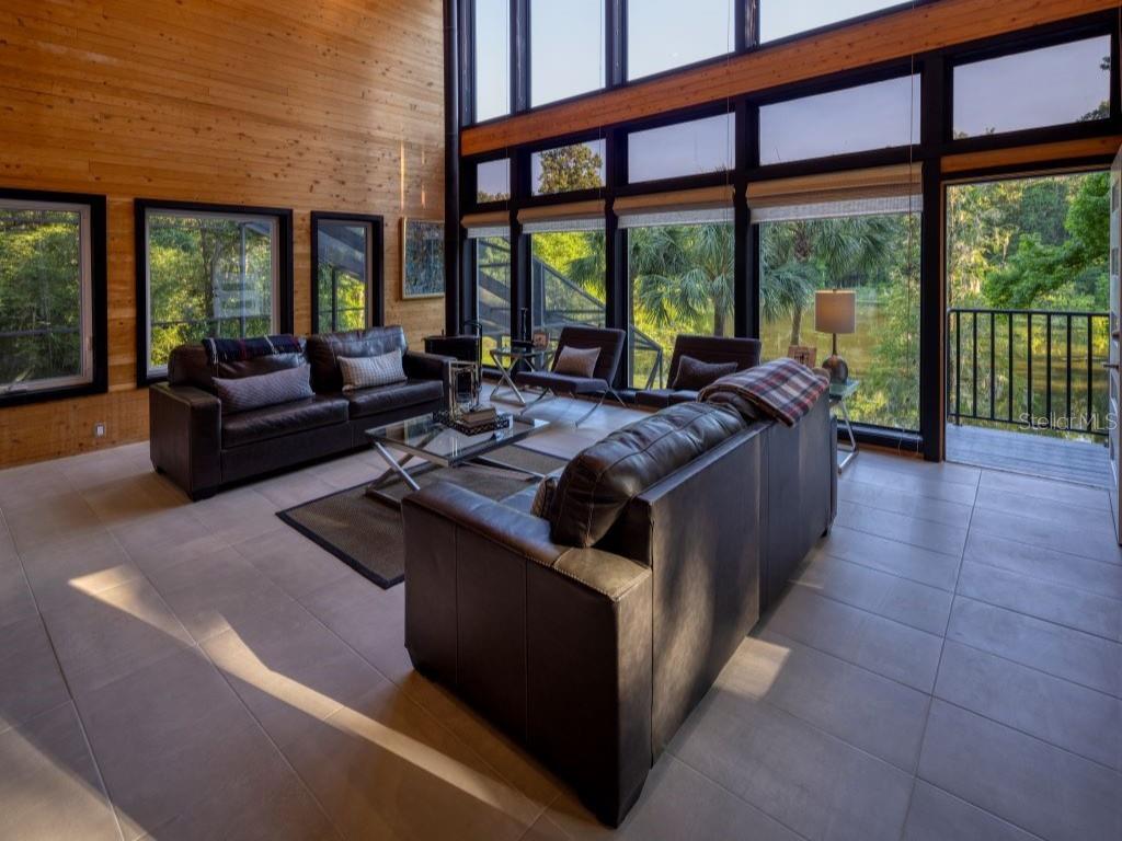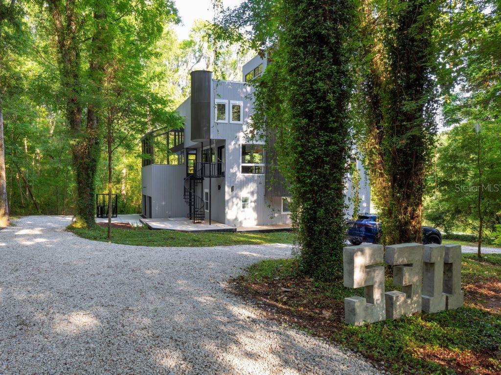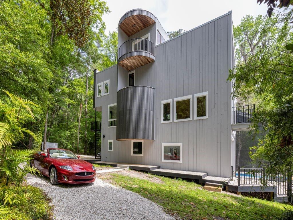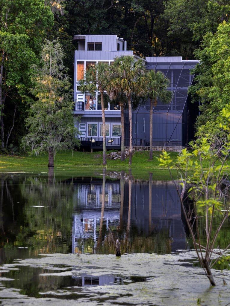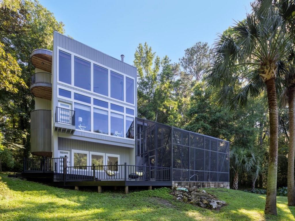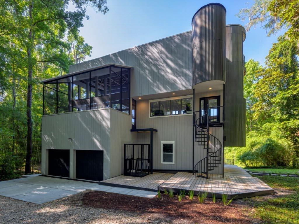 A once in a lifetime opportunity to acquire a captivating, private waterfront 4-story post-modern tree-house that sets this property apart as a truly unique gem. Designed by local architect Tom Tonnelier in 1991, emphasis was placed on maximizing the surrounding natural beauty with decks and balconies, large picture windows from every level, a lap pool housed in a multi-story screened-in area. Wake up daily to the immersive experience with the woodland setting and waterfront views on this 1.93 acre retreat. Attention to detail is evident throughout, remodeled in 2022/2023 with fully upgraded features and modern comforts integrated seamlessly into the design. This outstanding property presents a unique opportunity to live the lifestyle of luxury, privacy, and natural beauty in a meticulously designed and upgraded architectural 4 bedroom, 2.5 bathroom home. The first floor features a stunning flexible living area, currently utilized as a music room. The picture windows offer a seamless connection to the outdoors, allowing natural light to flood the room. A large adjacent deck provides access to the lake and the in-ground 40 foot lap pool. Two guest bedrooms, a double sink vanity bathroom with walk-in shower, a kitchenette/bar area with mini fridge, and a laundry closet complete this floor. The showcase spiral stairway, running the full height of the residence, provides access to all living areas via a custom built curved barn-door. From the exterior, a new elevator leads from the front deck to the main living deck. On the second floor, a spectacular, light-filled, open-concept layout joins the sunken great room, dining area, custom-built kitchen and guest bathroom. The southwest facing 20-foot wall showcases two-story floor to ceiling windows which bring the abundance of nature at this lakeside retreat into the indoors. The home was strategically positioned on the lot to accept the warmth of the sun in winter and avoid the direct heat of the sun in summer. French doors lead to the screened multi-story outdoor living and dining areas with staircase access to the pool. The owners’ suite encompasses the entirety of third floor. Enjoy the luxurious ensuite, complete with freestanding spa bath, double sink vanity, linen closet and a two-story, glass-ceiling, rain shower! The suite contains separate closets and French doors leading to a balcony overlooking the outdoor living/dining room and the pool. Finally, the fourth floor observatory affords 360-degree area viewing and a covered balcony nestled amongst 100 foot high magnolia trees and creeping jasmine. This amazing property is located in the serene and sought-after Hammock neighborhood, a short drive to the Hunters Crossing Publix Shopping Center, ensuring easy access to shopping, dining, and entertainment options. Zoned for Talbot Elementary, Fort Clark Middle and Gainesville High Schools. Close to San Felasco Hammock State Park, Devil's Millhopper Geological State Park, countless springs, UF Health/Shands, HCA North Florida Hospital, and more!