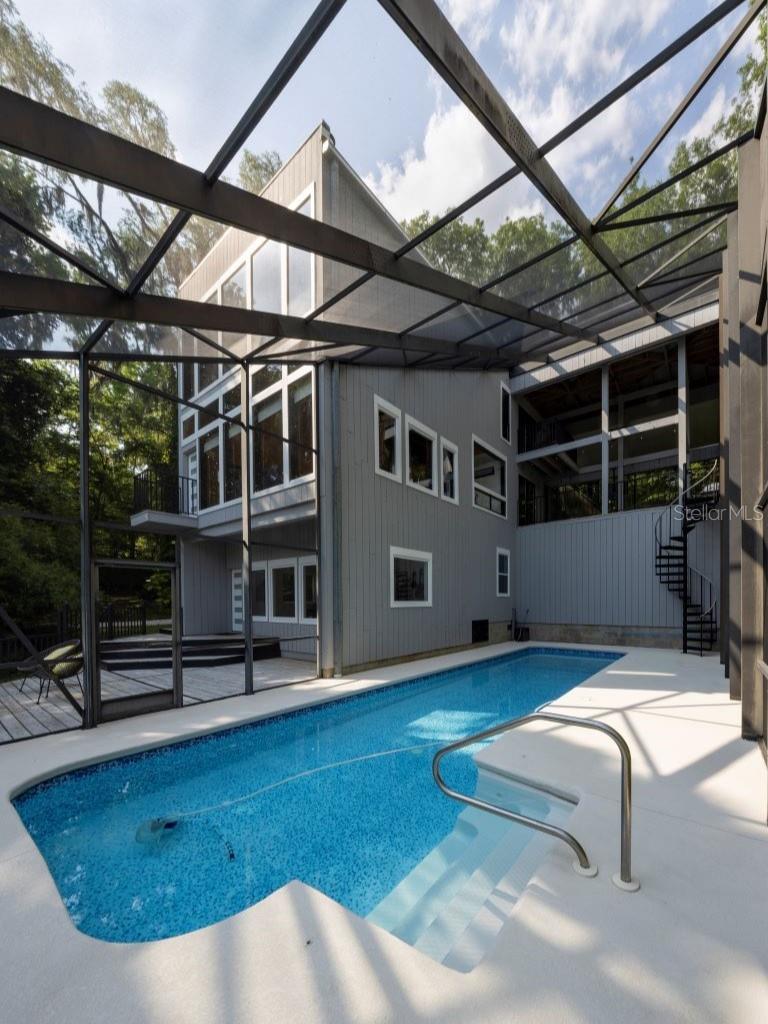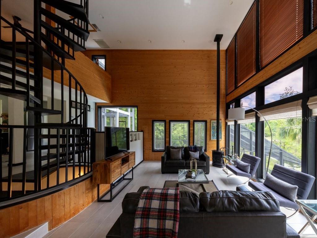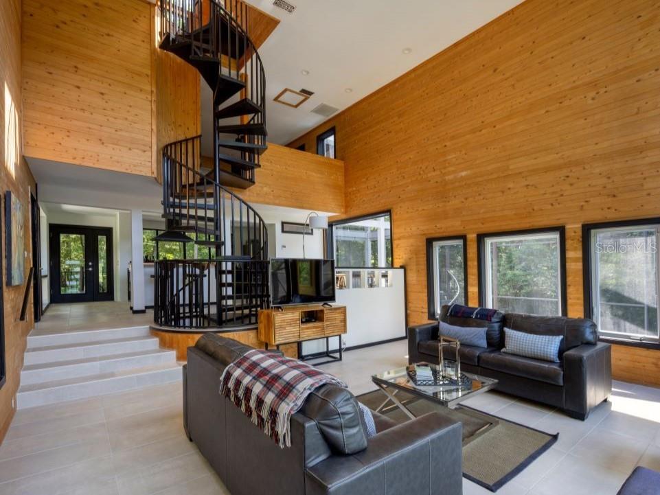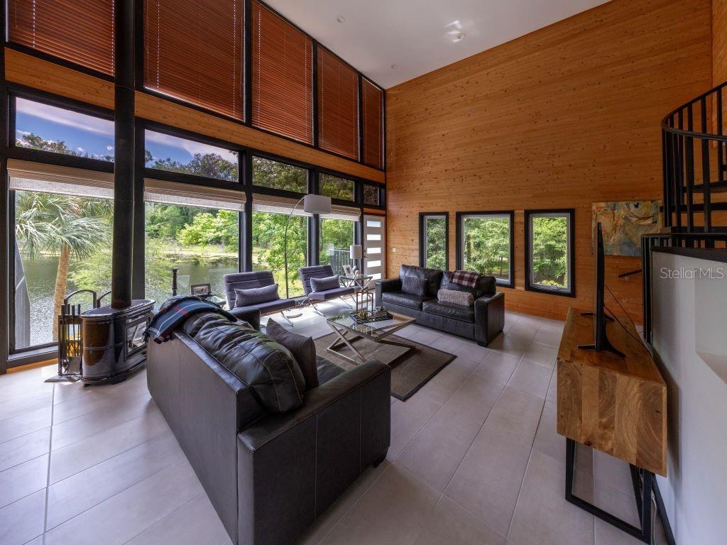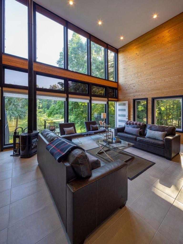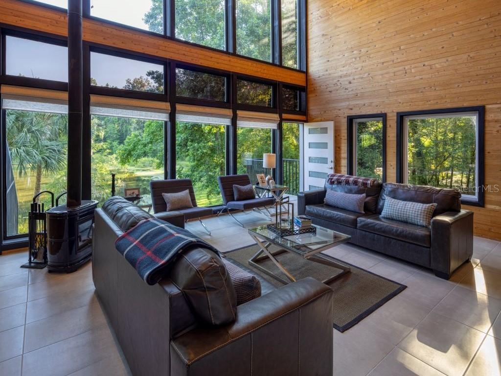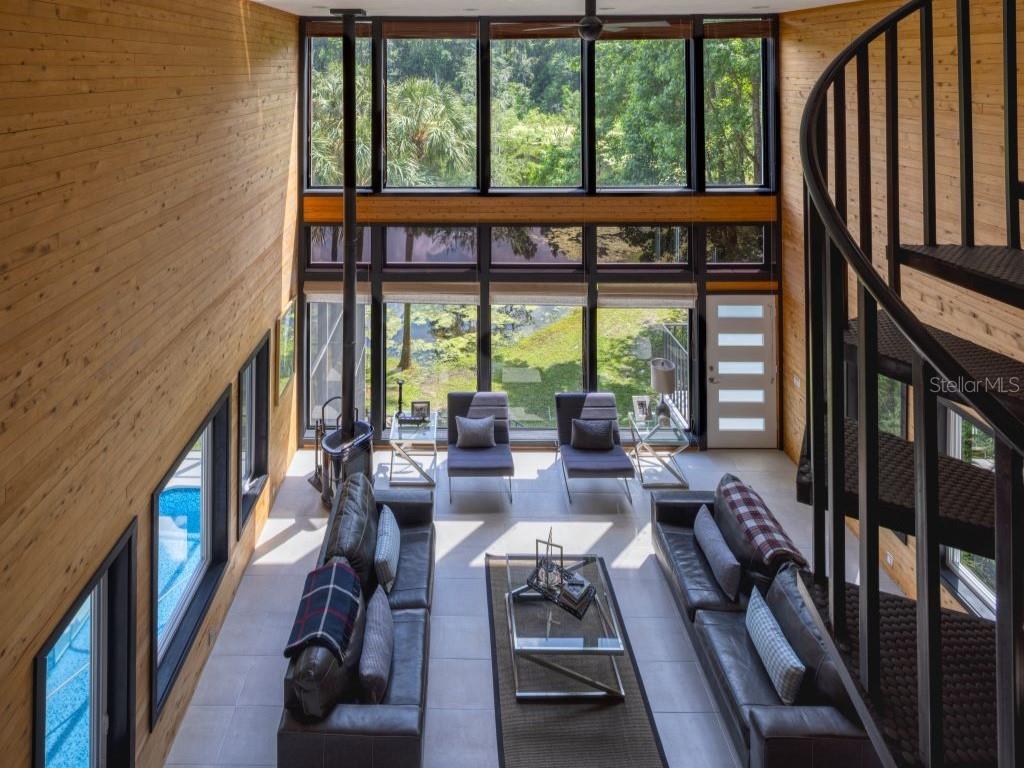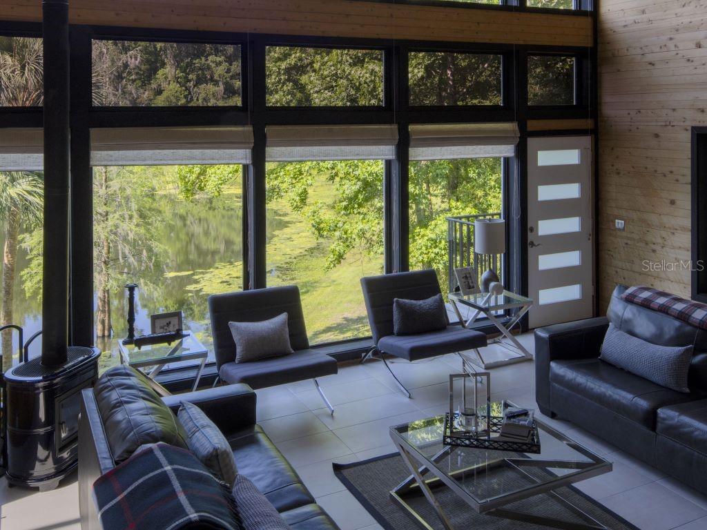 A once in a lifetime opportunity to acquire a captivating, private waterfront 4-story post-modern tree-house that sets this property apart as a truly unique gem. Designed by local architect Tom Tonnelier in 1991, emphasis was placed on maximizing the surrounding natural beauty with decks and balconies, large picture windows from every level, a lap pool housed in a multi-story screened-in area. Wake up daily to the immersive experience with the woodland setting and waterfront views on this 1.93 acre retreat. Attention to detail is evident throughout, remodeled in 2022/2023 with fully upgraded features and modern comforts integrated seamlessly into the design. This outstanding property presents a unique opportunity to live the lifestyle of luxury, privacy, and natural beauty in a meticulously designed and upgraded architectural 4 bedroom, 2.5 bathroom home. The first floor features a stunning flexible living area, currently utilized as a music room. The picture windows offer a seamless connection to the outdoors, allowing natural light to flood the room. A large adjacent deck provides access to the lake and the in-ground 40 foot lap pool. Two guest bedrooms, a double sink vanity bathroom with walk-in shower, a kitchenette/bar area with mini fridge, and a laundry closet complete this floor. The showcase spiral stairway, running the full height of the residence, provides access to all living areas via a custom built curved barn-door. From the exterior, a new elevator leads from the front deck to the main living deck. On the second floor, a spectacular, light-filled, open-concept layout joins the sunken great room, dining area, custom-built kitchen and guest bathroom. The southwest facing 20-foot wall showcases two-story floor to ceiling windows which bring the abundance of nature at this lakeside retreat into the indoors. The home was strategically positioned on the lot to accept the warmth of the sun in winter and avoid the direct heat of the sun in summer. French doors lead to the screened multi-story outdoor living and dining areas with staircase access to the pool. The owners’ suite encompasses the entirety of third floor. Enjoy the luxurious ensuite, complete with freestanding spa bath, double sink vanity, linen closet and a two-story, glass-ceiling, rain shower! The suite contains separate closets and French doors leading to a balcony overlooking the outdoor living/dining room and the pool. Finally, the fourth floor observatory affords 360-degree area viewing and a covered balcony nestled amongst 100 foot high magnolia trees and creeping jasmine. This amazing property is located in the serene and sought-after Hammock neighborhood, a short drive to the Hunters Crossing Publix Shopping Center, ensuring easy access to shopping, dining, and entertainment options. Zoned for Talbot Elementary, Fort Clark Middle and Gainesville High Schools. Close to San Felasco Hammock State Park, Devil's Millhopper Geological State Park, countless springs, UF Health/Shands, HCA North Florida Hospital, and more!
