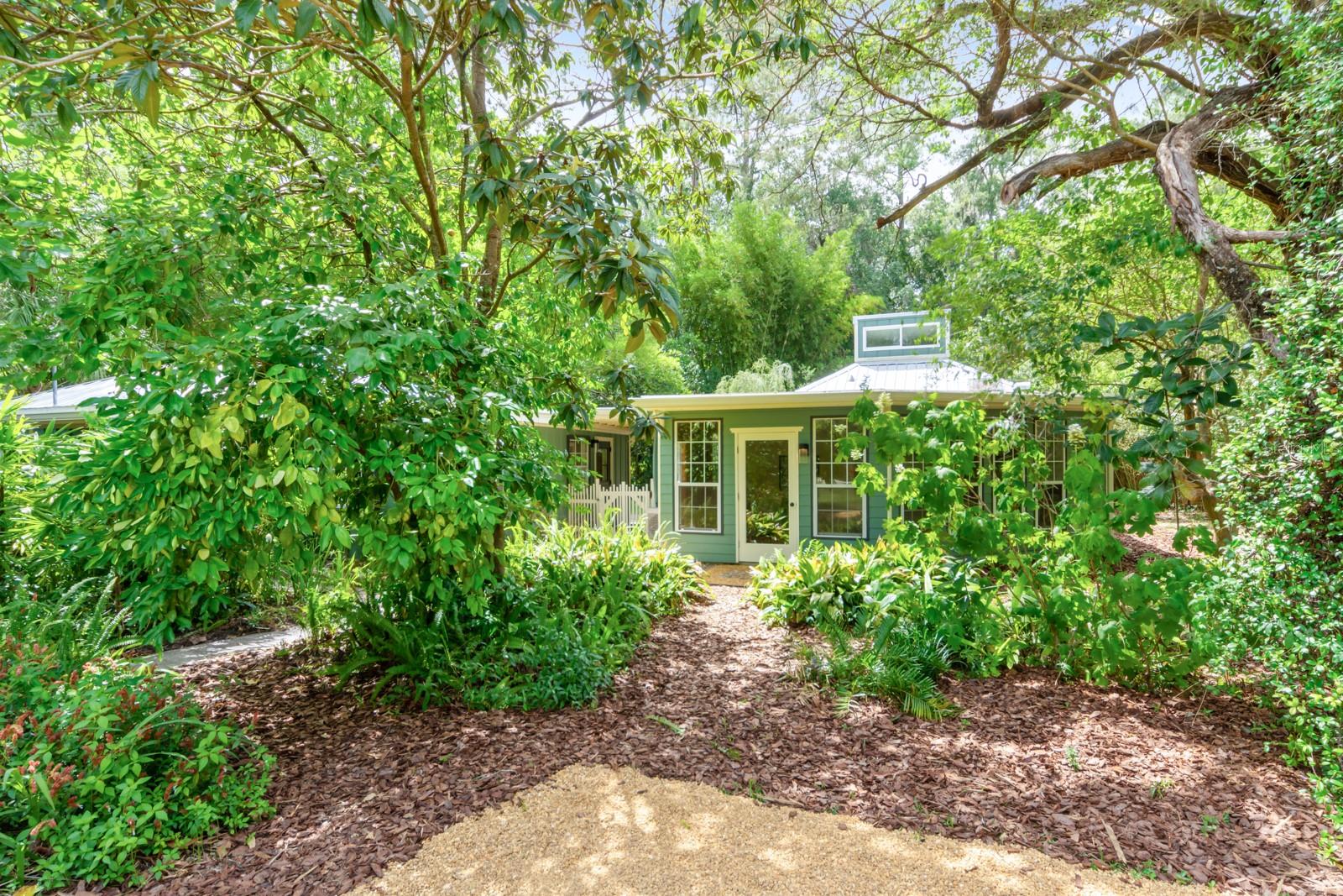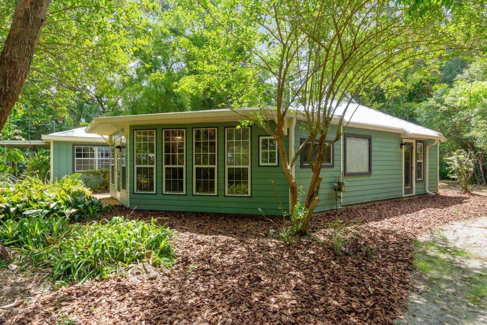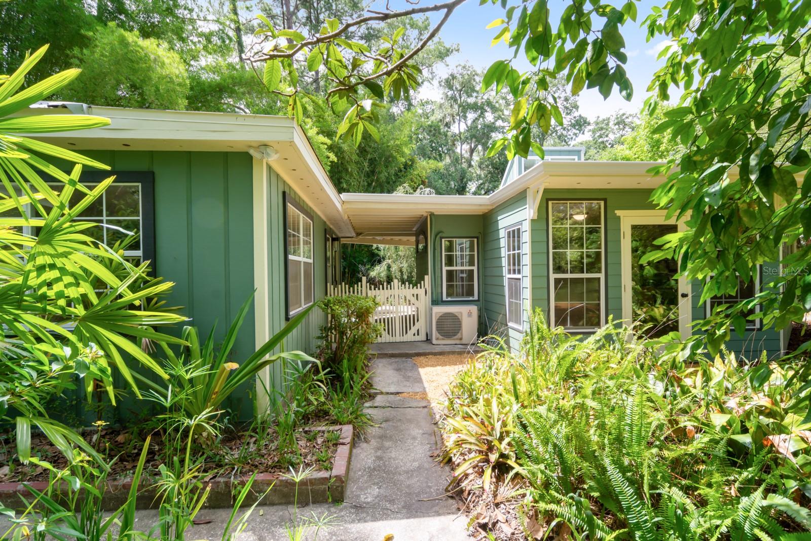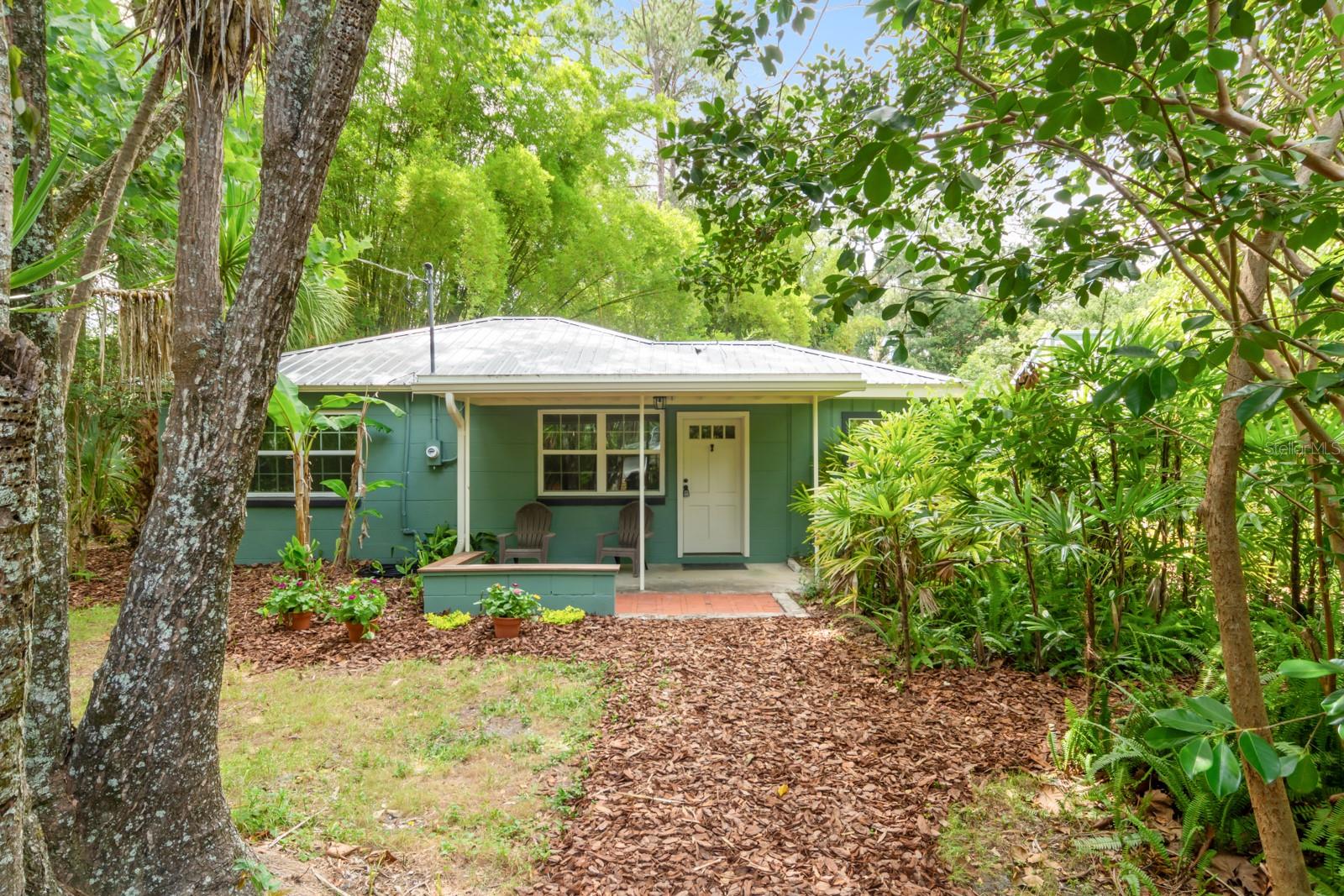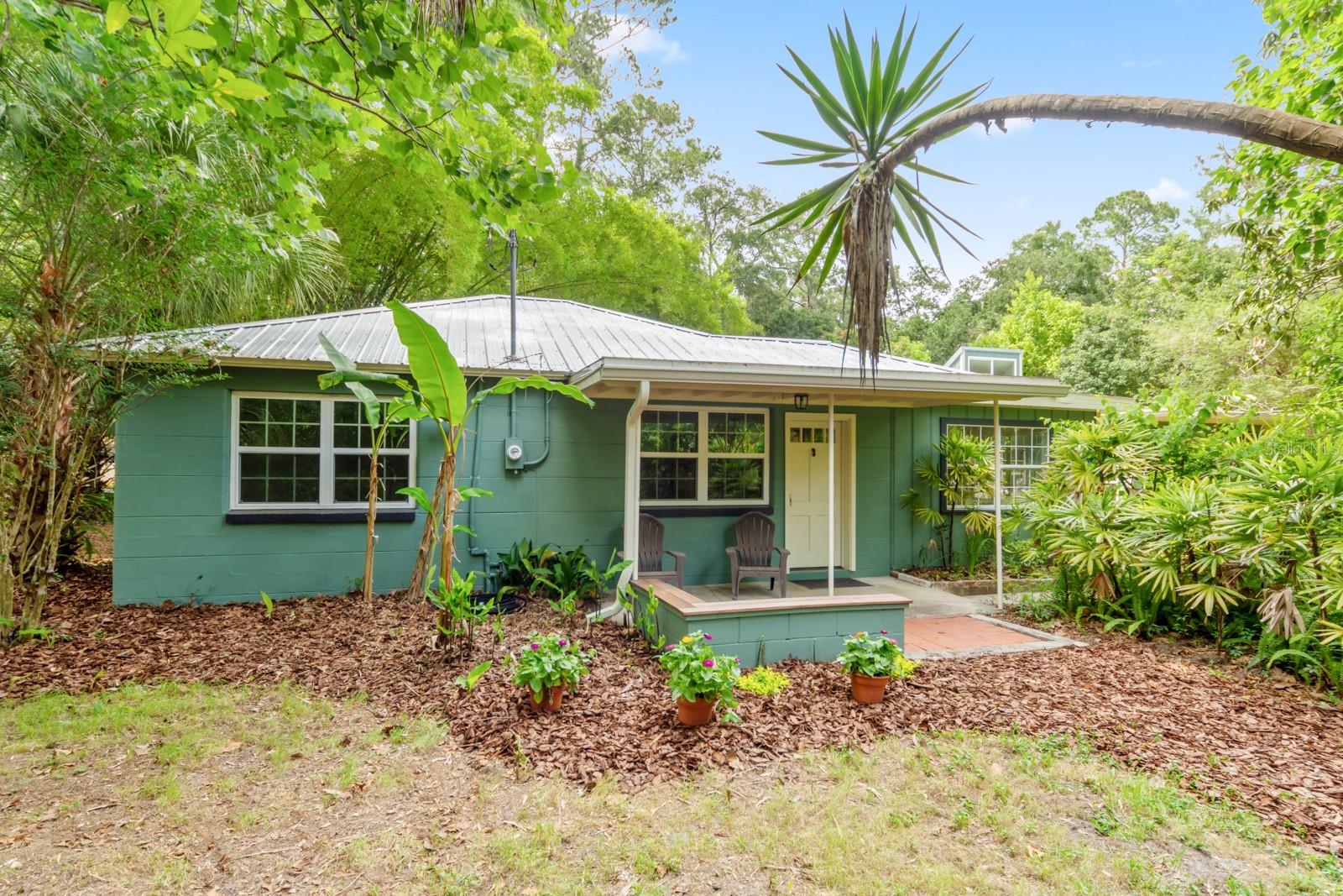 Absolutely CHARMING one of a kind home in a prime location in NE Gainesville! This home is essentially TWO homes in one! The main home offers 2 Bedrooms, 1 Bathroom, a BRAND NEW KITCHEN, separate living and dining rooms, Saltillo tile as well as new modern tile. The main home also boasts new windows, fresh paint and new kitchen appliances. The guest house, which is attached by a covered breezeway, boasts a large bedroom, 1 full bathroom, kitchen, living space and a quaint little loft perfect for a little one to sleep or as a reading nook. It also features handcrafted cedar and cypress shelving, cabinetry, panelling, and trim with new paint inside and out. A beautiful METAL ROOF was installed in 2018. There are two sets of washer/dryer hookups outside making it perfect for the ability to rent out the guest house if one so pleased as an income producing property. A GREAT LOCATION, this home is situated with Tom Petty Park to the West and Citizens Park to the East, a 2 minute walk from a new public Library, Public & General, and Howard Bishop. It's also only a 10 minute walk to the Thomas Center, Vine Bakery, Roper Park, Afternoon restaurant, Cypress & Grove Brewery, East End Eatery, and many other local businesses that make East Gainesville popular. While convenient and quick to drive, the home is also about a 10 minute bike ride to UF, Depot Park, Heartwood Soundstage, South Main Station, 4th Ave Food Park, Ward’s Supermarket, Curia, Shands, Sweetwater Wetlands, Payne’s Prairie, or the Hawthorne Trail. The yard has an abundance of zebra longwing and gulf fritillary butterflies because of the well-established passionflower vines, firebush, and other pollinator delights. Come check out how truly special this home is for yourself!