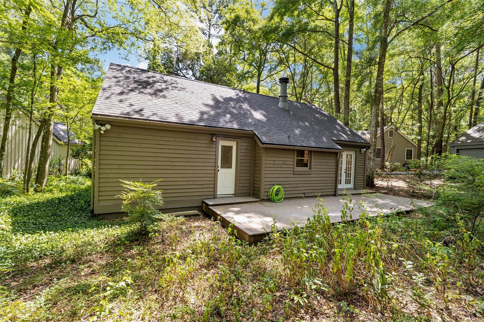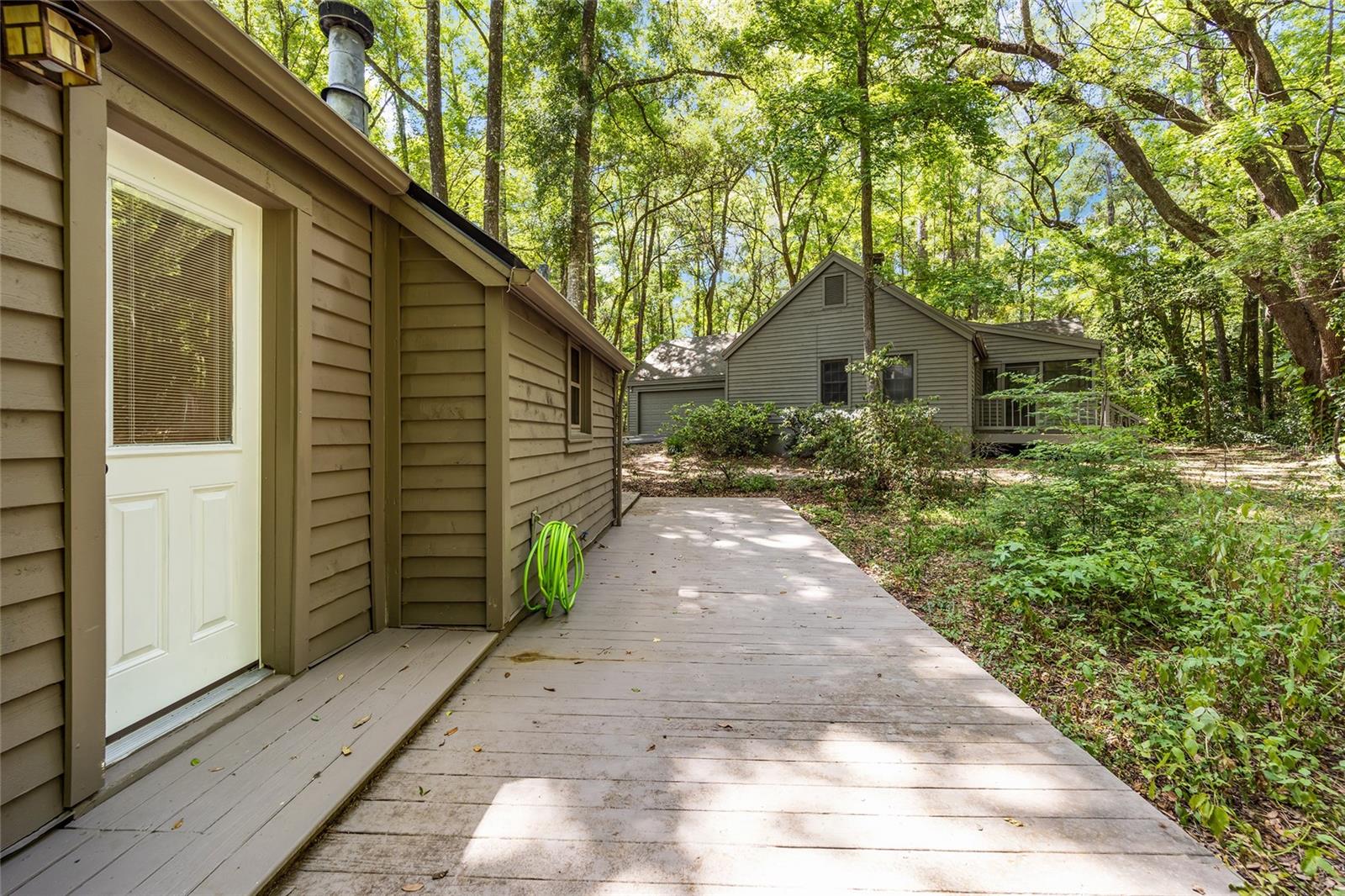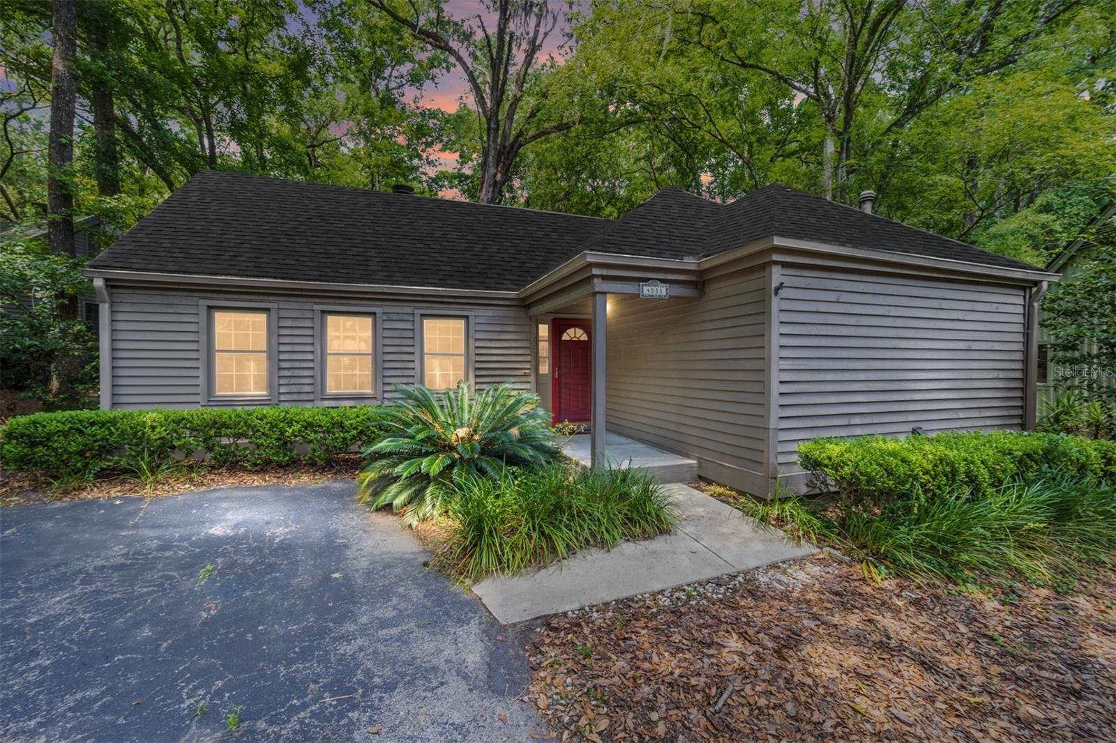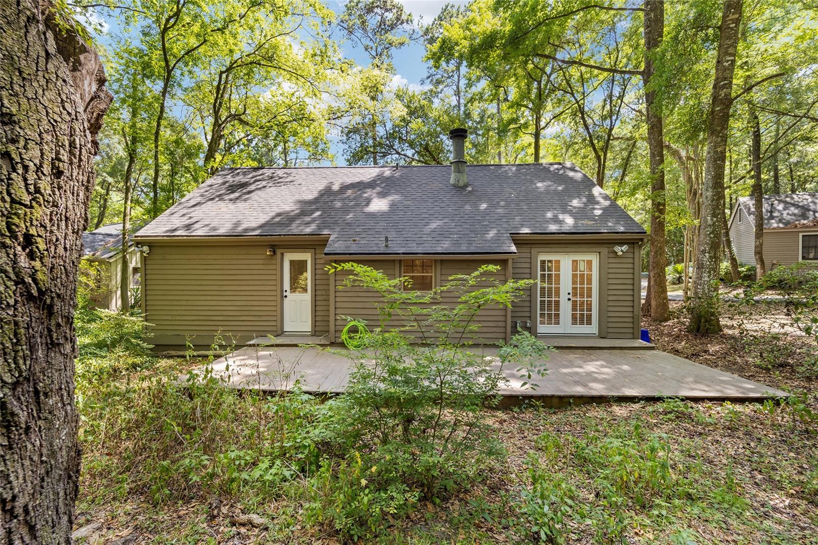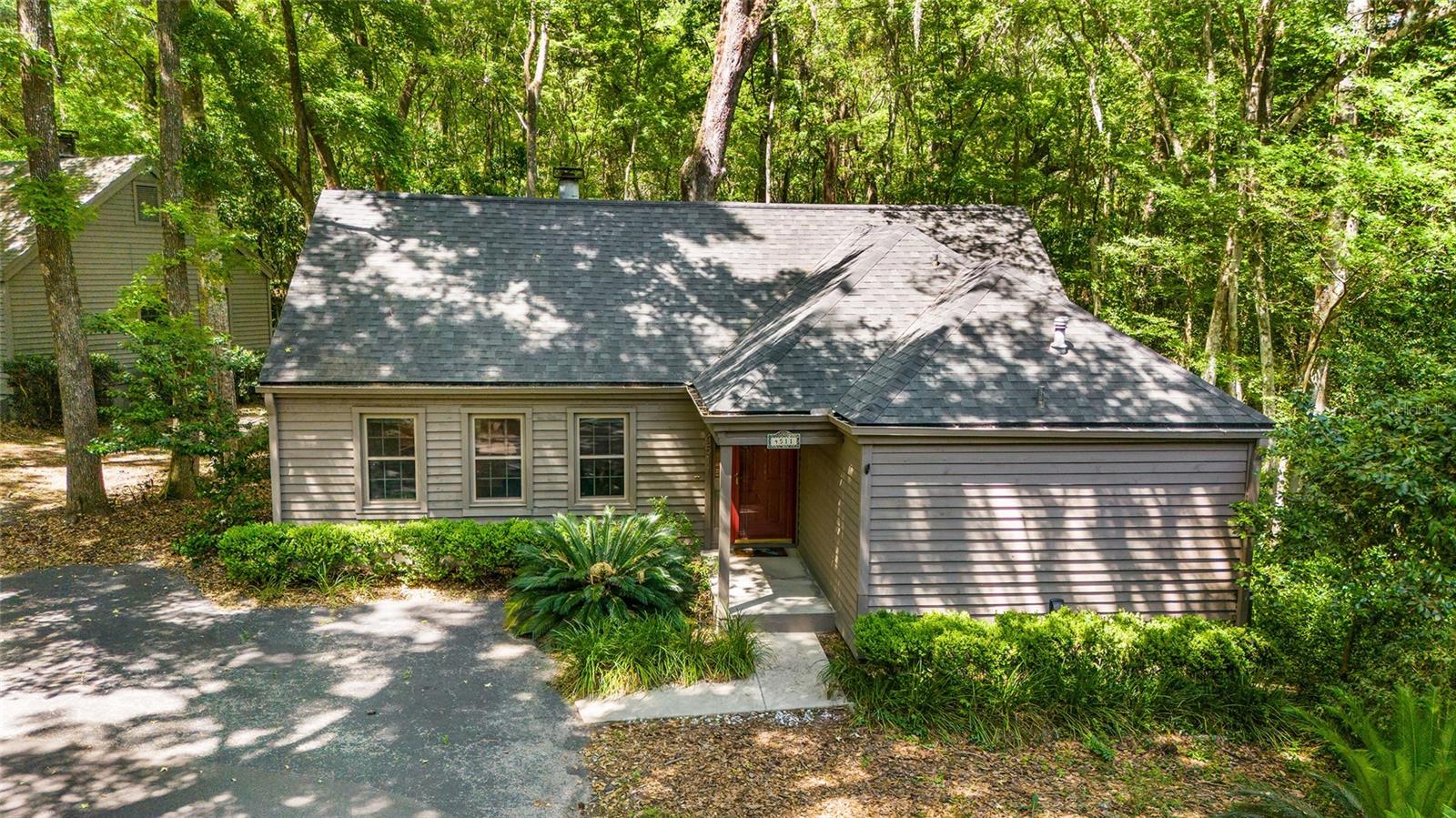 Welcome to this delightful 2-bedroom, 2 bathroom single-family home nestled in the highly sought-after Founders Hill community within Haile Plantation! This home is positioned on a quiet cul-de-sac offering privacy and tranquility. The foyer leads to an open spacious living area with a cozy wood burning fireplace and dining room. The kitchen has a small eat-in area and features stainless steel appliances, granite countertops and oversized travertine floors. Luxury vinyl plank flooring in the living/dining area and tile throughout the rest of the house. NO CARPET! French doors off the kitchen open to a wooden deck perfect for outdoor relaxation. New roof was installed in 2022 and HVAC was updated in 2016. Gas water heater and natural gas heating. Newer installed double insulated windows for enhanced energy efficiency. All the lighting has been updated to LED. Clearwave Water softener installed. One mile away from the heart of Haile Village with its many restaurants, shops and community events. This home combines timeless design with contemporary conveniences. Schedule your showing today to experience all this home has to offer.