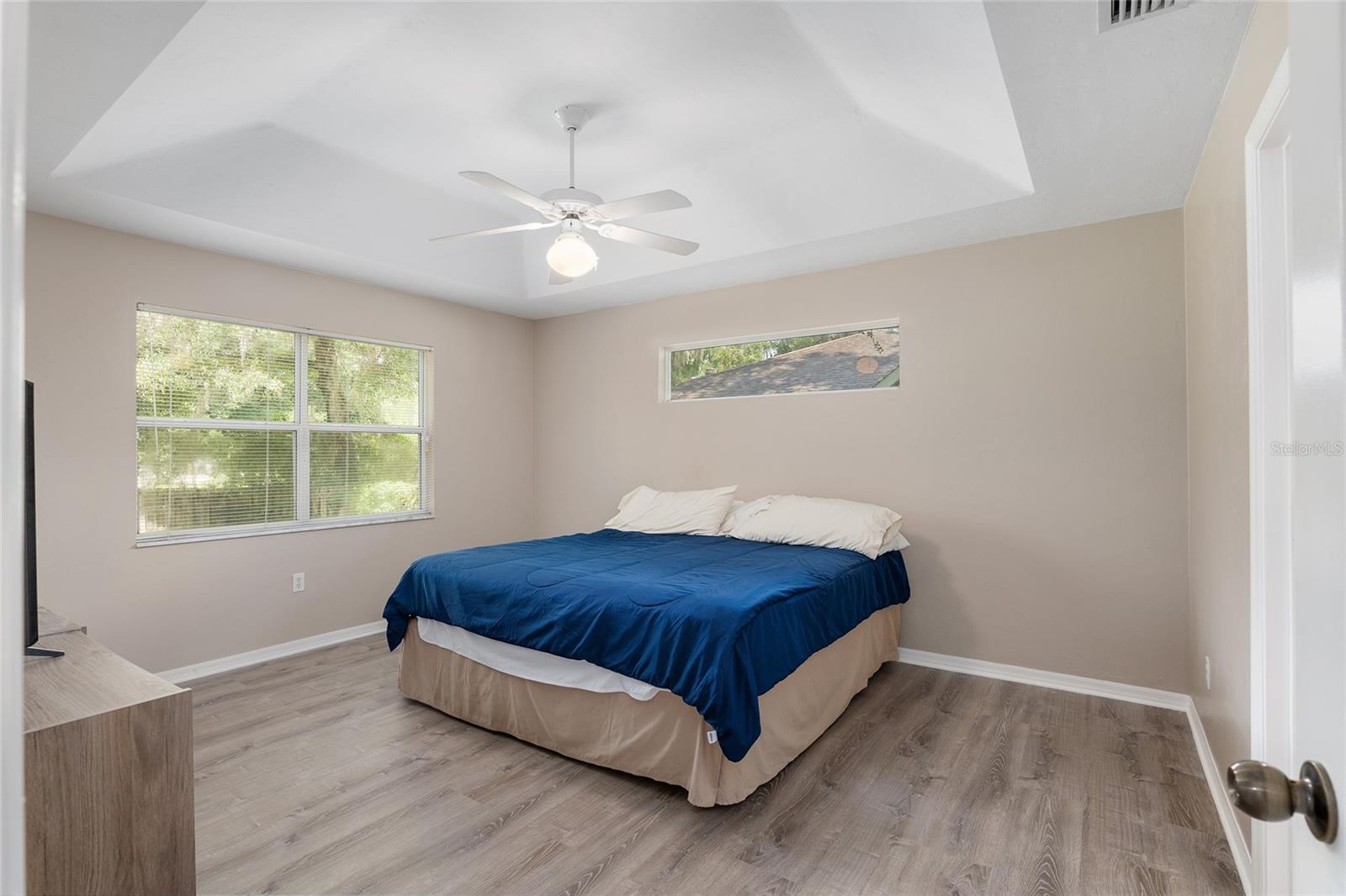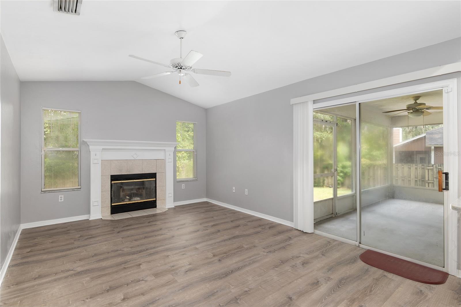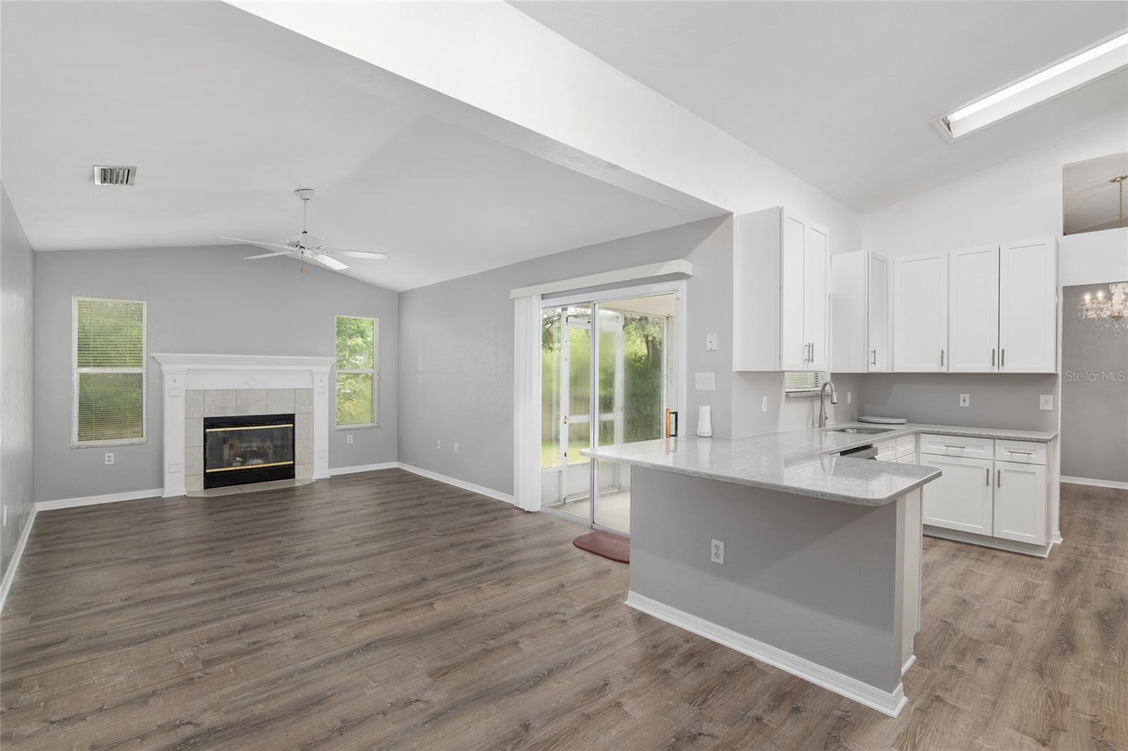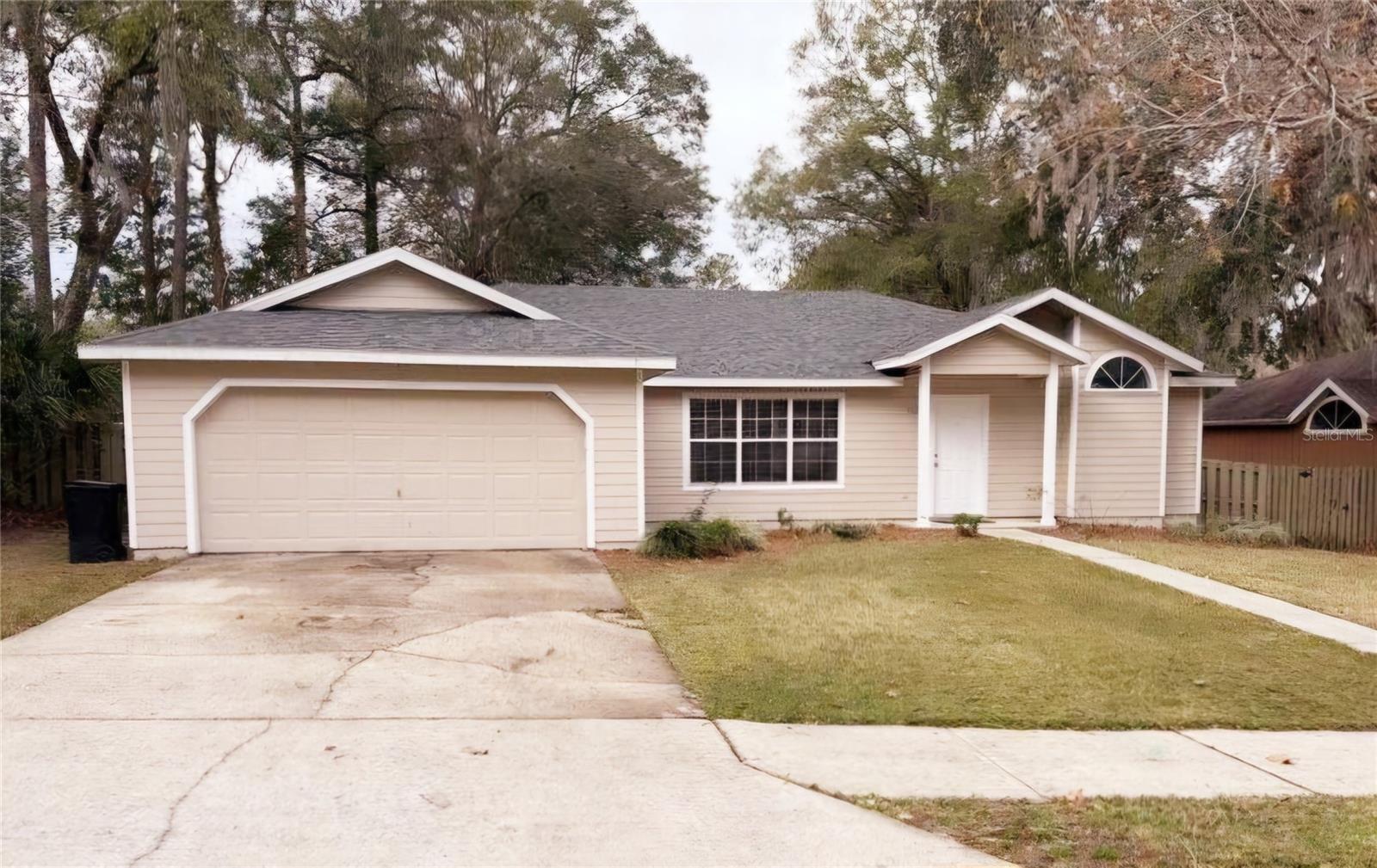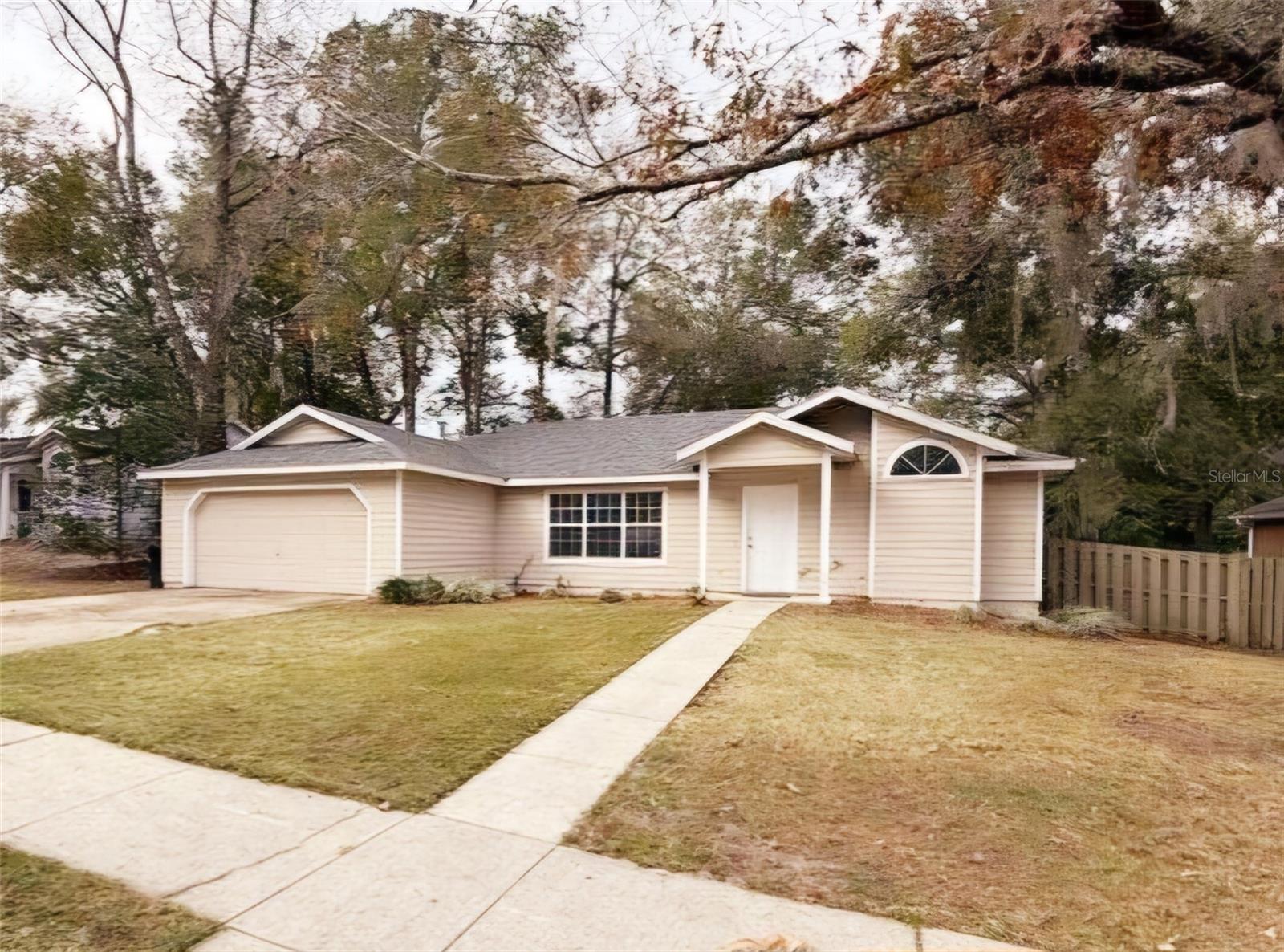 Don’t miss out on this newly renovated 3-bedroom 2-bathroom home located in the desired area of northwest Gainesville. This home is truly turn key. Features include beautiful life proof and water proof luxury vinyl flooring with interior completely painted. Custom installed soft close kitchen cabinetry, luxurious quartz counter tops and stainless steel appliances. This 1592sqft home consist of high vaulted ceilings, split floor plan with open dinning and living space and enjoy taking in the coziness of a wood burning fire place during season. In addition, there’s a separate formal dinning area and great room which brings plenty of space for guest. Primary room features trey ceilings, upgraded vanity with soft close cabinets, dual sinks and walk-in closet space. Sliding glass doors lead to an enclosed screened lanai which provides more space for all sorts of activities and a one-of-a-kind environment. Enjoy your privacy bc this .19 lot home is fully fenced surrounding the retention pond out back. Additional features include a new roof, under ground sprinkler system, washer/dryer and a Simply Safe full home security system. This is a great home and ideal location for the next new owner.