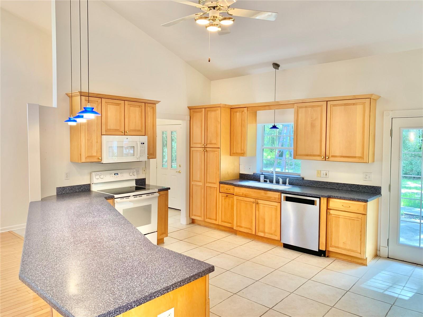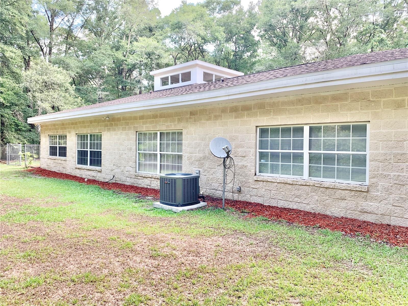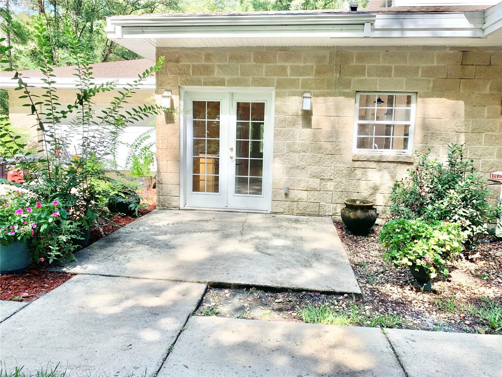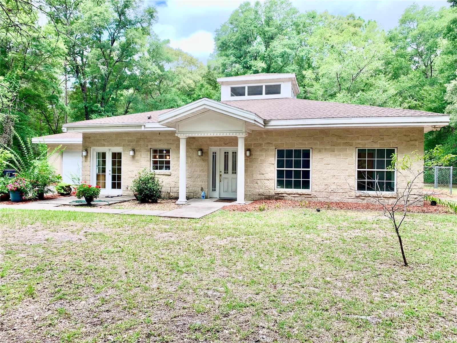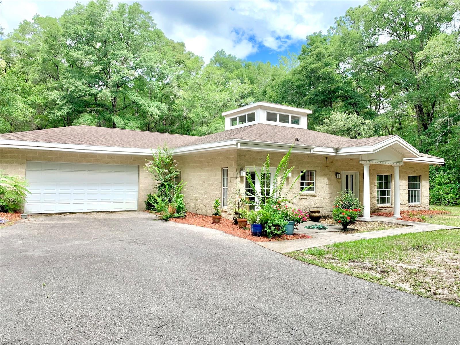 Quiet and Secluded with all the conveniences of Haile Plantation. This home is a custom built insulated concrete block home with an amazing cupola at its peak that lets in lots of natural night. Upon entering the home you will be greeted by the impressive high ceiling adorned with Corinthian style columns in the center of the living room. The kitchen features beautiful wood cabinets with Corian counter tops. The kitchen opens to the living and dinning area with a large breakfast bar. The wood floors in most areas of the home add a nice warmth to the contemporary styling of the home. From the living room you have access to 3 guest bedrooms and one guest bathroom. All the bedrooms are spacious and have high vaulted ceilings. The large primary bedroom has lots of natural lighting and a great view of the front yard of the home. The ensuite bathroom has wonderful dual sink wood vanity with granite top and large walk-in shower. Additionally there is a huge walk-in closet in the primary bedroom. There is an attached two car garage with added closet storage. The bedrooms of the home have been freshly painted to give the new owners a blank slate to make it their own. There is a small fenced dog run area on the side of the the home which could also be used for a garden area. The front of the home has a patio accessed through the French doors from the kitchen. The home is serviced by a standby propane home generator to ensure ongoing comfort. This home resides on 10 acres of wooded land which offers privacy and frequent sightings of wild life. Just minutes from the Haile Village center which offers a large array of conveniences and the weekly farmers market. Home utility bill runs around $200 with the home being so well insulated. There is a water softener system which services the house. Roof and HVAC replaced in 2022.