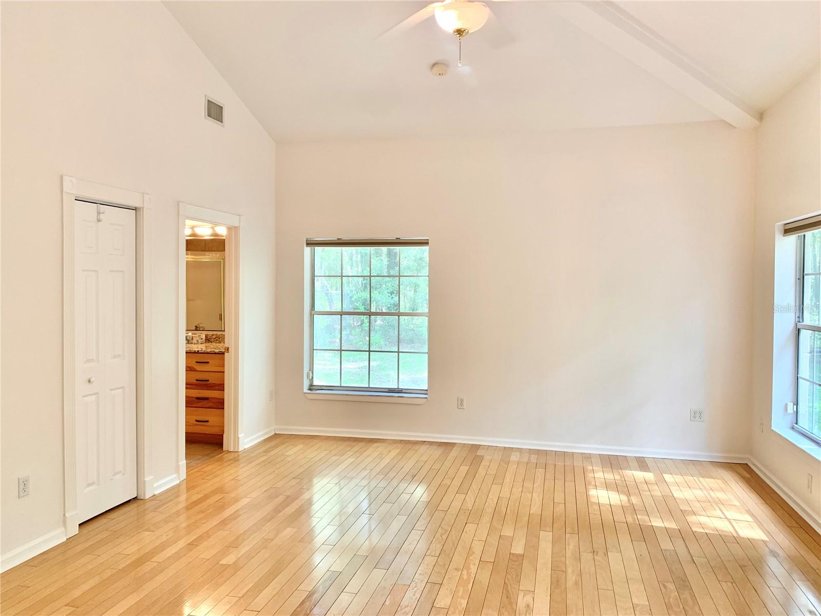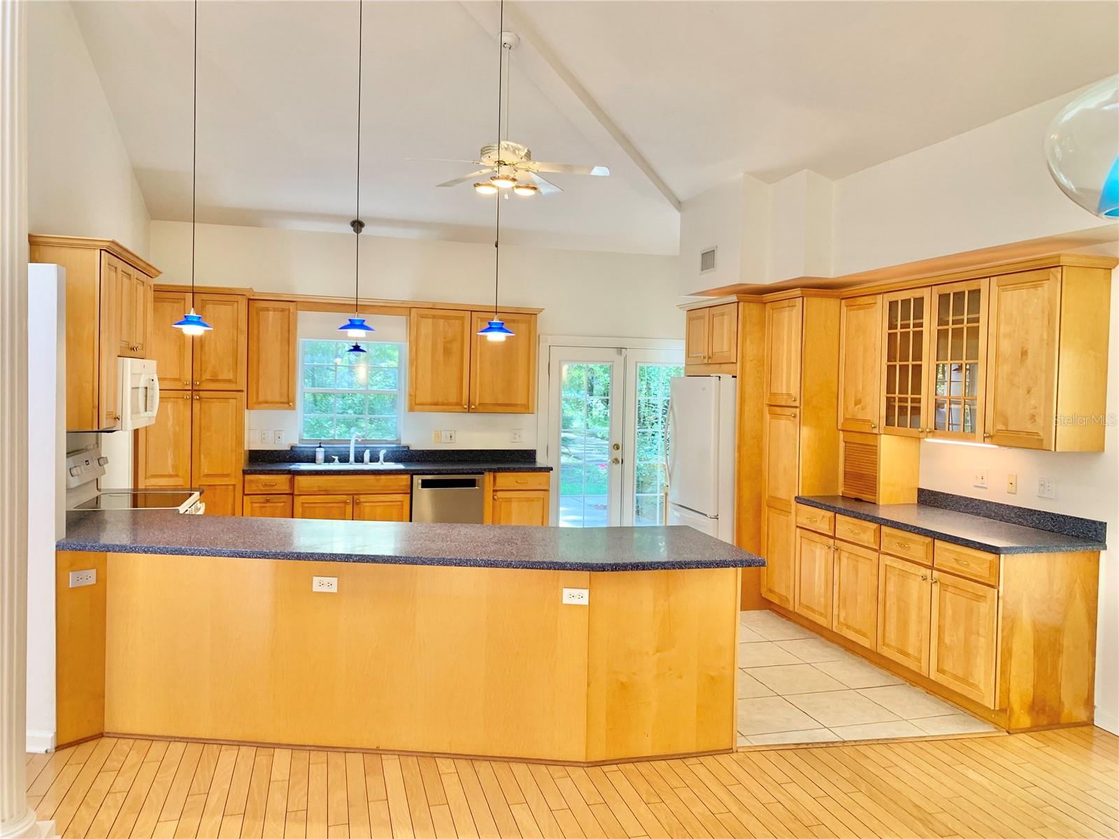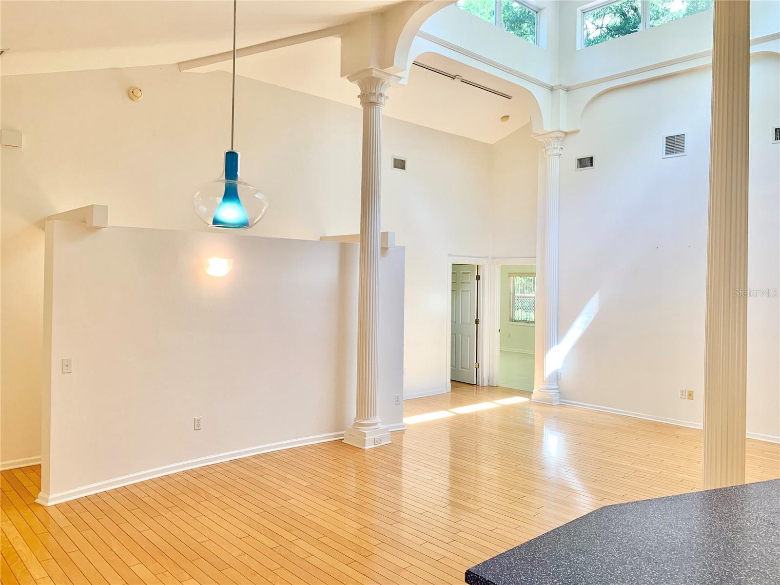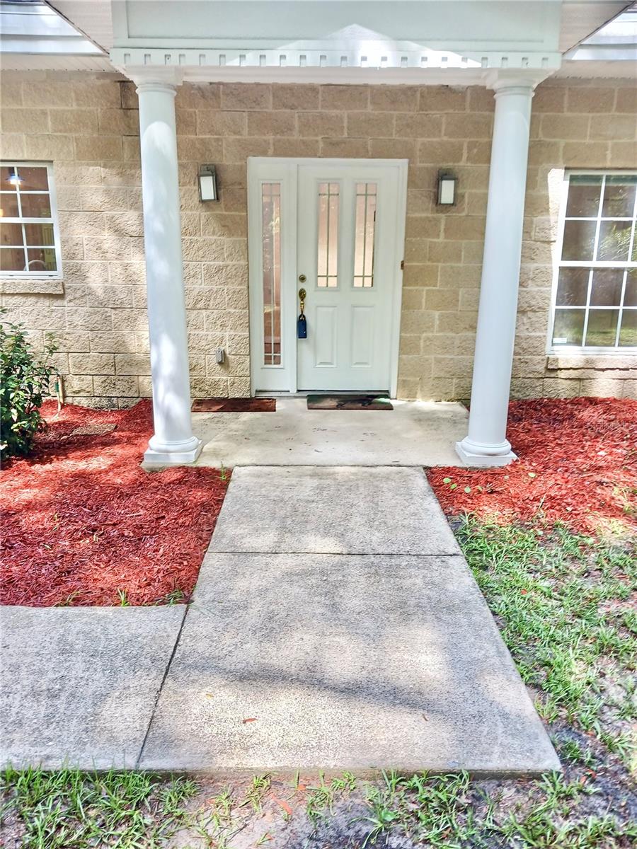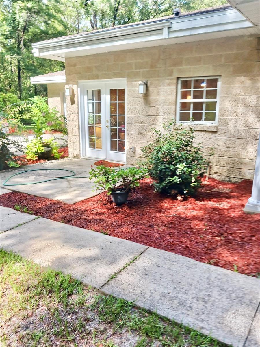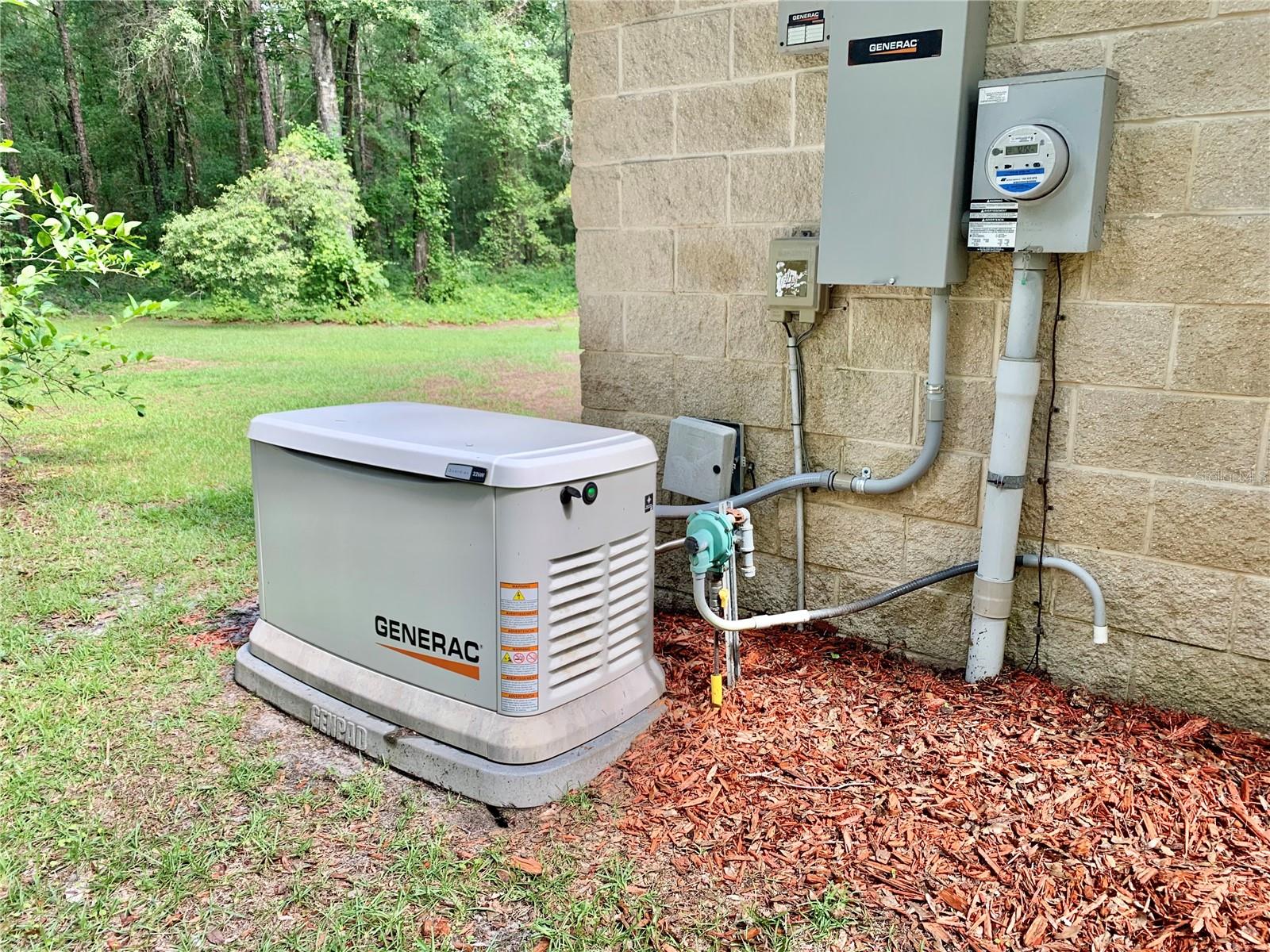 Quiet and Secluded with all the conveniences of Haile Plantation. This home is a custom built insulated concrete block home with an amazing cupola at its peak that lets in lots of natural night. Upon entering the home you will be greeted by the impressive high ceiling adorned with Corinthian style columns in the center of the living room. The kitchen features beautiful wood cabinets with Corian counter tops. The kitchen opens to the living and dinning area with a large breakfast bar. The wood floors in most areas of the home add a nice warmth to the contemporary styling of the home. From the living room you have access to 3 guest bedrooms and one guest bathroom. All the bedrooms are spacious and have high vaulted ceilings. The large primary bedroom has lots of natural lighting and a great view of the front yard of the home. The ensuite bathroom has wonderful dual sink wood vanity with granite top and large walk-in shower. Additionally there is a huge walk-in closet in the primary bedroom. There is an attached two car garage with added closet storage. The bedrooms of the home have been freshly painted to give the new owners a blank slate to make it their own. There is a small fenced dog run area on the side of the the home which could also be used for a garden area. The front of the home has a patio accessed through the French doors from the kitchen. The home is serviced by a standby propane home generator to ensure ongoing comfort. This home resides on 10 acres of wooded land which offers privacy and frequent sightings of wild life. Just minutes from the Haile Village center which offers a large array of conveniences and the weekly farmers market. Home utility bill runs around $200 with the home being so well insulated. There is a water softener system which services the house. Roof and HVAC replaced in 2022.