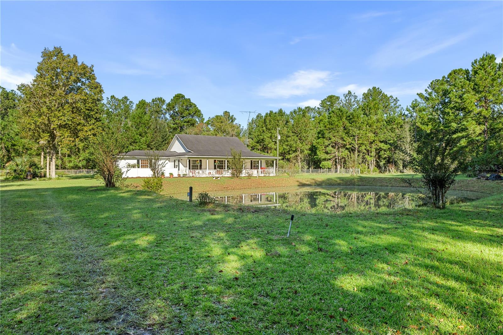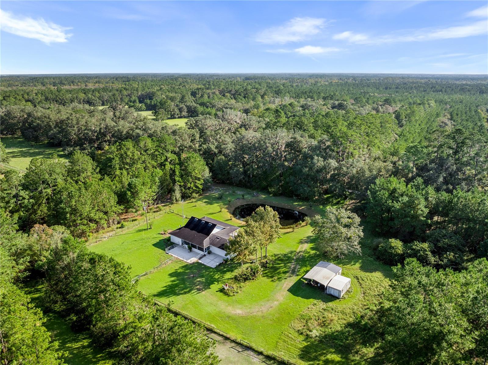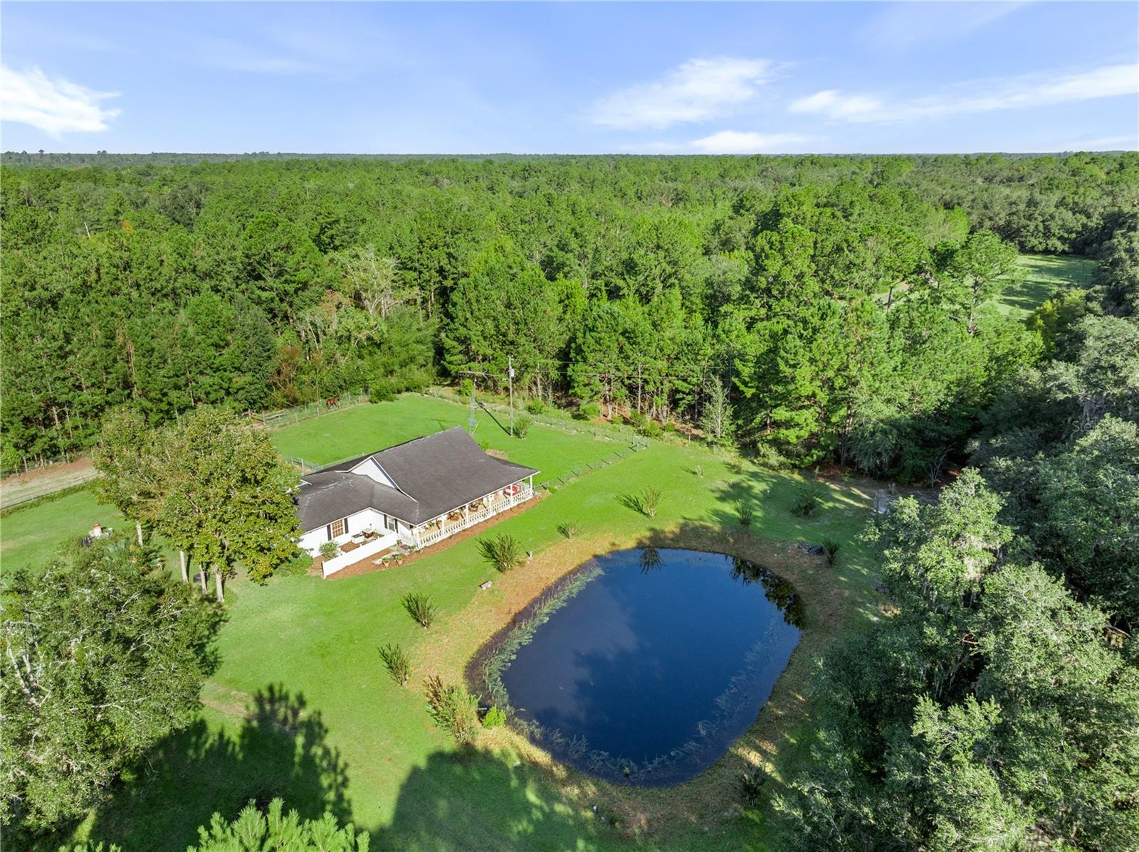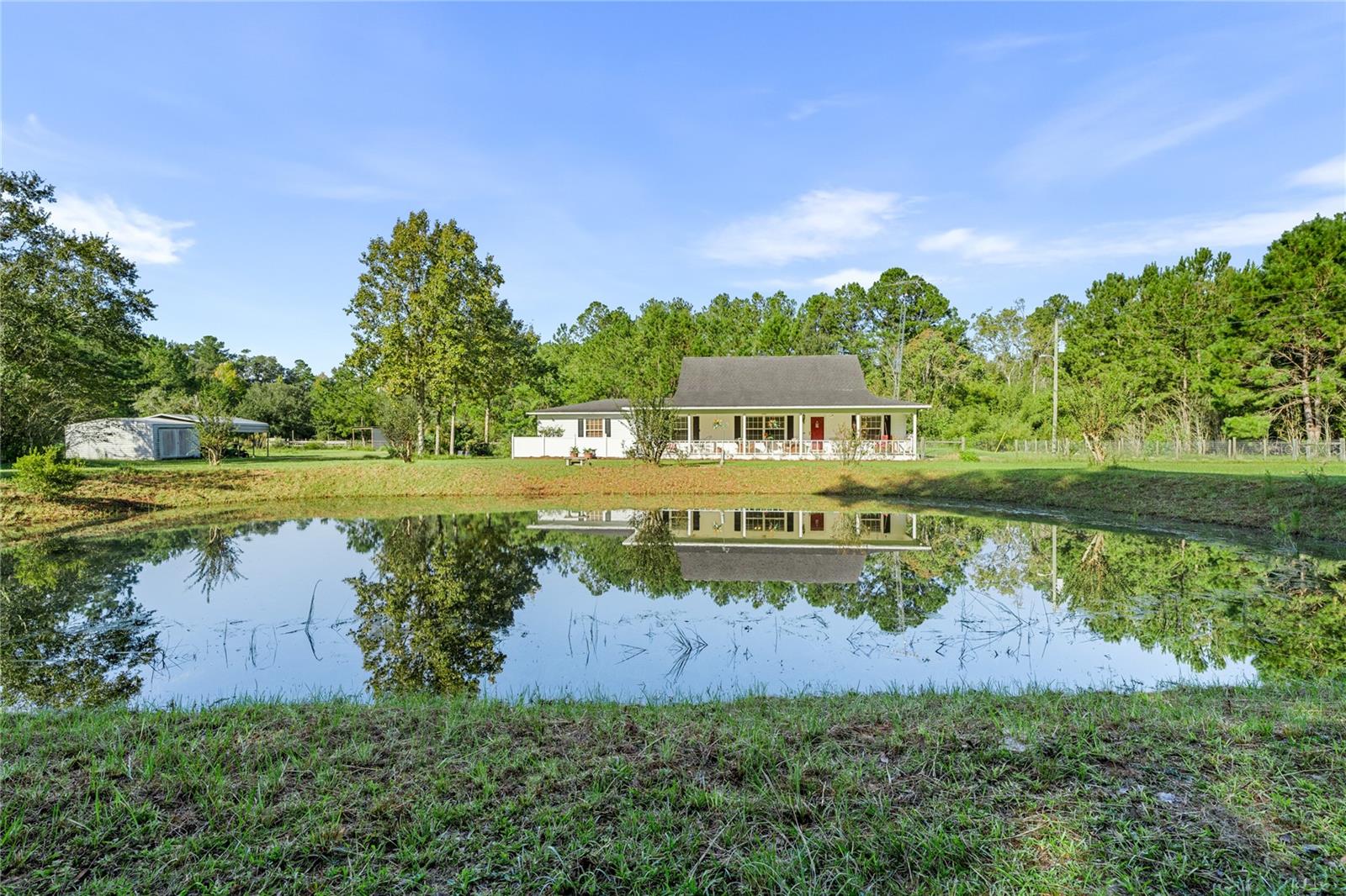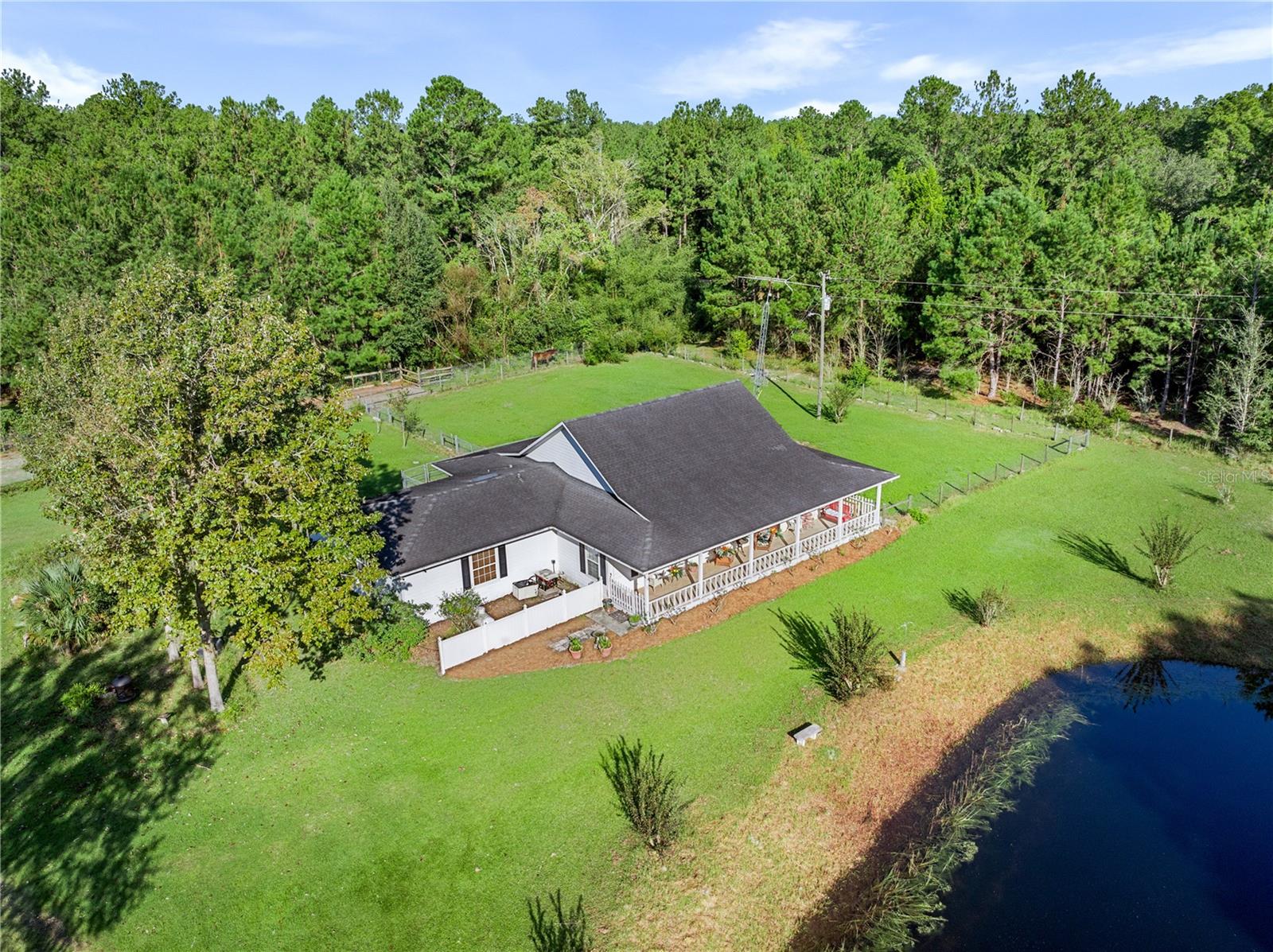 Welcome to your peaceful retreat on 5 acres, where a charming pond and scenic countryside views greet you on arrival. The private drive leads to a home that blends relaxation and rural charm, offering the perfect haven for those seeking a relaxed lifestyle while still being close to the conveniences of the city. Inside, the home features an open-concept split floor plan. The great room, with its double-sided fireplace and high ceilings, flows seamlessly into the kitchen with wood cabinets and black stainless steel appliances, and a breakfast bar—ideal for casual meals or entertaining. The primary bedroom, complete with a walk-in closet, also shares the double-sided fireplace and provides an en-suite bathroom with a jacuzzi tub, perfect for unwinding after a long day. The property includes a two-car garage and two spacious workshops for your vehicles and storage needs. The rocking chair front porch and screened back porch provide the perfect outdoor living spaces to enjoy the serene landscape and fresh country air. Part of the property is shaded by beautiful pine trees, adding both character, privacy and future potential for timber revenue. Located just minutes from Gainesville, this property provides the best of both worlds: the peaceful rural lifestyle you desire, with easy access to shopping, dining, healthcare, and the University of Florida.