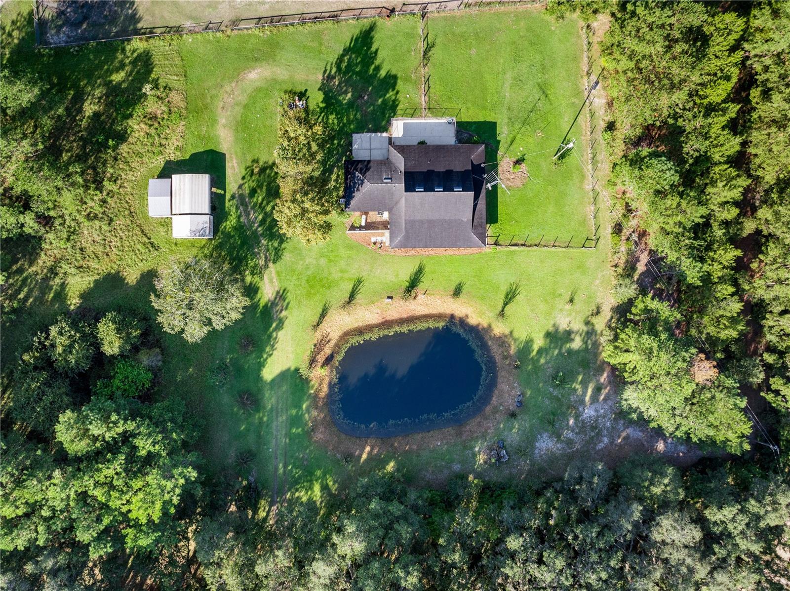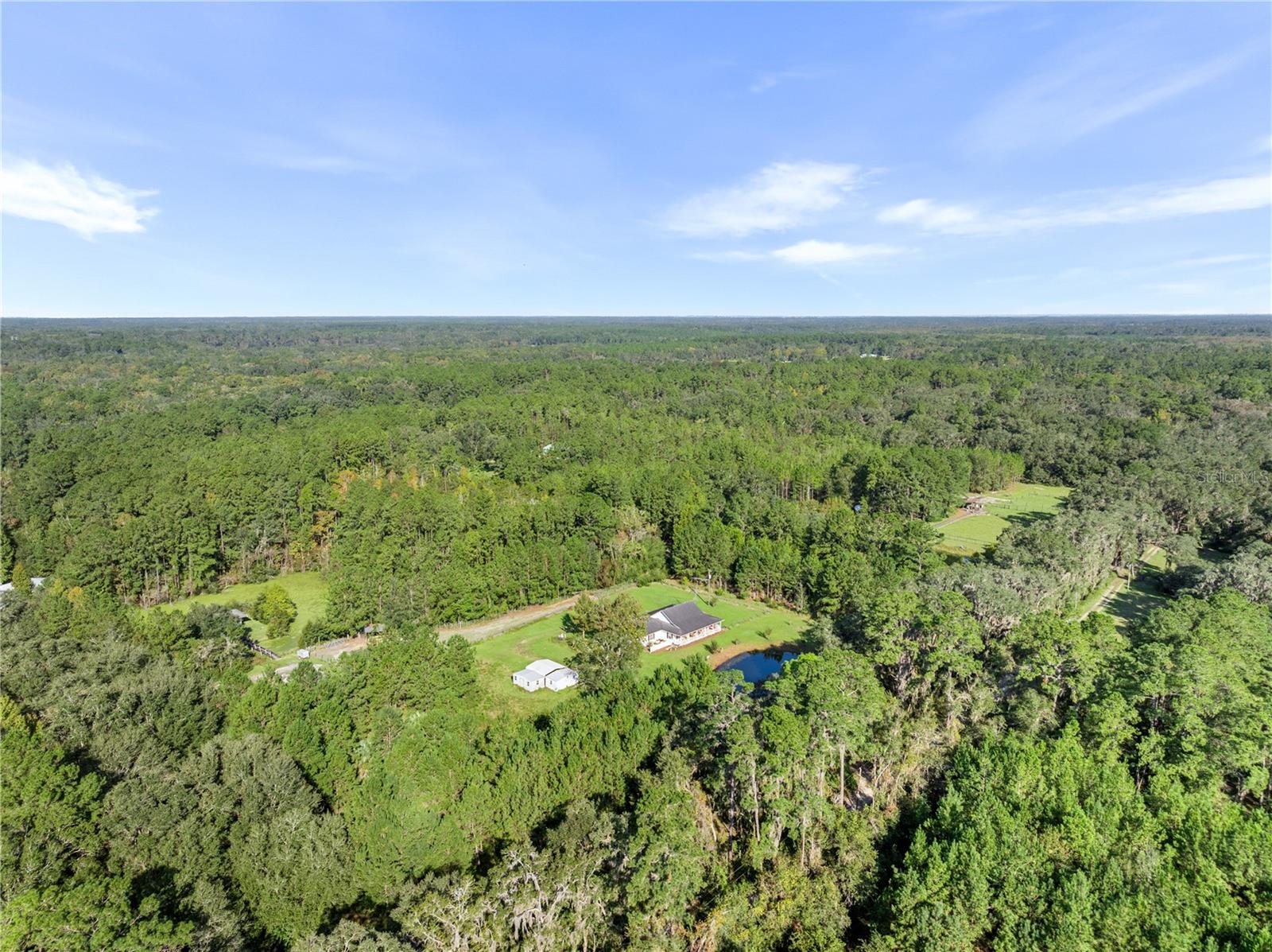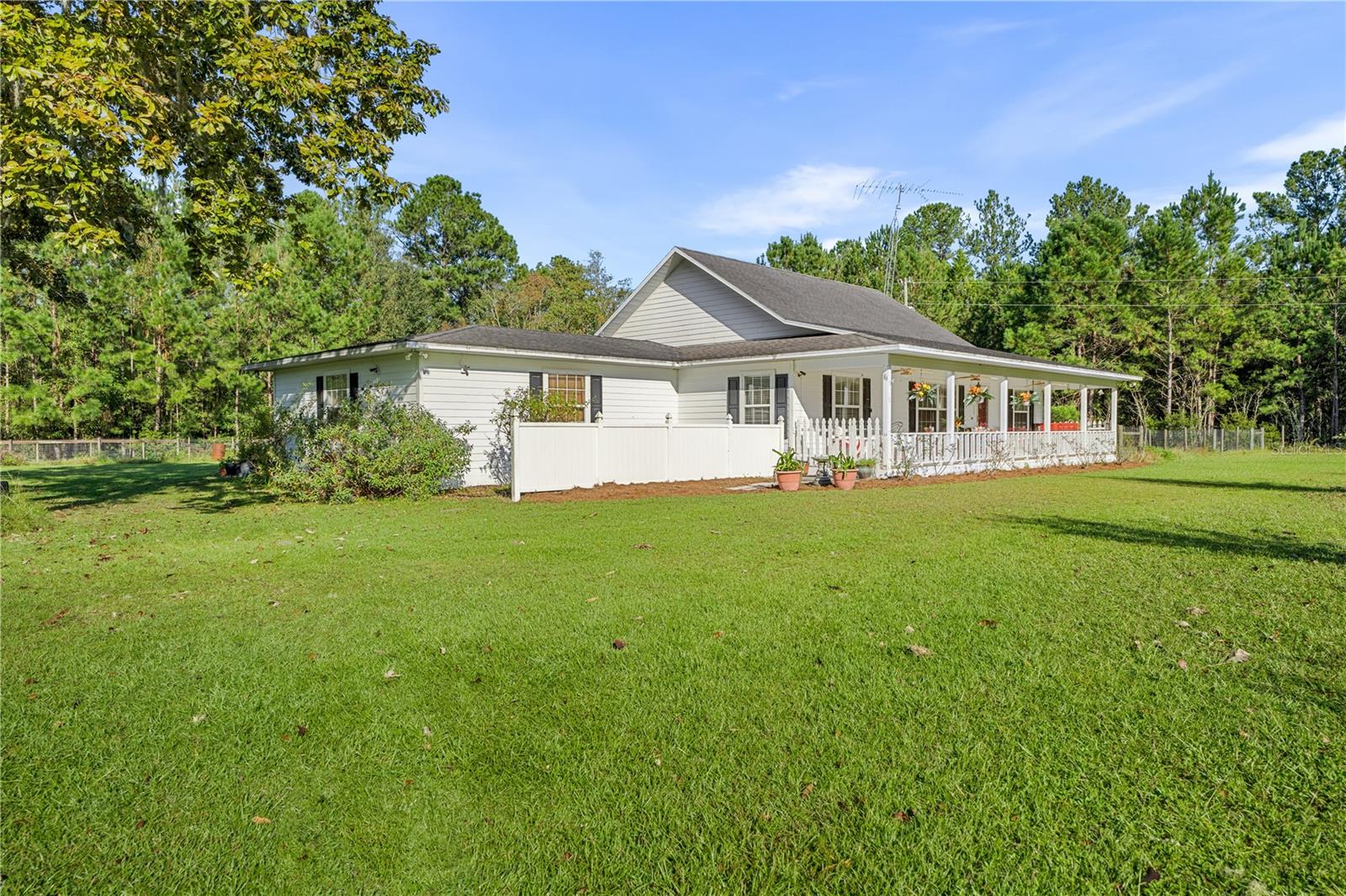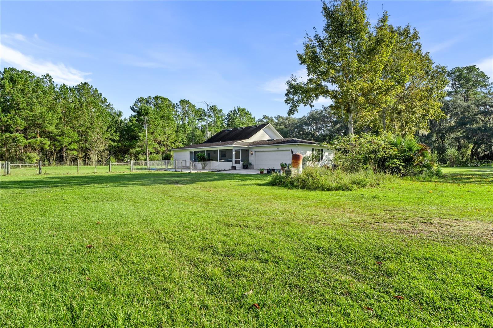 Welcome to your peaceful retreat on 5 acres, where a charming pond and scenic countryside views greet you on arrival. The private drive leads to a home that blends relaxation and rural charm, offering the perfect haven for those seeking a relaxed lifestyle while still being close to the conveniences of the city. Inside, the home features an open-concept split floor plan. The great room, with its double-sided fireplace and high ceilings, flows seamlessly into the kitchen with wood cabinets and black stainless steel appliances, and a breakfast bar—ideal for casual meals or entertaining. The primary bedroom, complete with a walk-in closet, also shares the double-sided fireplace and provides an en-suite bathroom with a jacuzzi tub, perfect for unwinding after a long day. The property includes a two-car garage and two spacious workshops for your vehicles and storage needs. The rocking chair front porch and screened back porch provide the perfect outdoor living spaces to enjoy the serene landscape and fresh country air. Part of the property is shaded by beautiful pine trees, adding both character, privacy and future potential for timber revenue. Located just minutes from Gainesville, this property provides the best of both worlds: the peaceful rural lifestyle you desire, with easy access to shopping, dining, healthcare, and the University of Florida.