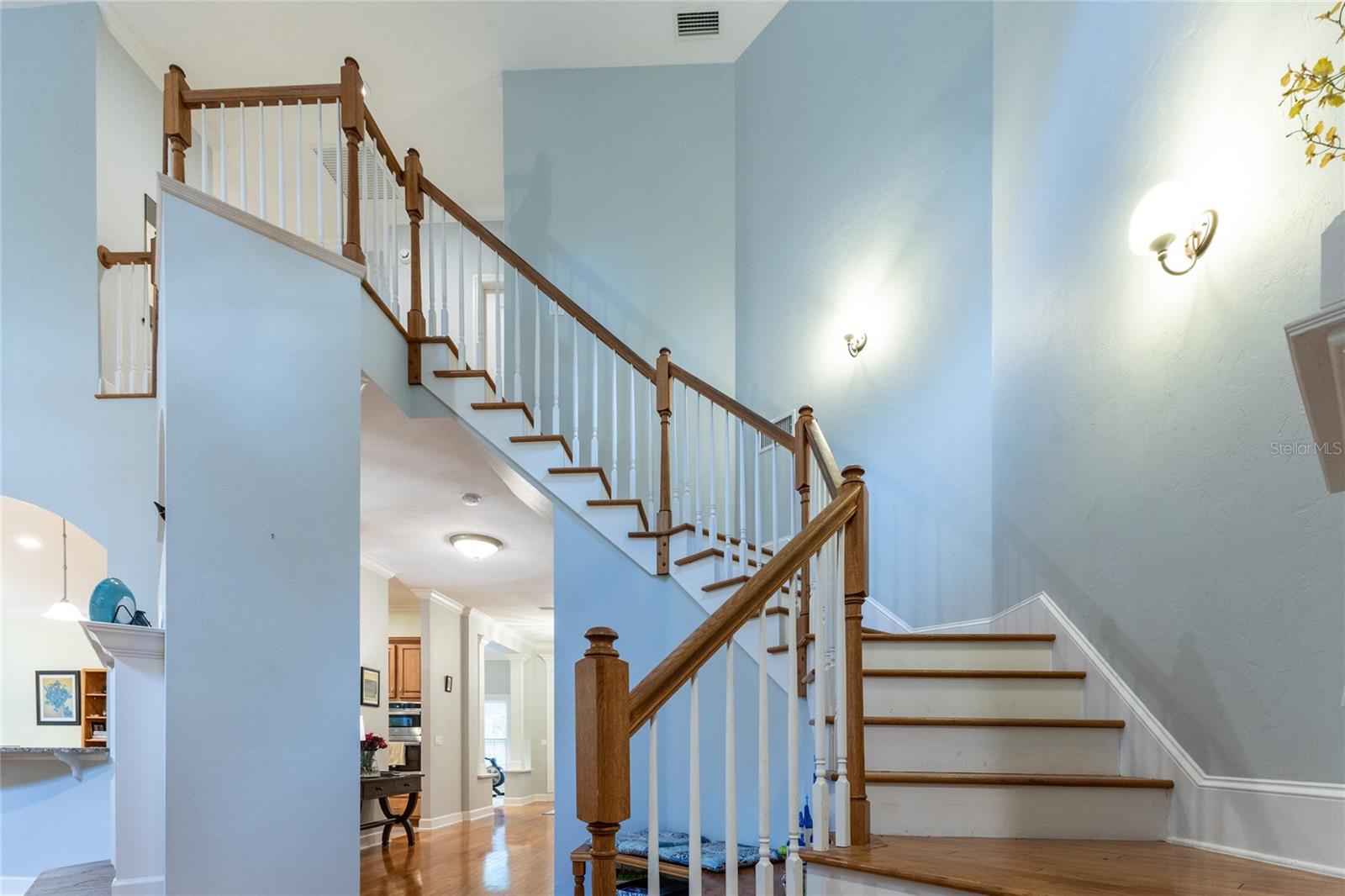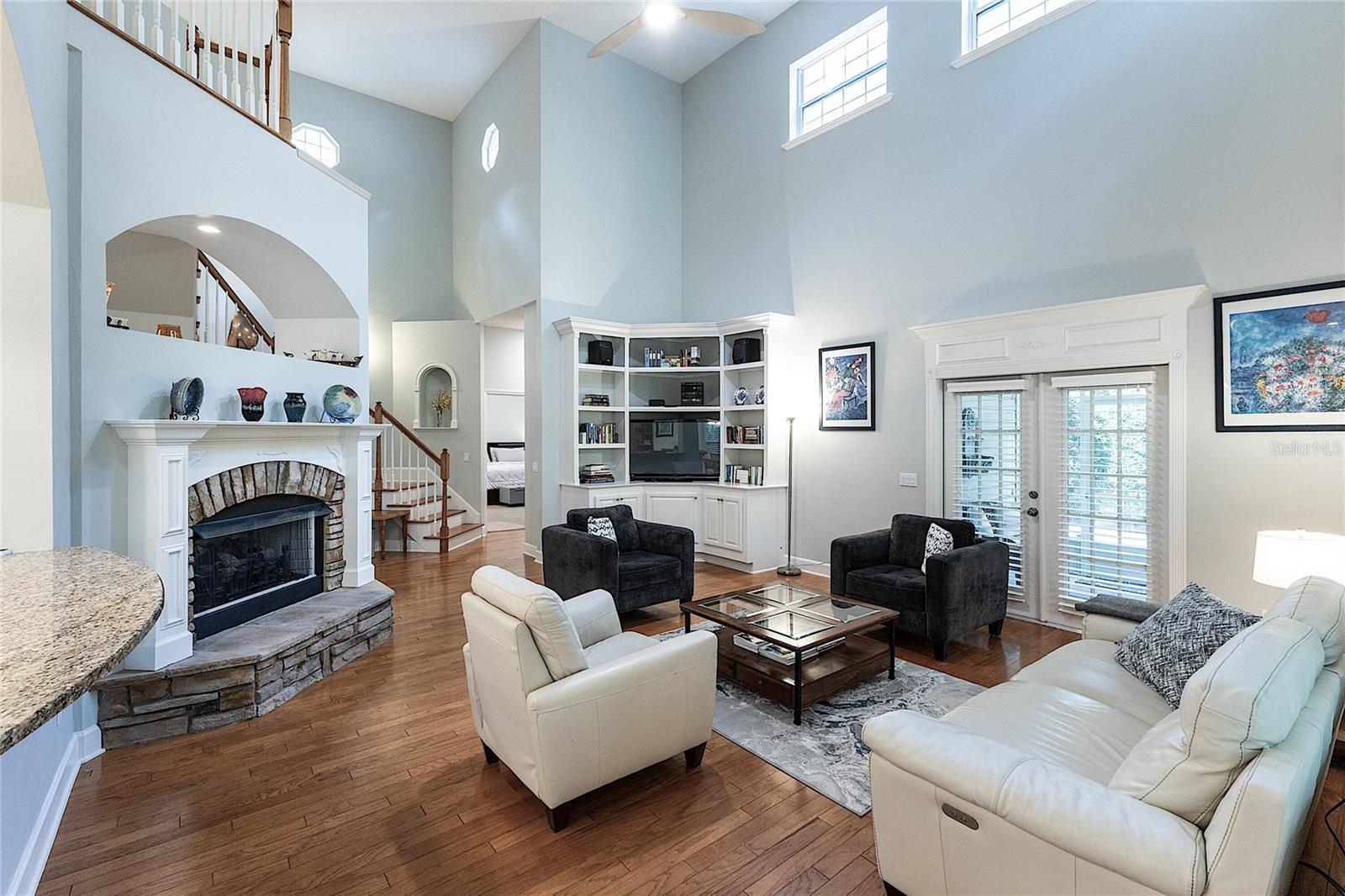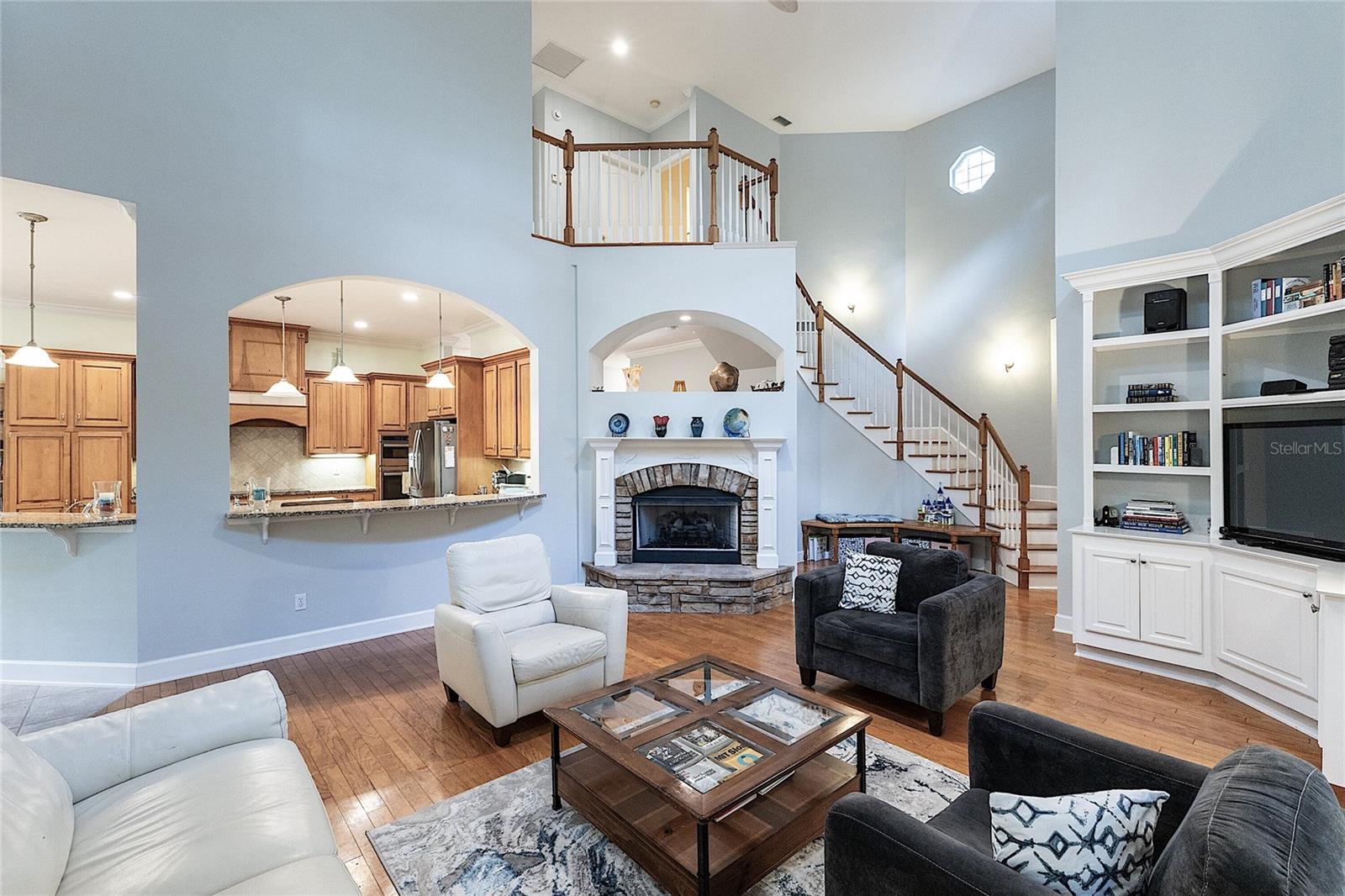 Come experience this unique blend of luxury and lifestyle re-defined. This beautiful residence features soaring 20' ceilings, wood floors, granite counters, abundant moldings and outstanding natural light. Prepare meals in comfort in your spacious open kitchen with wood cabinets, 2023 stainless appliances and an open interface with the stunning great room and its 20' high ceiling, built-in shelves and cozy gas fireplace with decorative stone surround. Relax at the end of a long day in the soothing, downstairs primary showcasing his and her walk-ins, a charming sitting area, jetted tub, walk in shower and dual vanities. The sensational upstairs features an outstanding family room that would make a great entertainment space or playroom as well as two oversized guest bedrooms each with their own walk-in closet and a large Jack & Jill bath. Additional highlights include a downstairs guest bedroom with walk-in closet and private en-suite bath, a stylish formal dining room with crown and wainscoting, 2024 roof, 2020 main HVAC and an irrigation system using efficient, reclaimed water. Enjoy peace and serenity from your picturesque back porch or sit on your open patio and appreciate the azaleas and abundant greenery of your private back yard on the lush, 1/2 acre lot. All of this comes in an extraordinary location with great schools, walking distance from the award winning Haile Village Center, Hawkstone Golf and Country Club, Haile Market Square Publix and an easy commute to UF and Shands and the VA.