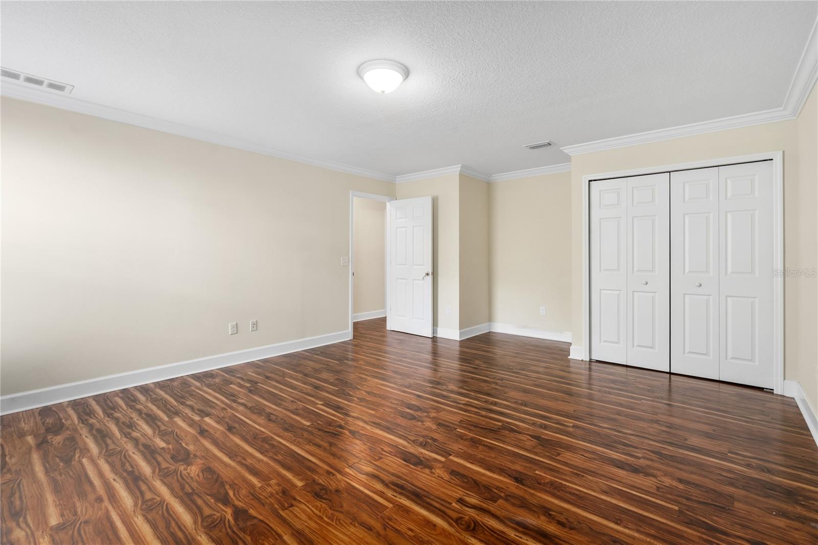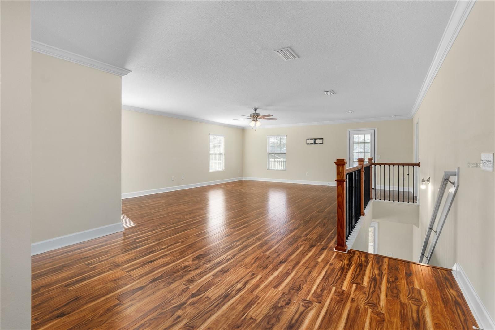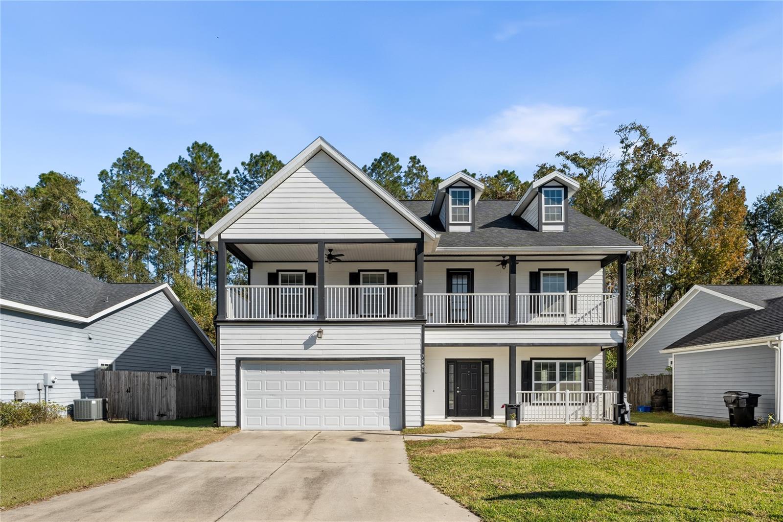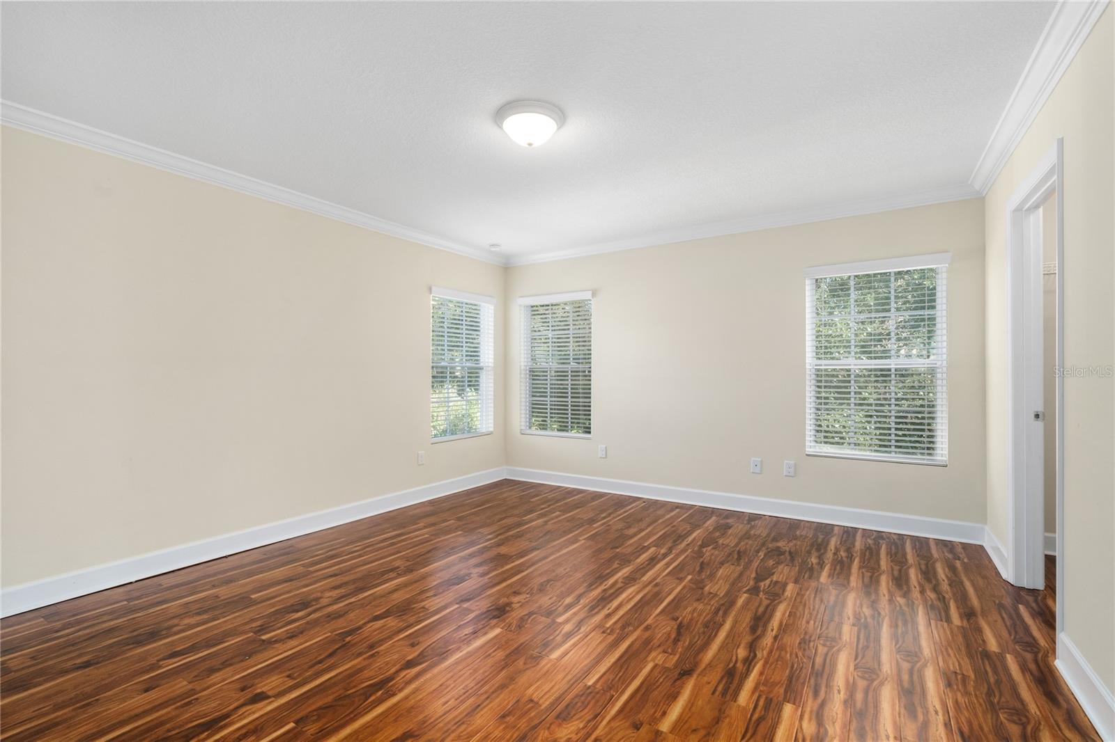 Welcome home to Eryn's Garden! This large 5 bedroom/3.5 bathroom with upstairs bonus rooms and split floorplan offers over 3500 SQFT of living space. All rooms are covered by laminate wood flooring and tiles, NO CARPET! This open floorplan with a separate dining area overlooks the expansive great room and kitchen showcasing stainless steel appliances, plenty of cabinets, two pantries, and granite countertops with a breakfast bar for additional seating. The primary en-suite bedroom is on the first floor and boasts an oversized bathroom with two separate sink areas, a garden tub, and a roomy walk-in closet. The 2nd story is highlighted with a walk-out balcony, a large bonus room, and all additional 4 bedrooms, 2 of which are en-suite with full bathrooms. The home features crown molding, a separate laundry room, French doors leading to a screen lanai, and a fully fenced yard with lots of privacy backing to the woods. Easy access to the shopping center, UF, Shands, and VA, with no traffic.