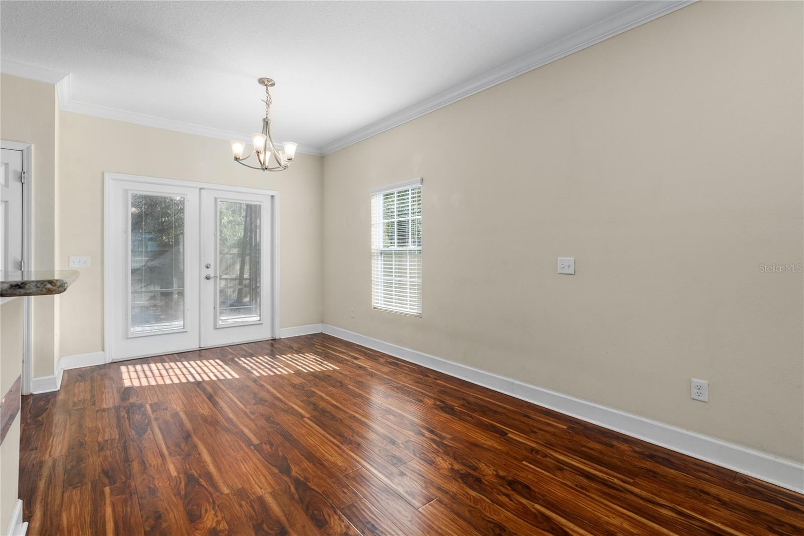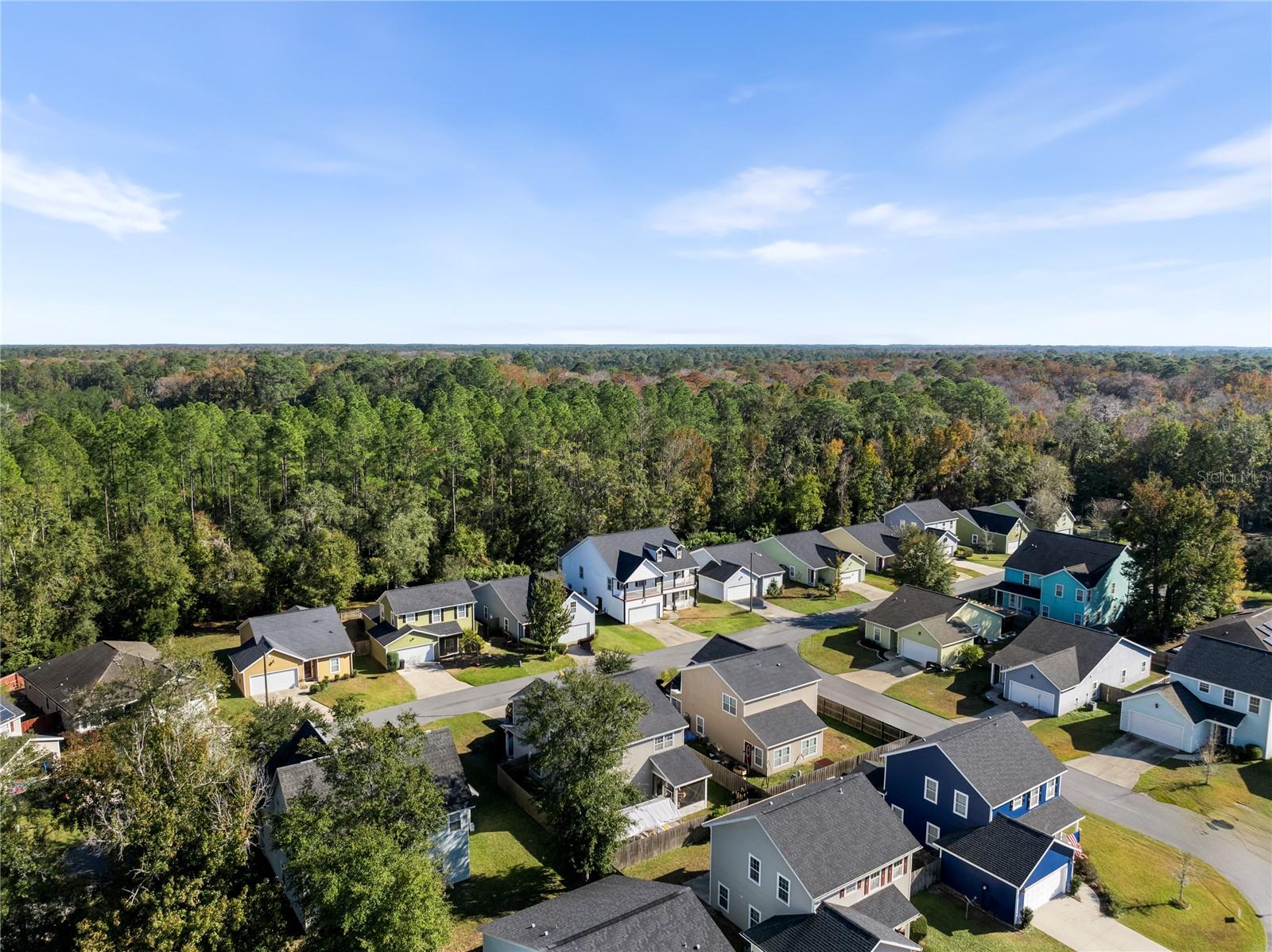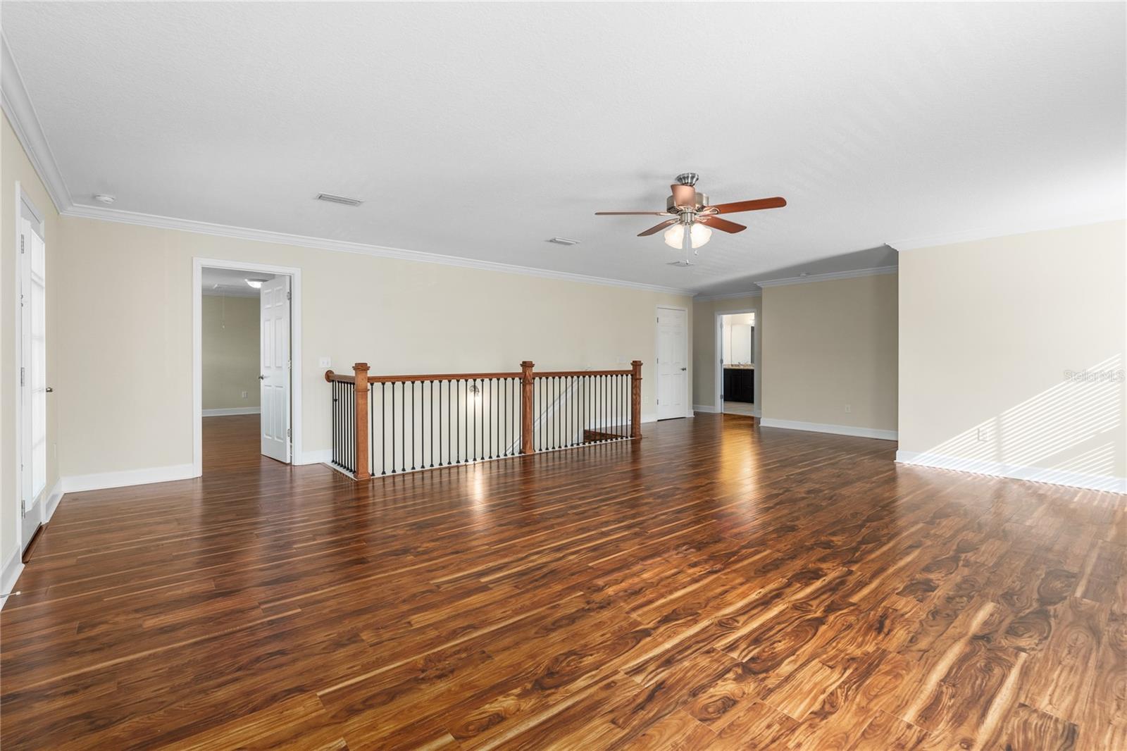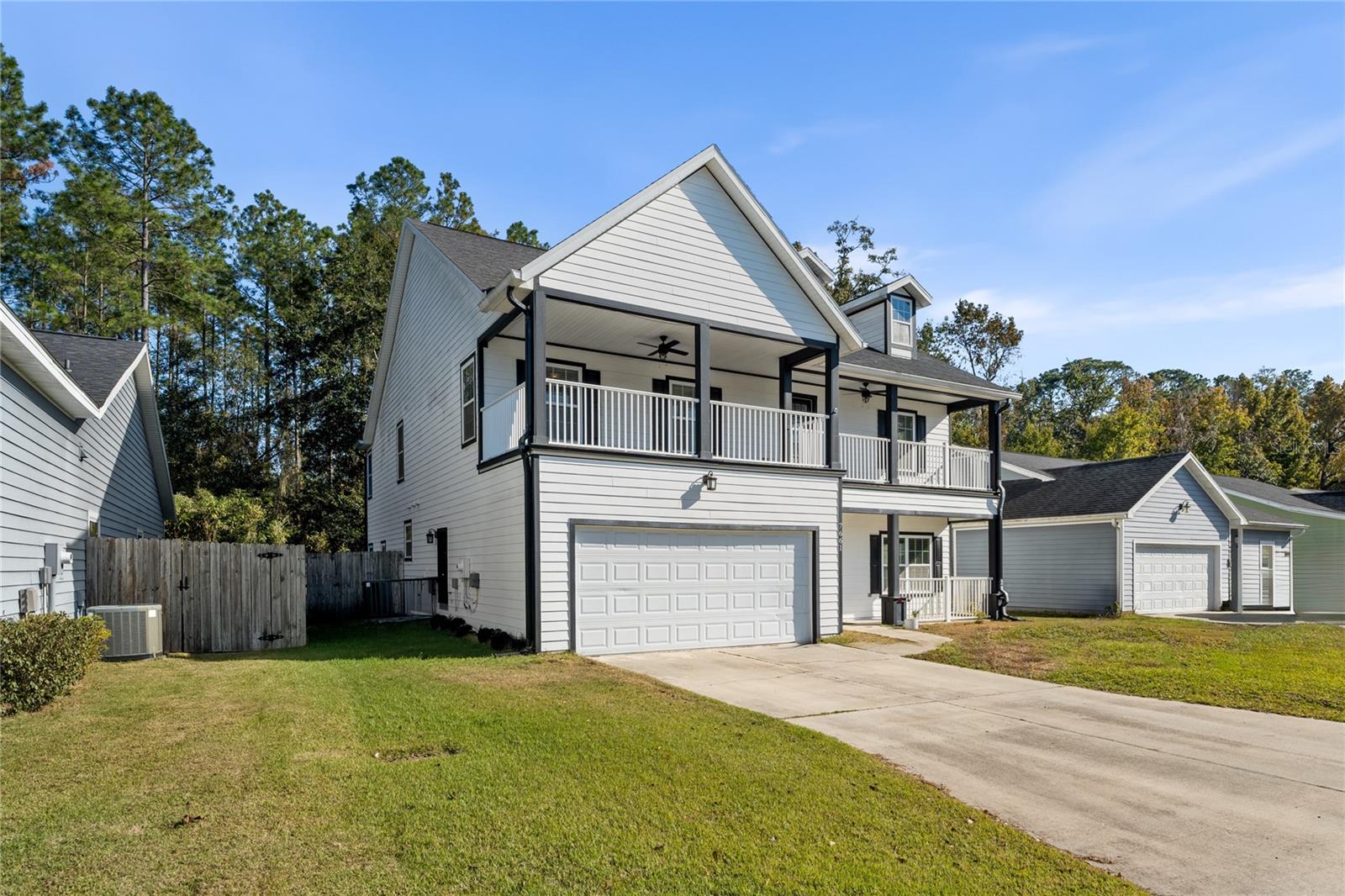 Welcome home to Eryn's Garden! This large 5 bedroom/3.5 bathroom with upstairs bonus rooms and split floorplan offers over 3500 SQFT of living space. All rooms are covered by laminate wood flooring and tiles, NO CARPET! This open floorplan with a separate dining area overlooks the expansive great room and kitchen showcasing stainless steel appliances, plenty of cabinets, two pantries, and granite countertops with a breakfast bar for additional seating. The primary en-suite bedroom is on the first floor and boasts an oversized bathroom with two separate sink areas, a garden tub, and a roomy walk-in closet. The 2nd story is highlighted with a walk-out balcony, a large bonus room, and all additional 4 bedrooms, 2 of which are en-suite with full bathrooms. The home features crown molding, a separate laundry room, French doors leading to a screen lanai, and a fully fenced yard with lots of privacy backing to the woods. Easy access to the shopping center, UF, Shands, and VA, with no traffic.