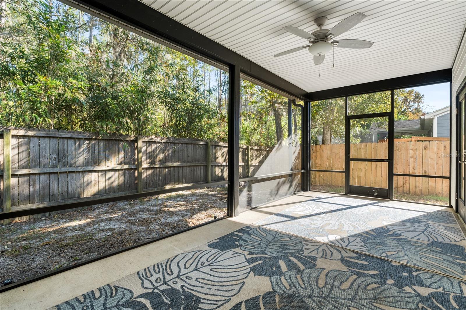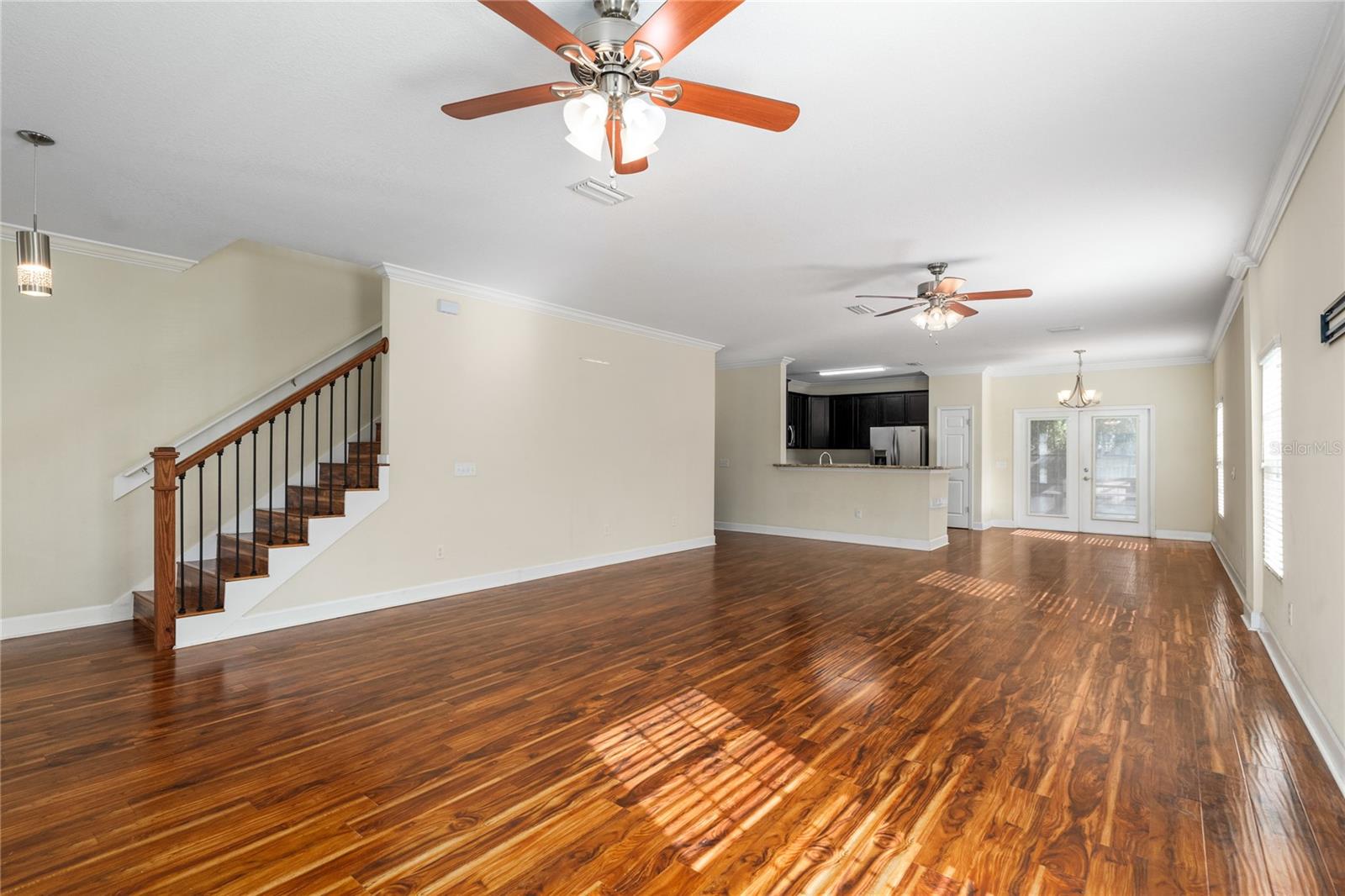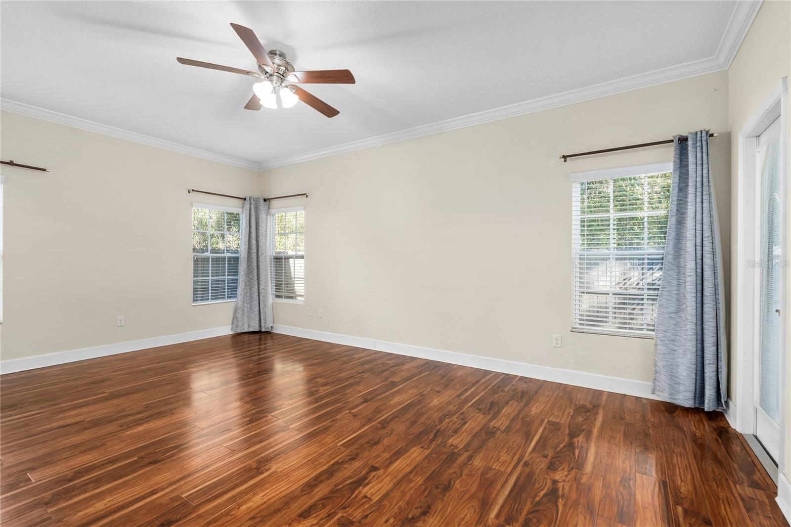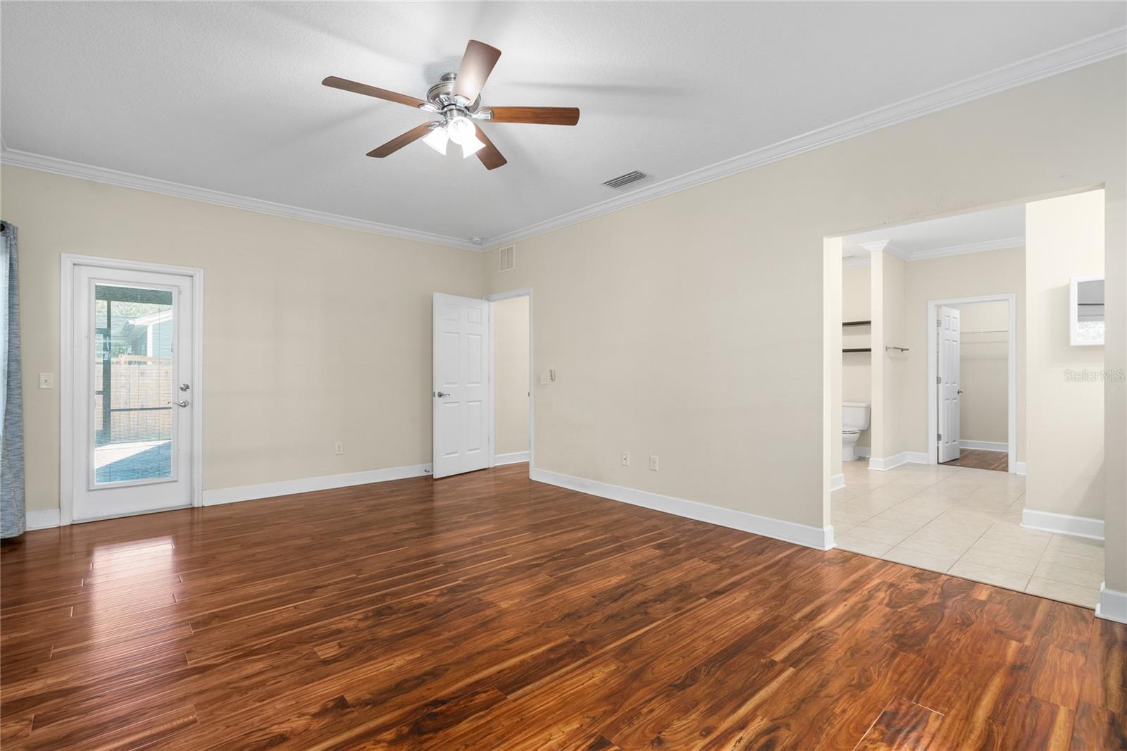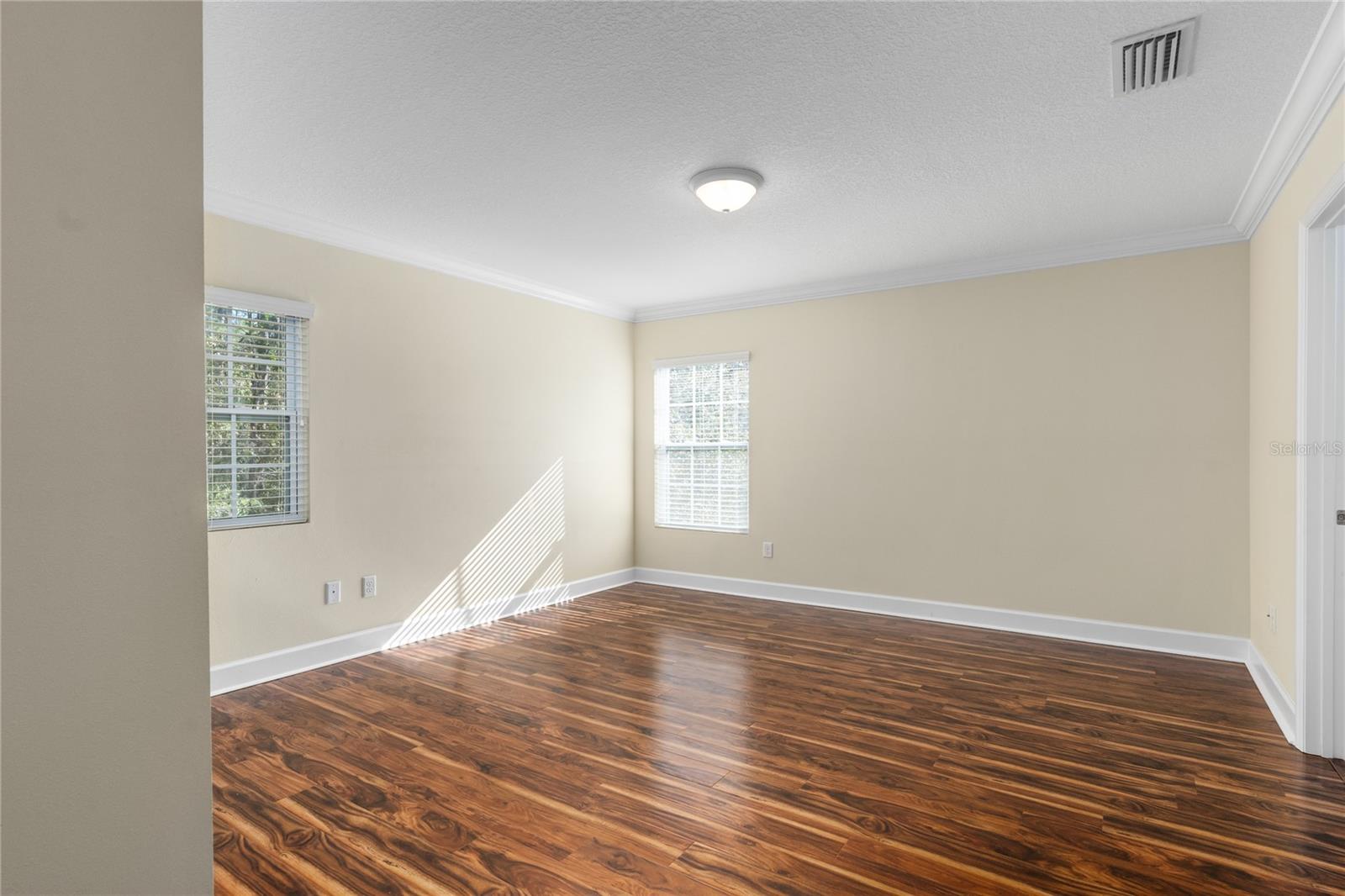 Welcome home to Eryn's Garden! This large 5 bedroom/3.5 bathroom with upstairs bonus rooms and split floorplan offers over 3500 SQFT of living space. All rooms are covered by laminate wood flooring and tiles, NO CARPET! This open floorplan with a separate dining area overlooks the expansive great room and kitchen showcasing stainless steel appliances, plenty of cabinets, two pantries, and granite countertops with a breakfast bar for additional seating. The primary en-suite bedroom is on the first floor and boasts an oversized bathroom with two separate sink areas, a garden tub, and a roomy walk-in closet. The 2nd story is highlighted with a walk-out balcony, a large bonus room, and all additional 4 bedrooms, 2 of which are en-suite with full bathrooms. The home features crown molding, a separate laundry room, French doors leading to a screen lanai, and a fully fenced yard with lots of privacy backing to the woods. Easy access to the shopping center, UF, Shands, and VA, with no traffic.