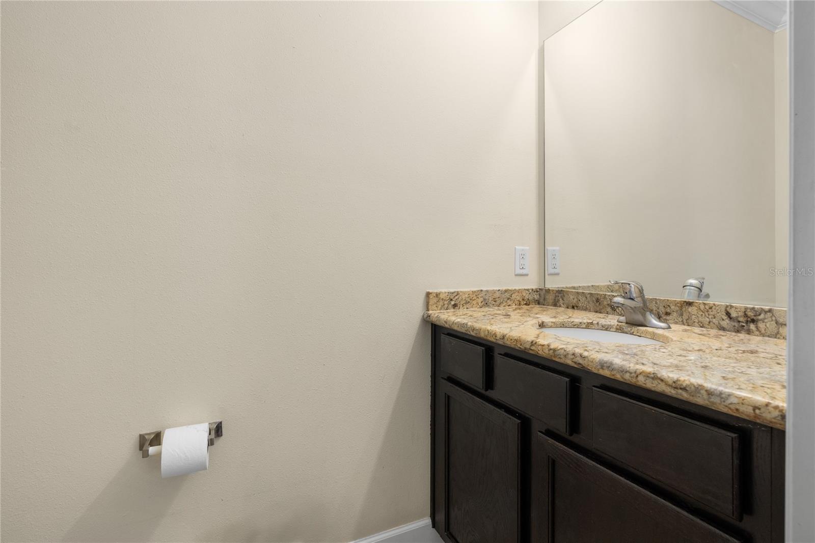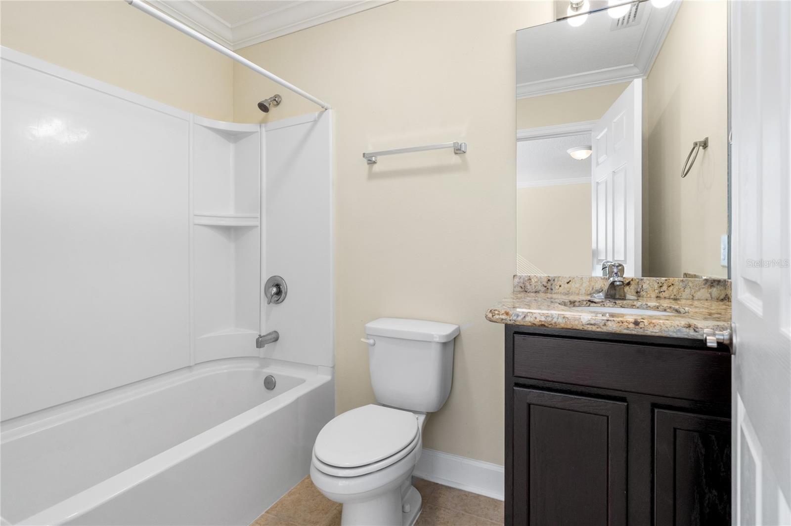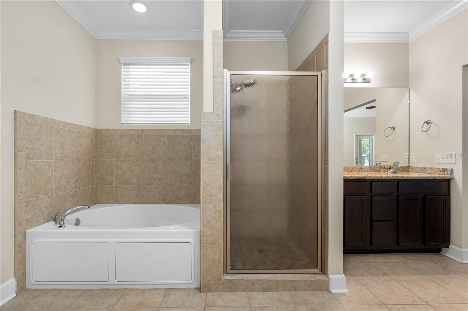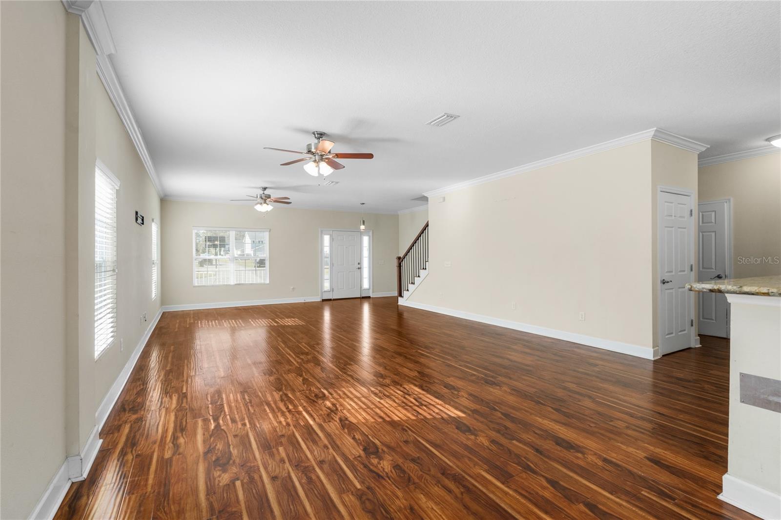 Welcome home to Eryn's Garden! This large 5 bedroom/3.5 bathroom with upstairs bonus rooms and split floorplan offers over 3500 SQFT of living space. All rooms are covered by laminate wood flooring and tiles, NO CARPET! This open floorplan with a separate dining area overlooks the expansive great room and kitchen showcasing stainless steel appliances, plenty of cabinets, two pantries, and granite countertops with a breakfast bar for additional seating. The primary en-suite bedroom is on the first floor and boasts an oversized bathroom with two separate sink areas, a garden tub, and a roomy walk-in closet. The 2nd story is highlighted with a walk-out balcony, a large bonus room, and all additional 4 bedrooms, 2 of which are en-suite with full bathrooms. The home features crown molding, a separate laundry room, French doors leading to a screen lanai, and a fully fenced yard with lots of privacy backing to the woods. Easy access to the shopping center, UF, Shands, and VA, with no traffic.