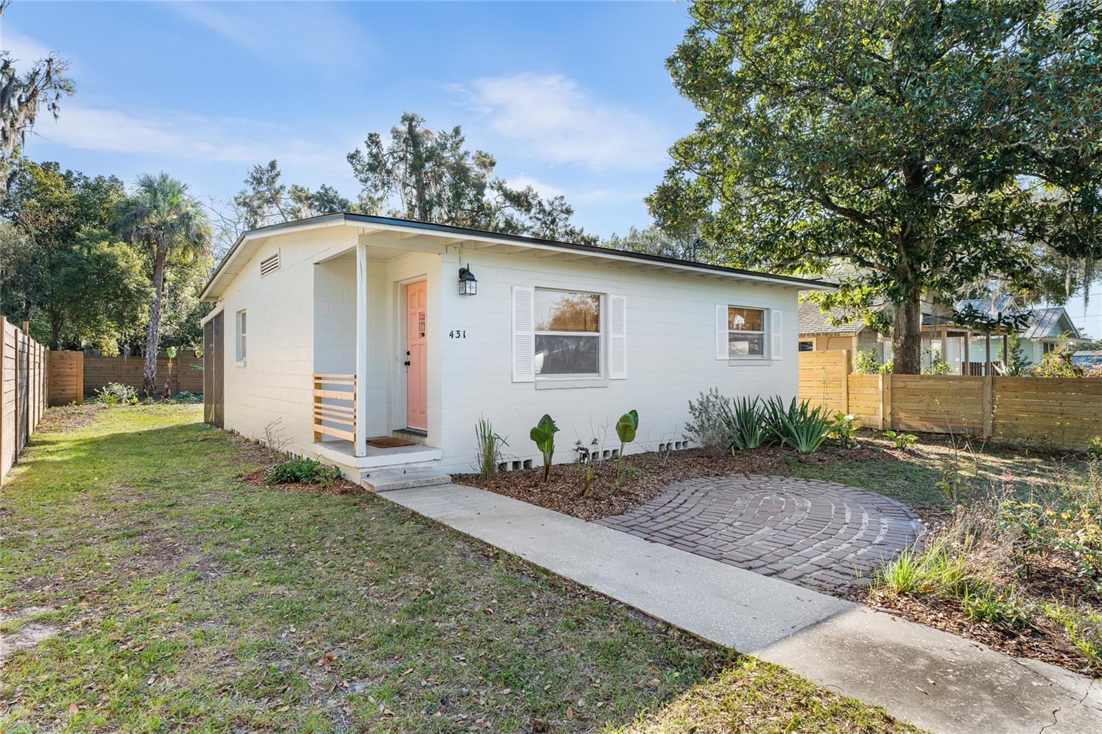 Welcome to 431 SE 6th Terrace, a delightful and welcoming 2-bedroom, 1-bathroom home offering comfortable living that provides relaxation and low maintenance. This historic concrete block residence has been fully remodeled, blending vintage charm with modern amenities, all eloquently highlighted by Chic Staging & Design. The roof, HVAC, water heater, plumbing, and electric are all less than 2 years old. It features a cozy living space with a well-designed floor plan that maximizes the space and provides a warm and inviting atmosphere. It has a modern kitchen with updated appliances and fixtures that make cooking and entertaining a pleasure. Two spacious bedrooms offer ample closet space and let in an abundance of natural light. To finish off the interior space, the remodeled bathroom features contemporary finishes for a fresh, clean look. Moving to the exterior, there's fresh landscaping that allows you to enjoy the fully enclosed front and back yard that the brand new fence provides. The fencing in front is low with a modern design, allowing you to enjoy a small brick courtyard that's perfect for a couple of Adirondack chairs and a fire pit where you can watch the sunset views. The style of the fence transitions moving to the backyard and increases in height for maximum enjoyment and privacy in the spacious, landscaped backyard including the start of a food forest with dwarf bananas and papayas. When ready to venture out from your oasis at home, you'll be conveniently located near downtown Gainesville and Depot Park, the community garden, and the Downtown library. You're also close to the Hawthorne Trail where you can enjoy the wildlife and miles of scenic views. Located in an increasingly popular and sought after area, don't miss a great opportunity for a wonderful home that needs absolutely nothing, which is a rare find at this price point. Schedule your showing today!