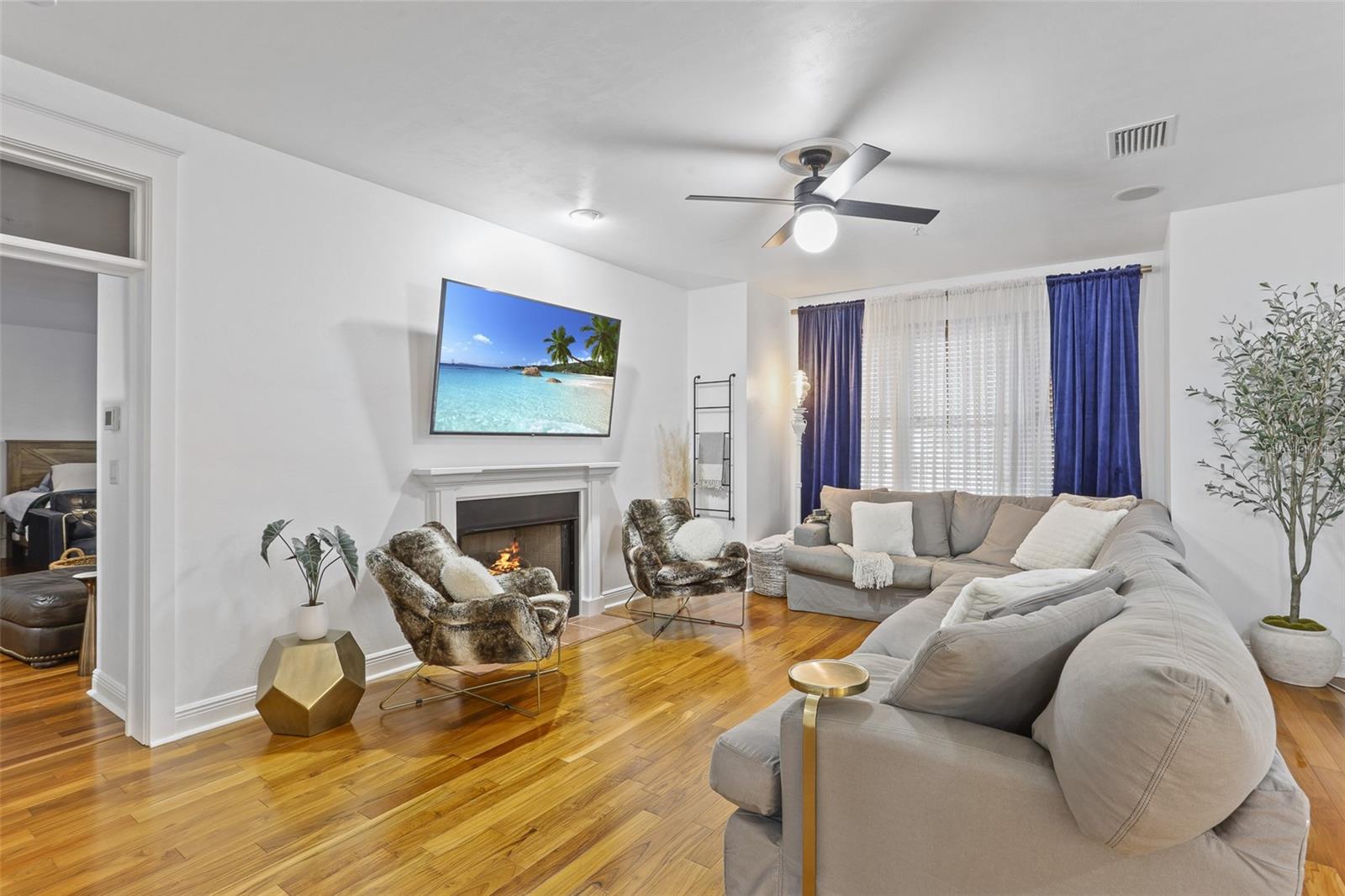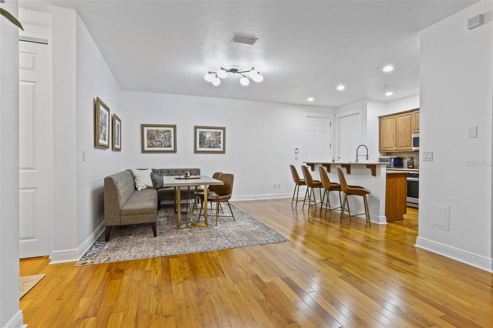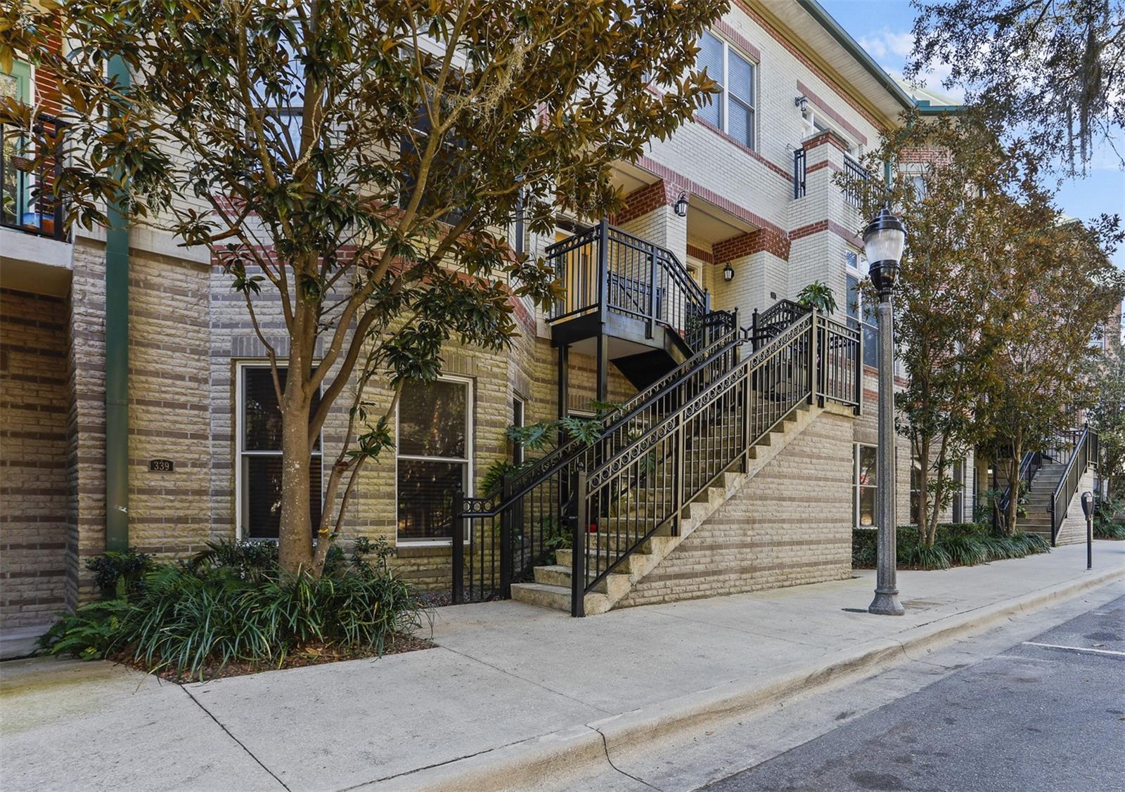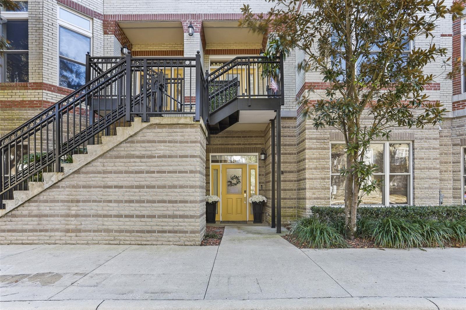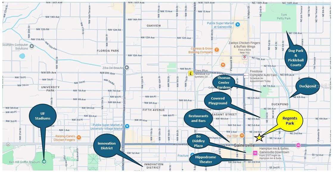 Rare find in Regents Park! This spacious three-bedroom, two-bath condominium is one of the few larger units without stairs. The fantastic design includes an open living area and an ideal split-bedroom layout. Engineered wood flooring and high ceilings throughout provide a seamless flow and sense of connection throughout the spacious unit. The kitchen includes an island with a breakfast bar, solid wood cabinets, granite and stainless steel appliances. The primary bedroom has plenty of closet space and an attached bathroom with double sinks and a walk-in shower. The fully-finished garage includes two automated options - the main garage door and a unique screened enclosure that allows the space to function as an outdoor entertaining space. The large laundry closet includes a high-efficiency washer and dryer set with pedestals from 2022. Recent updates include upgraded appliances, 2021 ceiling fans an HVAC in 2016, tankless water heater in 2023, 75-year polyurea garage flooring in 2024 and interior painting throughout. The HOA fees cover the roof, insurance, exterior maintenance, landscaping, pest control and internet. The ideal urban location is walkable to all of the amenities of downtown Gainesville and the historic Duckpond neighborhood. It is located just around the corner from the Thomas Center, the Hippodrome, Roper Park, library, farmers' markets, restaurants and parks.