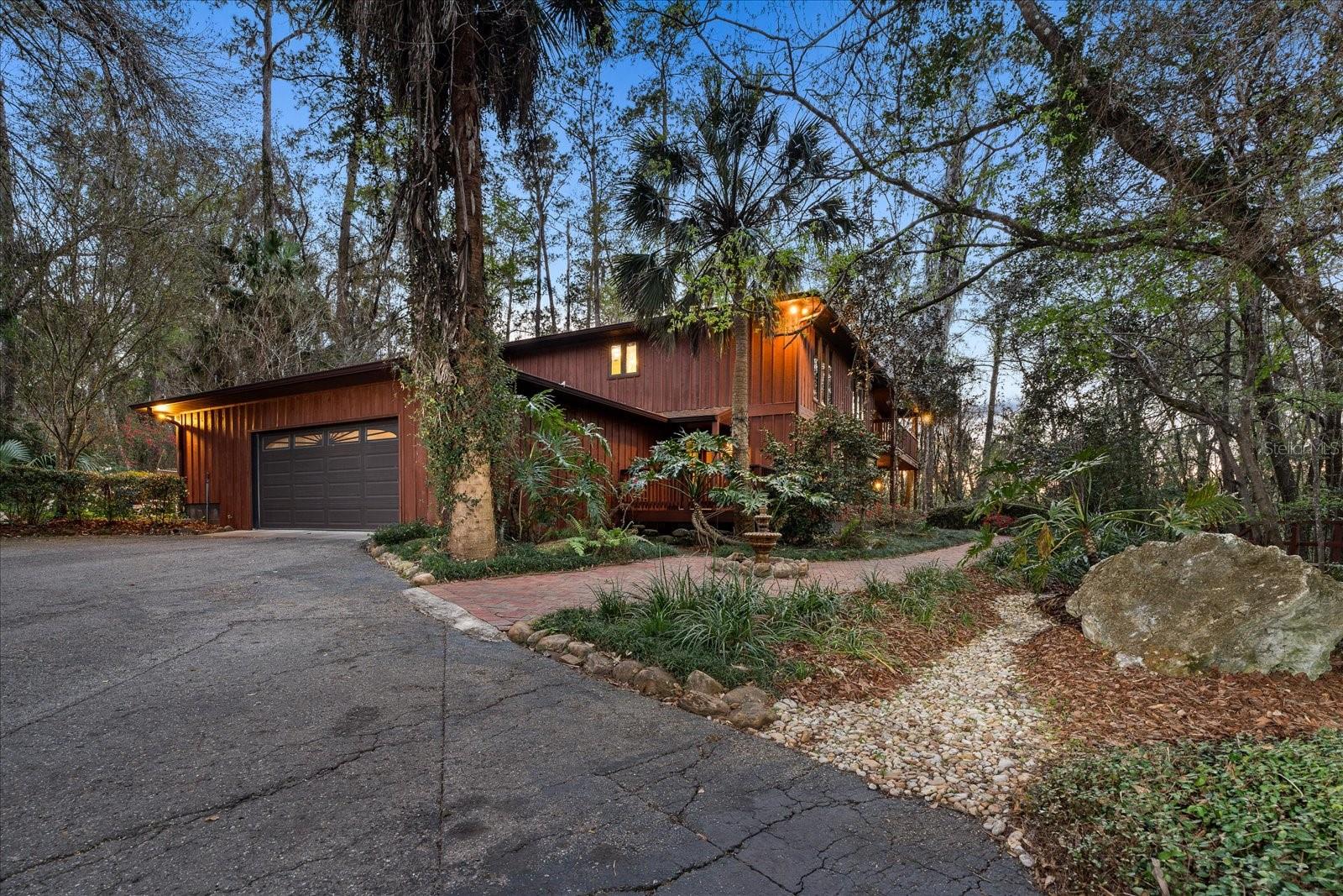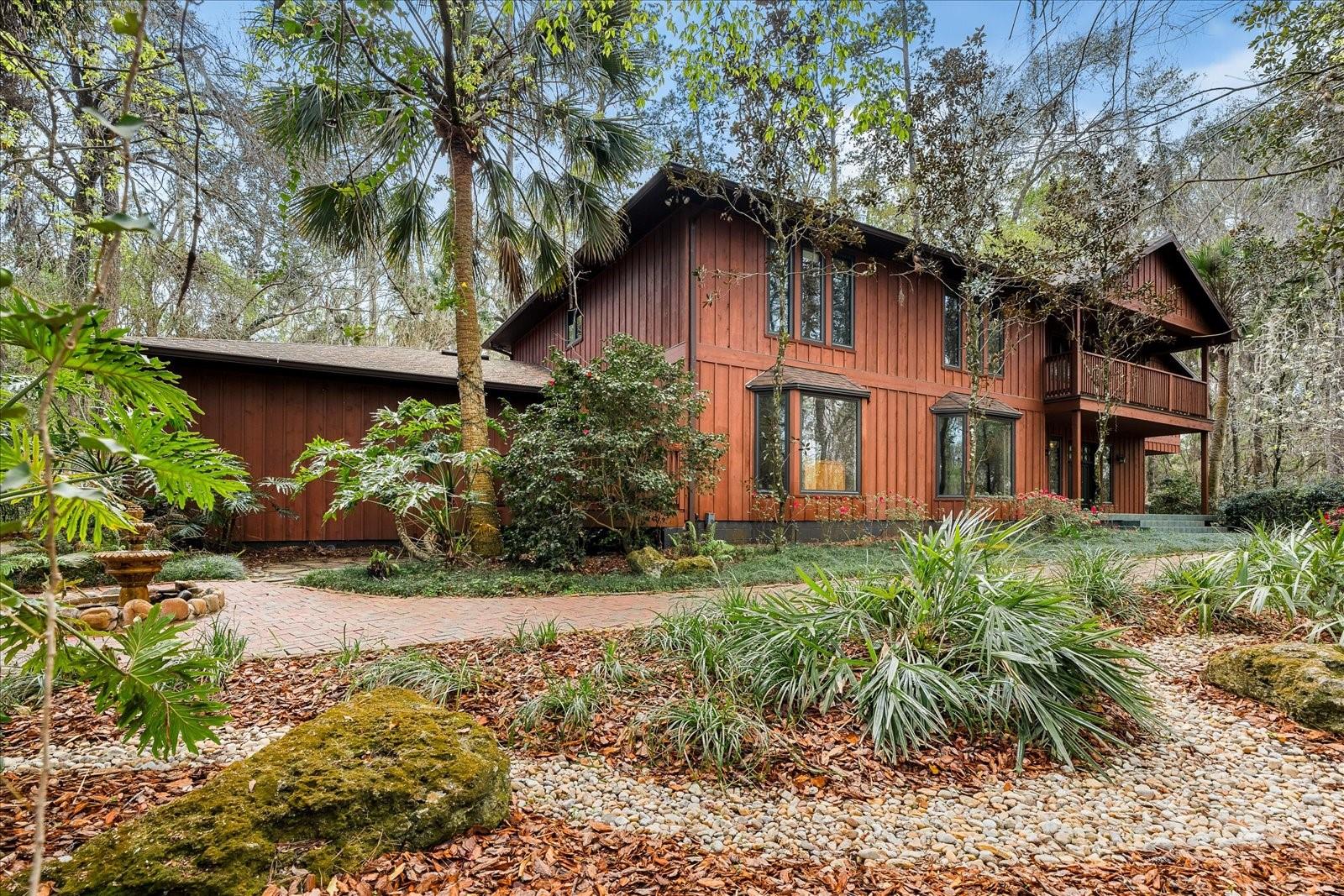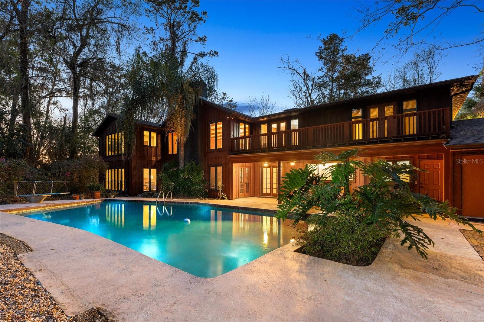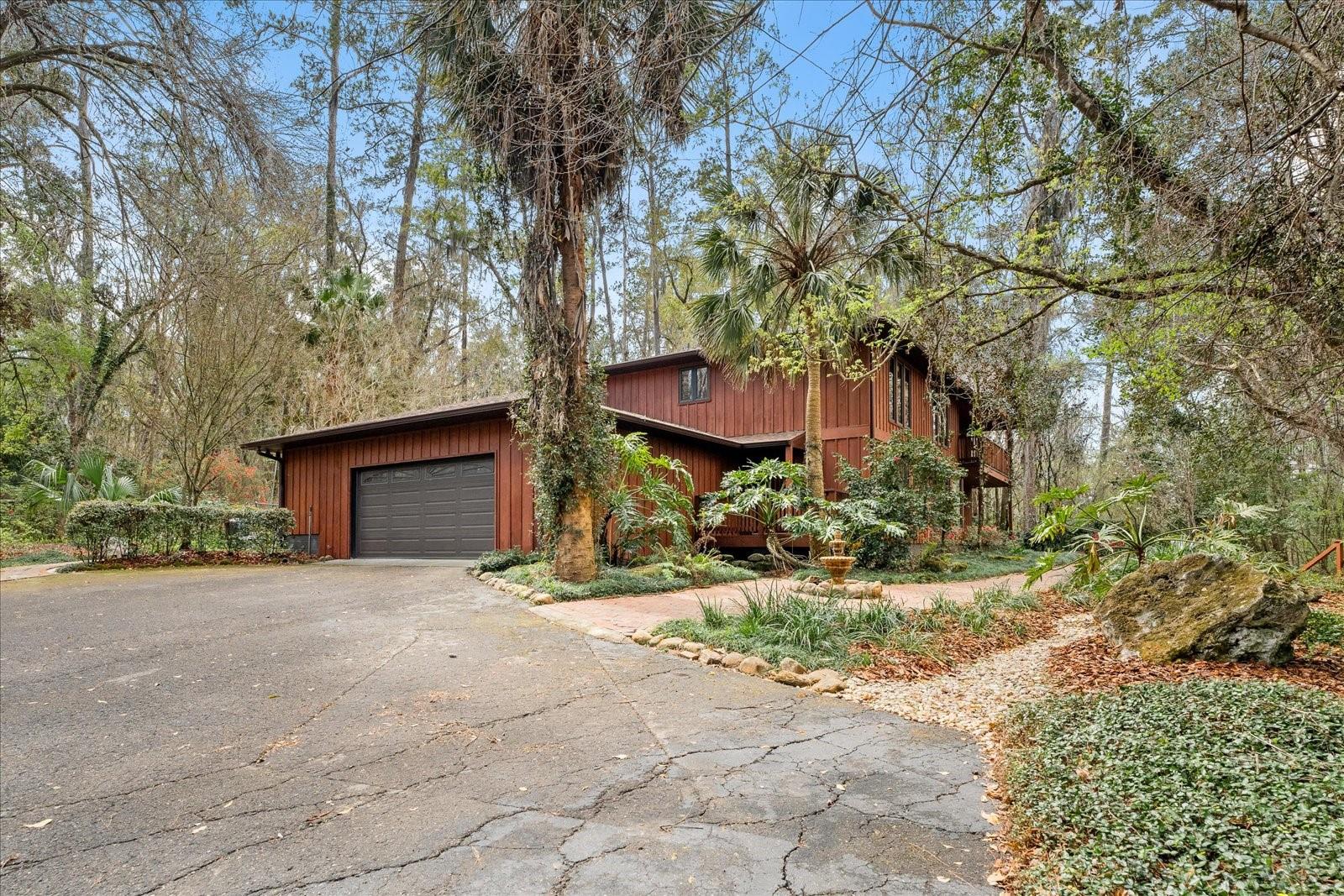 One or more photo(s) has been virtually staged. Tucked away on more than 2.5 acres less than a mile from UF and Shands, this one-of-a-kind property offers the serenity of a nature preserve right in the heart of Gainesville. Perched high above Hogtown Creek, the home captures sweeping, tree-top views and complete privacy — a rare combination of acreage, location, and natural beauty. Step inside to a dramatic two-story great room wrapped in cedar batten-and-board with a striking Spade stone fireplace that anchors the space and frames the view beyond. Walls of windows blur the line between indoors and out, filling every room with light and a connection to the surrounding preserve. The main level features a formal living room with bay windows, a spacious dining room with custom built-ins, and an island kitchen with double ovens and breakfast area opening to the pool deck. The primary suite is a peaceful retreat overlooking the pool and wooded backdrop, while upstairs offers five additional bedrooms (two of which have ensuite bathrooms) plus an office and game room — plenty of space for family, guests, or multi-generational living. Recent updates include a NEW 2024 roof, newer water heaters, fresh interior and exterior paint, and luxury vinyl flooring. Outdoors, enjoy the 30,000-gallon pool, multiple decks, and direct access to the creek below. With timeless design, enduring craftsmanship, and unmatched privacy, this Shands Woods retreat blends the best of nature and convenience — minutes to UF, Shands, the VA, and downtown, yet worlds away from it all.