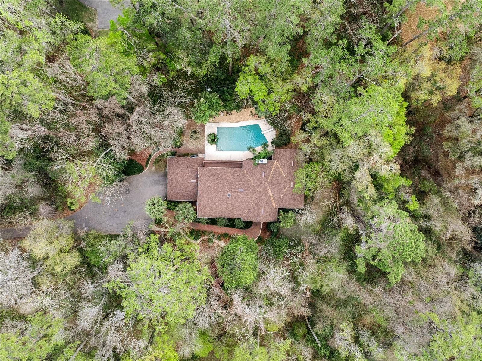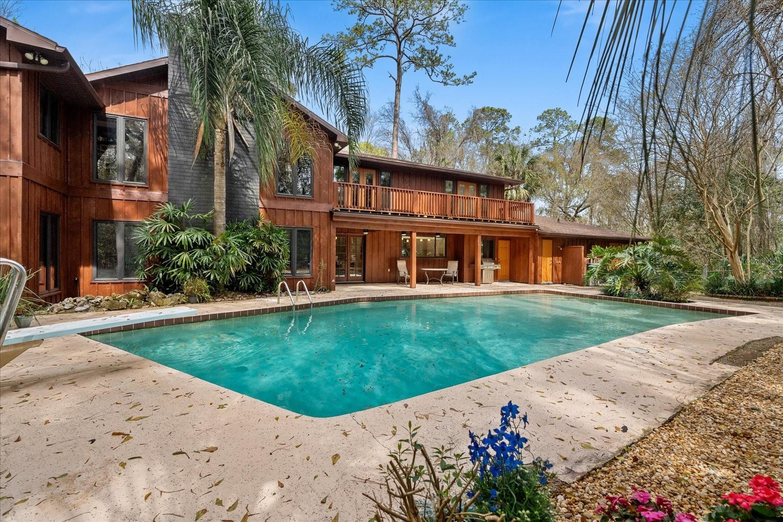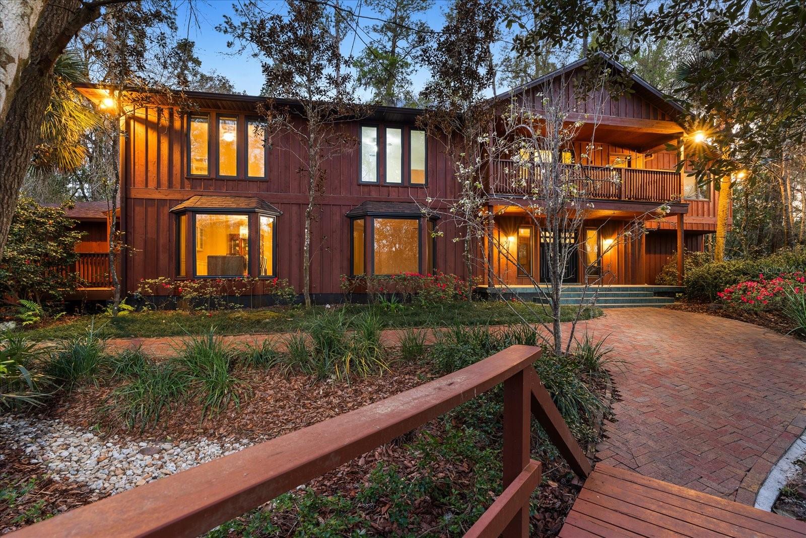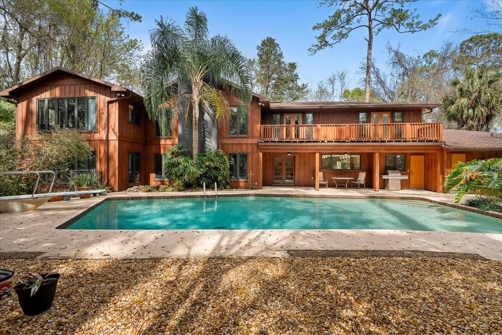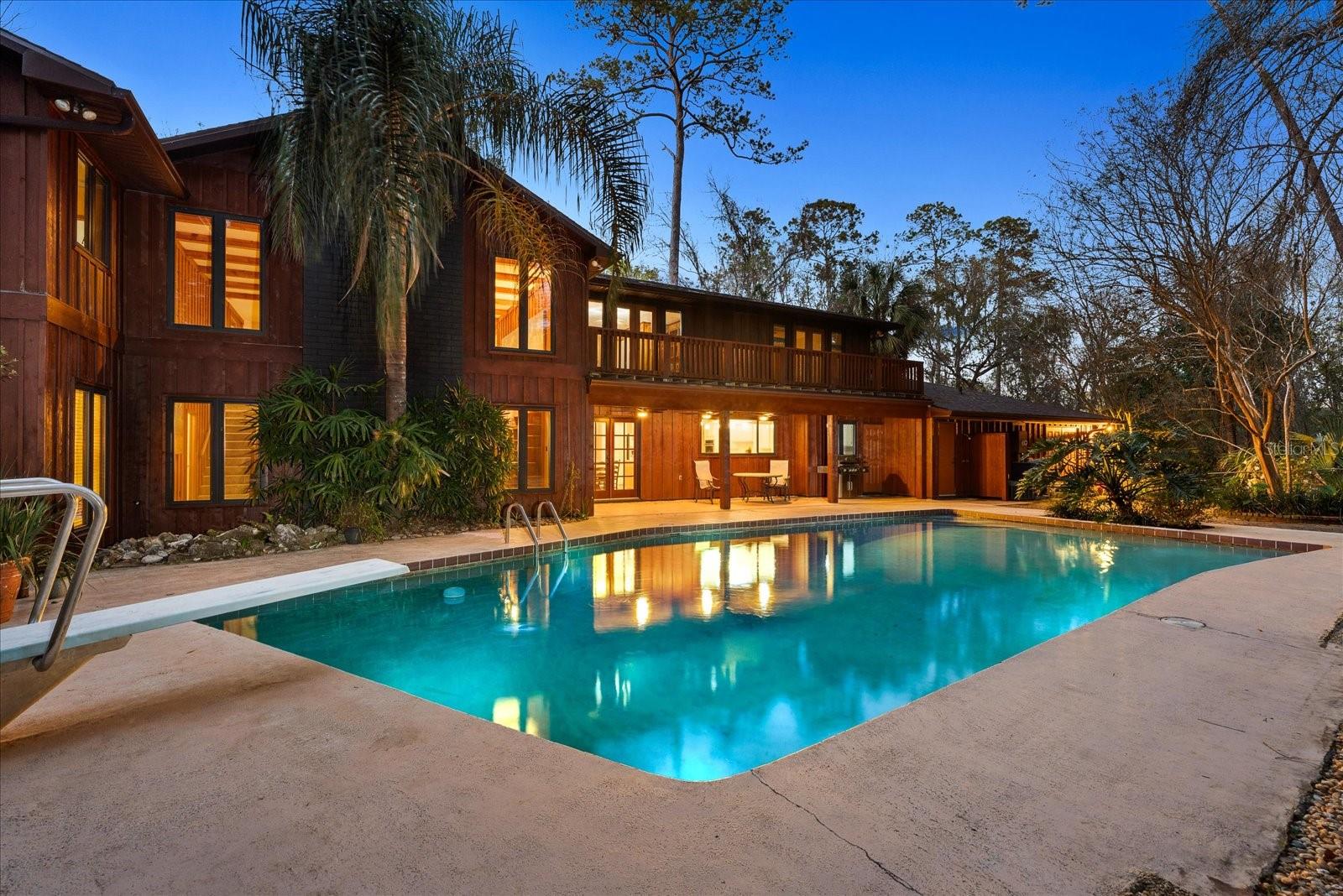 One or more photo(s) has been virtually staged. Tucked away on more than 2.5 acres less than a mile from UF and Shands, this one-of-a-kind property offers the serenity of a nature preserve right in the heart of Gainesville. Perched high above Hogtown Creek, the home captures sweeping, tree-top views and complete privacy — a rare combination of acreage, location, and natural beauty. Step inside to a dramatic two-story great room wrapped in cedar batten-and-board with a striking Spade stone fireplace that anchors the space and frames the view beyond. Walls of windows blur the line between indoors and out, filling every room with light and a connection to the surrounding preserve. The main level features a formal living room with bay windows, a spacious dining room with custom built-ins, and an island kitchen with double ovens and breakfast area opening to the pool deck. The primary suite is a peaceful retreat overlooking the pool and wooded backdrop, while upstairs offers five additional bedrooms (two of which have ensuite bathrooms) plus an office and game room — plenty of space for family, guests, or multi-generational living. Recent updates include a NEW 2024 roof, newer water heaters, fresh interior and exterior paint, and luxury vinyl flooring. Outdoors, enjoy the 30,000-gallon pool, multiple decks, and direct access to the creek below. With timeless design, enduring craftsmanship, and unmatched privacy, this Shands Woods retreat blends the best of nature and convenience — minutes to UF, Shands, the VA, and downtown, yet worlds away from it all.