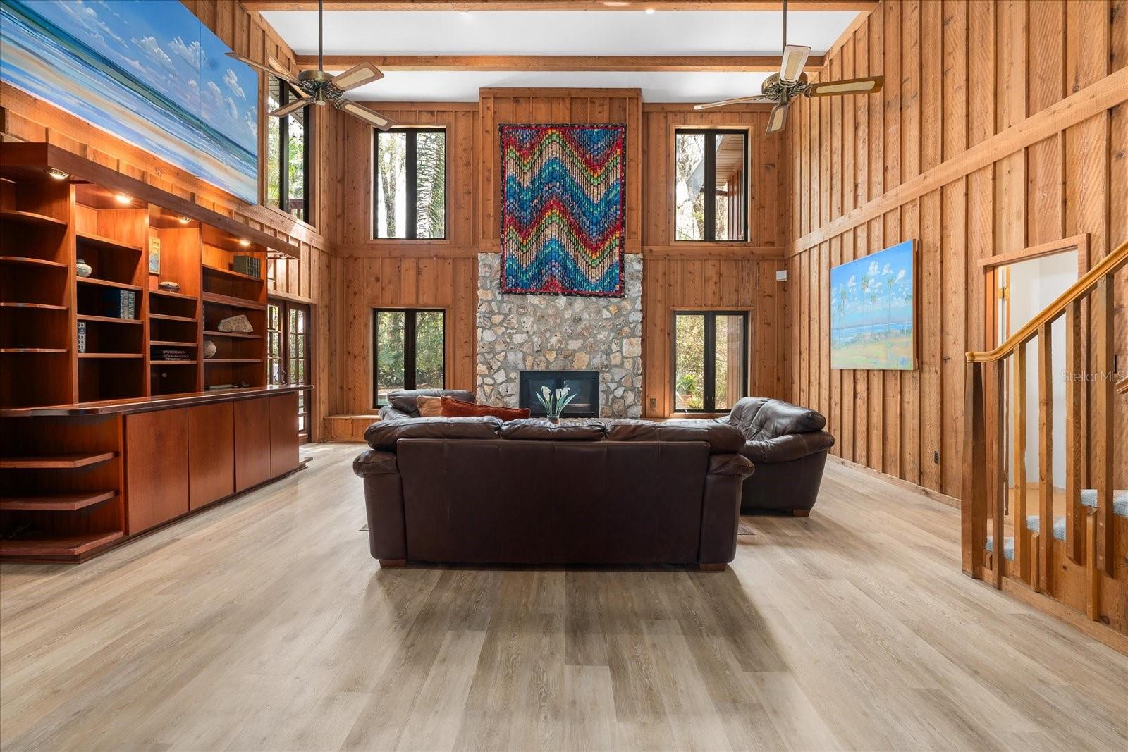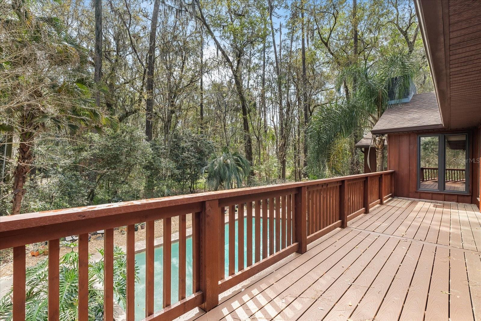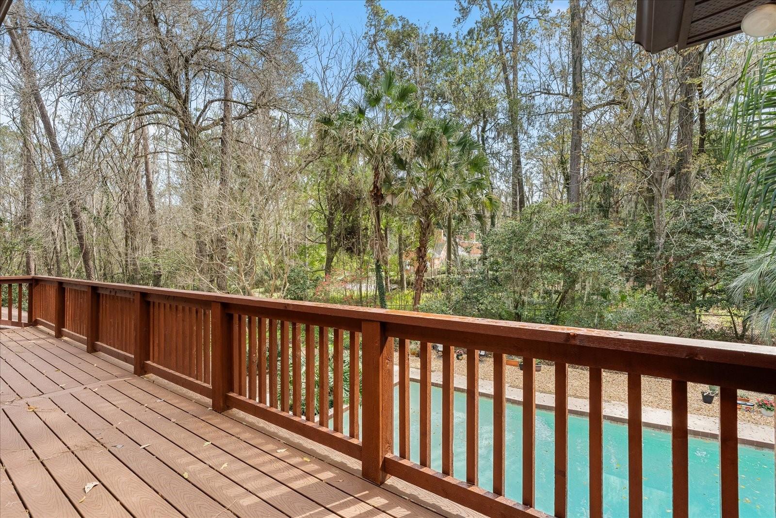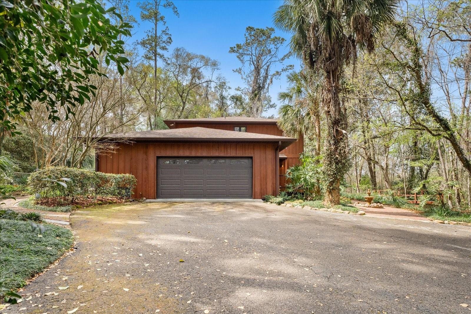 One or more photo(s) has been virtually staged. Tucked away on more than 2.5 acres less than a mile from UF and Shands, this one-of-a-kind property offers the serenity of a nature preserve right in the heart of Gainesville. Perched high above Hogtown Creek, the home captures sweeping, tree-top views and complete privacy — a rare combination of acreage, location, and natural beauty. Step inside to a dramatic two-story great room wrapped in cedar batten-and-board with a striking Spade stone fireplace that anchors the space and frames the view beyond. Walls of windows blur the line between indoors and out, filling every room with light and a connection to the surrounding preserve. The main level features a formal living room with bay windows, a spacious dining room with custom built-ins, and an island kitchen with double ovens and breakfast area opening to the pool deck. The primary suite is a peaceful retreat overlooking the pool and wooded backdrop, while upstairs offers five additional bedrooms (two of which have ensuite bathrooms) plus an office and game room — plenty of space for family, guests, or multi-generational living. Recent updates include a NEW 2024 roof, newer water heaters, fresh interior and exterior paint, and luxury vinyl flooring. Outdoors, enjoy the 30,000-gallon pool, multiple decks, and direct access to the creek below. With timeless design, enduring craftsmanship, and unmatched privacy, this Shands Woods retreat blends the best of nature and convenience — minutes to UF, Shands, the VA, and downtown, yet worlds away from it all.