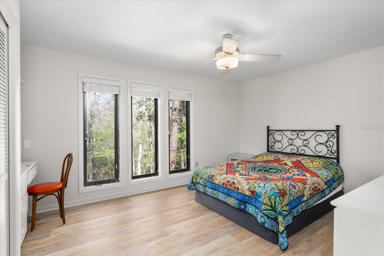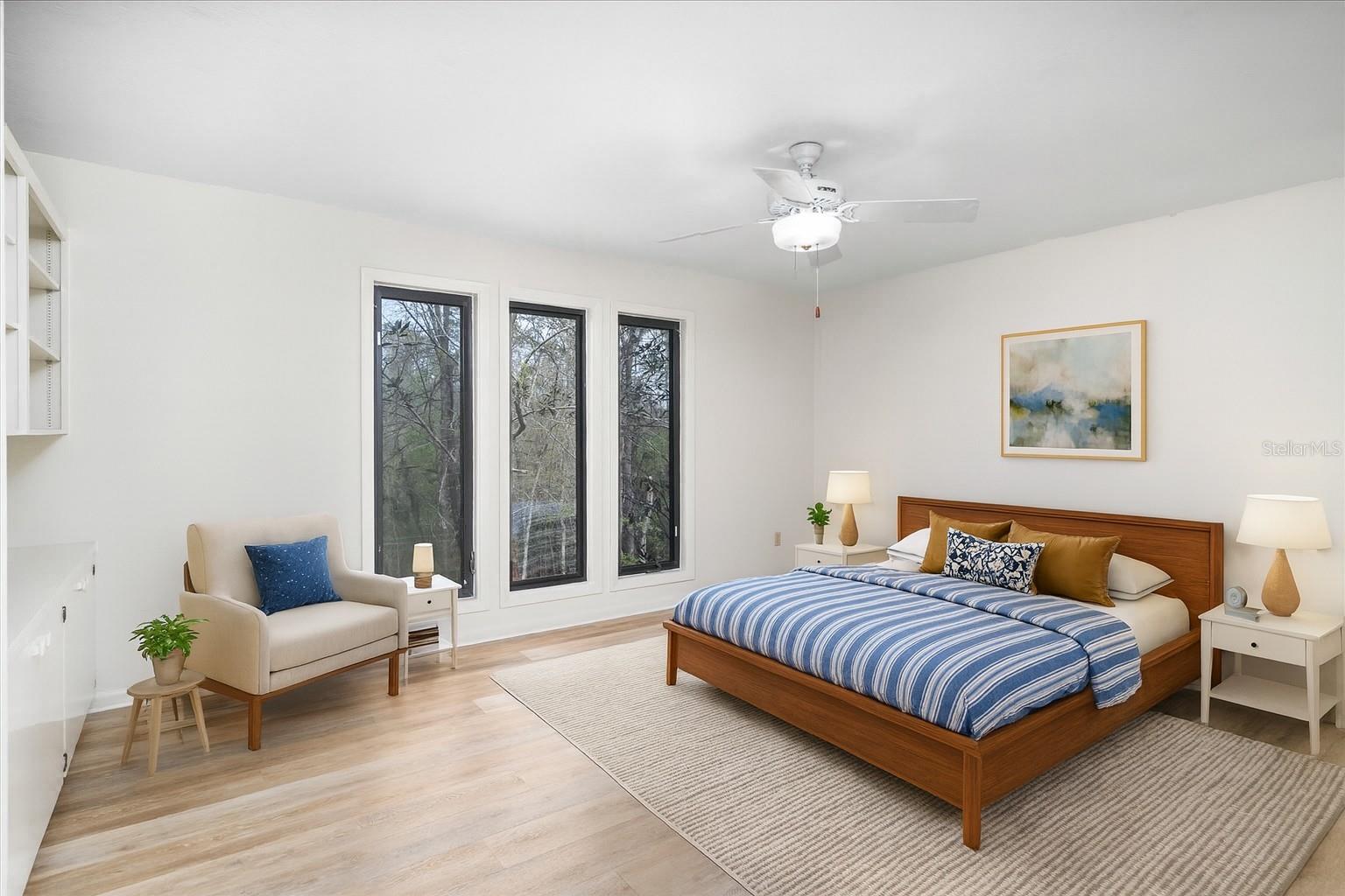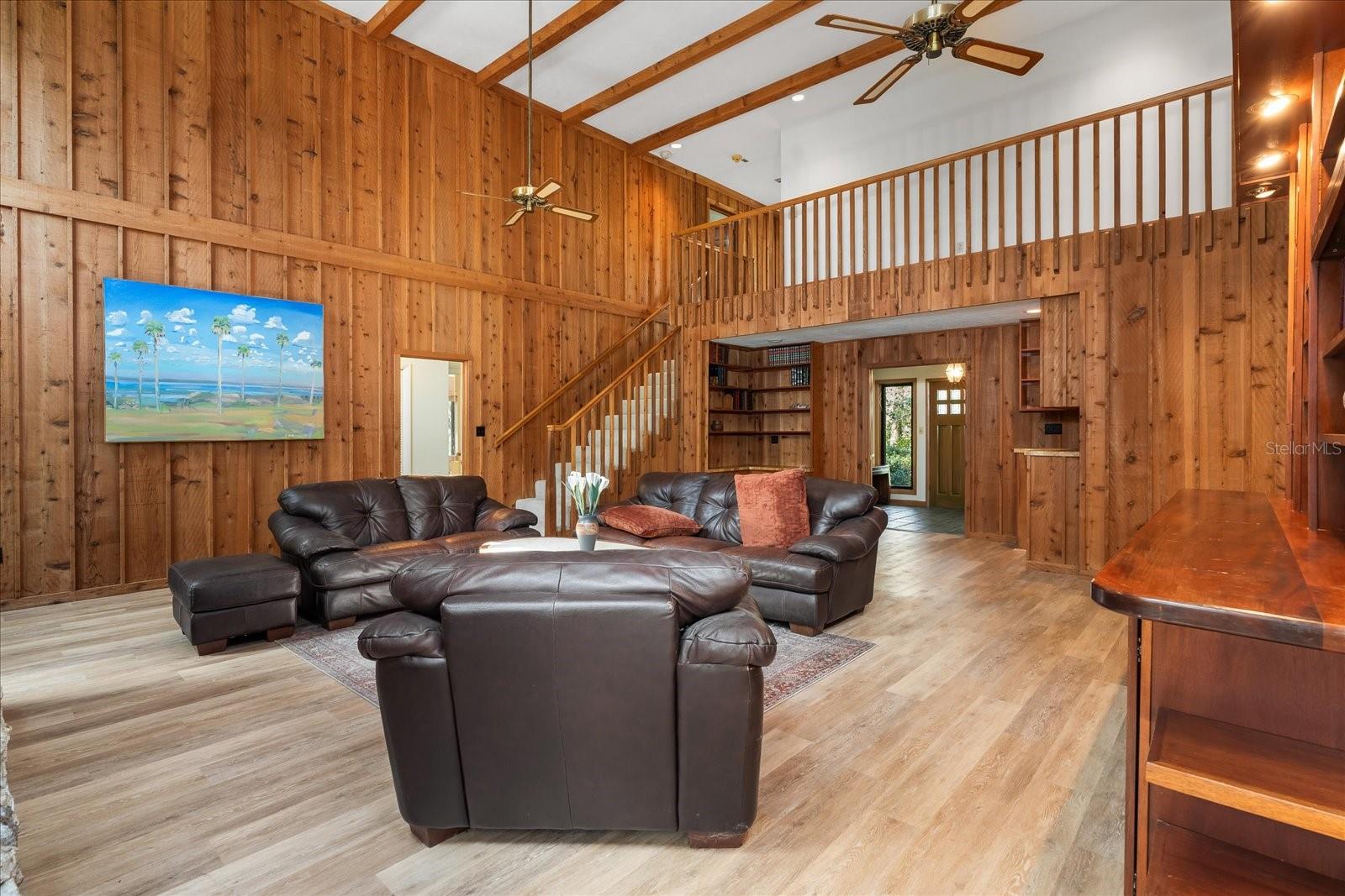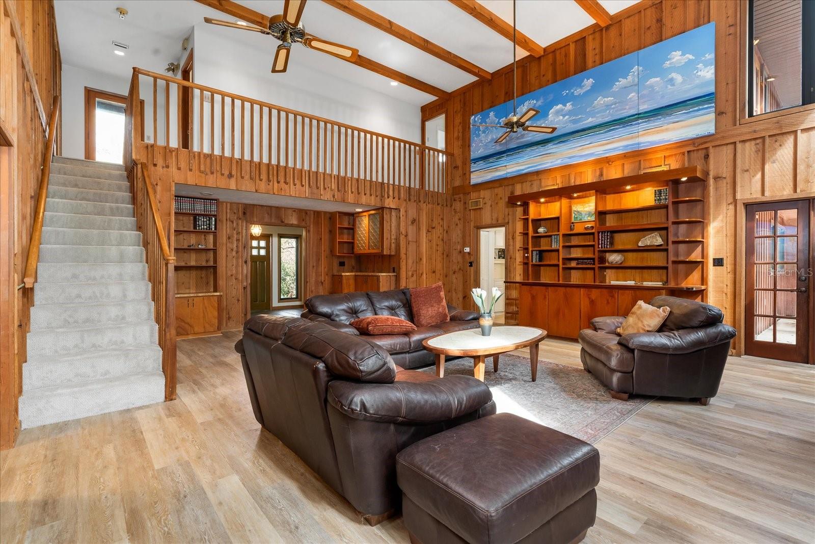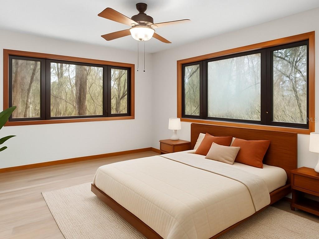 One or more photo(s) has been virtually staged. Tucked away on more than 2.5 acres less than a mile from UF and Shands, this one-of-a-kind property offers the serenity of a nature preserve right in the heart of Gainesville. Perched high above Hogtown Creek, the home captures sweeping, tree-top views and complete privacy — a rare combination of acreage, location, and natural beauty. Step inside to a dramatic two-story great room wrapped in cedar batten-and-board with a striking Spade stone fireplace that anchors the space and frames the view beyond. Walls of windows blur the line between indoors and out, filling every room with light and a connection to the surrounding preserve. The main level features a formal living room with bay windows, a spacious dining room with custom built-ins, and an island kitchen with double ovens and breakfast area opening to the pool deck. The primary suite is a peaceful retreat overlooking the pool and wooded backdrop, while upstairs offers five additional bedrooms (two of which have ensuite bathrooms) plus an office and game room — plenty of space for family, guests, or multi-generational living. Recent updates include a NEW 2024 roof, newer water heaters, fresh interior and exterior paint, and luxury vinyl flooring. Outdoors, enjoy the 30,000-gallon pool, multiple decks, and direct access to the creek below. With timeless design, enduring craftsmanship, and unmatched privacy, this Shands Woods retreat blends the best of nature and convenience — minutes to UF, Shands, the VA, and downtown, yet worlds away from it all.
