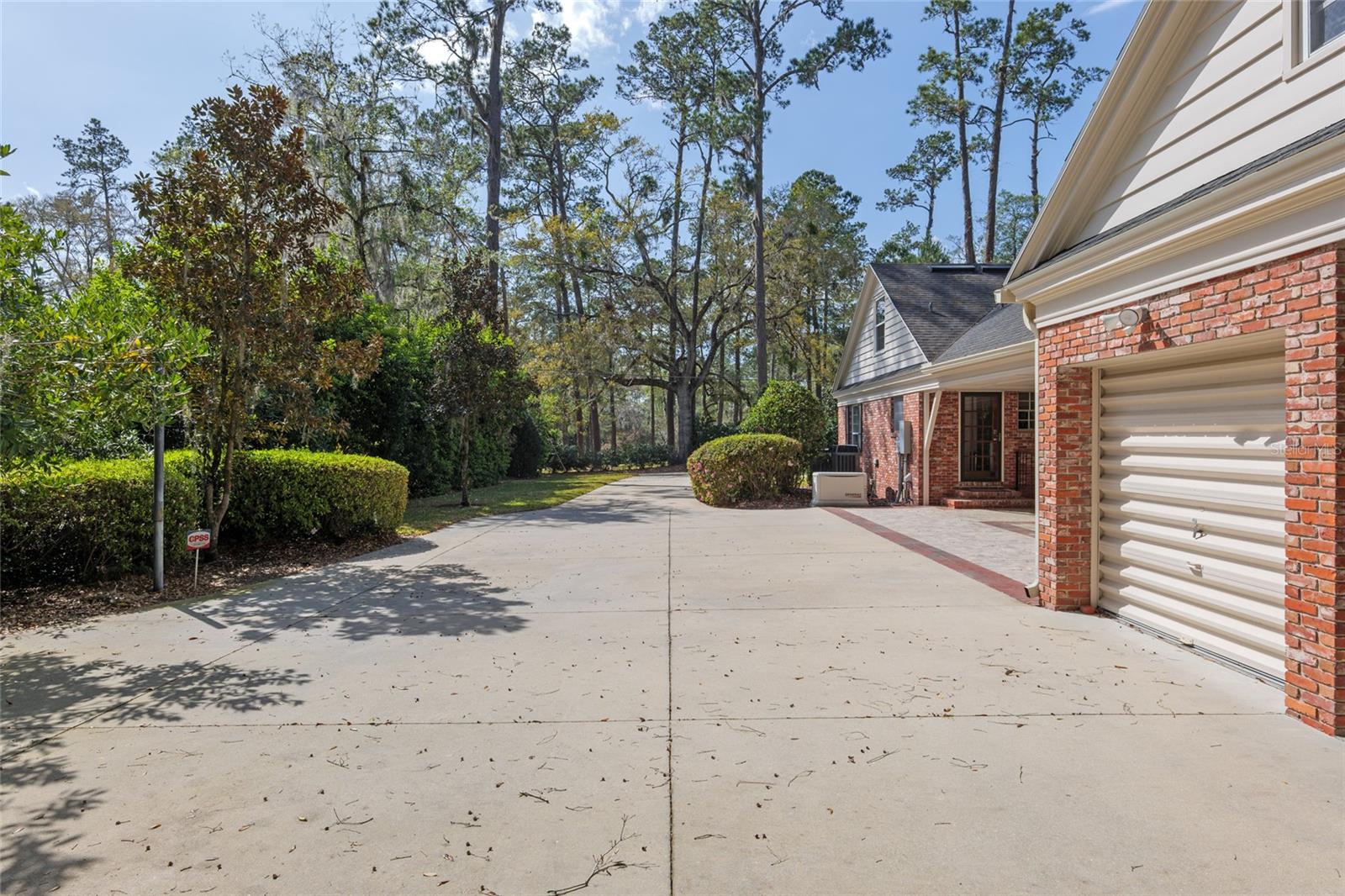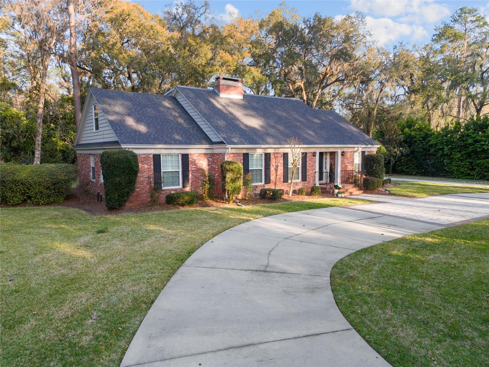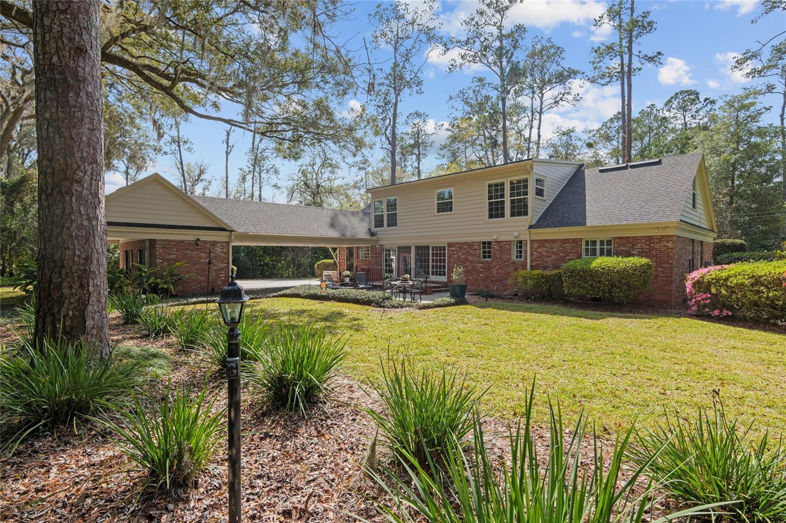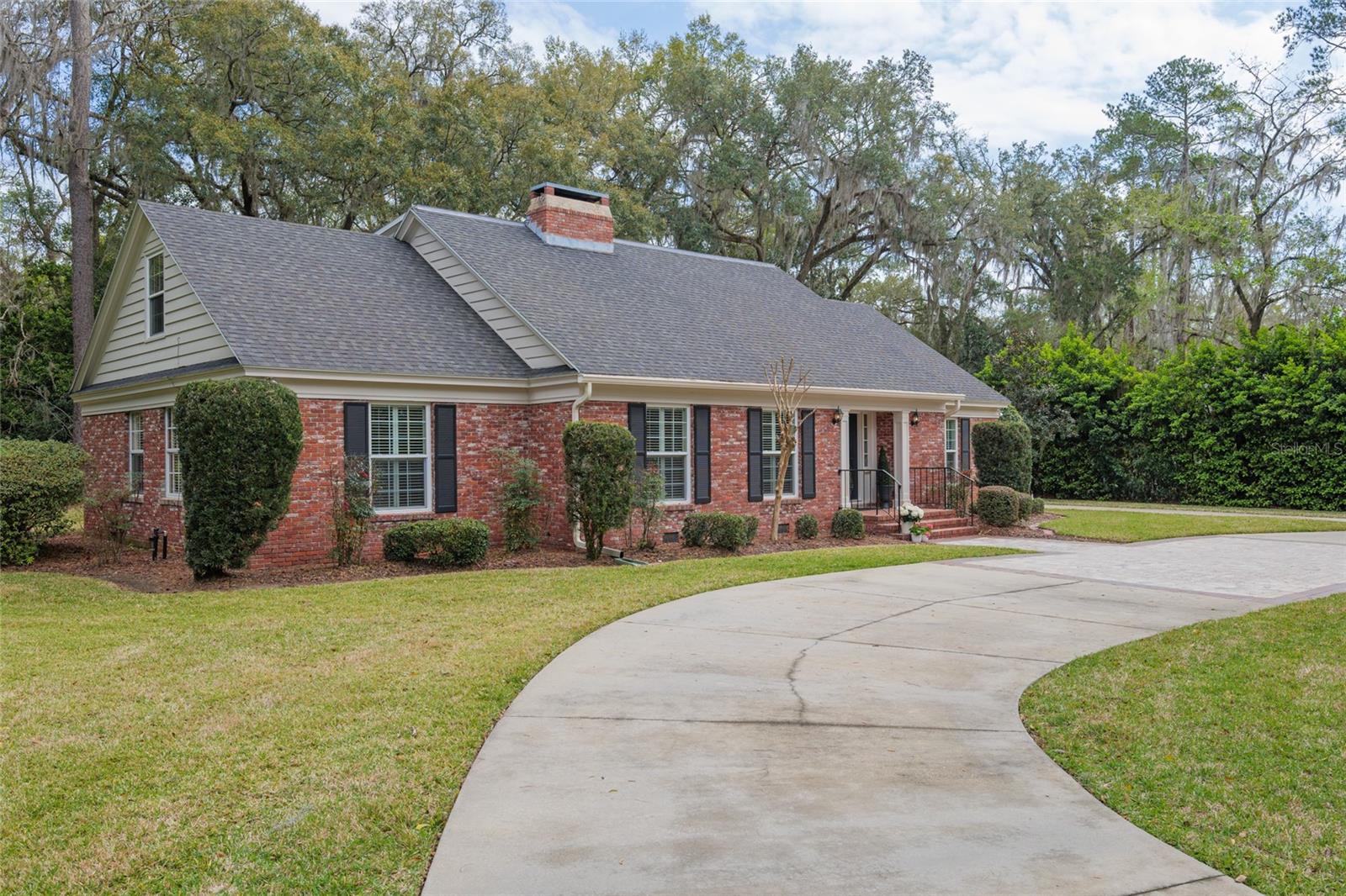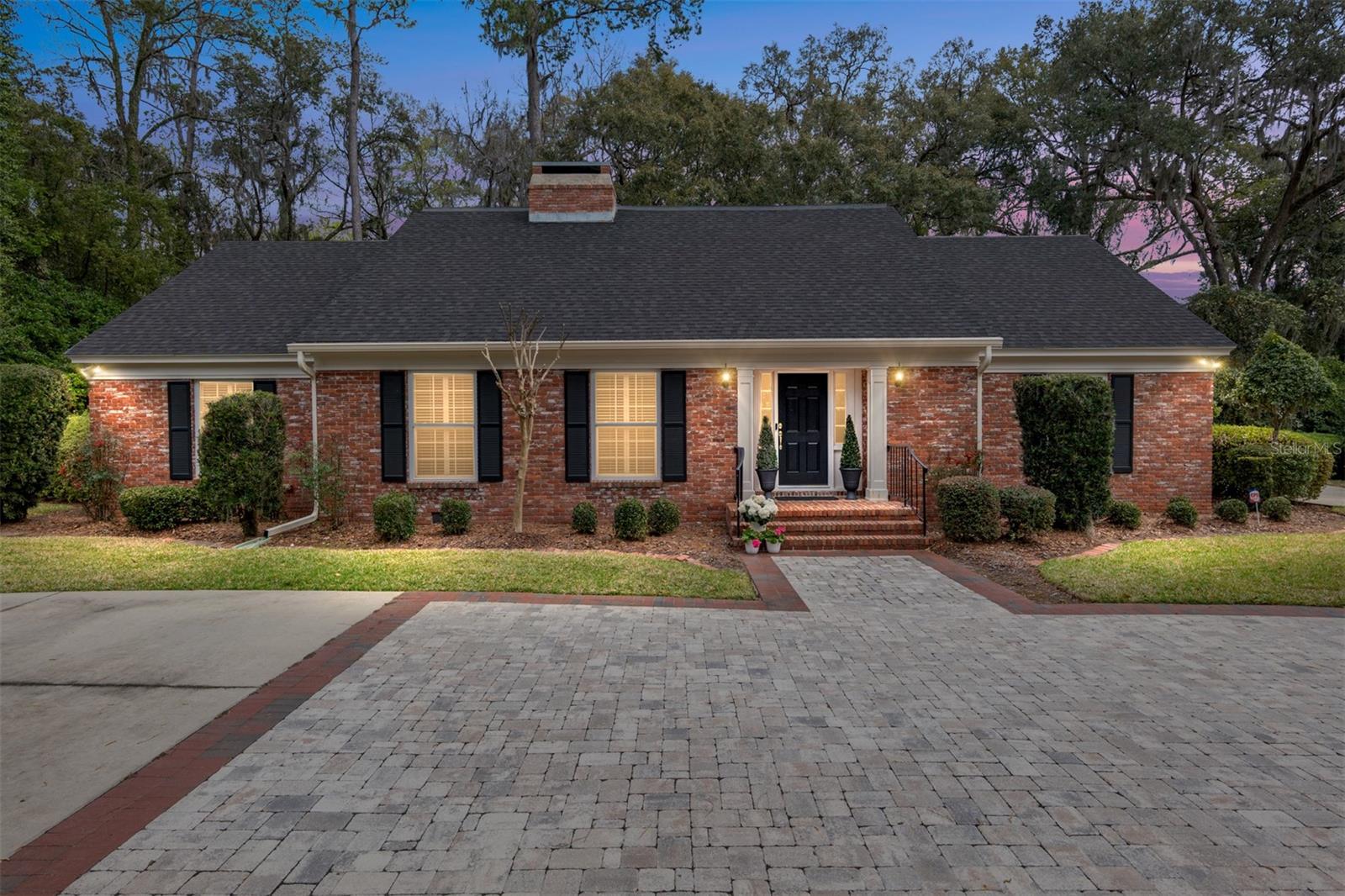 Elegantly maintained brick-accented home exudes classic charm while featuring thoughtful modern updates. A circular driveway leads to the inviting front entrance, where you’ll step into a foyer featuring a striking winding staircase to the upper level. Sliding doors open to a stunning, paver patio and manicured backyard, offering picturesque views of a beautiful oak canopy. To the left of the foyer, a formal living room provides an elegant space for entertaining, while to the right, a cozy family room sits just off the kitchen—perfect for relaxed gatherings. Gorgeous wood floors extend throughout the home, enhancing its warmth and character. The primary and upstairs bathrooms have been tastefully updated, with no expense spared. The home also features a one-car garage with a mini-split system and additional rear storage or parking. This space offers versatile potential—easily convertible into an in-law suite or a cabana for a future pool. Inside, the layout is both functional and flexible: two bedrooms and 2.5 bathrooms downstairs, while the upstairs offers two additional bedrooms, each with its own bonus room, plus a full bathroom. The kitchen, accessible from the covered paver carport—which accommodates more than two vehicles—boasts a walk-in pantry, wet bar, and in-kitchen laundry for added convenience. Updated windows, a whole-home Generac generator, two HVAC systems, and an on-demand water heater, ensuring modern efficiency and comfort. This home has been meticulously cared for, and its prime location is unbeatable—just minutes from Westwood Publix Shopping Center, local shops, and restaurants. UF Health/Shands and downtown Gainesville is only 3 miles away, and UF’s main campus is one mile away. Zoned for Beatrice Parker Elementary, Westwood Middle, and Gainesville High School, this home is truly a rare find.