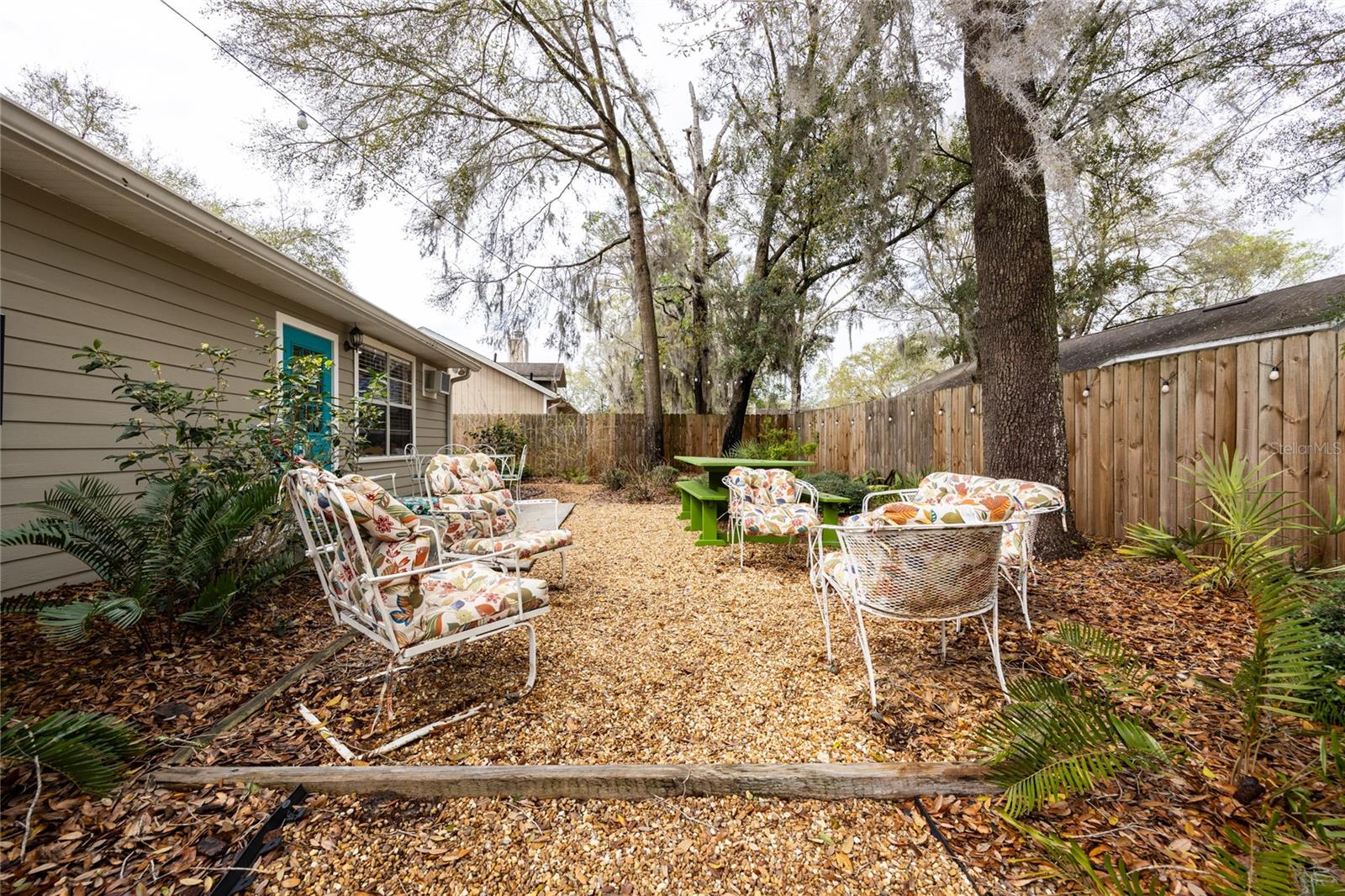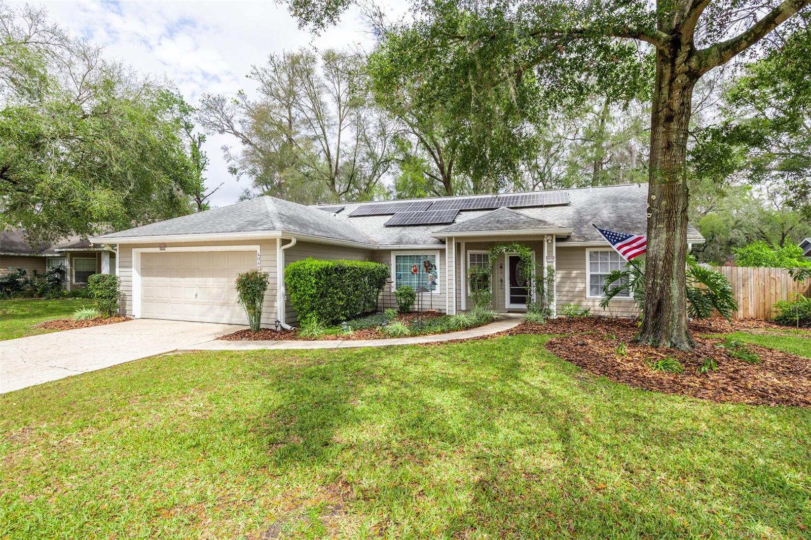 Highly sought-after and desirable Grand Central at Millhopper Station, with low HOA fees, is located in NW Gainesville! This charming 3-bedroom, 2-bathroom home offers approximately 1,730 sq. ft. of open-concept living space and features a bright and airy layout, including an enclosed Florida room. The split-bedroom floor plan provides privacy and flexibility, ideal for both everyday living and entertaining. Enjoy a cozy breakfast nook and a formal dining room, making this home the perfect balance of comfort and style. The spacious living area boasts vaulted ceilings, a wood-burning fireplace, and beautiful low-maintenance laminate flooring throughout the main living spaces, with tile in the bathrooms. The owner's suite offers a soaker tub, a separate shower and a dual vanity. Step outside to a private, newly installed wood fence that surrounds your backyard, providing a perfect spot for relaxing by the firepit with friends and family. The home’s exterior is complemented by low-maintenance landscaping, allowing you to enjoy the Florida sunshine without the upkeep. Key updates include a 2014 roof, a 2019 HVAC, and a 2019 replumbing. The water heater, which was likely replaced around 2019 when the home was replumbed, is marked as manufactured in 2018 (no permit on file). This home also features owned solar panels (net meter), offering energy efficiency and cost savings. An EV charging station installed in the garage is included, further enhancing the home’s eco-friendly amenities. Conveniently located just minutes from Hunter’s Crossing shops, Publix, Starbucks, an Urgent Care facility, and a variety of restaurants, with an easy 15-minute commute to the University of Florida. Walking distance to Talbot Elementary, and for nature enthusiasts, a short walk or bike ride to Devils Millhopper and San Felasco Park.