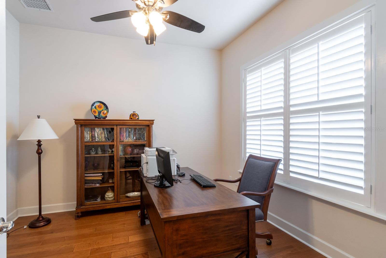 Step into luxury and comfort in this beautifully designed home, where high-end finishes and thoughtful details create an inviting retreat. Elegant coffered ceilings add architectural charm, while rich wood flooring flows seamlessly throughout the living spaces, enhancing warmth and sophistication. The gourmet kitchen is a standout with its subway-style glass tile backsplash, featuring stainless steel appliances, a walk-in pantry, and ample counter space, making meal prep a breeze. The primary suite is a private sanctuary with a spa-like en-suite bathroom and a spacious walk-in closet. Bathrooms are upgraded with designer tile, adding a touch of modern elegance. French doors lead to a covered, screened lanai, perfect for outdoor relaxation and entertaining in any season. The HOA-maintained fencing ensures a well-kept and private backyard, ideal for pets or quiet enjoyment. Throughout the home, plantation blinds provide both style and light control, enhancing the home’s timeless appeal. Don’t miss the chance to own this exquisite property—schedule your showing today!