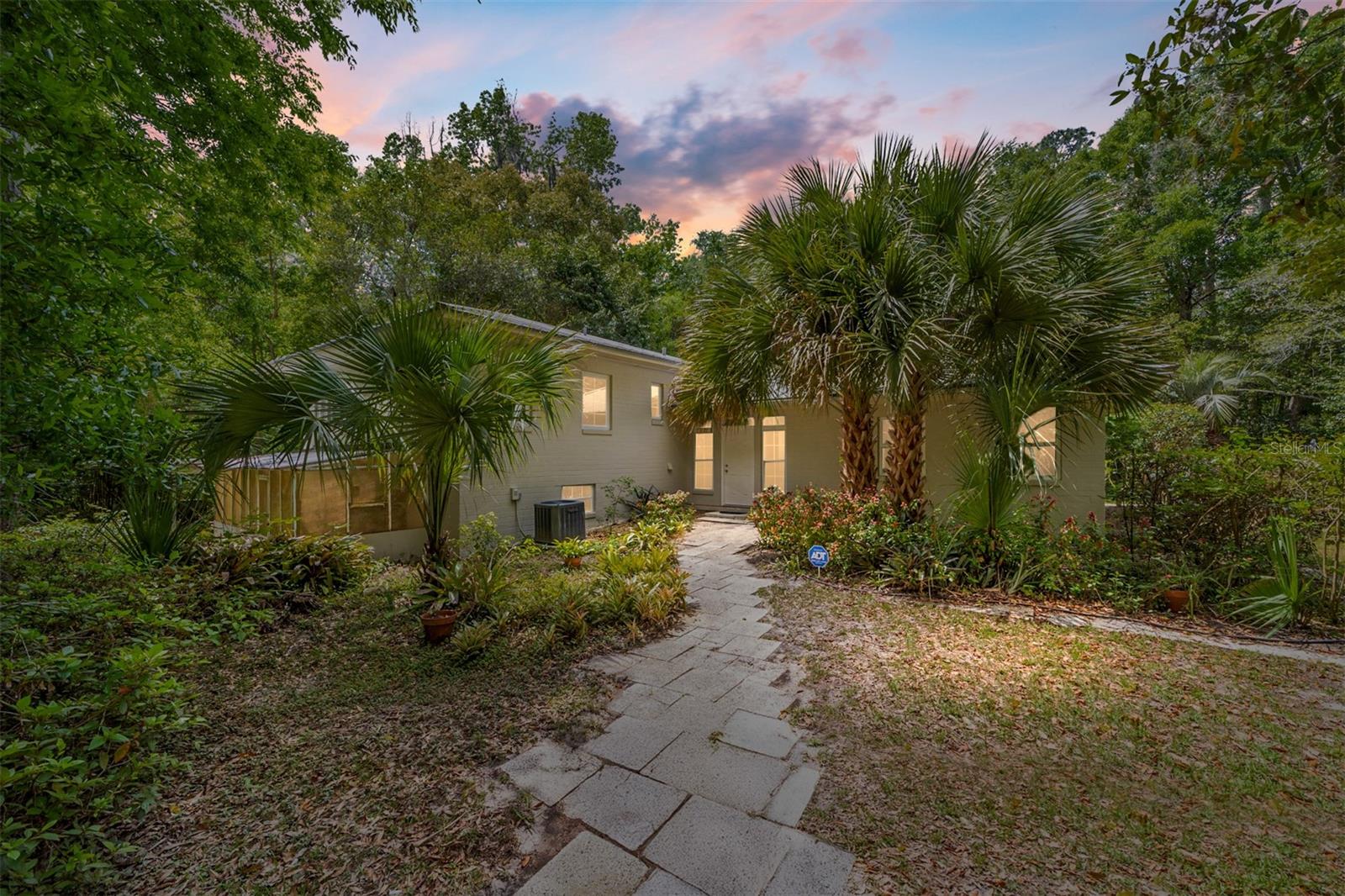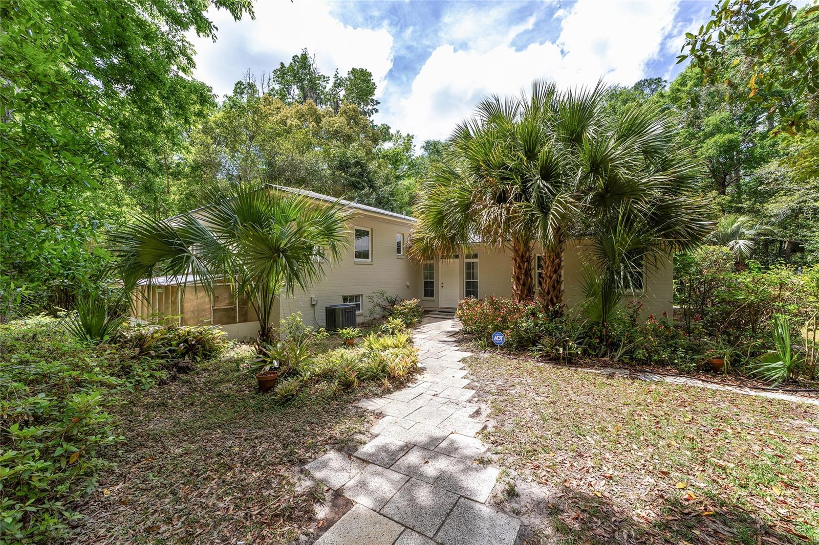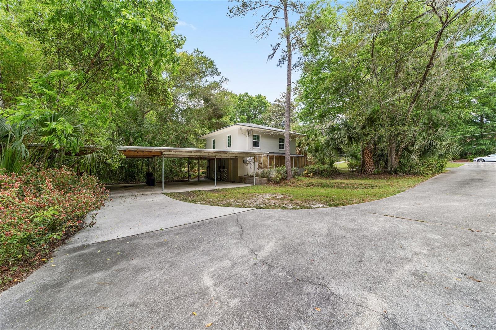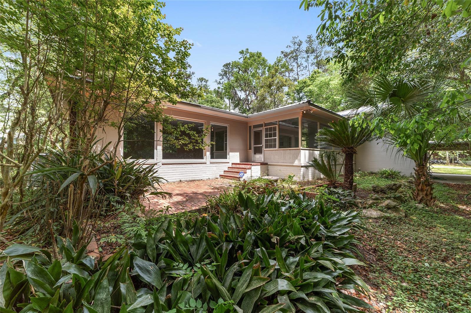 Charming 4-Bedroom Home nestled on over 1.3 acres and bounded by the Hogtown Creek in a serene natural setting. Welcome to your peaceful nature retreat just 1 mile to the University of Florida! This spacious 4-bedroom, 3.5-bathroom home in Florida Park offers the perfect blend of privacy, comfort, and functionality. The property features mature landscaping, oak and palm trees, and plenty of open space, making it ideal for relaxing, gardening, or entertaining outdoors. The house is a solid, split-level concrete block structure with a lifetime metal roof that has been nicely upgraded multiple times. Inside, the kitchen area features granite counters while the open Florida room is a true showstopper—bathed in natural light with wide views of the tranquil landscape, it's the perfect spot for a morning coffee or unwinding in the evening. The main living room offers expansive views of the back yard through floor to ceiling windows and an inviting layout for family life or hosting guests around the fireplace and on the adjacent hand-laid brick patio. The wood flooring was just refinished and freshly painted (including new ceiling paint). The home features a 3-way split floor plan, each bedroom is generously sized, and the three full bathrooms ensure convenience for everyone. The large primary bedroom on the main floor features an ensuite bathroom. Upstairs you will find two more large bedrooms with a hallway bathroom and linen closet. Downstairs is a laundry room, bedroom with ensuite bathroom, and a project/library room with built-in counters and bookshelves. Outside, a three-car carport provides ample covered parking and additional storage space. Gardeners will enjoy the turn-key greenhouse and potting room ready to go for adding to the property's existing natural beauty. Don't miss this opportunity to enjoy the best of North Florida living in a peaceful, natural setting!
