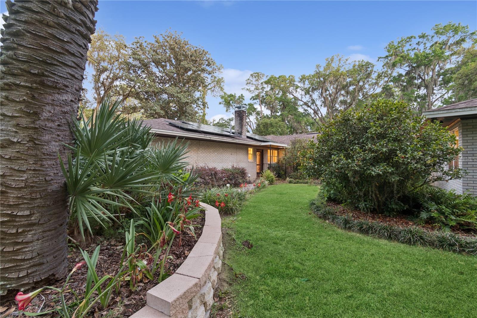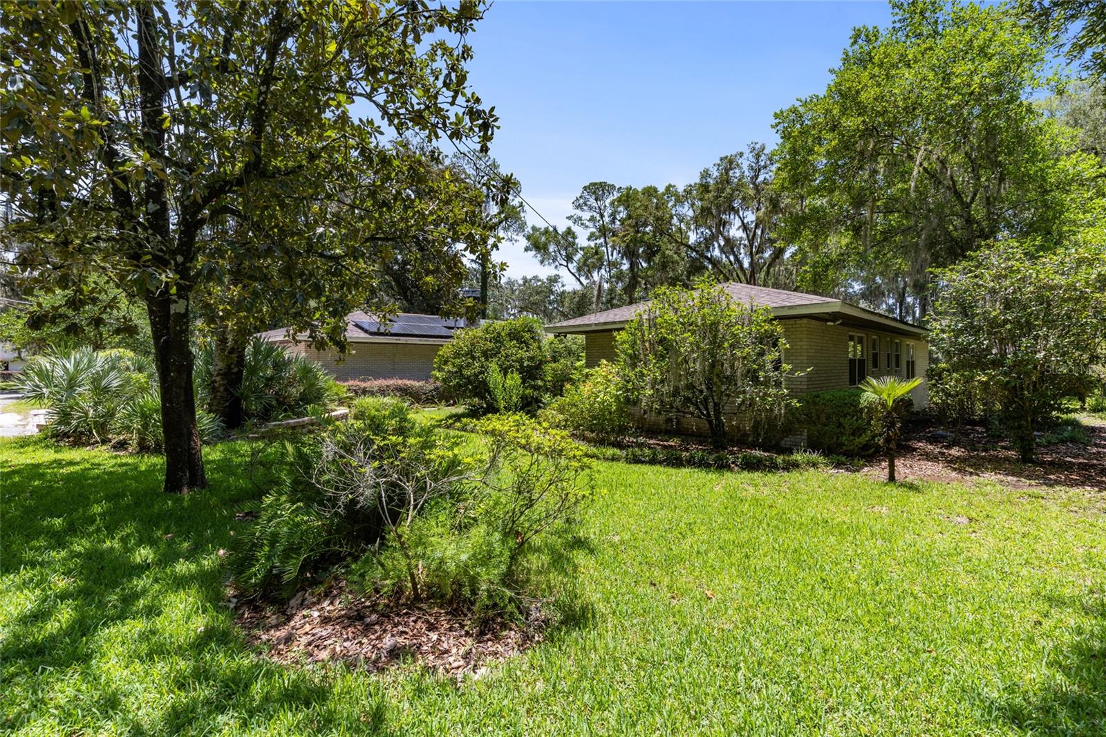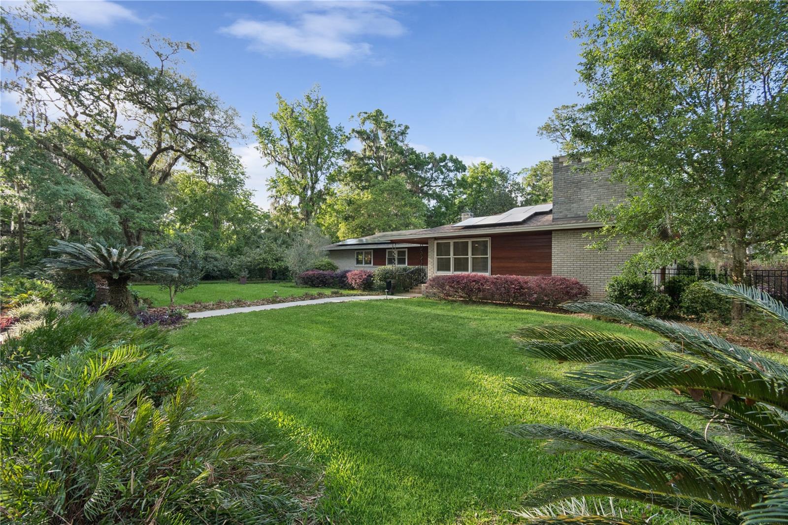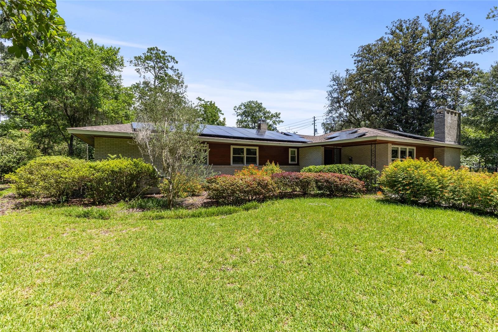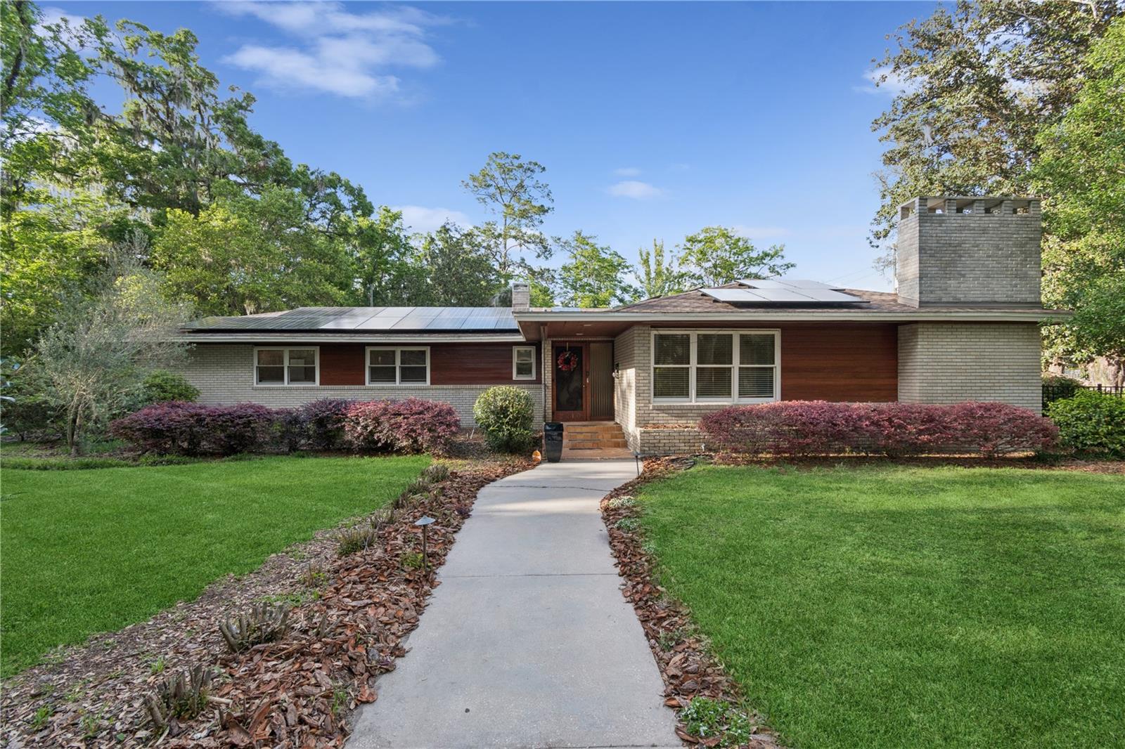 MAJOR PRICE IMPROVEMENT! Welcome to this rare mid-century ranch, a timeless architectural gem designed and built in 1952 by noted Gainesville architect Merle Haynes. Located just six blocks from the University of Florida and its renowned sports venues, this 2,900 sq ft home blends classic design with modern convenience, all set on a beautifully landscaped over half-acre lot. Lovingly cared for by only two owners and never rented, this home exudes warmth and craftsmanship throughout. Inside, you'll find heartwood oak and pine trim, custom built-in cabinets and bookcases, and hardwood floors flowing through the main living areas. The tile-floored bathrooms, wood-paneled study, and fireplace add to the home's rich, inviting character. The spacious, eat-in kitchen is perfect for both everyday living and entertaining, featuring high-end appliances including a Wolf gas cooktop, double oven, two refrigerators, an undercounter ice maker and beverage fridge, plus a dishwasher and washer/dryer. Step outside to a 1,600 sq ft brick patio professionally designed with lighting for evening entertaining, along with brick garden paths and a 3-car driveway by Landscapes Unlimited. The two-car garage offers built-in storage, and the rooftop solar electric system brings energy efficiency. Nature lovers will be enchanted by the park-like garden, featuring a camellia grove and many trees, including fig, olive, calamondin orange, magnolia, and live oaks. Layered throughout are palms, sagos, tea olives, bougainvillea, gardenias, azaleas, hydrangeas, crepe myrtles, and loropetalum hedges. A well and irrigation system support this thriving landscape year-round. With 3 bedrooms, generous closets, a formal dining room with built-in china cabinets, and a large living room with fireplace, this home offers space, character, and a location that’s hard to beat. Homes like this rarely come on the market—schedule your private showing today and experience the unique charm and history of this Gainesville classic.