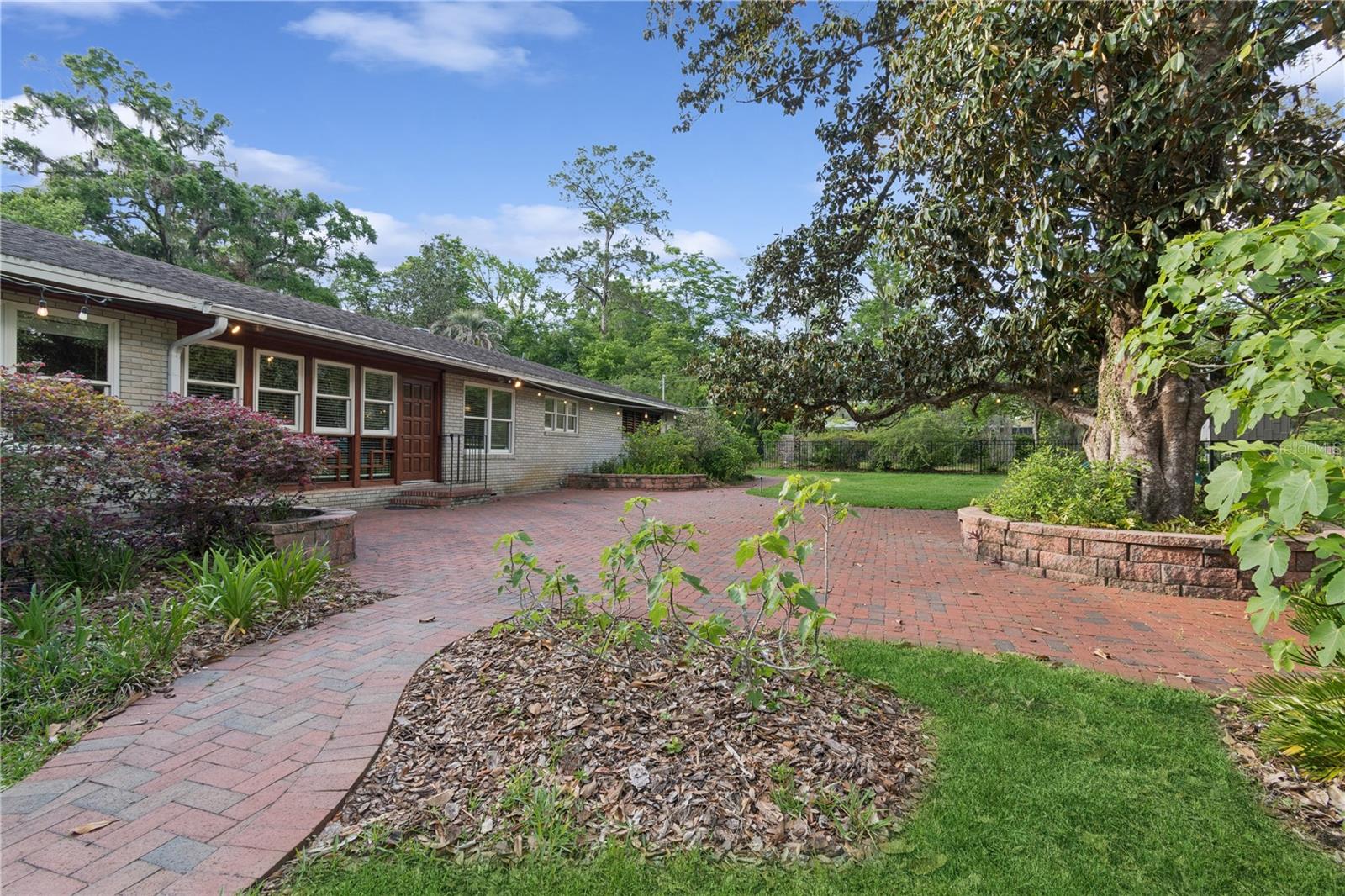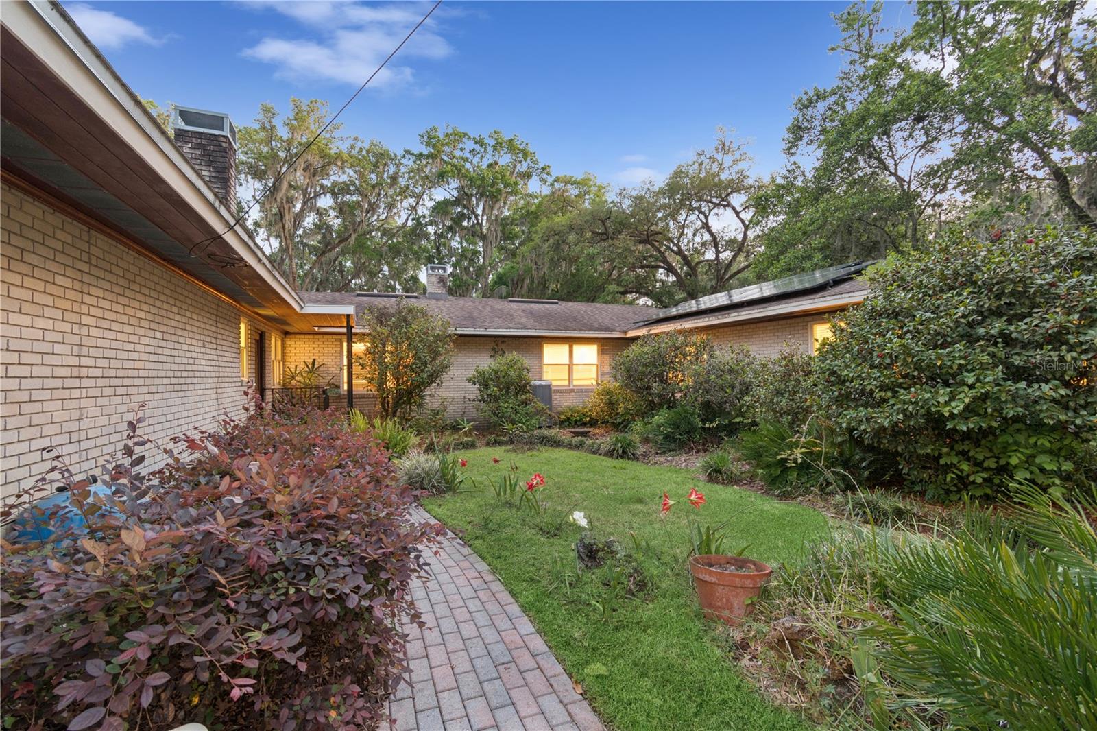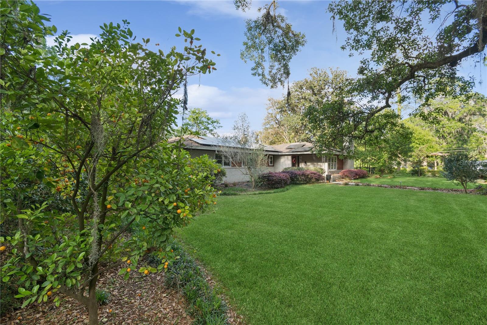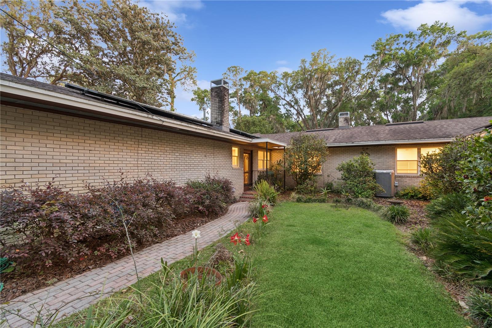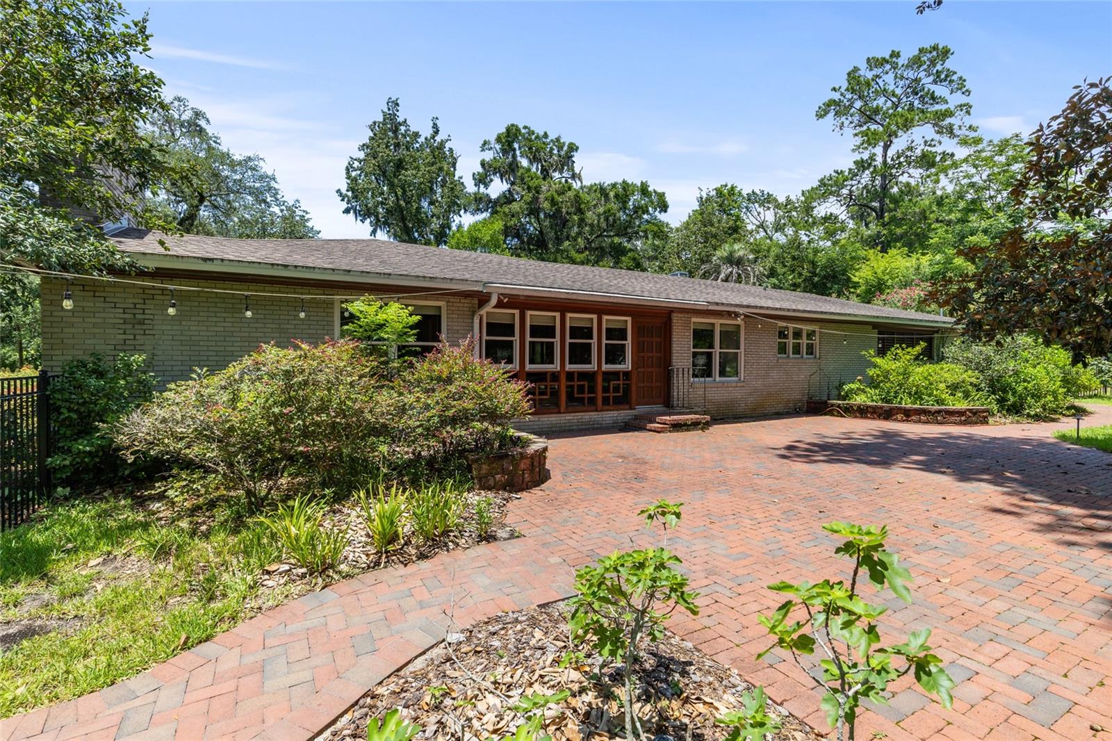 MAJOR PRICE IMPROVEMENT! Welcome to this rare mid-century ranch, a timeless architectural gem designed and built in 1952 by noted Gainesville architect Merle Haynes. Located just six blocks from the University of Florida and its renowned sports venues, this 2,900 sq ft home blends classic design with modern convenience, all set on a beautifully landscaped over half-acre lot. Lovingly cared for by only two owners and never rented, this home exudes warmth and craftsmanship throughout. Inside, you'll find heartwood oak and pine trim, custom built-in cabinets and bookcases, and hardwood floors flowing through the main living areas. The tile-floored bathrooms, wood-paneled study, and fireplace add to the home's rich, inviting character. The spacious, eat-in kitchen is perfect for both everyday living and entertaining, featuring high-end appliances including a Wolf gas cooktop, double oven, two refrigerators, an undercounter ice maker and beverage fridge, plus a dishwasher and washer/dryer. Step outside to a 1,600 sq ft brick patio professionally designed with lighting for evening entertaining, along with brick garden paths and a 3-car driveway by Landscapes Unlimited. The two-car garage offers built-in storage, and the rooftop solar electric system brings energy efficiency. Nature lovers will be enchanted by the park-like garden, featuring a camellia grove and many trees, including fig, olive, calamondin orange, magnolia, and live oaks. Layered throughout are palms, sagos, tea olives, bougainvillea, gardenias, azaleas, hydrangeas, crepe myrtles, and loropetalum hedges. A well and irrigation system support this thriving landscape year-round. With 3 bedrooms, generous closets, a formal dining room with built-in china cabinets, and a large living room with fireplace, this home offers space, character, and a location that’s hard to beat. Homes like this rarely come on the market—schedule your private showing today and experience the unique charm and history of this Gainesville classic.