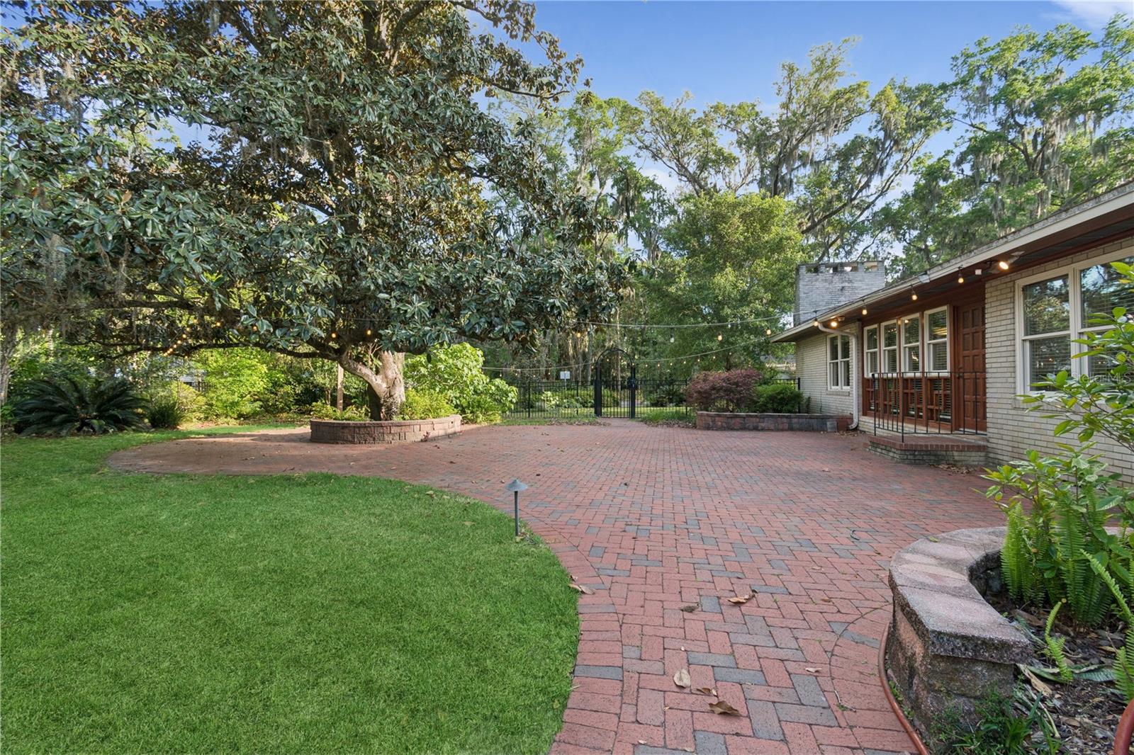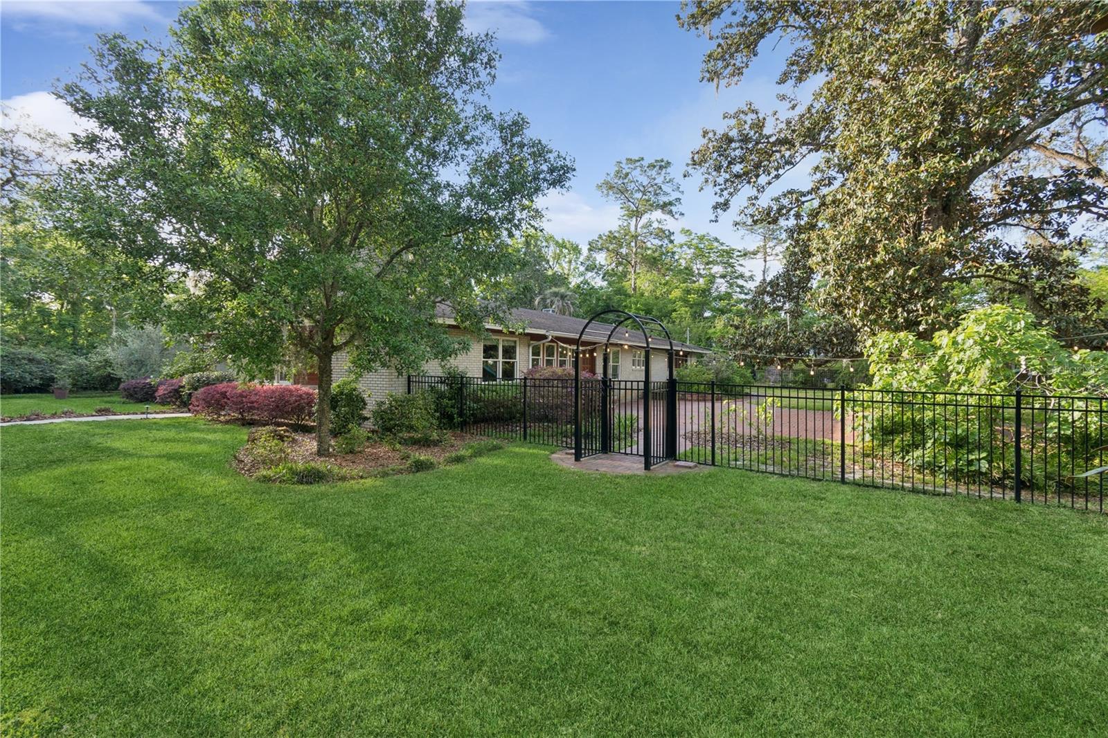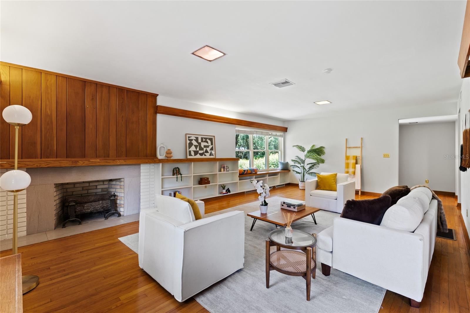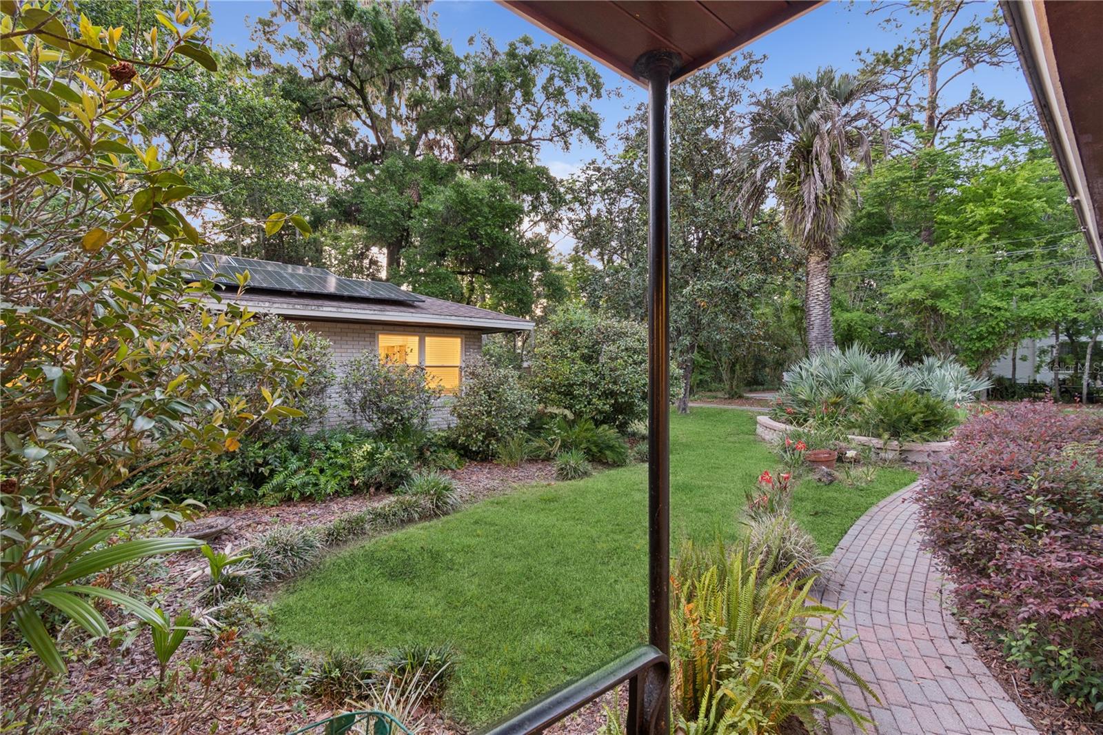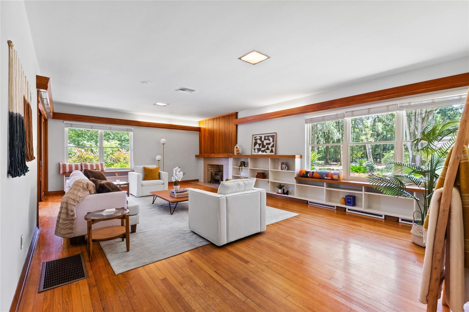 MAJOR PRICE IMPROVEMENT! Welcome to this rare mid-century ranch, a timeless architectural gem designed and built in 1952 by noted Gainesville architect Merle Haynes. Located just six blocks from the University of Florida and its renowned sports venues, this 2,900 sq ft home blends classic design with modern convenience, all set on a beautifully landscaped over half-acre lot. Lovingly cared for by only two owners and never rented, this home exudes warmth and craftsmanship throughout. Inside, you'll find heartwood oak and pine trim, custom built-in cabinets and bookcases, and hardwood floors flowing through the main living areas. The tile-floored bathrooms, wood-paneled study, and fireplace add to the home's rich, inviting character. The spacious, eat-in kitchen is perfect for both everyday living and entertaining, featuring high-end appliances including a Wolf gas cooktop, double oven, two refrigerators, an undercounter ice maker and beverage fridge, plus a dishwasher and washer/dryer. Step outside to a 1,600 sq ft brick patio professionally designed with lighting for evening entertaining, along with brick garden paths and a 3-car driveway by Landscapes Unlimited. The two-car garage offers built-in storage, and the rooftop solar electric system brings energy efficiency. Nature lovers will be enchanted by the park-like garden, featuring a camellia grove and many trees, including fig, olive, calamondin orange, magnolia, and live oaks. Layered throughout are palms, sagos, tea olives, bougainvillea, gardenias, azaleas, hydrangeas, crepe myrtles, and loropetalum hedges. A well and irrigation system support this thriving landscape year-round. With 3 bedrooms, generous closets, a formal dining room with built-in china cabinets, and a large living room with fireplace, this home offers space, character, and a location that’s hard to beat. Homes like this rarely come on the market—schedule your private showing today and experience the unique charm and history of this Gainesville classic.