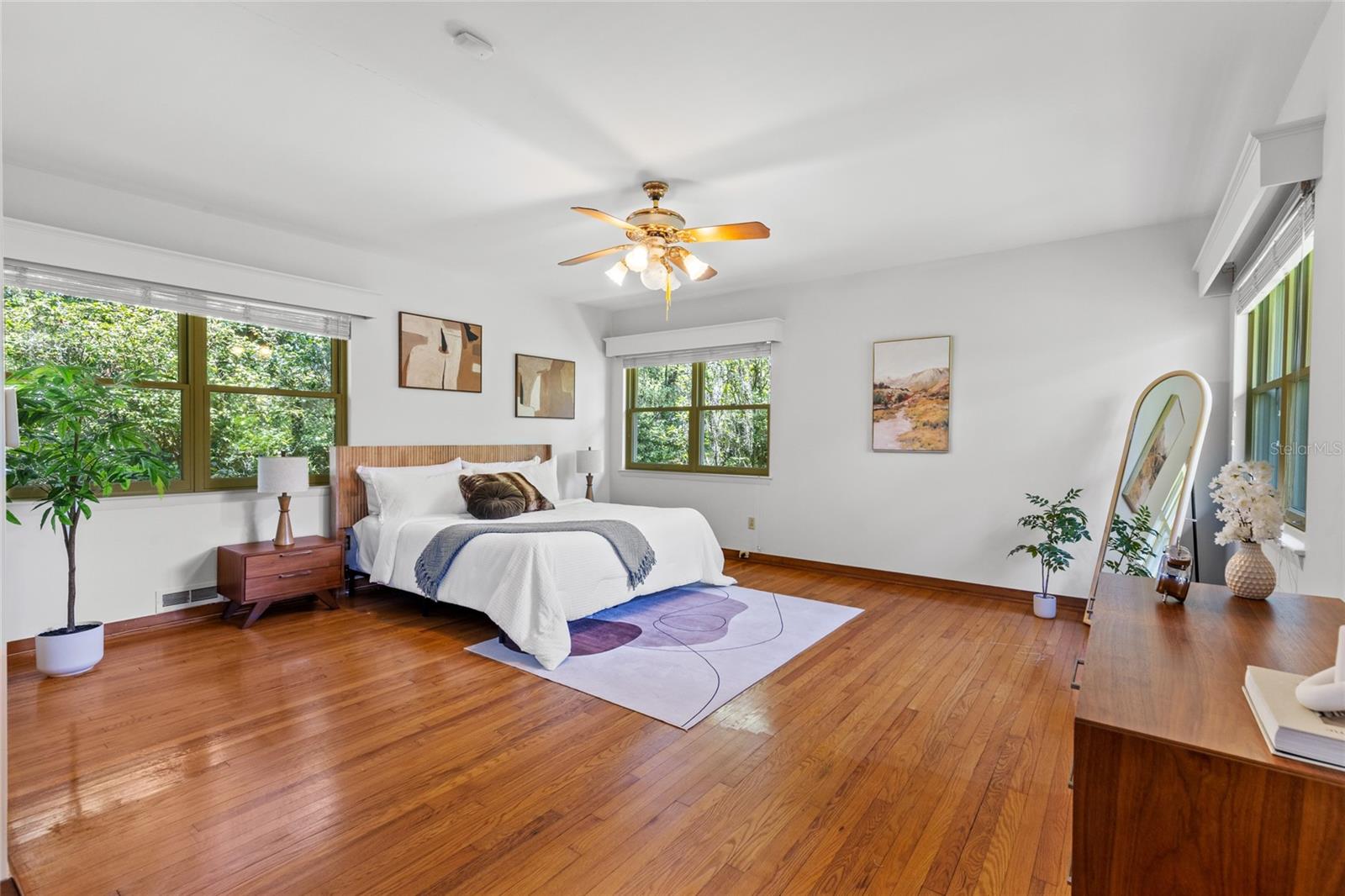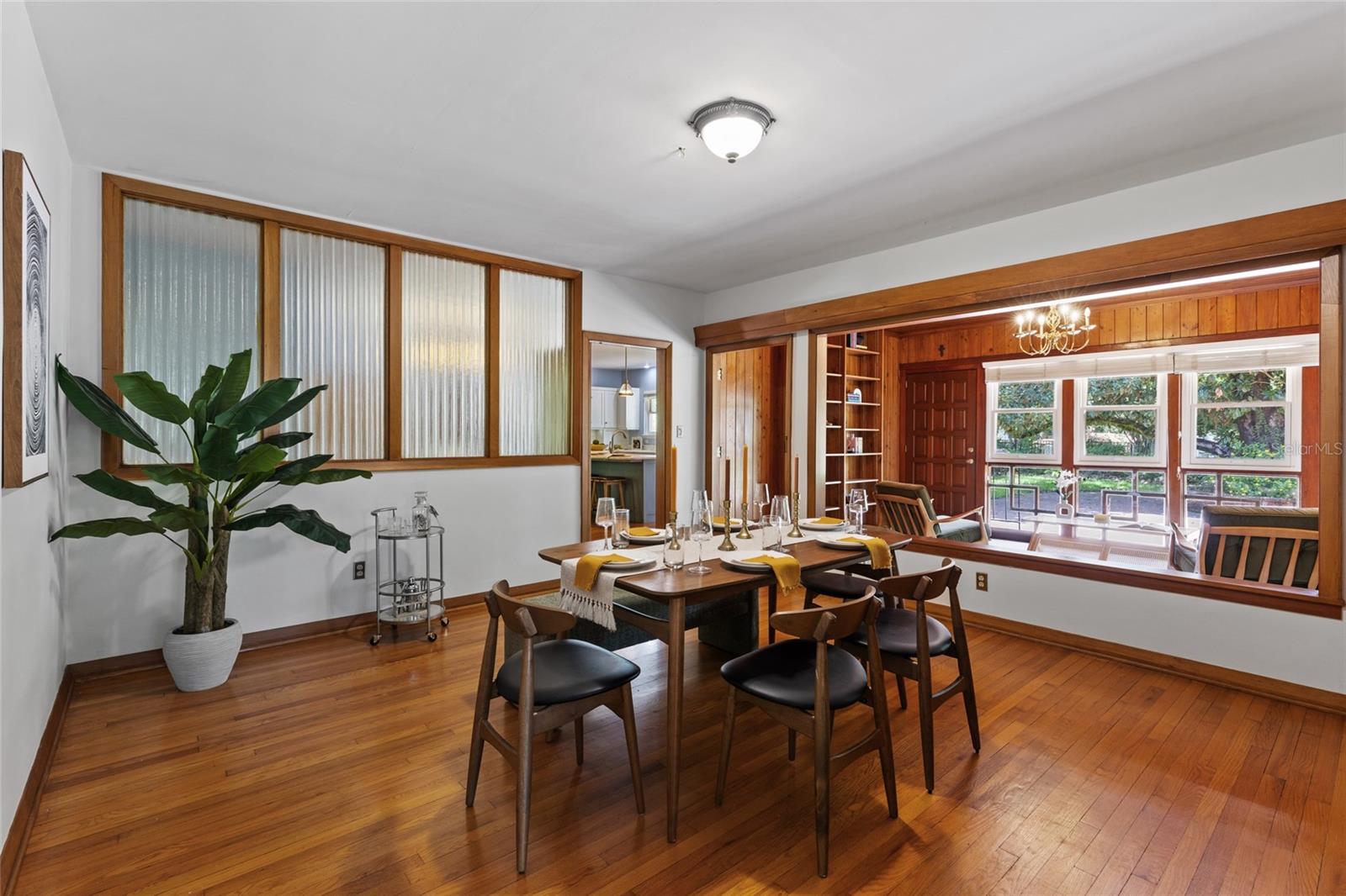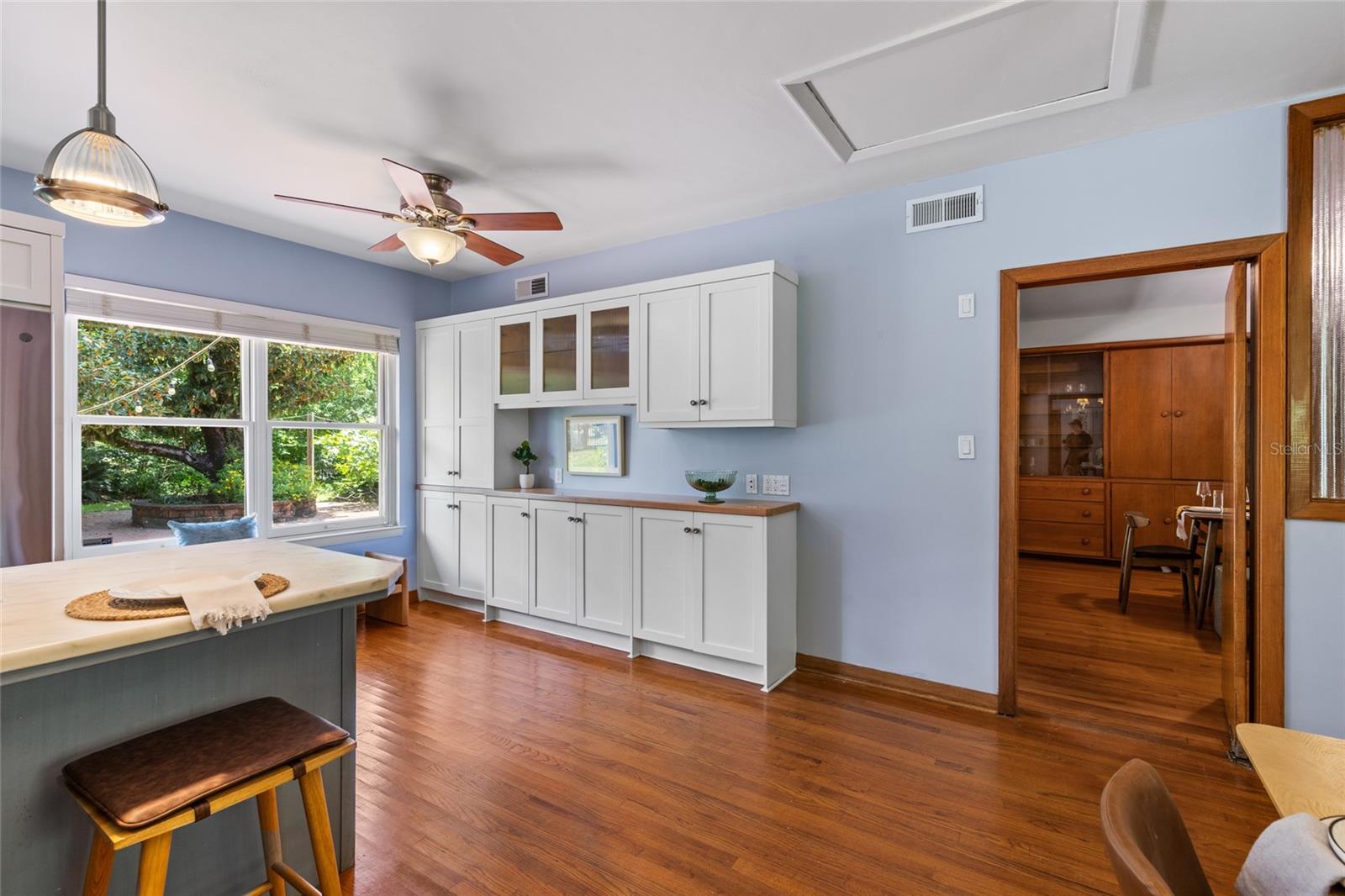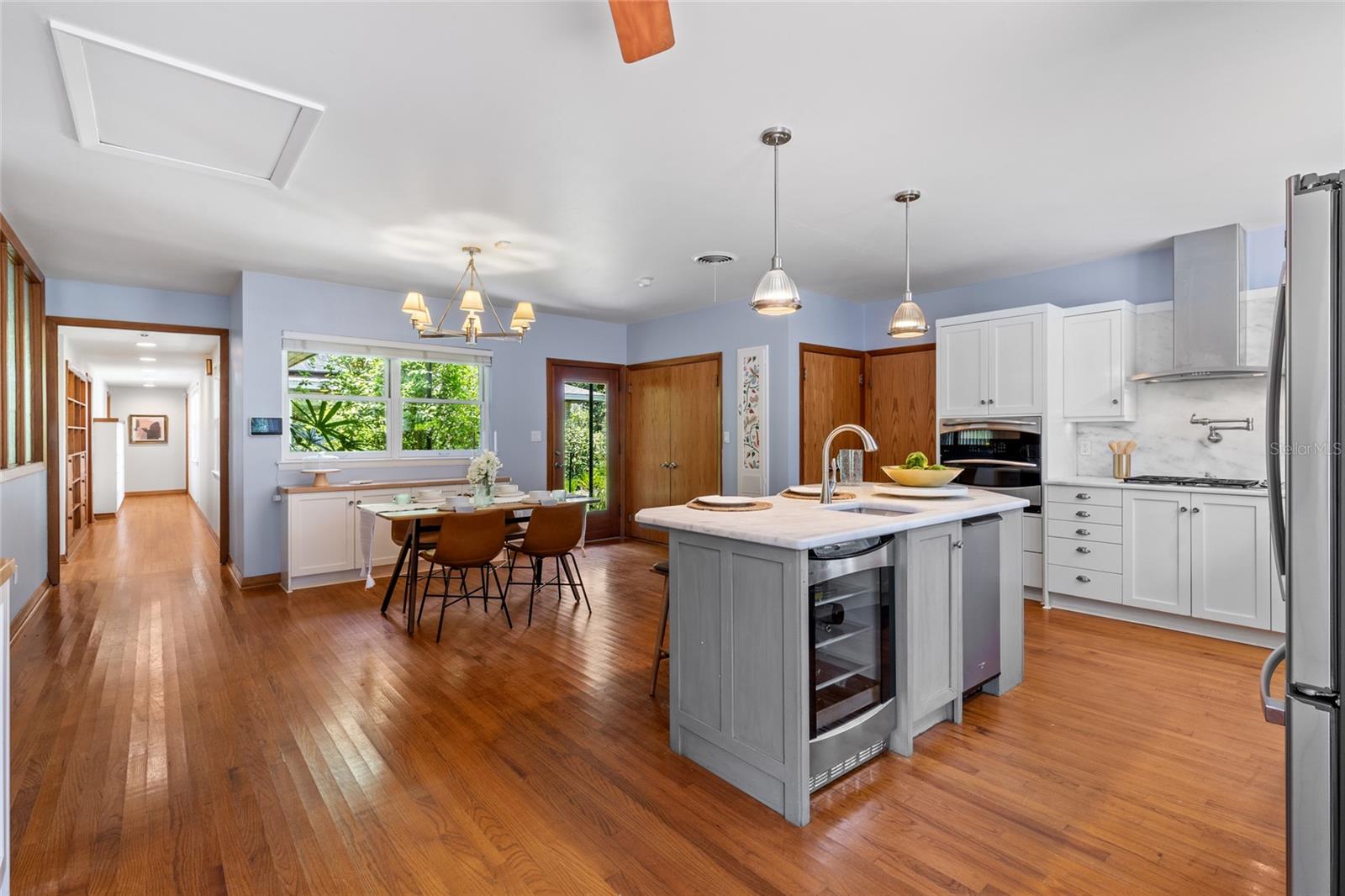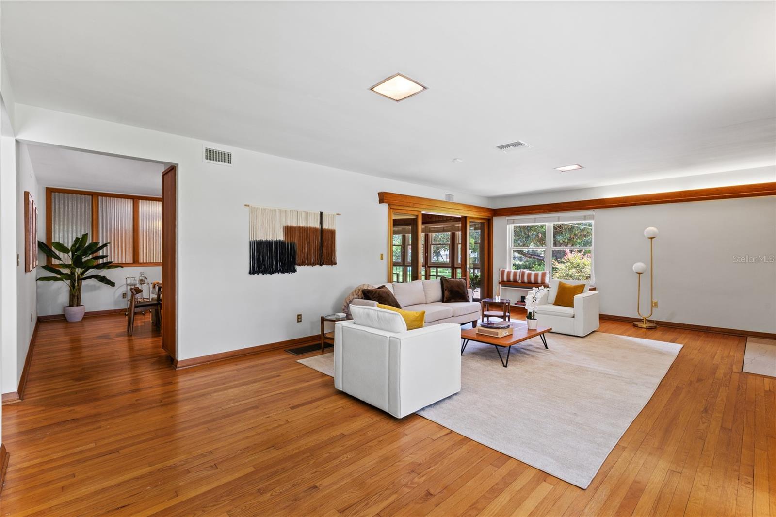 MAJOR PRICE IMPROVEMENT! Welcome to this rare mid-century ranch, a timeless architectural gem designed and built in 1952 by noted Gainesville architect Merle Haynes. Located just six blocks from the University of Florida and its renowned sports venues, this 2,900 sq ft home blends classic design with modern convenience, all set on a beautifully landscaped over half-acre lot. Lovingly cared for by only two owners and never rented, this home exudes warmth and craftsmanship throughout. Inside, you'll find heartwood oak and pine trim, custom built-in cabinets and bookcases, and hardwood floors flowing through the main living areas. The tile-floored bathrooms, wood-paneled study, and fireplace add to the home's rich, inviting character. The spacious, eat-in kitchen is perfect for both everyday living and entertaining, featuring high-end appliances including a Wolf gas cooktop, double oven, two refrigerators, an undercounter ice maker and beverage fridge, plus a dishwasher and washer/dryer. Step outside to a 1,600 sq ft brick patio professionally designed with lighting for evening entertaining, along with brick garden paths and a 3-car driveway by Landscapes Unlimited. The two-car garage offers built-in storage, and the rooftop solar electric system brings energy efficiency. Nature lovers will be enchanted by the park-like garden, featuring a camellia grove and many trees, including fig, olive, calamondin orange, magnolia, and live oaks. Layered throughout are palms, sagos, tea olives, bougainvillea, gardenias, azaleas, hydrangeas, crepe myrtles, and loropetalum hedges. A well and irrigation system support this thriving landscape year-round. With 3 bedrooms, generous closets, a formal dining room with built-in china cabinets, and a large living room with fireplace, this home offers space, character, and a location that’s hard to beat. Homes like this rarely come on the market—schedule your private showing today and experience the unique charm and history of this Gainesville classic.