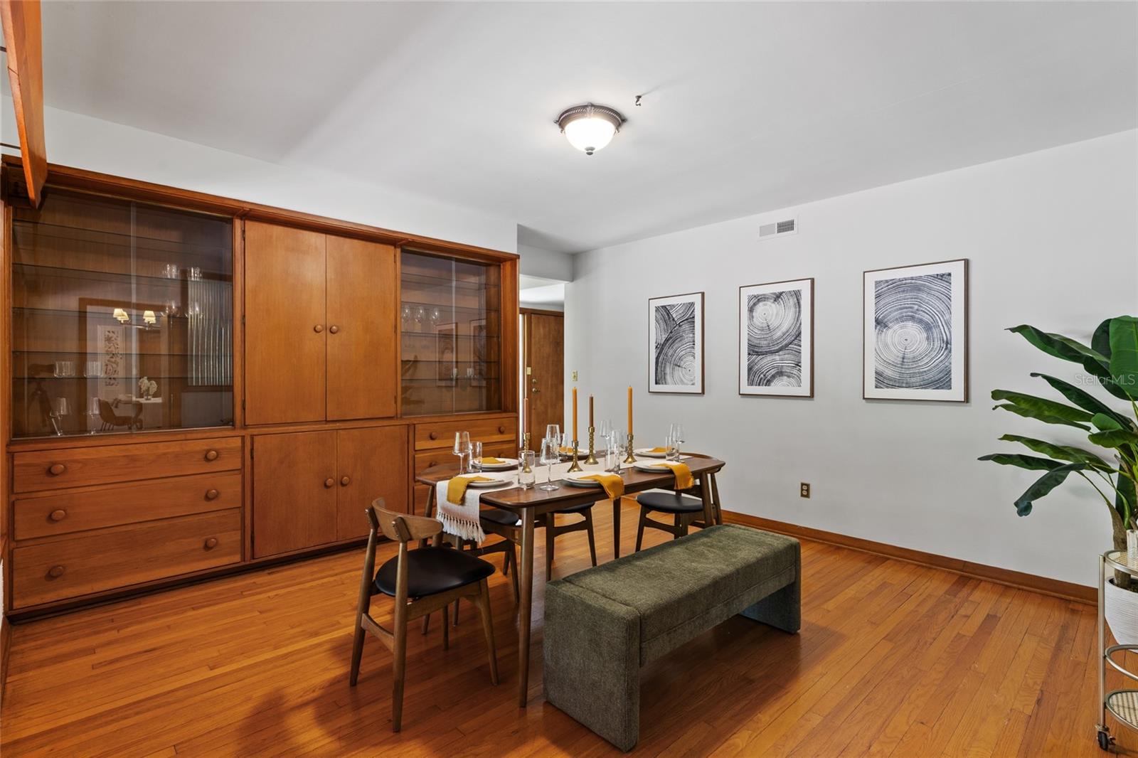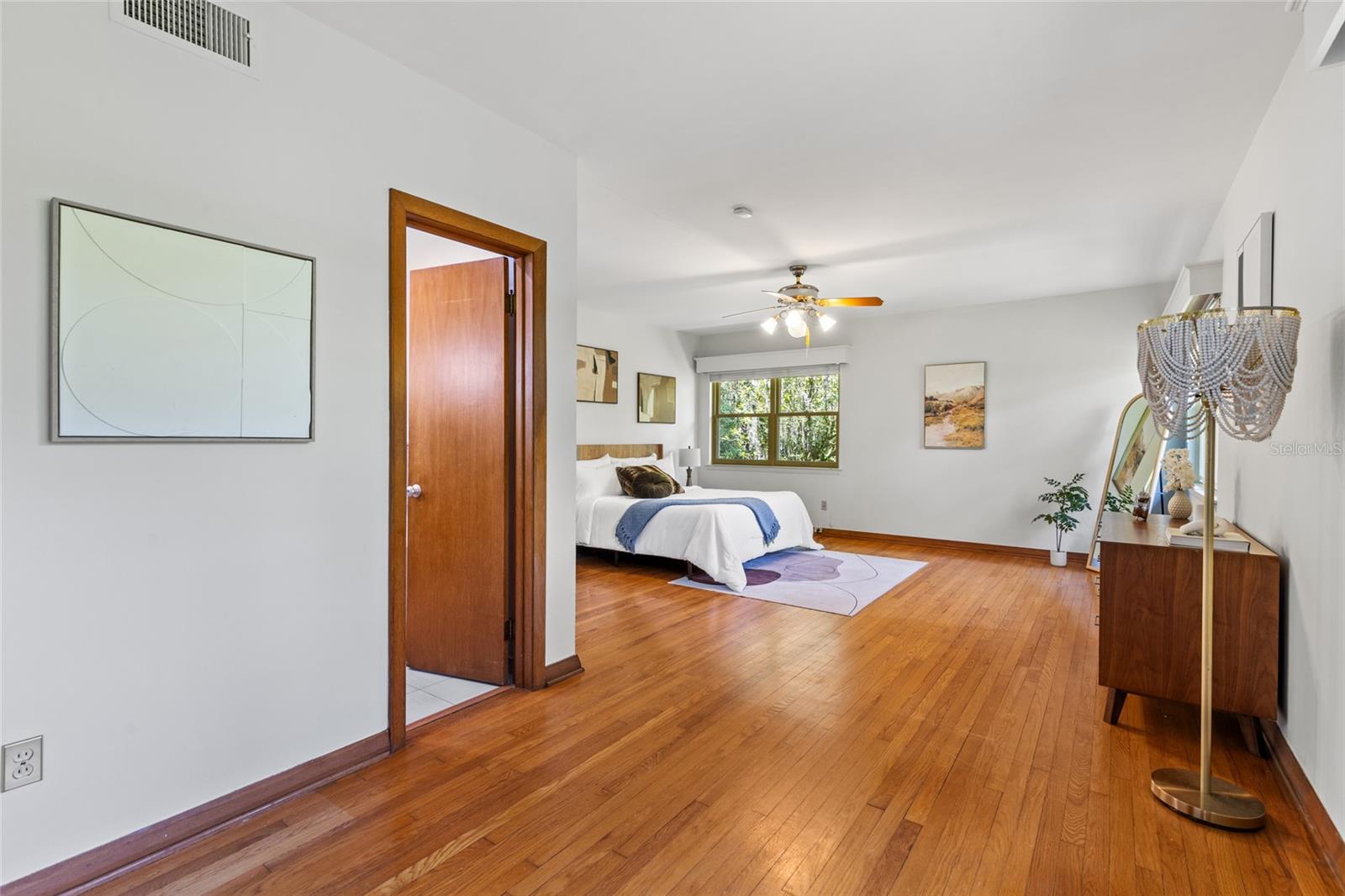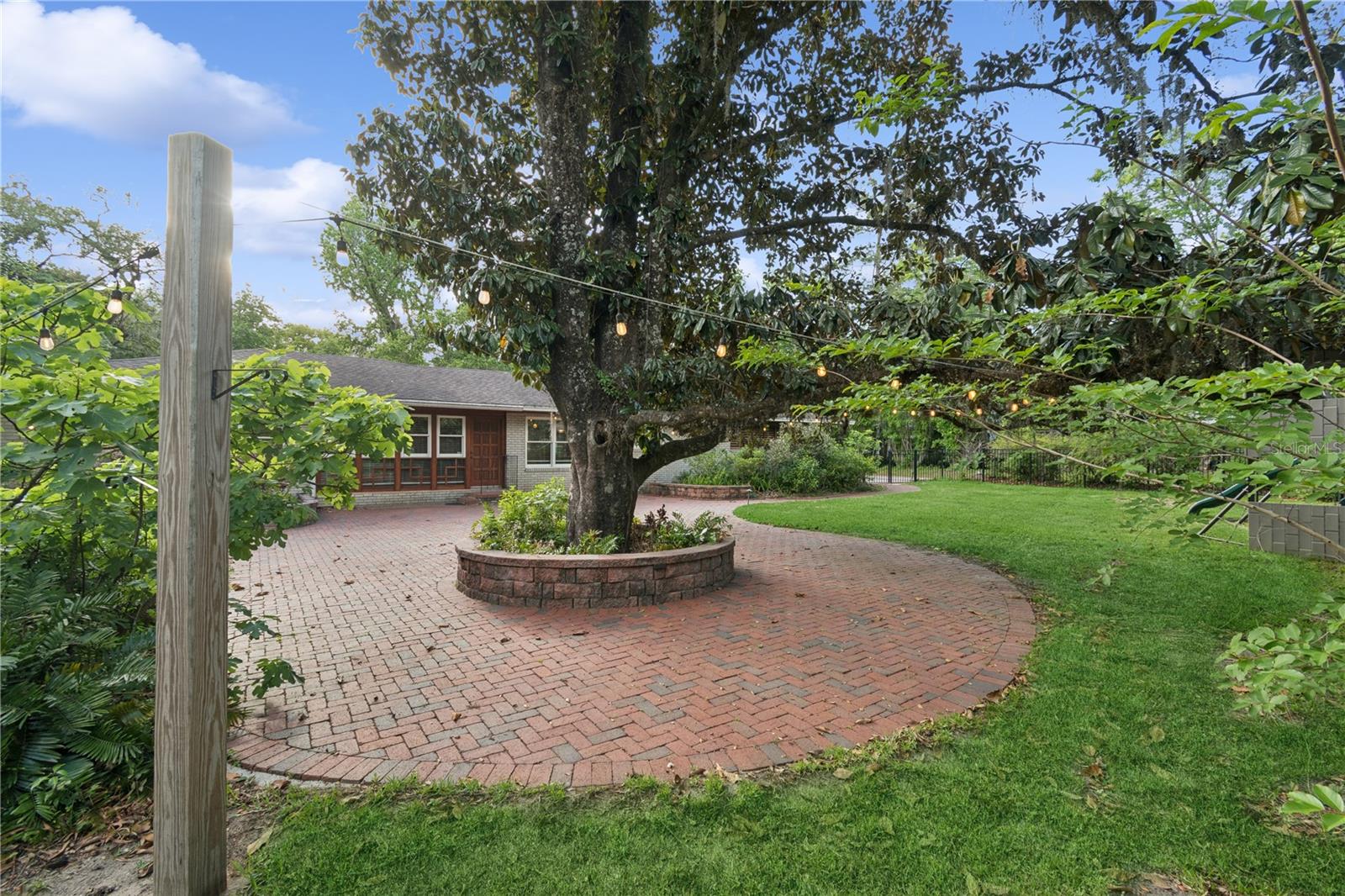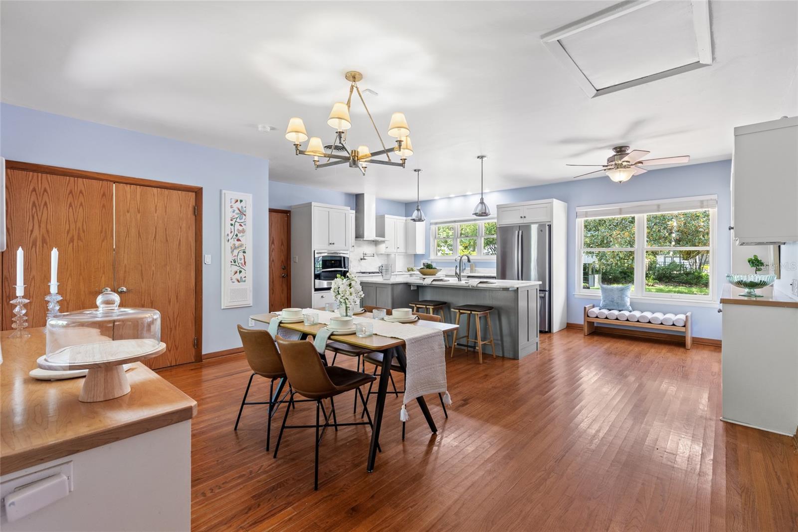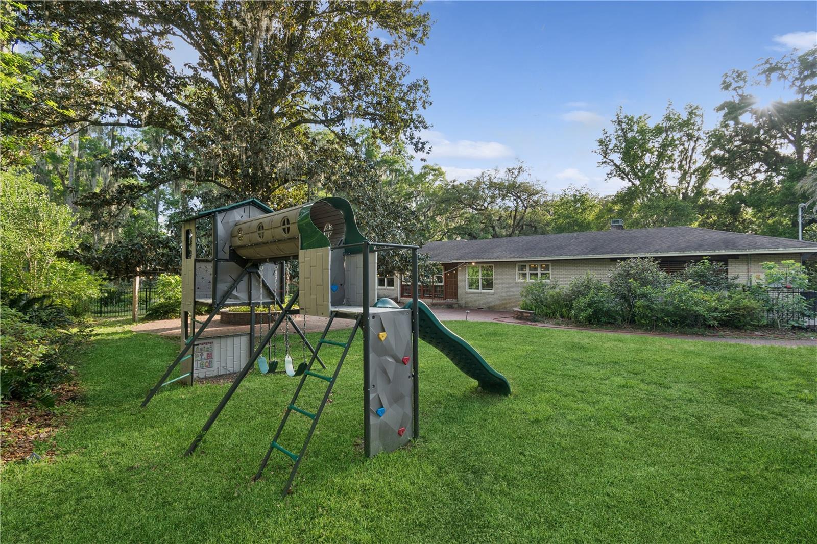 MAJOR PRICE IMPROVEMENT! Welcome to this rare mid-century ranch, a timeless architectural gem designed and built in 1952 by noted Gainesville architect Merle Haynes. Located just six blocks from the University of Florida and its renowned sports venues, this 2,900 sq ft home blends classic design with modern convenience, all set on a beautifully landscaped over half-acre lot. Lovingly cared for by only two owners and never rented, this home exudes warmth and craftsmanship throughout. Inside, you'll find heartwood oak and pine trim, custom built-in cabinets and bookcases, and hardwood floors flowing through the main living areas. The tile-floored bathrooms, wood-paneled study, and fireplace add to the home's rich, inviting character. The spacious, eat-in kitchen is perfect for both everyday living and entertaining, featuring high-end appliances including a Wolf gas cooktop, double oven, two refrigerators, an undercounter ice maker and beverage fridge, plus a dishwasher and washer/dryer. Step outside to a 1,600 sq ft brick patio professionally designed with lighting for evening entertaining, along with brick garden paths and a 3-car driveway by Landscapes Unlimited. The two-car garage offers built-in storage, and the rooftop solar electric system brings energy efficiency. Nature lovers will be enchanted by the park-like garden, featuring a camellia grove and many trees, including fig, olive, calamondin orange, magnolia, and live oaks. Layered throughout are palms, sagos, tea olives, bougainvillea, gardenias, azaleas, hydrangeas, crepe myrtles, and loropetalum hedges. A well and irrigation system support this thriving landscape year-round. With 3 bedrooms, generous closets, a formal dining room with built-in china cabinets, and a large living room with fireplace, this home offers space, character, and a location that’s hard to beat. Homes like this rarely come on the market—schedule your private showing today and experience the unique charm and history of this Gainesville classic.