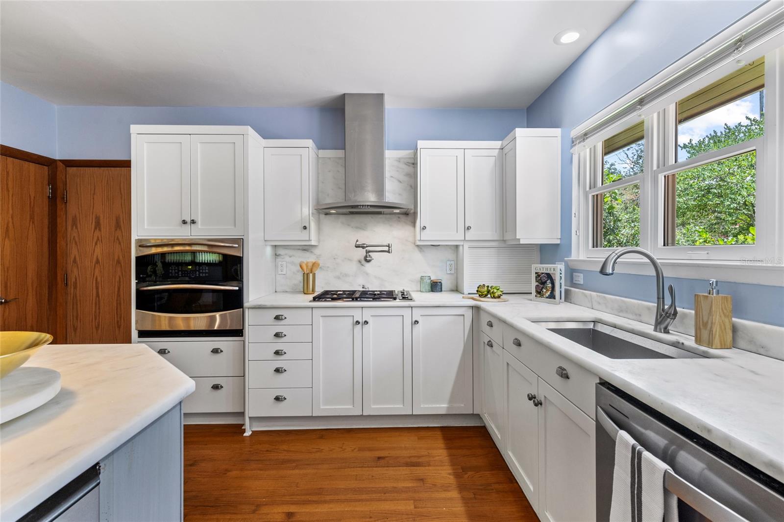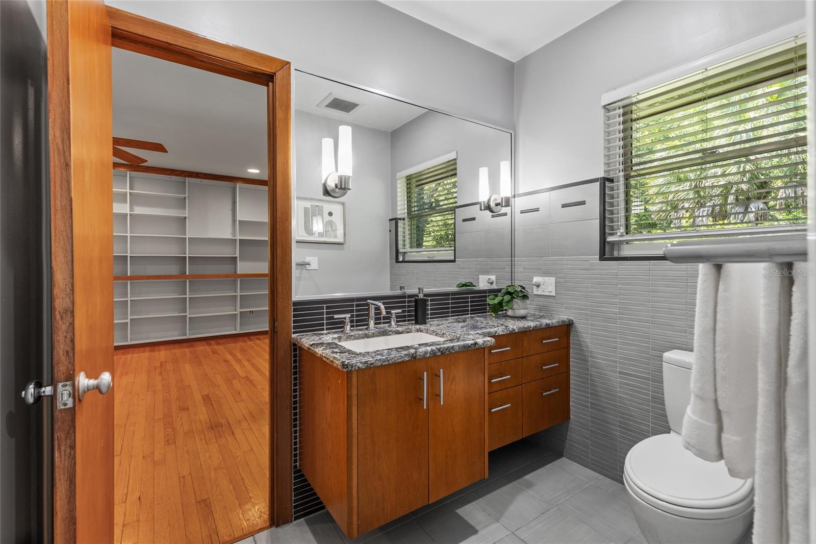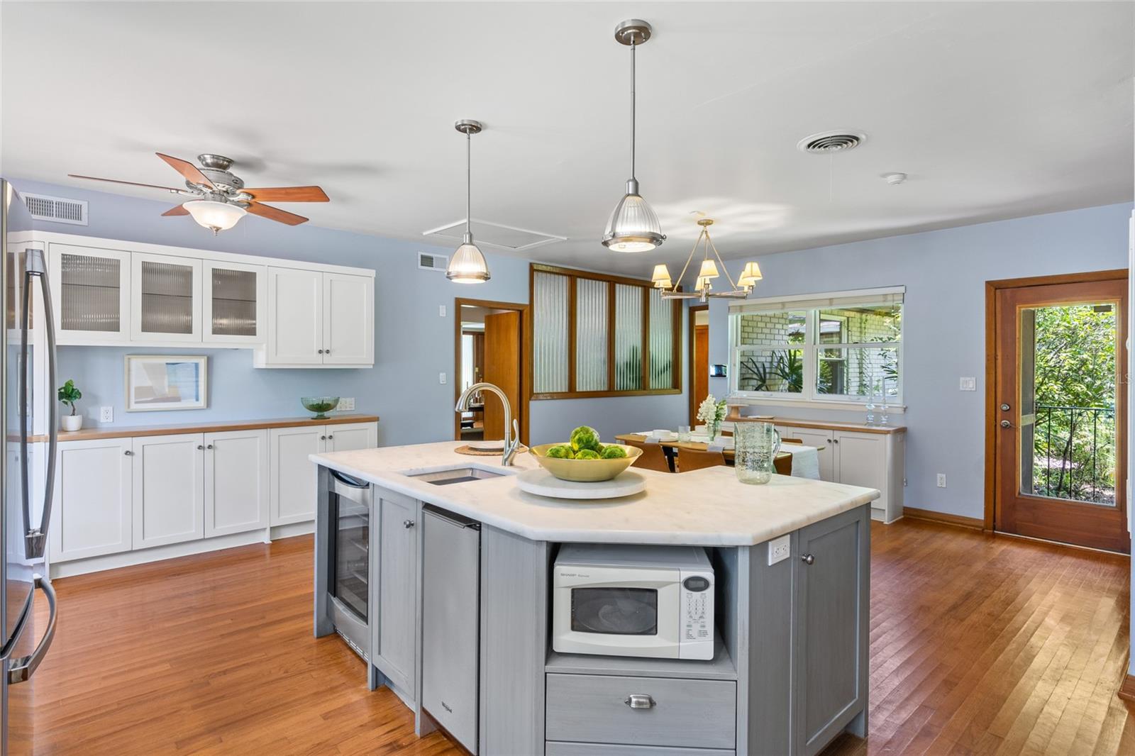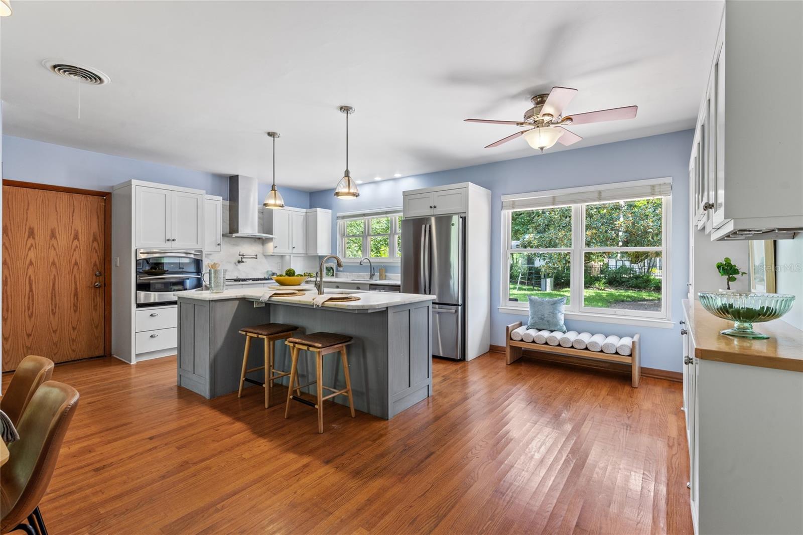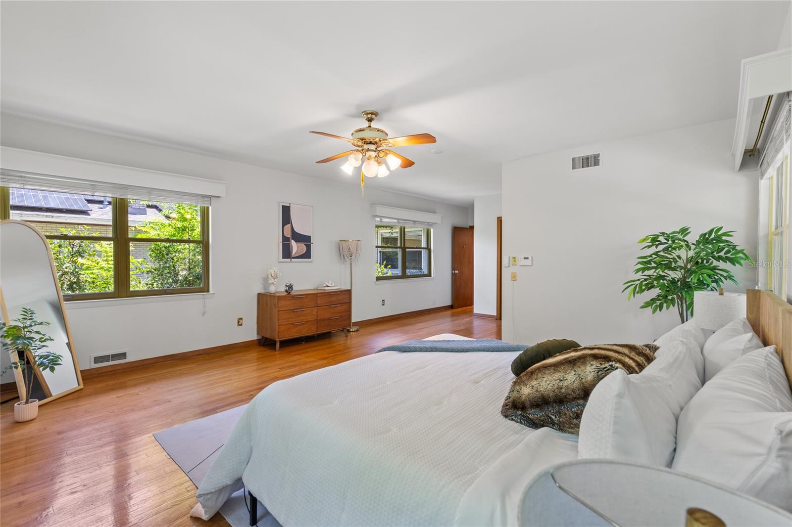 MAJOR PRICE IMPROVEMENT! Welcome to this rare mid-century ranch, a timeless architectural gem designed and built in 1952 by noted Gainesville architect Merle Haynes. Located just six blocks from the University of Florida and its renowned sports venues, this 2,900 sq ft home blends classic design with modern convenience, all set on a beautifully landscaped over half-acre lot. Lovingly cared for by only two owners and never rented, this home exudes warmth and craftsmanship throughout. Inside, you'll find heartwood oak and pine trim, custom built-in cabinets and bookcases, and hardwood floors flowing through the main living areas. The tile-floored bathrooms, wood-paneled study, and fireplace add to the home's rich, inviting character. The spacious, eat-in kitchen is perfect for both everyday living and entertaining, featuring high-end appliances including a Wolf gas cooktop, double oven, two refrigerators, an undercounter ice maker and beverage fridge, plus a dishwasher and washer/dryer. Step outside to a 1,600 sq ft brick patio professionally designed with lighting for evening entertaining, along with brick garden paths and a 3-car driveway by Landscapes Unlimited. The two-car garage offers built-in storage, and the rooftop solar electric system brings energy efficiency. Nature lovers will be enchanted by the park-like garden, featuring a camellia grove and many trees, including fig, olive, calamondin orange, magnolia, and live oaks. Layered throughout are palms, sagos, tea olives, bougainvillea, gardenias, azaleas, hydrangeas, crepe myrtles, and loropetalum hedges. A well and irrigation system support this thriving landscape year-round. With 3 bedrooms, generous closets, a formal dining room with built-in china cabinets, and a large living room with fireplace, this home offers space, character, and a location that’s hard to beat. Homes like this rarely come on the market—schedule your private showing today and experience the unique charm and history of this Gainesville classic.