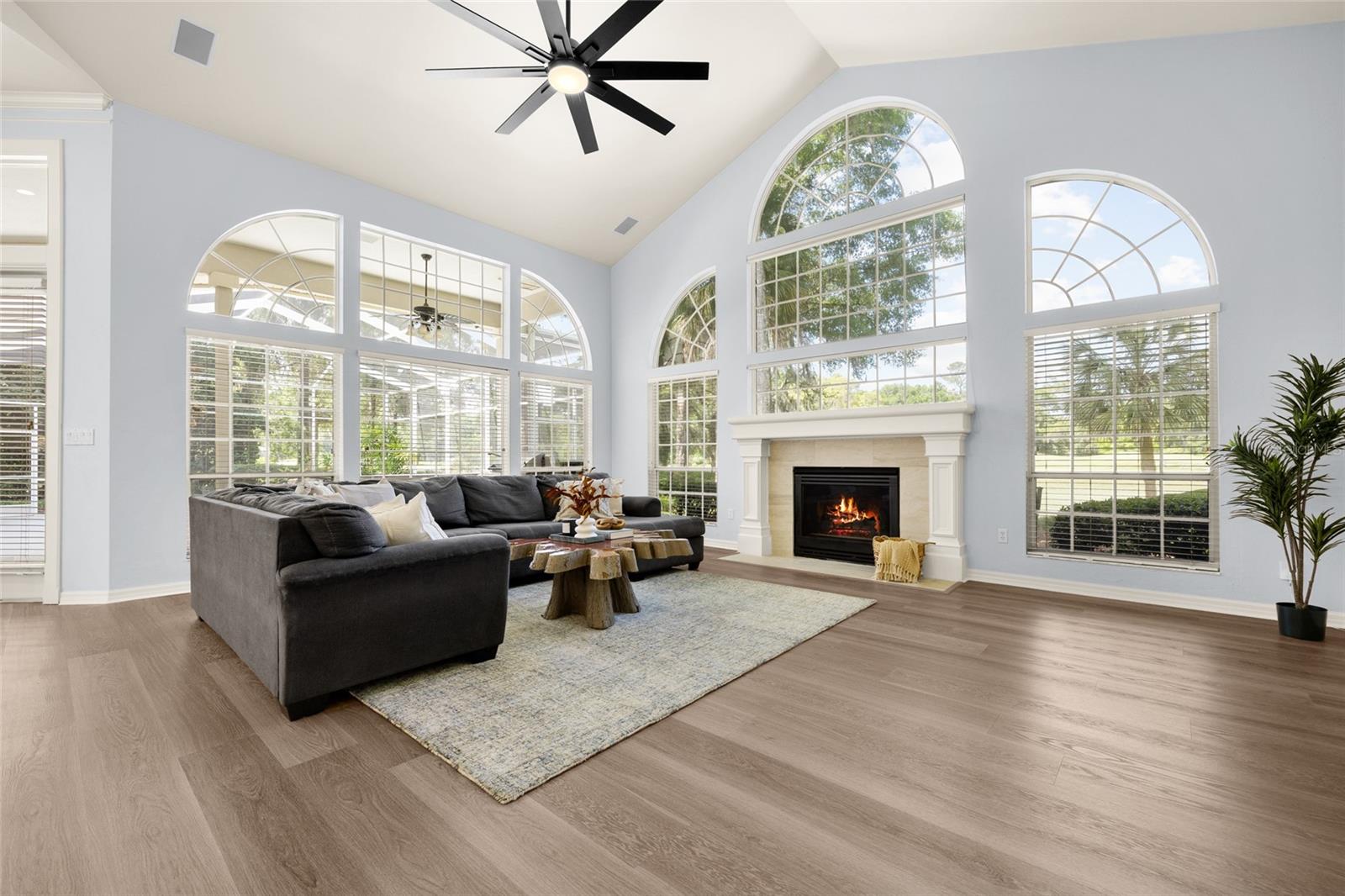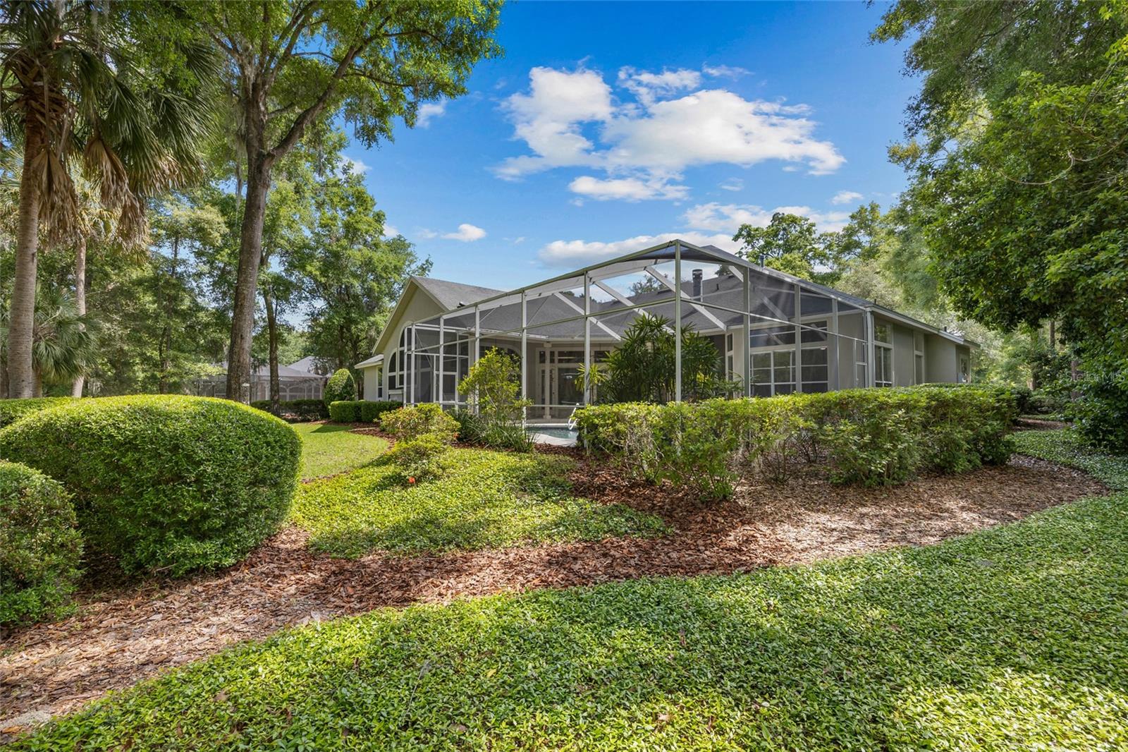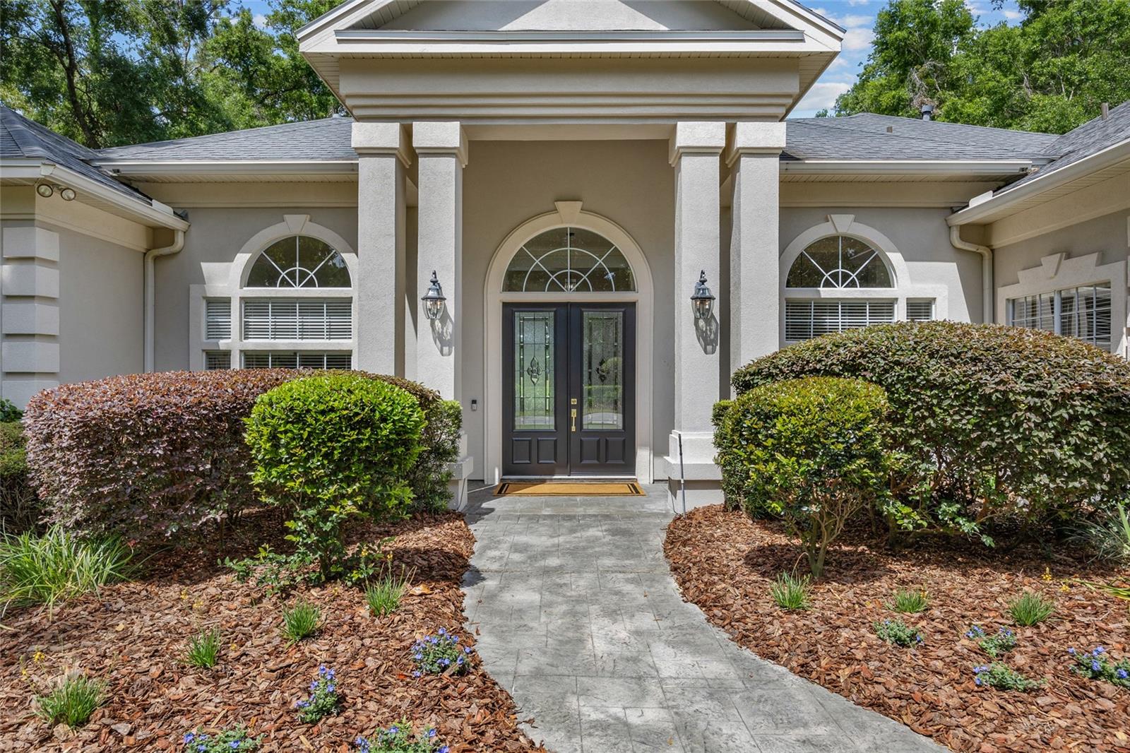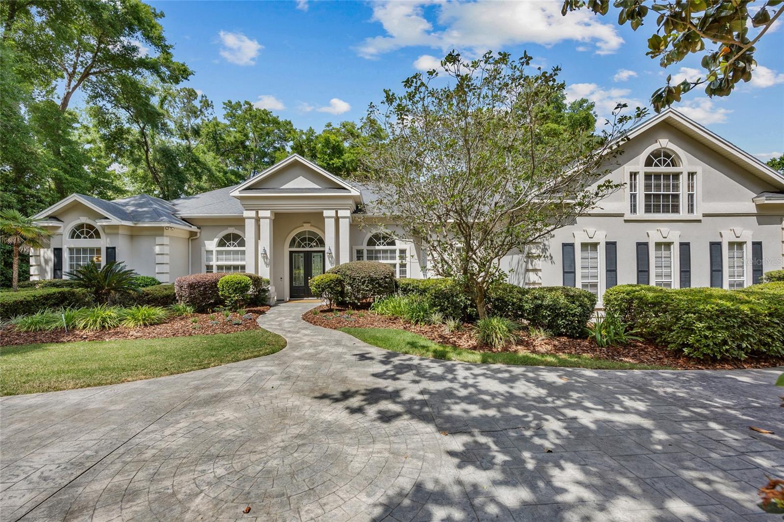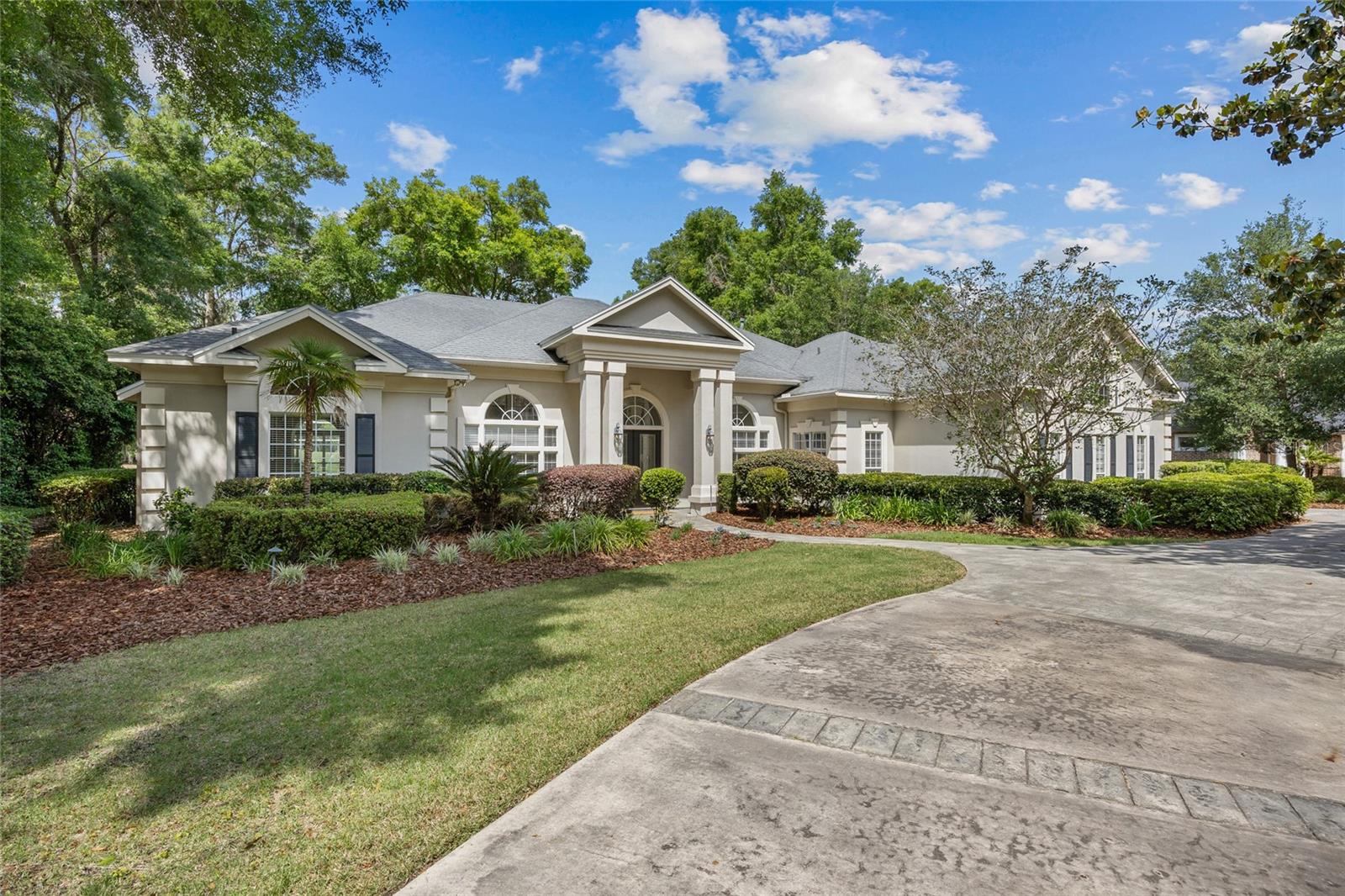 Welcome home to your beautifully updated Haile Plantation India Station estate set on one of the most desirable golf course lots in Hawkstone Country Club, with sweeping views of the signature 10th hole. This stately home offers over 4,900 square feet of thoughtfully designed living space, blending refined finishes with comfort and functionality. As you arrive, a circular driveway framed by mature landscaping creates a gracious first impression, while the oversized 3-car garage with a built-in workshop adds both convenience and storage. Step inside to soaring ceilings, abundant natural light, and brand-new luxury vinyl plank flooring that flows throughout the main level. Off the entry, you'll find a grand home office with French doors, a formal dining room, and a secondary living area—perfect for entertaining or creating a quiet retreat. The home features a 4-way split floor plan, ensuring privacy and space for everyone. The heart of the home is the updated kitchen, where new quartz counters, a designer backsplash, and all-new stainless steel appliances make a bold, modern statement. The kitchen opens to the family room and casual dining area, all of which are flooded with natural light and framed by stunning panoramic views of the golf course. Whether you're starting your morning with a cup of coffee or winding down in the evening, the view from this space is simply unmatched. Step outside to your private outdoor oasis—featuring a resort-style pool with waterfall, a granite summer kitchen, a cozy outdoor fireplace, and expansive covered patio space—all with sweeping views of the fairway. With six total bedrooms and 4.5 baths, the home offers incredible flexibility. Two of the six bedrooms are currently used as bonus spaces: one on the main level, ideal as a bonus living space, study retreat or playroom, and one upstairs, outfitted as a home theater with projection screen. The spacious primary suite is tucked away on the main floor and offers tranquil golf course views, a luxurious en suite bath, and dual walk-in closets. Beyond the home, residents enjoy all the perks of Haile Plantation—one of Gainesville’s most sought-after communities. Stroll or bike along miles of shaded walking trails that wind through lush surroundings, or head to the charming Haile Village Center for coffee, dining, boutiques, and community events. With easy access to UF Health/Shands, HCA Florida North Florida Hospital, Butler Plaza, Celebration Pointe, and I-75, the location offers unmatched convenience while preserving a peaceful, neighborhood feel. This exceptional property offers more than a home—it offers a lifestyle. Schedule your private tour today.
