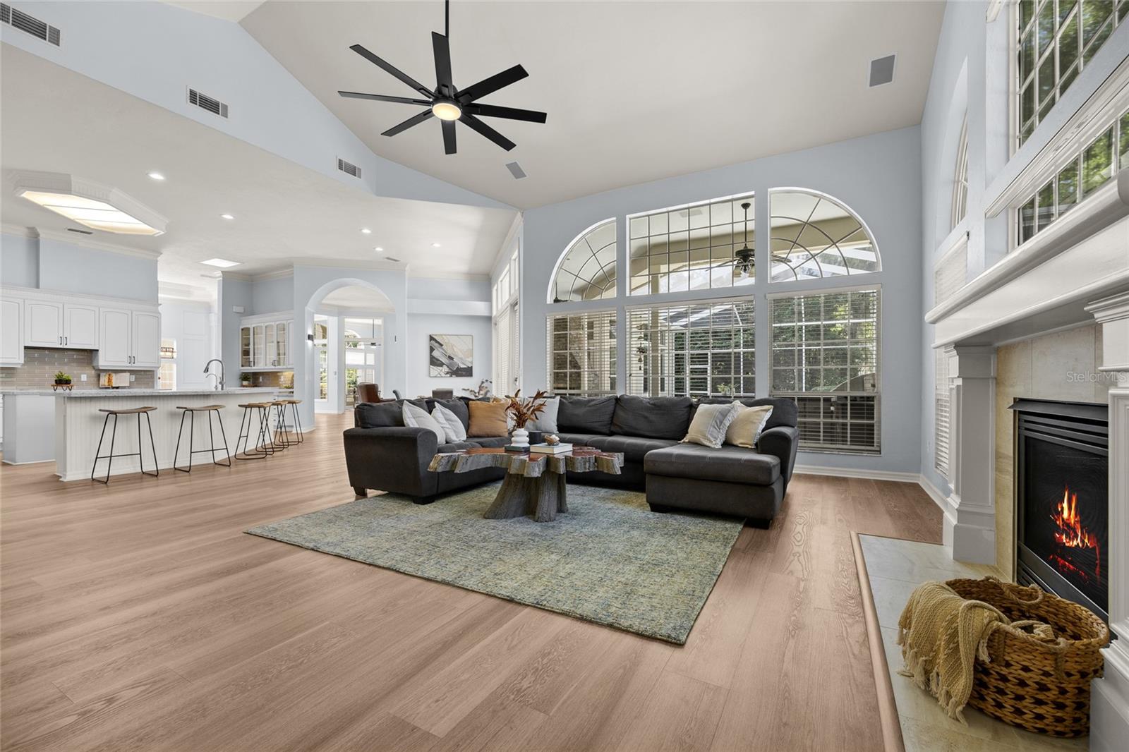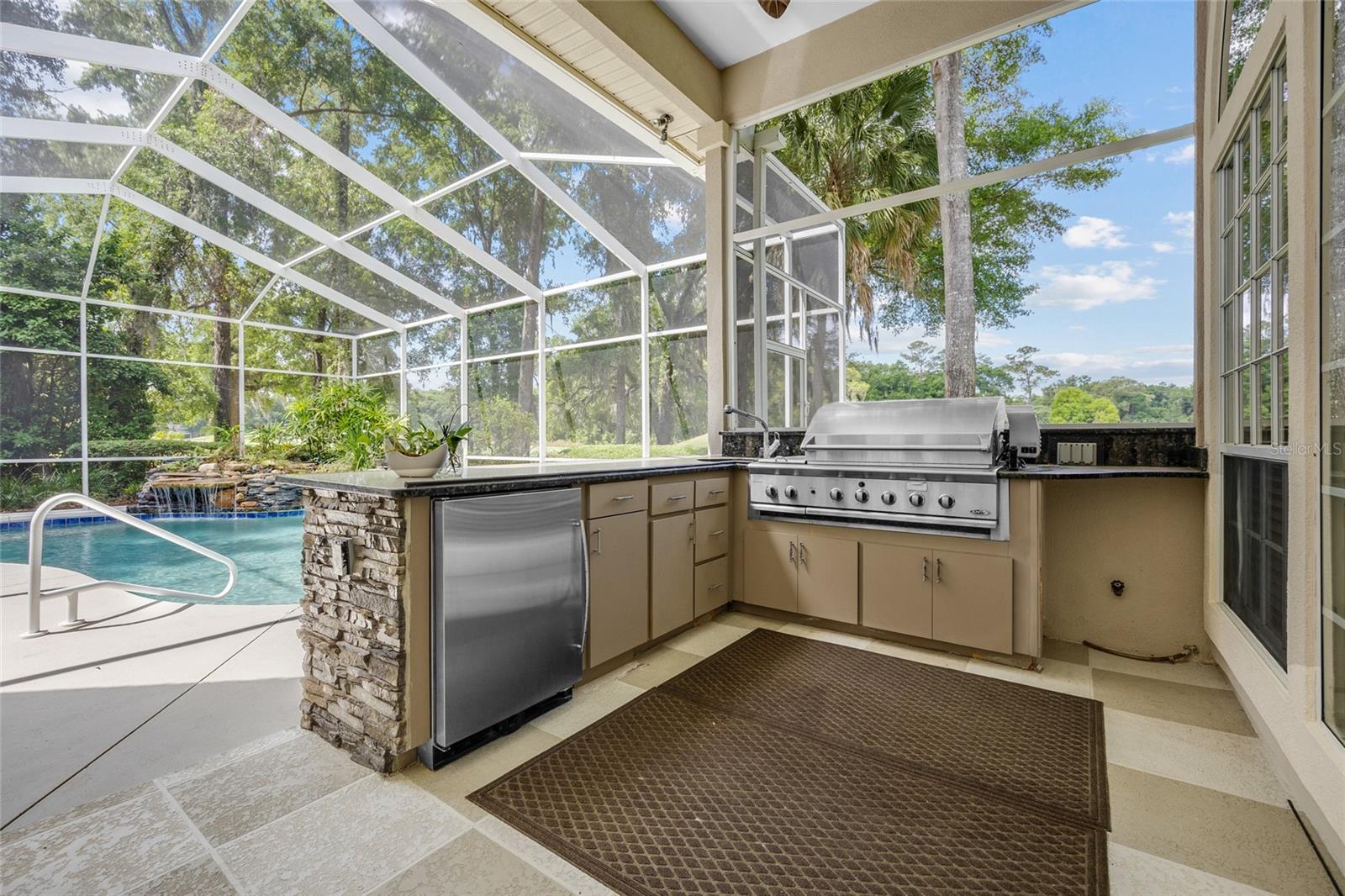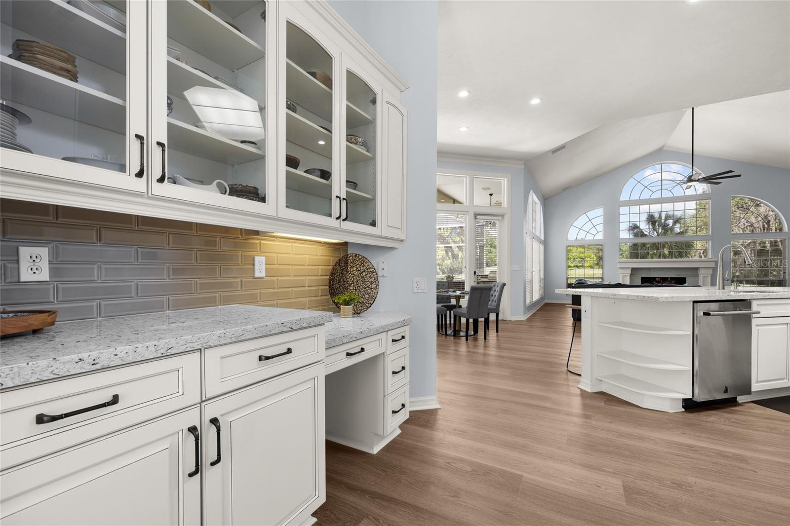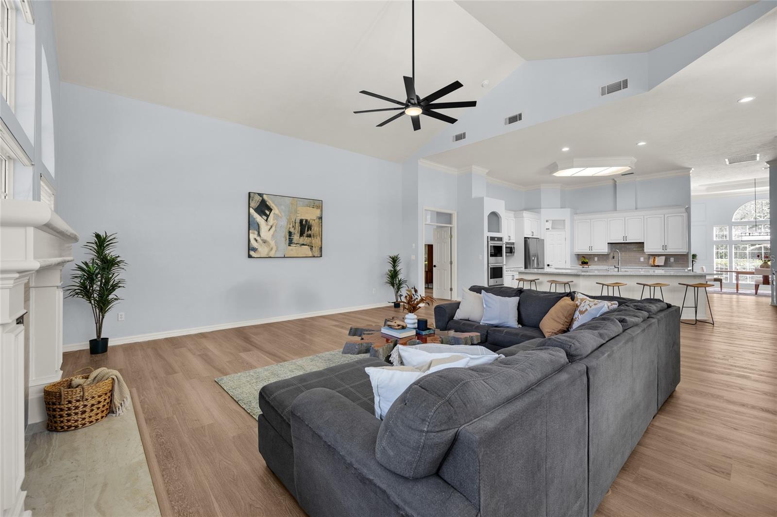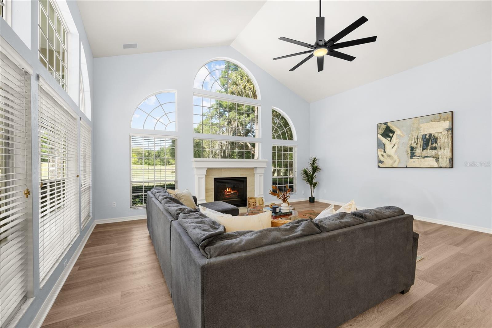 Welcome home to your beautifully updated Haile Plantation India Station estate set on one of the most desirable golf course lots in Hawkstone Country Club, with sweeping views of the signature 10th hole. This stately home offers over 4,900 square feet of thoughtfully designed living space, blending refined finishes with comfort and functionality. As you arrive, a circular driveway framed by mature landscaping creates a gracious first impression, while the oversized 3-car garage with a built-in workshop adds both convenience and storage. Step inside to soaring ceilings, abundant natural light, and brand-new luxury vinyl plank flooring that flows throughout the main level. Off the entry, you'll find a grand home office with French doors, a formal dining room, and a secondary living area—perfect for entertaining or creating a quiet retreat. The home features a 4-way split floor plan, ensuring privacy and space for everyone. The heart of the home is the updated kitchen, where new quartz counters, a designer backsplash, and all-new stainless steel appliances make a bold, modern statement. The kitchen opens to the family room and casual dining area, all of which are flooded with natural light and framed by stunning panoramic views of the golf course. Whether you're starting your morning with a cup of coffee or winding down in the evening, the view from this space is simply unmatched. Step outside to your private outdoor oasis—featuring a resort-style pool with waterfall, a granite summer kitchen, a cozy outdoor fireplace, and expansive covered patio space—all with sweeping views of the fairway. With six total bedrooms and 4.5 baths, the home offers incredible flexibility. Two of the six bedrooms are currently used as bonus spaces: one on the main level, ideal as a bonus living space, study retreat or playroom, and one upstairs, outfitted as a home theater with projection screen. The spacious primary suite is tucked away on the main floor and offers tranquil golf course views, a luxurious en suite bath, and dual walk-in closets. Beyond the home, residents enjoy all the perks of Haile Plantation—one of Gainesville’s most sought-after communities. Stroll or bike along miles of shaded walking trails that wind through lush surroundings, or head to the charming Haile Village Center for coffee, dining, boutiques, and community events. With easy access to UF Health/Shands, HCA Florida North Florida Hospital, Butler Plaza, Celebration Pointe, and I-75, the location offers unmatched convenience while preserving a peaceful, neighborhood feel. This exceptional property offers more than a home—it offers a lifestyle. Schedule your private tour today.