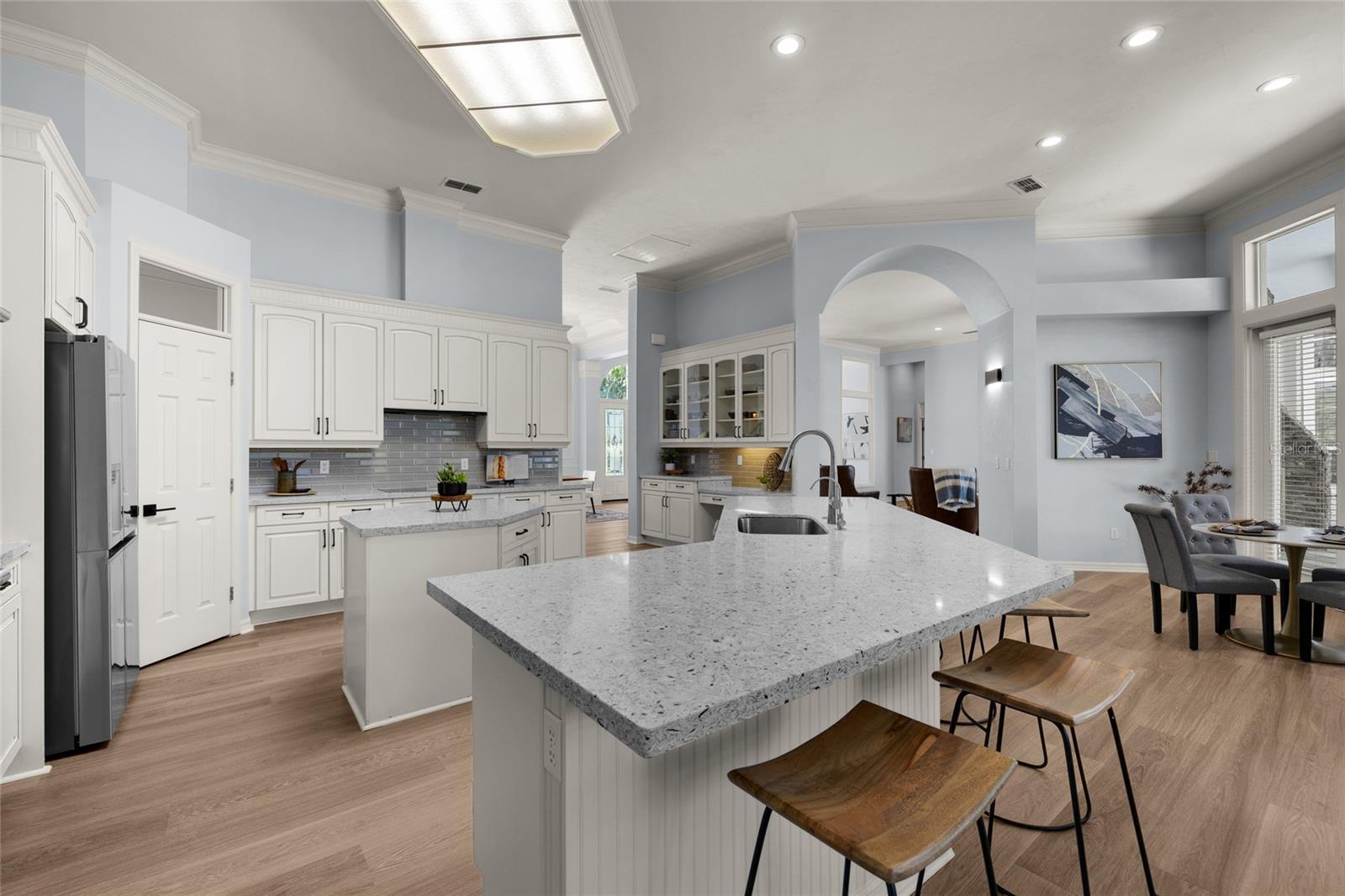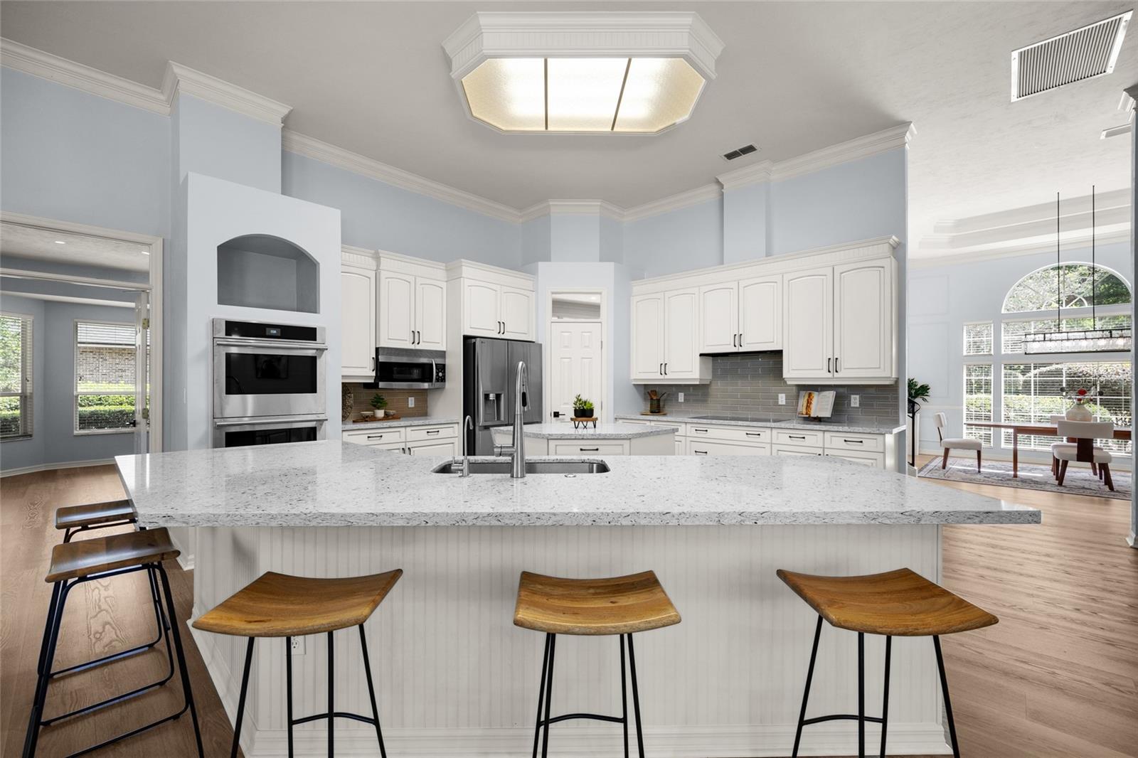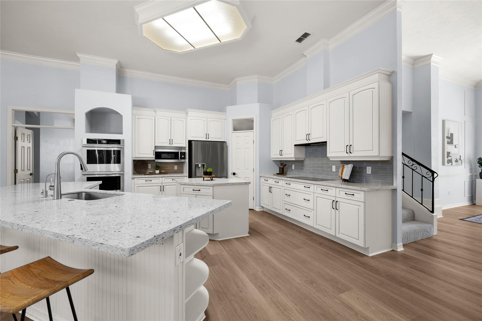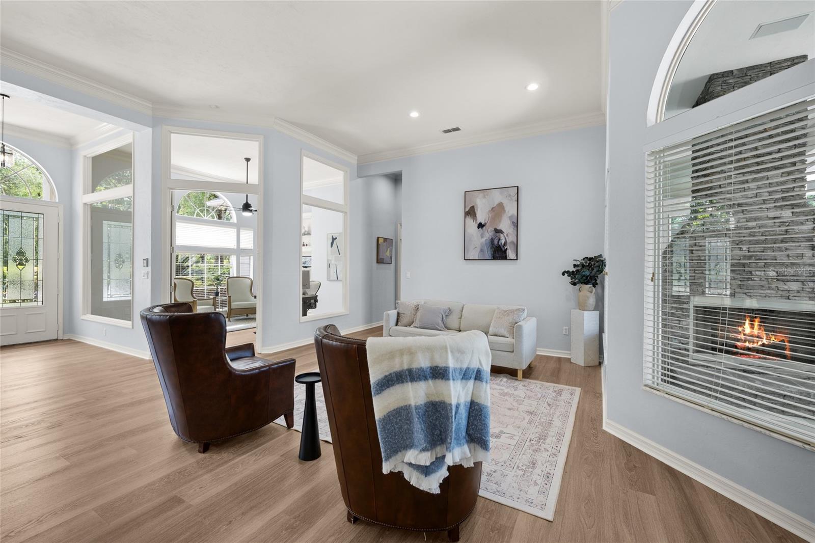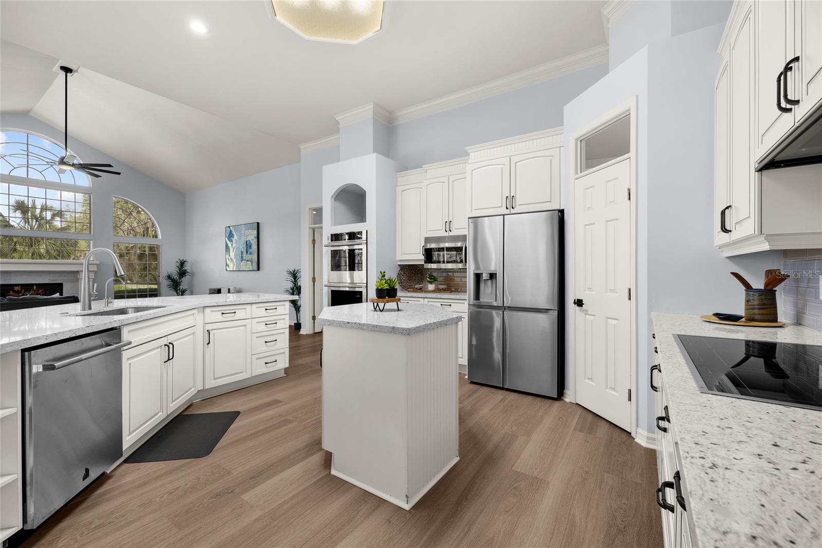 Welcome home to your beautifully updated Haile Plantation India Station estate set on one of the most desirable golf course lots in Hawkstone Country Club, with sweeping views of the signature 10th hole. This stately home offers over 4,900 square feet of thoughtfully designed living space, blending refined finishes with comfort and functionality. As you arrive, a circular driveway framed by mature landscaping creates a gracious first impression, while the oversized 3-car garage with a built-in workshop adds both convenience and storage. Step inside to soaring ceilings, abundant natural light, and brand-new luxury vinyl plank flooring that flows throughout the main level. Off the entry, you'll find a grand home office with French doors, a formal dining room, and a secondary living area—perfect for entertaining or creating a quiet retreat. The home features a 4-way split floor plan, ensuring privacy and space for everyone. The heart of the home is the updated kitchen, where new quartz counters, a designer backsplash, and all-new stainless steel appliances make a bold, modern statement. The kitchen opens to the family room and casual dining area, all of which are flooded with natural light and framed by stunning panoramic views of the golf course. Whether you're starting your morning with a cup of coffee or winding down in the evening, the view from this space is simply unmatched. Step outside to your private outdoor oasis—featuring a resort-style pool with waterfall, a granite summer kitchen, a cozy outdoor fireplace, and expansive covered patio space—all with sweeping views of the fairway. With six total bedrooms and 4.5 baths, the home offers incredible flexibility. Two of the six bedrooms are currently used as bonus spaces: one on the main level, ideal as a bonus living space, study retreat or playroom, and one upstairs, outfitted as a home theater with projection screen. The spacious primary suite is tucked away on the main floor and offers tranquil golf course views, a luxurious en suite bath, and dual walk-in closets. Beyond the home, residents enjoy all the perks of Haile Plantation—one of Gainesville’s most sought-after communities. Stroll or bike along miles of shaded walking trails that wind through lush surroundings, or head to the charming Haile Village Center for coffee, dining, boutiques, and community events. With easy access to UF Health/Shands, HCA Florida North Florida Hospital, Butler Plaza, Celebration Pointe, and I-75, the location offers unmatched convenience while preserving a peaceful, neighborhood feel. This exceptional property offers more than a home—it offers a lifestyle. Schedule your private tour today.