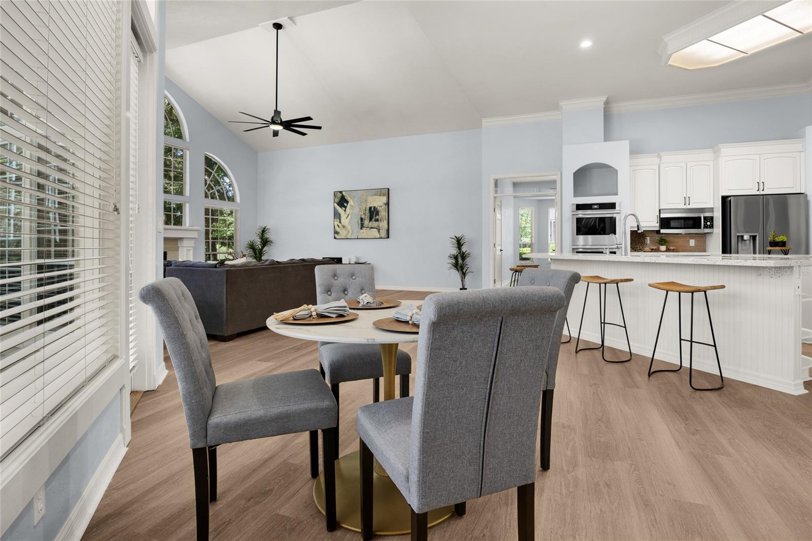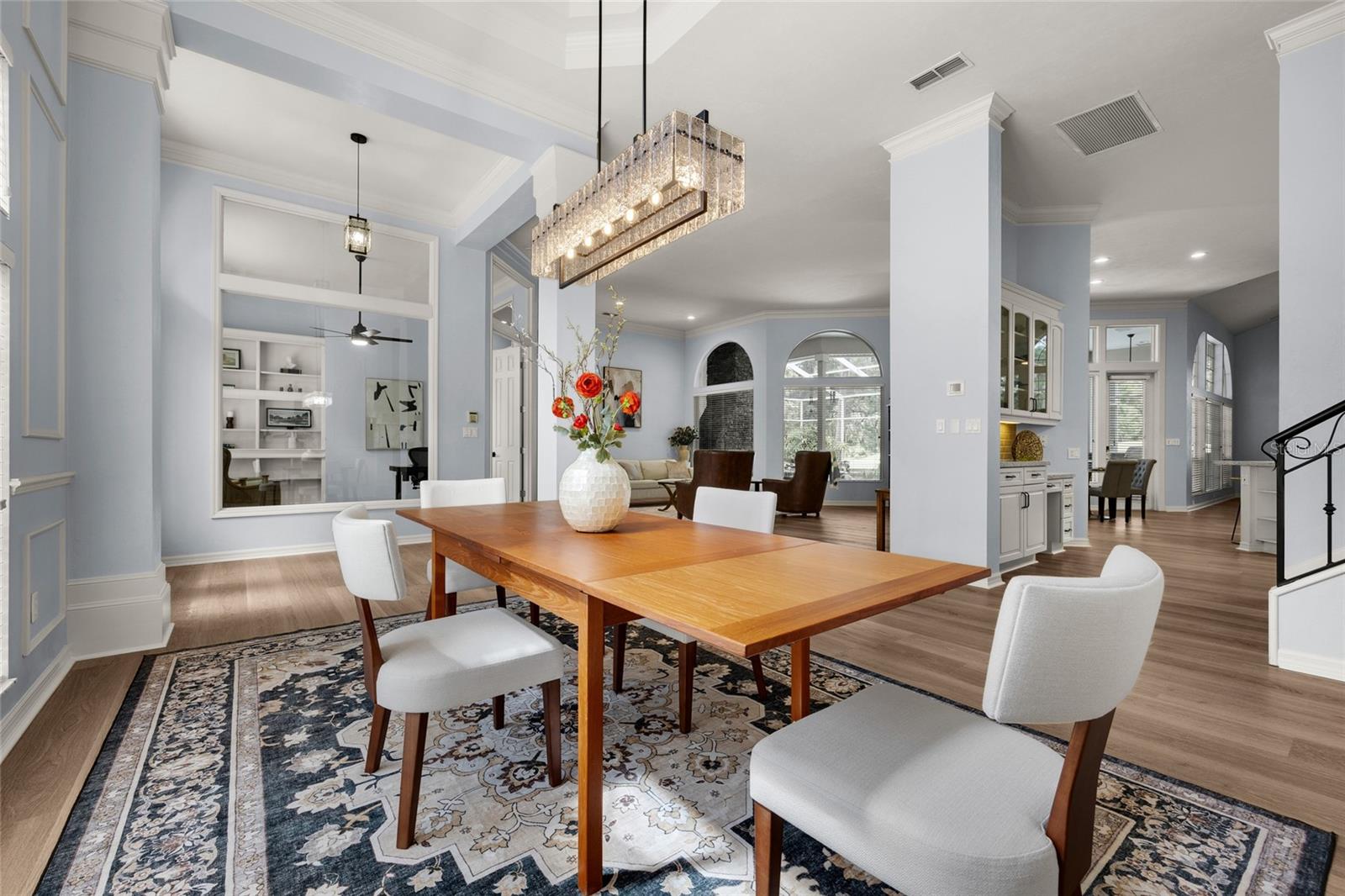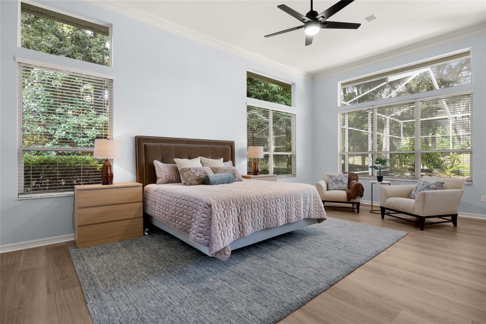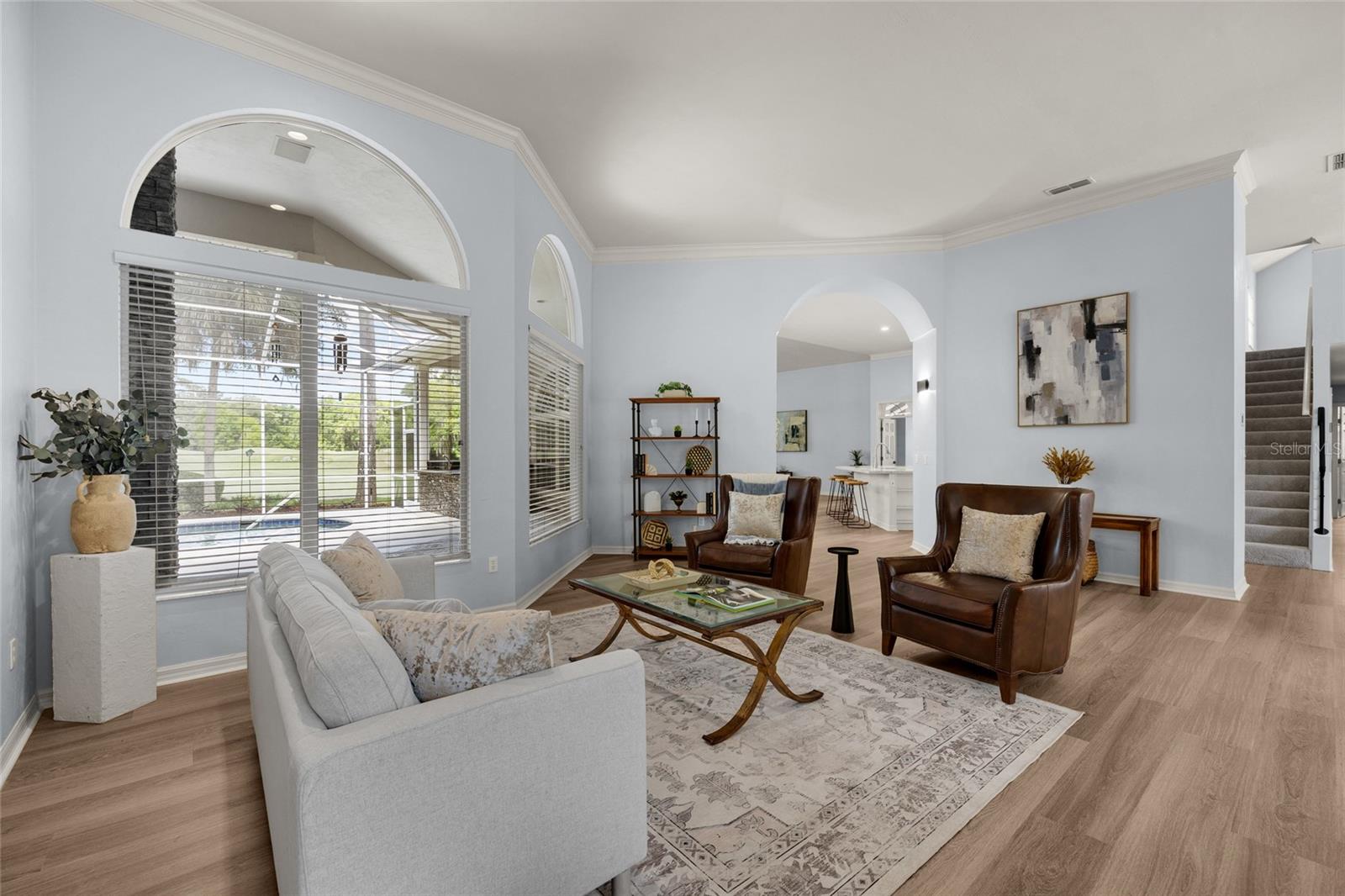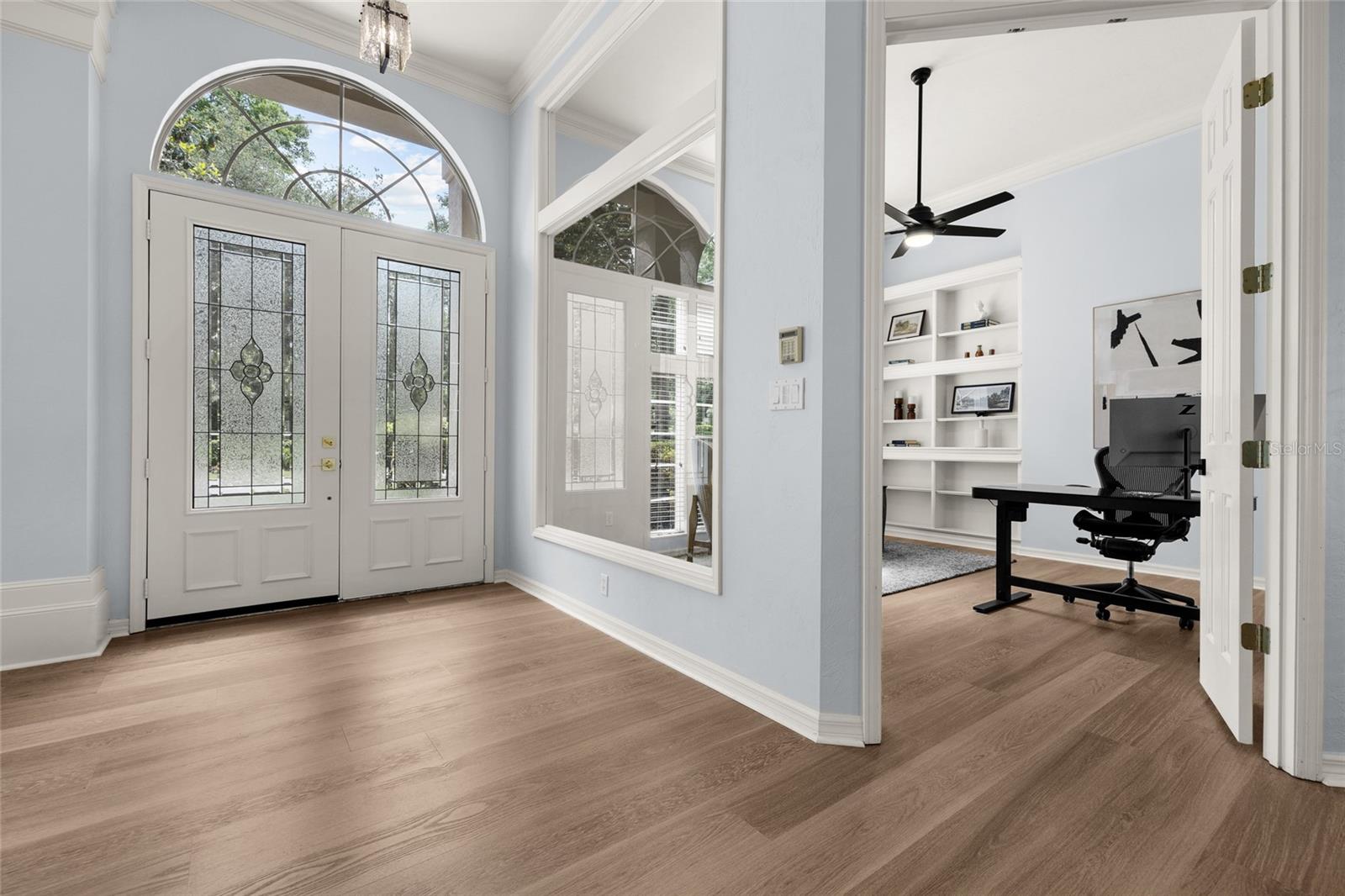 Welcome home to your beautifully updated Haile Plantation India Station estate set on one of the most desirable golf course lots in Hawkstone Country Club, with sweeping views of the signature 10th hole. This stately home offers over 4,900 square feet of thoughtfully designed living space, blending refined finishes with comfort and functionality. As you arrive, a circular driveway framed by mature landscaping creates a gracious first impression, while the oversized 3-car garage with a built-in workshop adds both convenience and storage. Step inside to soaring ceilings, abundant natural light, and brand-new luxury vinyl plank flooring that flows throughout the main level. Off the entry, you'll find a grand home office with French doors, a formal dining room, and a secondary living area—perfect for entertaining or creating a quiet retreat. The home features a 4-way split floor plan, ensuring privacy and space for everyone. The heart of the home is the updated kitchen, where new quartz counters, a designer backsplash, and all-new stainless steel appliances make a bold, modern statement. The kitchen opens to the family room and casual dining area, all of which are flooded with natural light and framed by stunning panoramic views of the golf course. Whether you're starting your morning with a cup of coffee or winding down in the evening, the view from this space is simply unmatched. Step outside to your private outdoor oasis—featuring a resort-style pool with waterfall, a granite summer kitchen, a cozy outdoor fireplace, and expansive covered patio space—all with sweeping views of the fairway. With six total bedrooms and 4.5 baths, the home offers incredible flexibility. Two of the six bedrooms are currently used as bonus spaces: one on the main level, ideal as a bonus living space, study retreat or playroom, and one upstairs, outfitted as a home theater with projection screen. The spacious primary suite is tucked away on the main floor and offers tranquil golf course views, a luxurious en suite bath, and dual walk-in closets. Beyond the home, residents enjoy all the perks of Haile Plantation—one of Gainesville’s most sought-after communities. Stroll or bike along miles of shaded walking trails that wind through lush surroundings, or head to the charming Haile Village Center for coffee, dining, boutiques, and community events. With easy access to UF Health/Shands, HCA Florida North Florida Hospital, Butler Plaza, Celebration Pointe, and I-75, the location offers unmatched convenience while preserving a peaceful, neighborhood feel. This exceptional property offers more than a home—it offers a lifestyle. Schedule your private tour today.