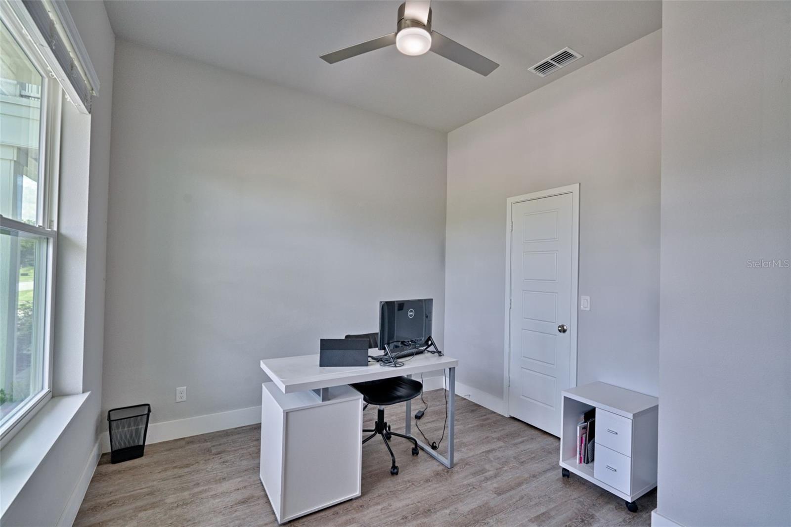 One or more photo(s) has been virtually staged. Welcome to Grand Preserve at Kanapaha. This 4-bedroom, 2.5-bath home offers 2,077 square feet of comfortable living. Built with energy efficiency in mind, it includes spray foam attic insulation, a tankless gas hot water heater and insulated low-e vinyl windows. As you enter the home, a bedroom to the left offers flexibility as a home office or guest room (large walk in closet) The great room has 11-foot tray ceilings. The kitchen has stainless steel appliances, a large walk-in pantry and an island with table-height seating. Just off the dining area, pocket glass doors open to a screened porch with access to your fenced yard. LVP flooring runs throughout the home. A half bath, laundry room with storage, utility sink, and garage access are on the main level. The spacious primary suite is also downstairs, featuring a large walk-in closet and an en suite bath with dual sinks, walk-in shower and private water closet. Upstairs are two additional bedrooms, a full bath and an open loft area—ideal for a second living space. This smart home offers convenience with app-and voice-controlled lighting, thermostat, door access, and alarm systems on both floors. The two-car garage is located at the back of the home, with guest parking nearby. The HOA covers front lawn maintenance and includes high-speed fiber internet, full cable with DVR, and more. Neighborhood amenities include a clubhouse, pool, fitness center, playground, and walking trails—all powered by Clay Electric. Enjoy the convenience of being close to Publix, Butler Plaza, Celebration Point, UF Health and University of Florida.
