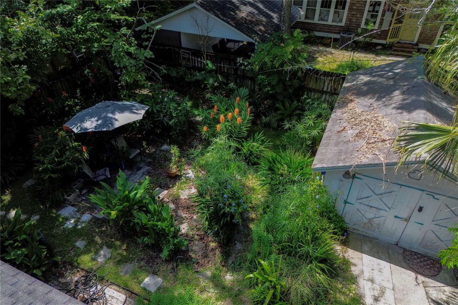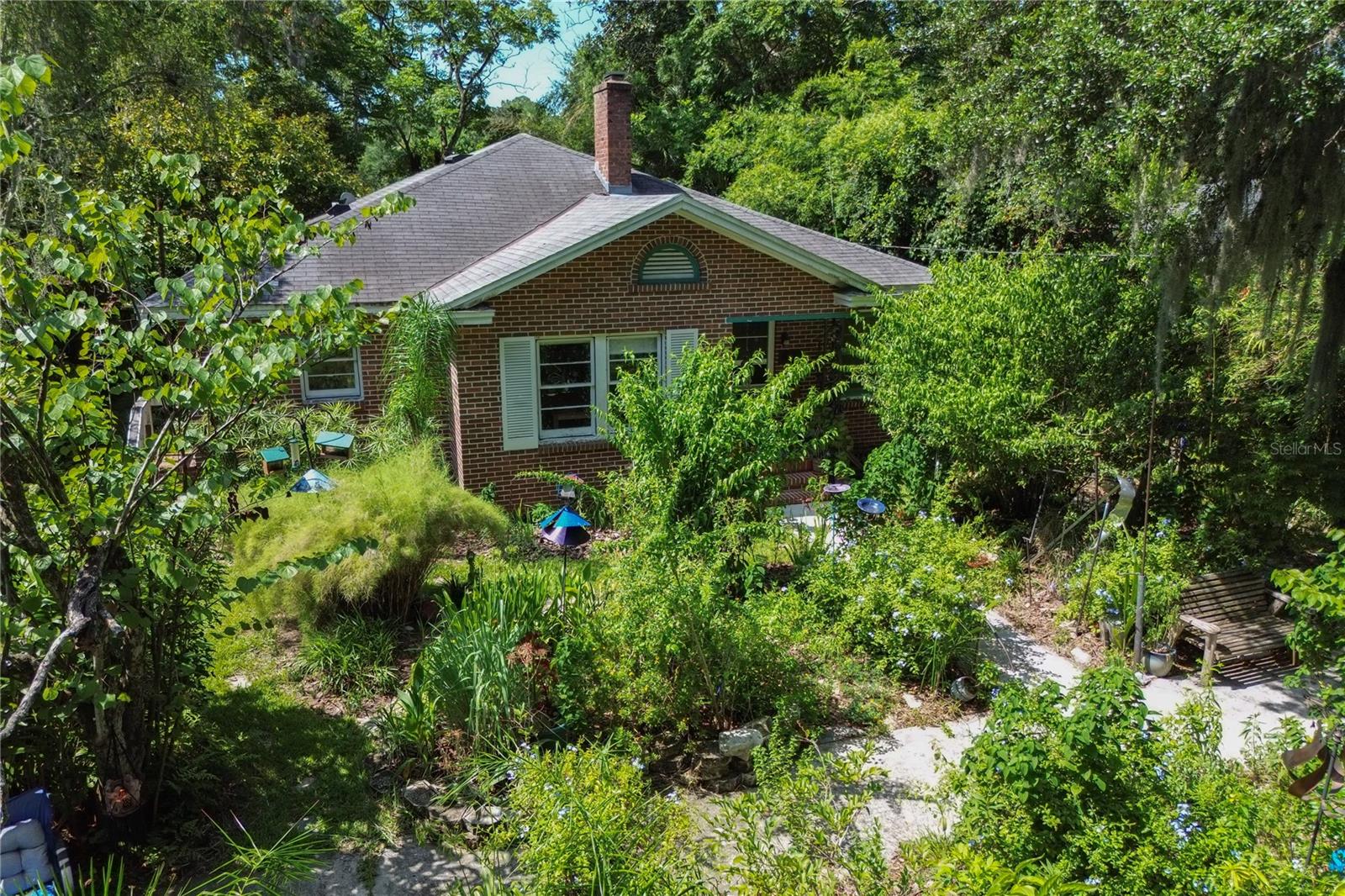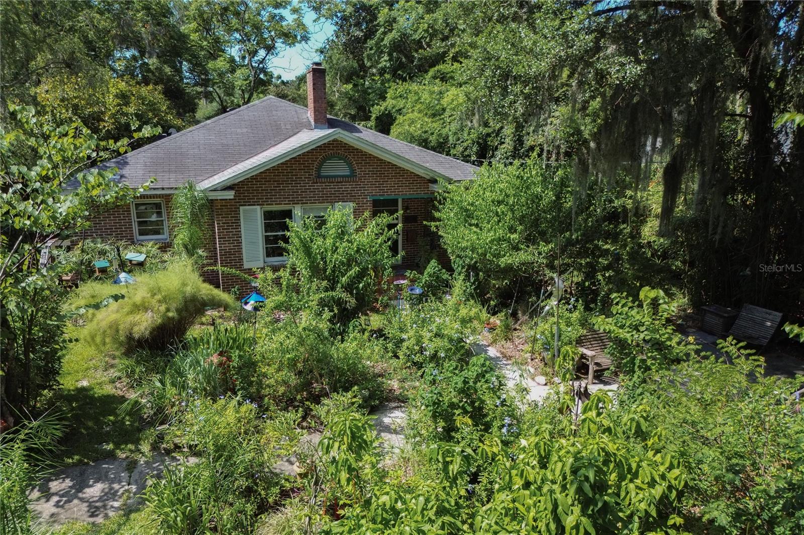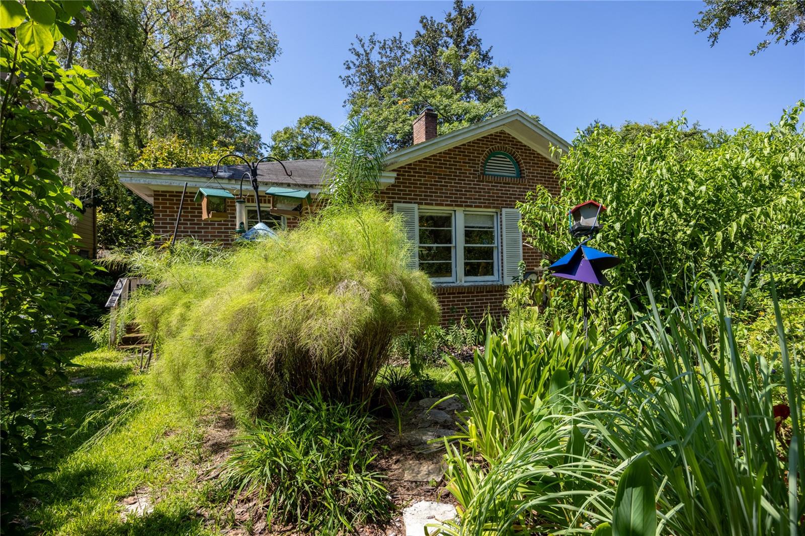 Cute and charming 3 bedroom, 2 bathroom brick home in NE Gainesville's Duck Pond neighborhood. Great location walking distance to downtown Gainesville's shops and restaurants, Tom Petty Park and the Thomas Center. Just 3 miles to the University of Florida, Shands/UF Health and Gainesville VA. Built in 1939, this home offers loads of vintage charm including solid wood floors, wood burning fireplace and wood kitchen cabinets. The home has 1,299 heated and cooled square feet with a detached guest house. Currently housing the washer and dryer, a kitchenette and living space. It is perfect for a studio or an in-law suite. The main house has a covered front entry that opens to a Great Room with fireplace, wood floors and lots of natural light. Through the archway on the left is the dining room with large picture window overlooking the natural garden. Next to the dining room is the kitchen with wood cabinets, tile counter-tops, gas range top and separate entrance to the side yard. Off the Great Room is the enclosed Florida Room with wood ceiling, walls of windows and access to the rear yard, patio and guest house. To the left of the Great Room are two guest bedrooms that share a guest bathroom. The guest bathroom has vintage tile and a tub/shower. The third bedroom is the primary suite with separate ensuite bathroom. The primary bathroom has tile and a stand alone shower. All the rooms are generously sized with wood floors and lots of light. The home sits on .12 of an acre and is part of the Duck Pond Historic District. Located on a quiet street, you will love the great location, friendly community and peacefulness of this home.