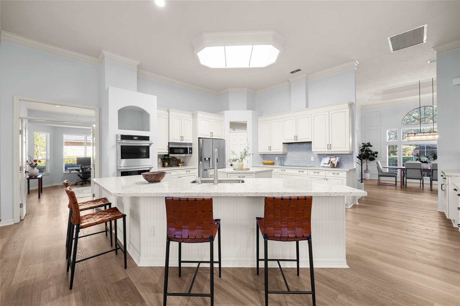 Welcome home to your beautifully updated Haile Plantation India Station estate, set on one of the most desirable golf course lots in Hawkstone Country Club, with sweeping views of the signature 10th hole. This stately home offers over 4,900 square feet of thoughtfully designed living space, blending refined finishes with comfort and functionality. As you arrive, a circular driveway framed by lush landscaping creates a gracious first impression, while the oversized 3 car garage with a built in workshop adds both convenience and storage. Step inside to soaring ceilings, abundant natural light, and brand new luxury vinyl plank flooring that flows throughout the main level. Off the entry, you'll find a grand home office with French doors, a formal dining room, and a secondary living area, perfect for entertaining or creating a quiet retreat. The home features a 4 way split floor plan, ensuring privacy and space for everyone. The heart of the home is the updated kitchen, where new quartz counters, a designer backsplash, and all new stainless steel appliances make a bold, modern statement. The kitchen opens to the family room and casual dining area, all of which are flooded with natural light and framed by stunning panoramic views of the golf course. Whether you're starting your morning with a cup of coffee or winding down in the evening, the view from this space is simply unmatched. All 4.5 bathrooms have been recently renovated with a cohesive, stylish design that feels timeless yet current. Frameless glass shower enclosures, beautiful tilework, and sleek quartz countertops create a polished, spa like feel throughout. Step outside to your private outdoor oasis, featuring a resort style pool with waterfall, a granite summer kitchen, a cozy outdoor fireplace, and expansive covered patio space, all with sweeping views of the fairway. With 4 main bedrooms and 4.5 baths, the home offers incredible flexibility. Two of the spacious bedrooms are separated by a flex room perfect for an ideal bonus living space, study retreat, or playroom. The upstairs bonus room has been reimagined as a true multi purpose space with endless possibilities, perfectly complemented by the updated full bath and new wet bar with refrigerator. Whether you envision a game room, private guest suite, fitness studio, hobby room, or teen retreat, this space is ready to accommodate your lifestyle. The spacious primary suite is tucked away on the main floor and offers tranquil golf course views, a luxurious updated en suite bath with quartz counters and enlarged zero entry shower, stand alone soaking tub, separated vanities, toilet closet and dual walk in closets. Beyond the home, residents enjoy all the perks of Haile Plantation, one of Gainesville’s most sought after communities. Stroll or bike along miles of shaded walking trails that wind through lush surroundings, or head to the charming Haile Village Center for coffee, dining, boutiques, and community events including the Saturday morning farmers market. With easy access to UF Health Shands, HCA Florida North Florida Hospital, Butler Plaza, Celebration Pointe, and I 75, the location offers unmatched convenience while preserving a peaceful, neighborhood feel. This exceptional property offers more than a home, it offers a lifestyle. Schedule your private tour today.
