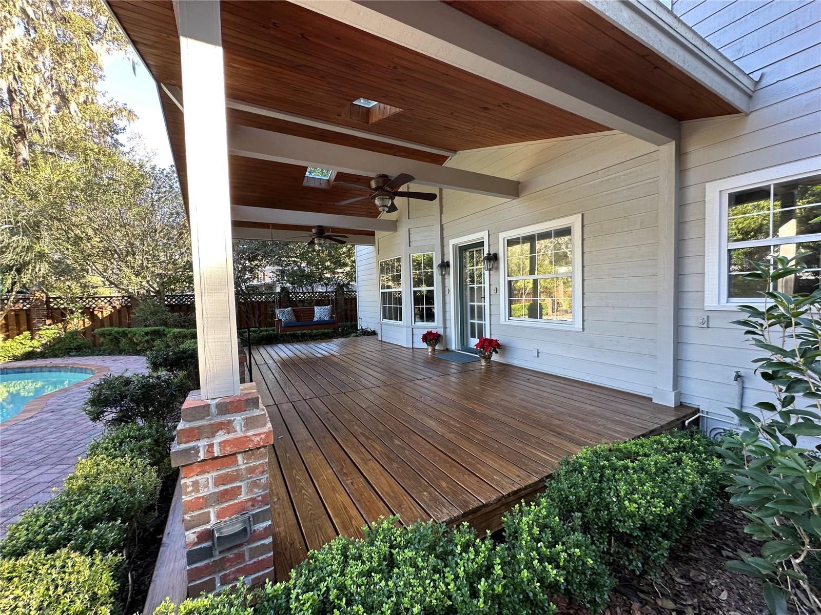 Here's a home with the right amount of indoor and outdoor space for family and friends to gather for any occasion! The downstairs is dedicated to the common social activities. The kitchen has plenty of cabinet space, a pantry and more storage space. The counter top has room to spread out your recipes and cook up a storm. From the kitchen, one can keep an eye on the pool activity and gatherings in the family room around the fireplace. The living and dining rooms at the front of the home have large windows and plantation shutters, fine details in the wood work include a bay window, chair rails, crown molding and luxury plank vinyl flooring. There is a laundry room off the kitchen, half bath for guests and At the end of the hall there is a bonus room with a shower and sink and sliding glass doors to the backyard and pool. Upon entering the home you will be drawn to the gleaming blue water of the large pool in the backyard, The design allows enough length to do laps and wide enough for playful splashing. The large porch has a high ceiling with cathedral beams and a classic bench style swing. Privacy and more quiet time may be found upstairs where there are 4 bedrooms and 2 full bathrooms. There are more storage closets and a spacious landing that runs between the bedrooms. A large garage on the side of the house has side entry.