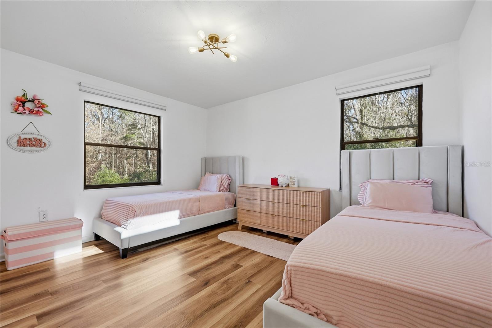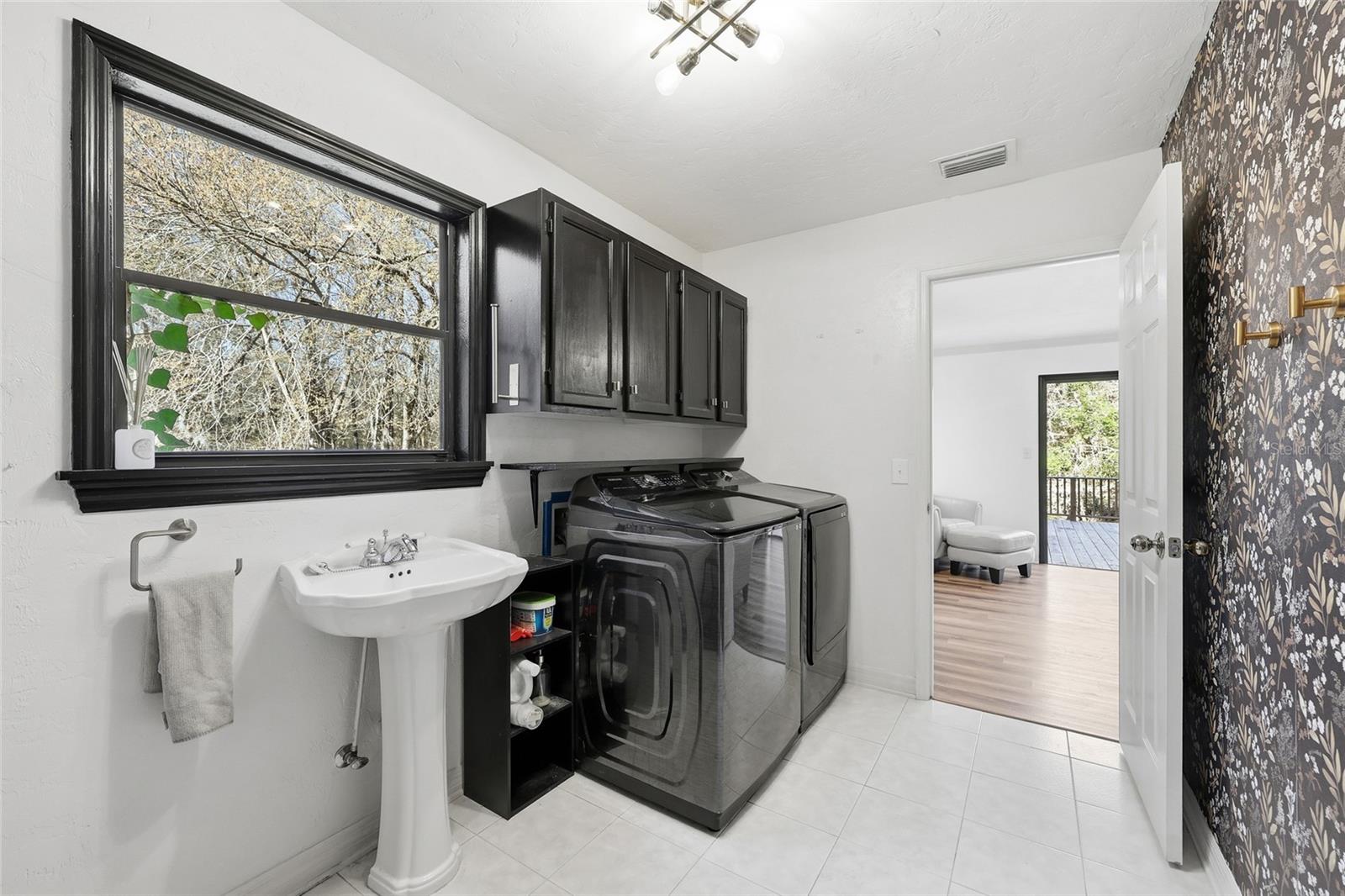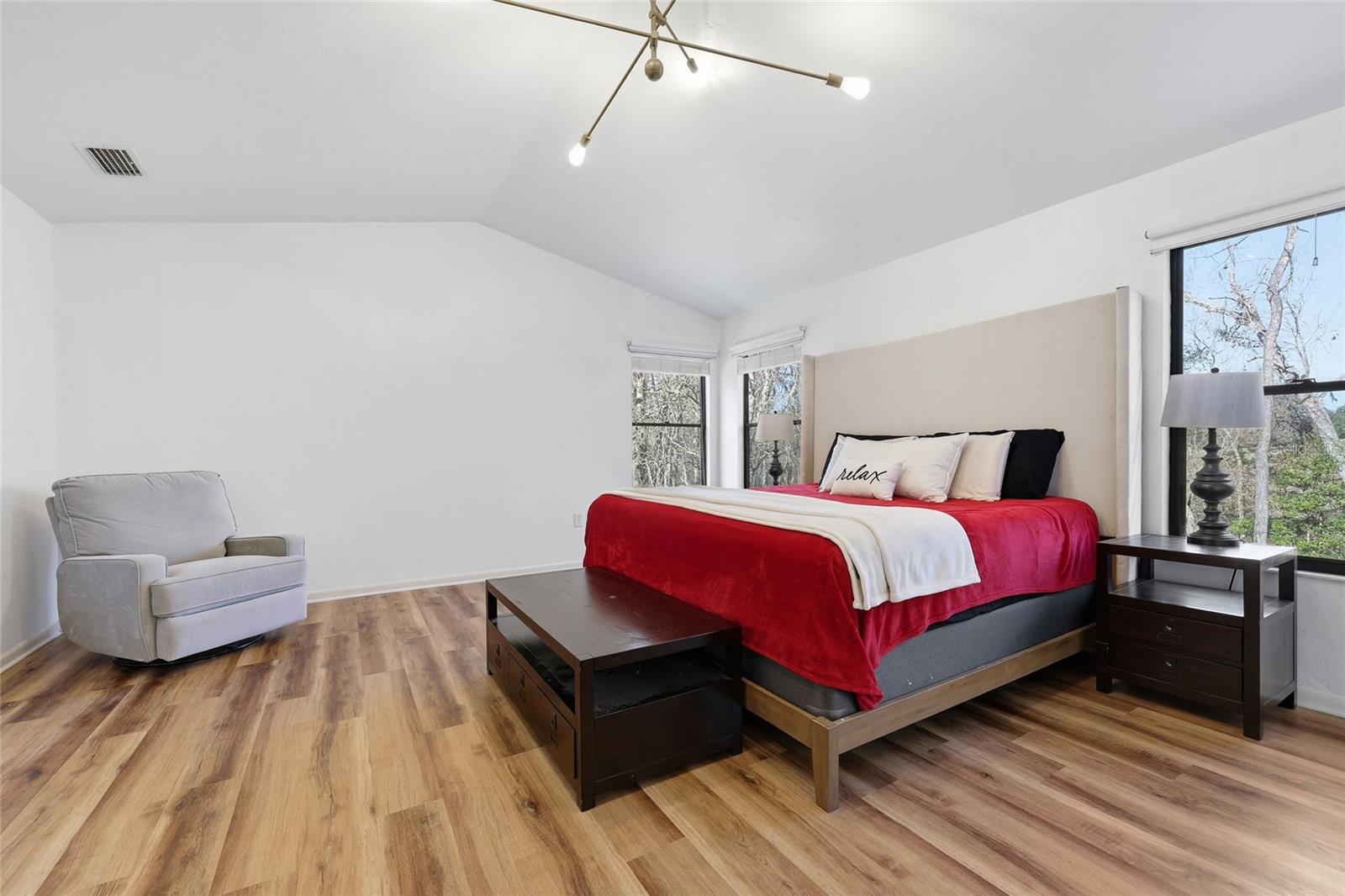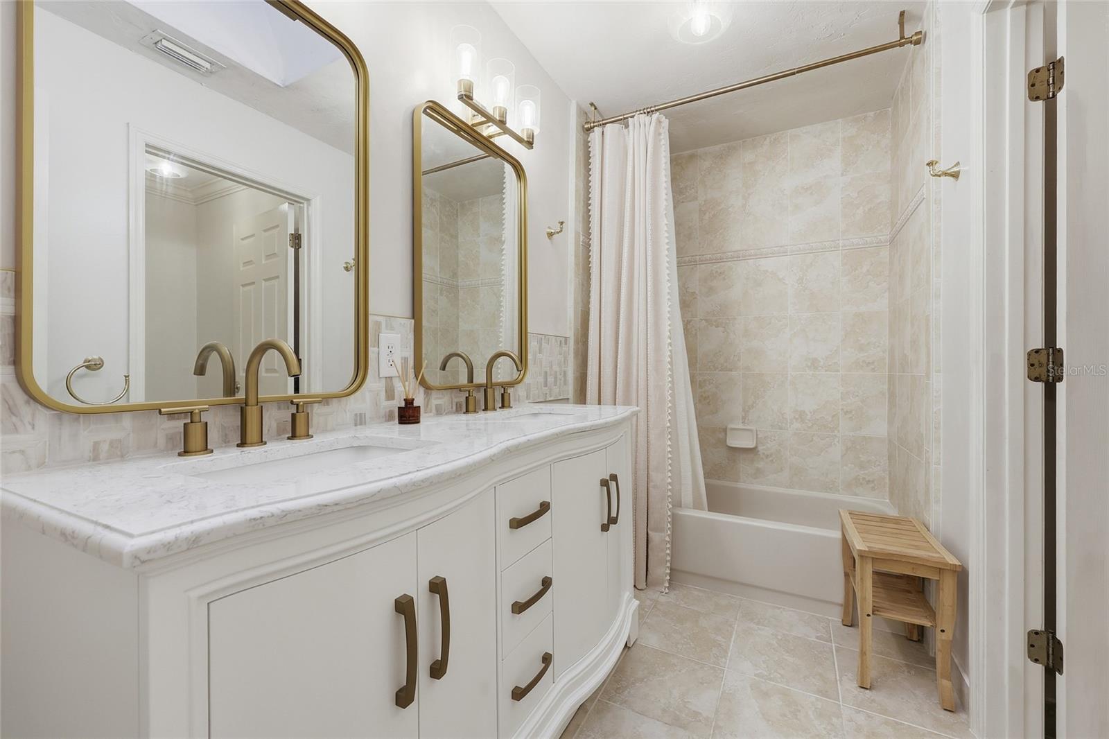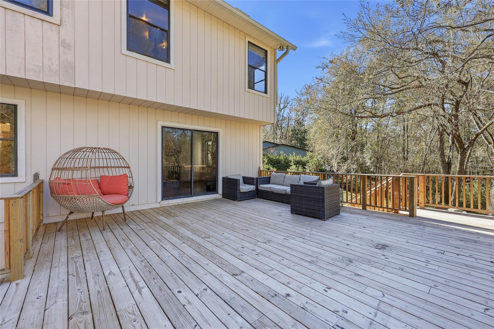 Tucked away at the end of a quiet cul de sac this fully remodeled home offers privacy charm and a peaceful natural setting complete with a babbling creek and daily deer sightings. As you enter you are greeted by updated lighting and new LVP flooring throughout with tile in the kitchen and laundry. The stairs lead up while the main living space opens with high ceilings in the living room flowing seamlessly into the dining area and kitchen. The kitchen has been thoughtfully opened up and completely refreshed with stunning Taj Mahal quartzite countertops installed in 2024 a new workstation sink with water filtration tile backsplash and an oversized island with eat in seating. Stainless steel appliances and a wine fridge were also added making this space both beautiful and functional. Just off the kitchen is the family room with a wood burning fireplace perfect for cozy evenings. The laundry room features cabinetry a sink and stylish wallpaper with the washer and dryer. Under stair storage provides excellent pantry space. A cute updated first floor bath and a bedroom just off the living area complete the main level. Upstairs you will find 2 additional bedrooms with blackout shades. The second story shared bath has been updated with a new vanity, tub shower combo, and a separate toilet area. The primary suite is a true retreat featuring a vaulted ceiling a spacious layout including seating area or office alcove and an oversized bathroom with a giant marble floored shower, dual vanities with marble backsplash and three closets including a large walk in. Outside the home truly shines with a brand new wood deck completed in 2025 rated to hold up to sixteen thousand pounds overlooking the creek and wooded backdrop. The area under the deck has been cleared creating additional usable space. Additional improvements include a new roof in 2024, and a hybrid water heater installed in 2025. This home combines modern updates with a serene setting and is truly move in ready.