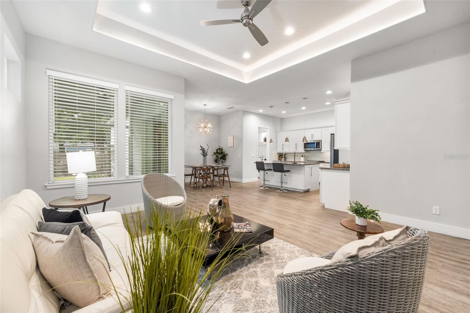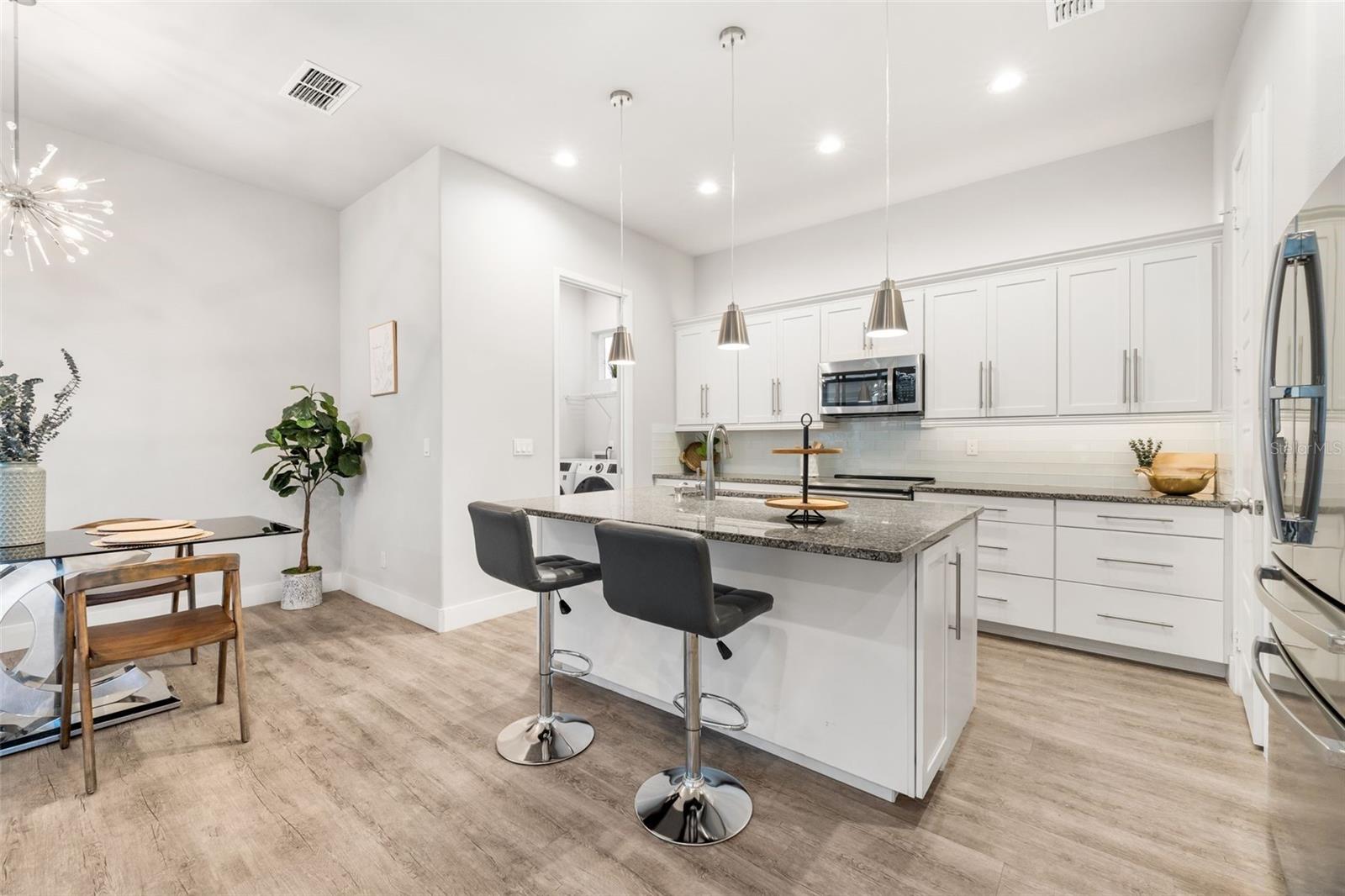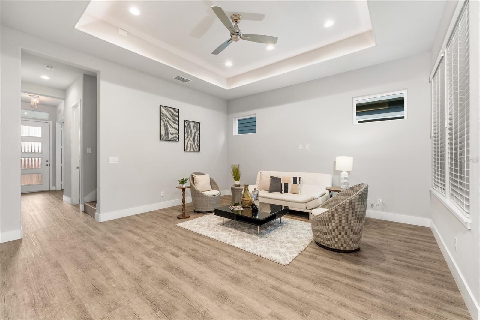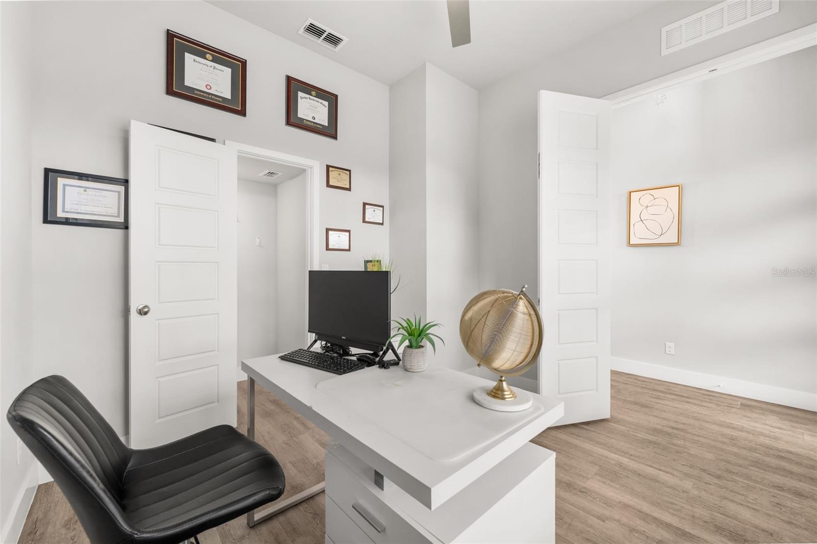 One or more photo(s) has been virtually staged. One or more photo(s) has been virtually staged. Welcome to this Grand Preserve at Kanapaha move-in ready contemporary home in Gainesville, FL offering an unbeatable location just minutes to the University of Florida, UF Health Shands Hospital, the VA Medical Center, North Butler Plaza, and Celebration Pointe. This 4-bedroom plus loft, 2.5-bath home with 2,077 square feet delivers the ideal blend of modern style, energy efficiency, and functional living — perfect for a primary residence, second home, or investment property. Designed with an open concept floor plan and luxury vinyl plank flooring throughout (no carpet), the main level features a flexible front bedroom with a large walk-in closet, ideal for a home office or guest room. The spacious great room showcases 11-foot ceilings plus trays and abundant natural light, creating an airy and inviting living space. The kitchen is the heart of the home, offering a large center island, stone countertops, designer backsplash, deluxe touchscreen stainless steel appliances with double oven range, and a walk-in pantry with wood shelving. The dining area flows seamlessly to stackable sliding glass doors that open to a screened paver porch and fenced backyard, providing excellent indoor-outdoor living. The primary suite is conveniently located on the first floor and features a spacious walk-in closet with custom built-ins and a beautifully appointed en suite bath with dual sinks, walk-in shower, and private water closet. Also on the main level are a half bath, laundry room with storage and utility sink, and access to the rear-entry two-car garage. Upstairs, a large loft or bonus room provides a second living area, media room, or play space, along with two additional bedrooms and a full bath. Modern railing up the stairs stands out in this exceptional home. This energy-efficient home includes spray foam attic insulation, a tankless gas water heater, and insulated low-E vinyl windows. Smart home technology allows app- and voice-controlled lighting, thermostat, door access, and security systems on both floors. Additional highlights include high ceilings, tray ceilings, 8’ six-panel doors, stone counters throughout, tasteful tile selections, generous windows, ceiling fans in all rooms, custom closet systems, upgraded fixtures and abundant natural light. Washer/Dryer stay. Residents of Grand Preserve enjoy resort-style amenities including a clubhouse, pool, fitness center, and sidewalks. The HOA covers front lawn maintenance, high-speed fiber internet, and full cable with DVR, adding exceptional value to the HOA fees. The community is serviced by Clay Electric, known for competitive utility rates. This Gainesville home offers modern construction, smart features, stylish and luxe finishes and a prime location near UF, hospitals, shopping, dining, and major employers — a rare opportunity combining convenience, comfort, and lifestyle.