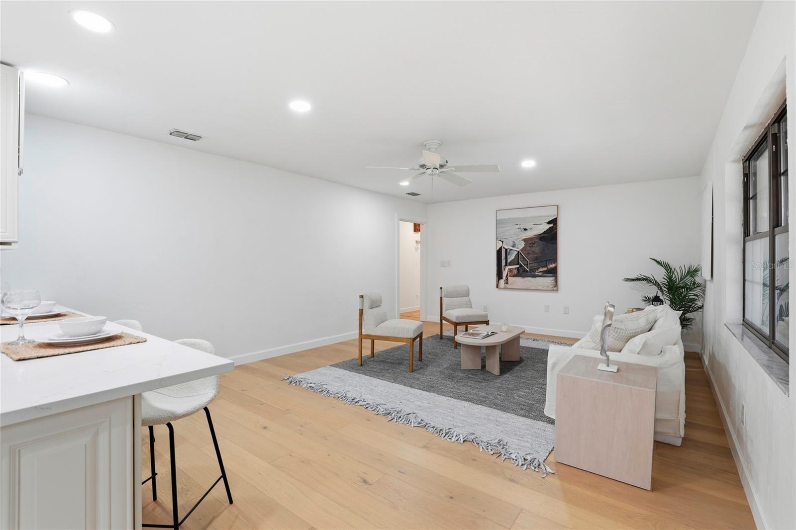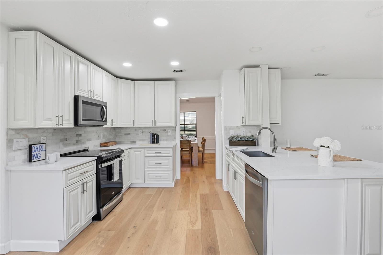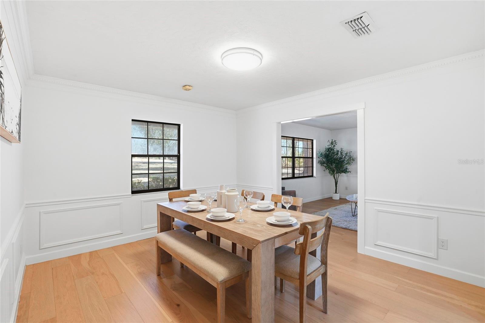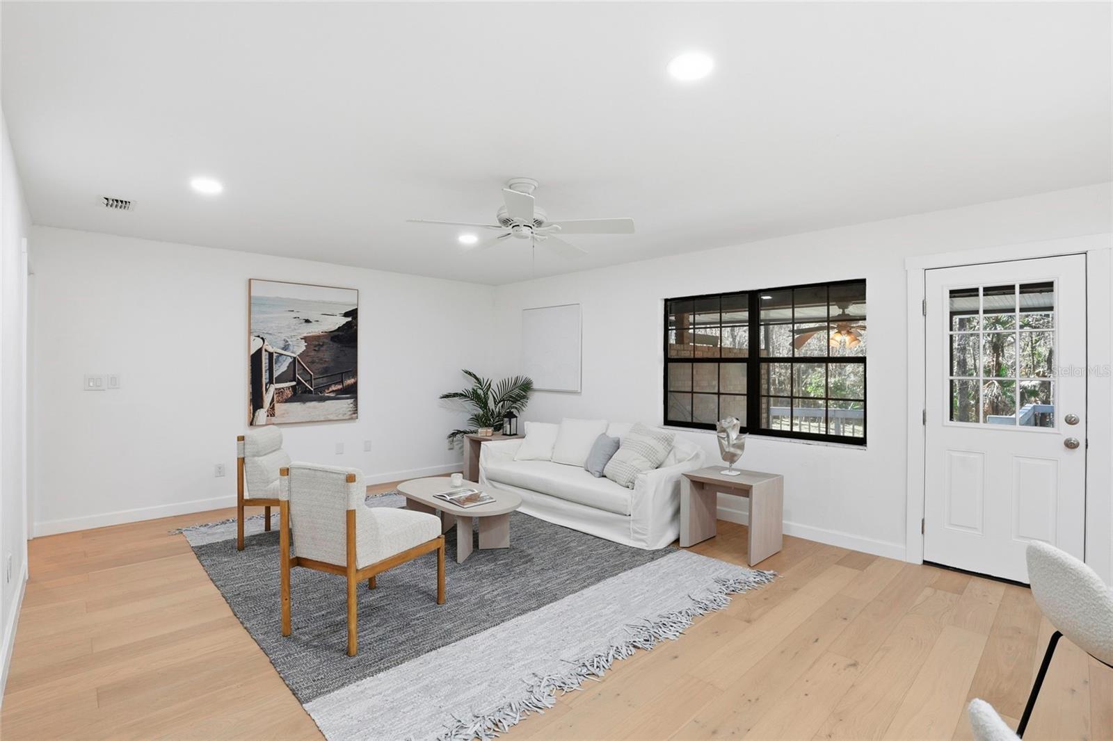 This Pine Hill Estates property offers a spacious and flexible layout on approximately one acre with a mix of open and lightly wooded areas. The home includes four bedrooms, three bathrooms, a large flex room, formal living and dining rooms, and a family room that connects directly to the kitchen, creating a functional flow for daily living. Additional interior spaces include a separate laundry room and a large utility room providing extra storage and workspace. Recent updates include water-resistant wood flooring, updated kitchen cabinetry with quartz countertops and appliances, and remodeled bathrooms featuring tiled tub and shower walls, tile flooring, and updated vanities. The flex room provides versatility and may accommodate a variety of uses such as additional living space, office, or guest area. Exterior features include a covered back porch, open front porch, and a deck overlooking the rear portion of the property. The metal roof was installed in December 2023. HVAC system and water heater were replaced in 2016. Conveniently located near schools, shopping, and everyday amenities.